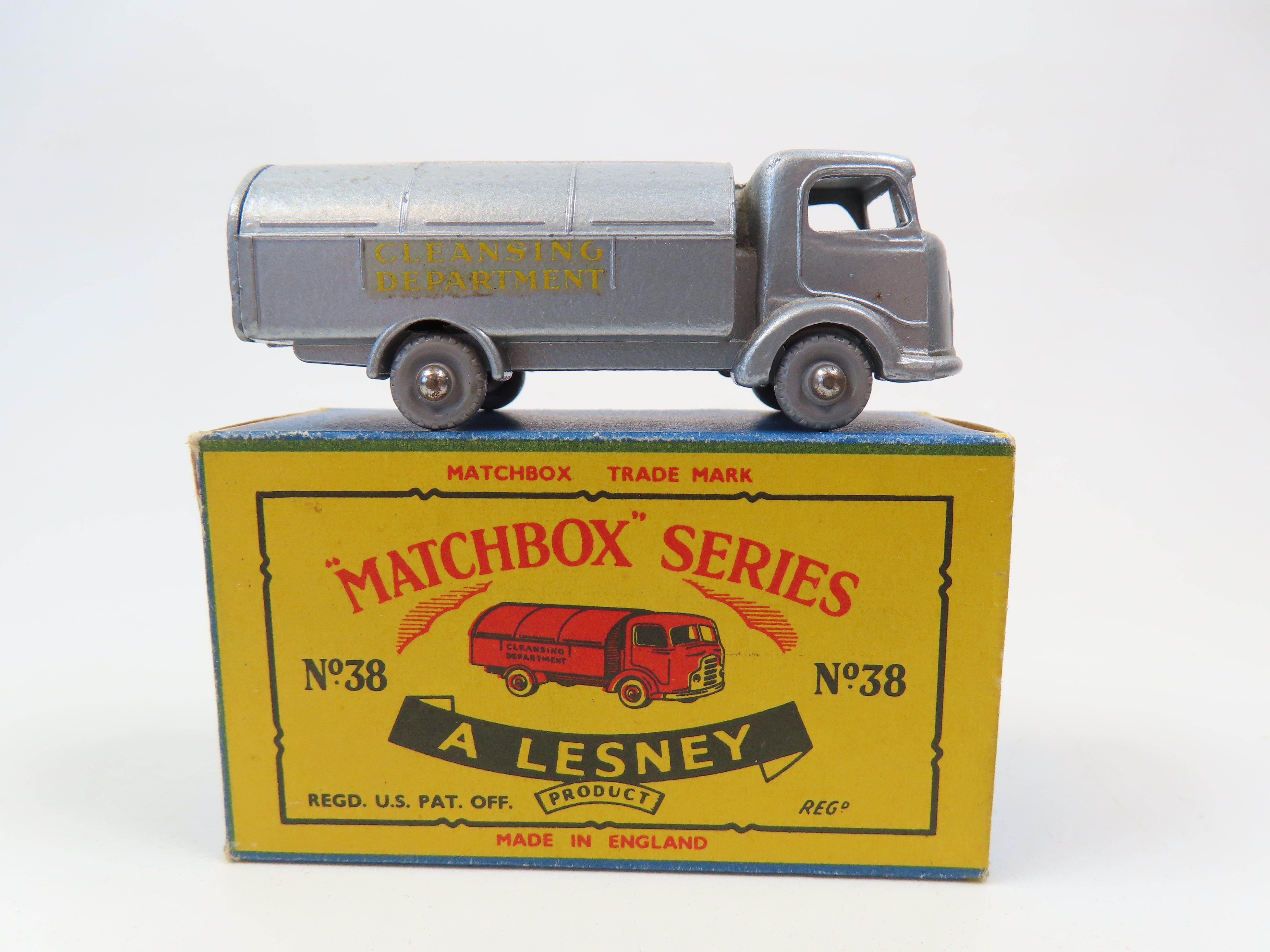 Matchbox No.38 Refuse Wagon in silver with yellow 'Cleansing Department' lettering to each side and with grey plastic wheels.
