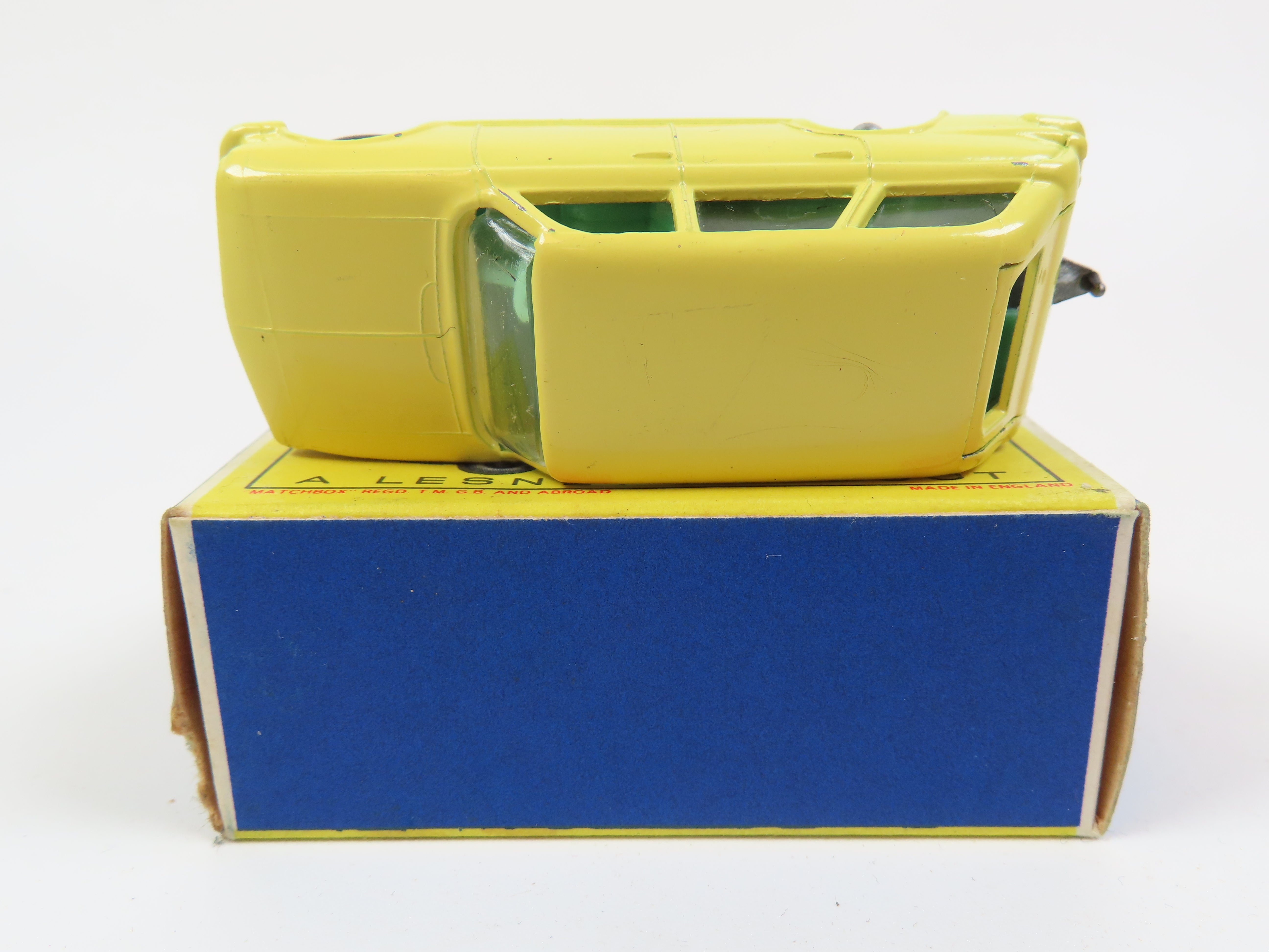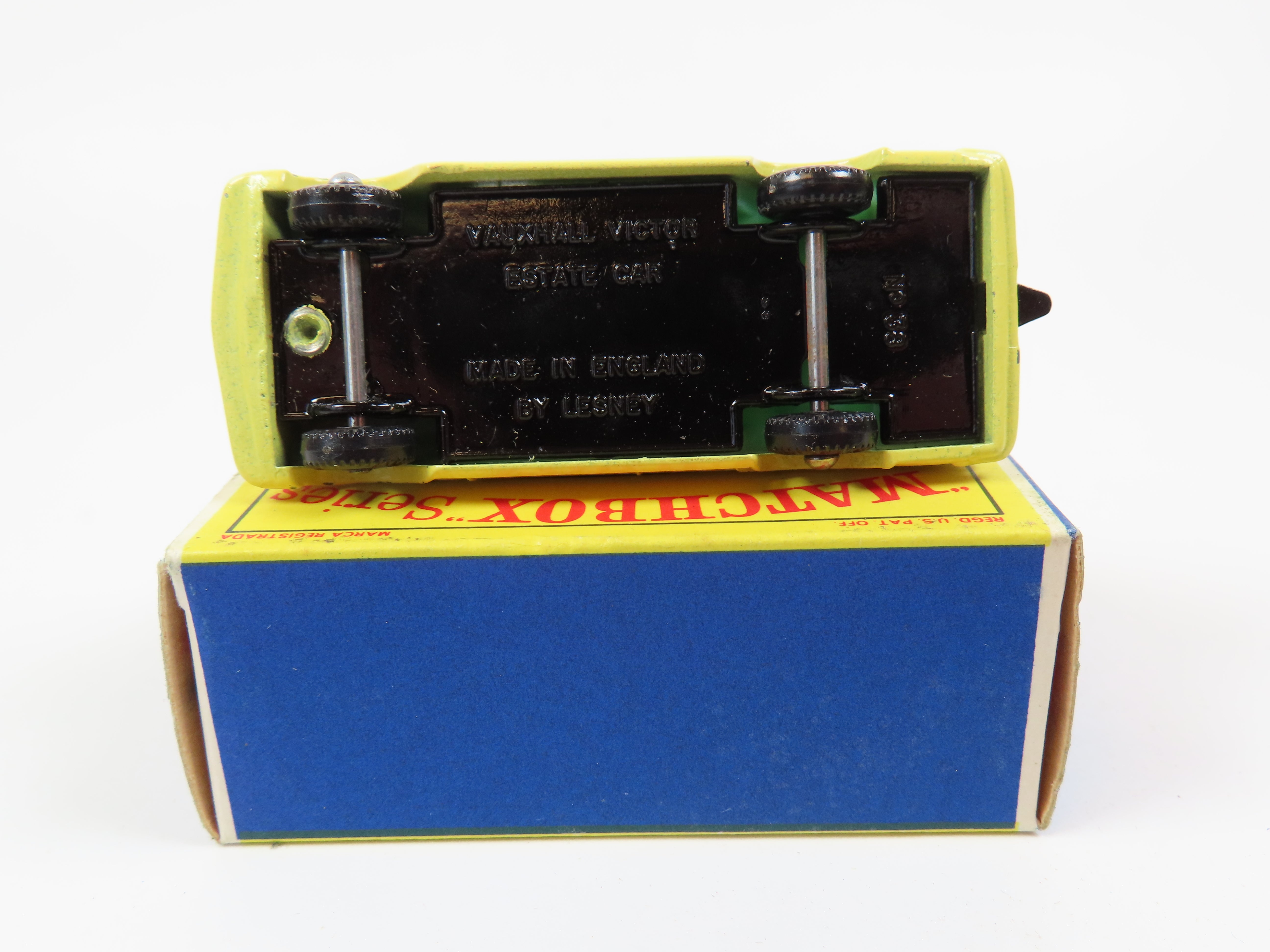 Matchbox No.38 Vauxhall Victor Estate Car in light yellow, with green seats, black painted baseplate and black plastic wheels.