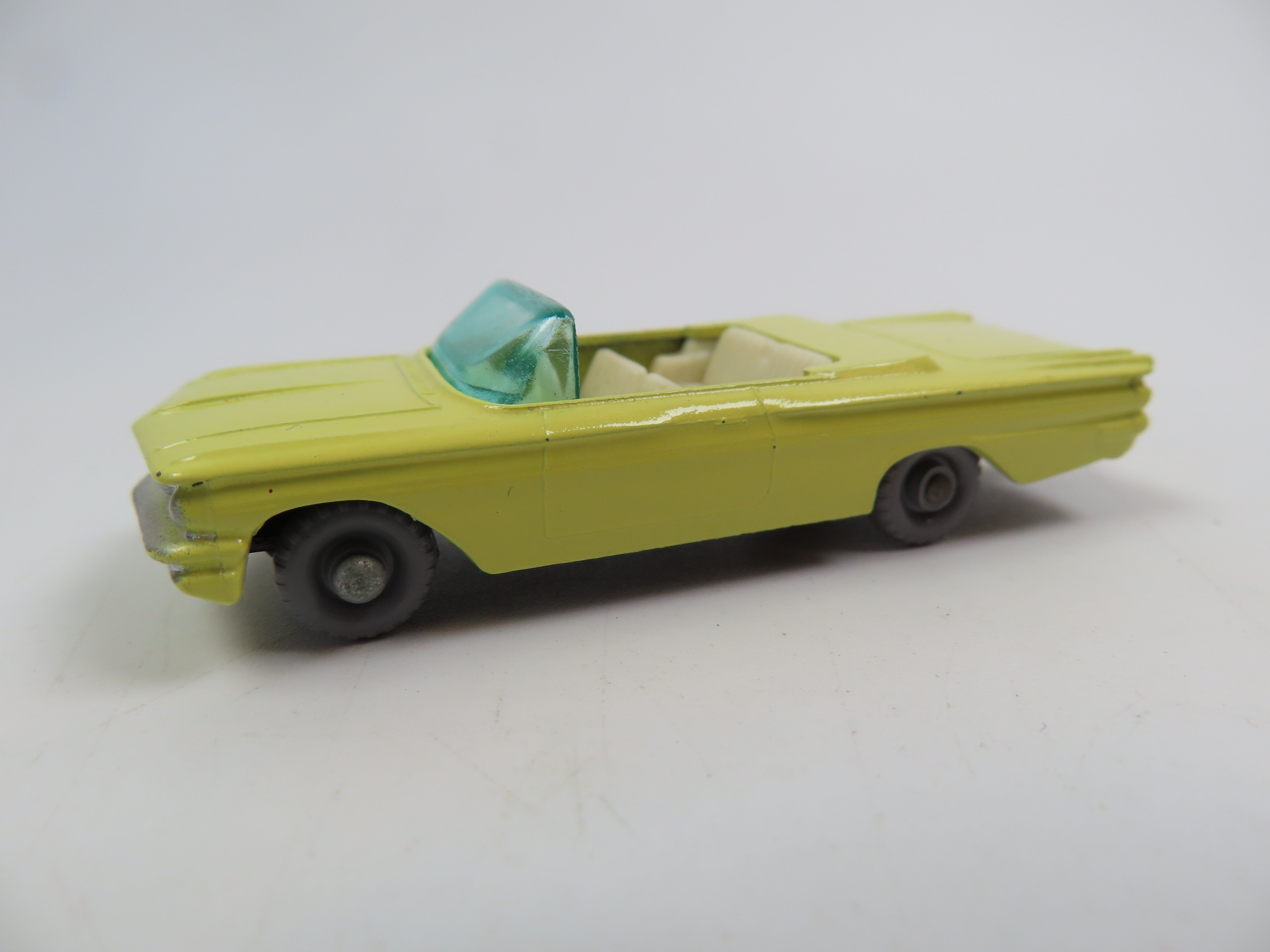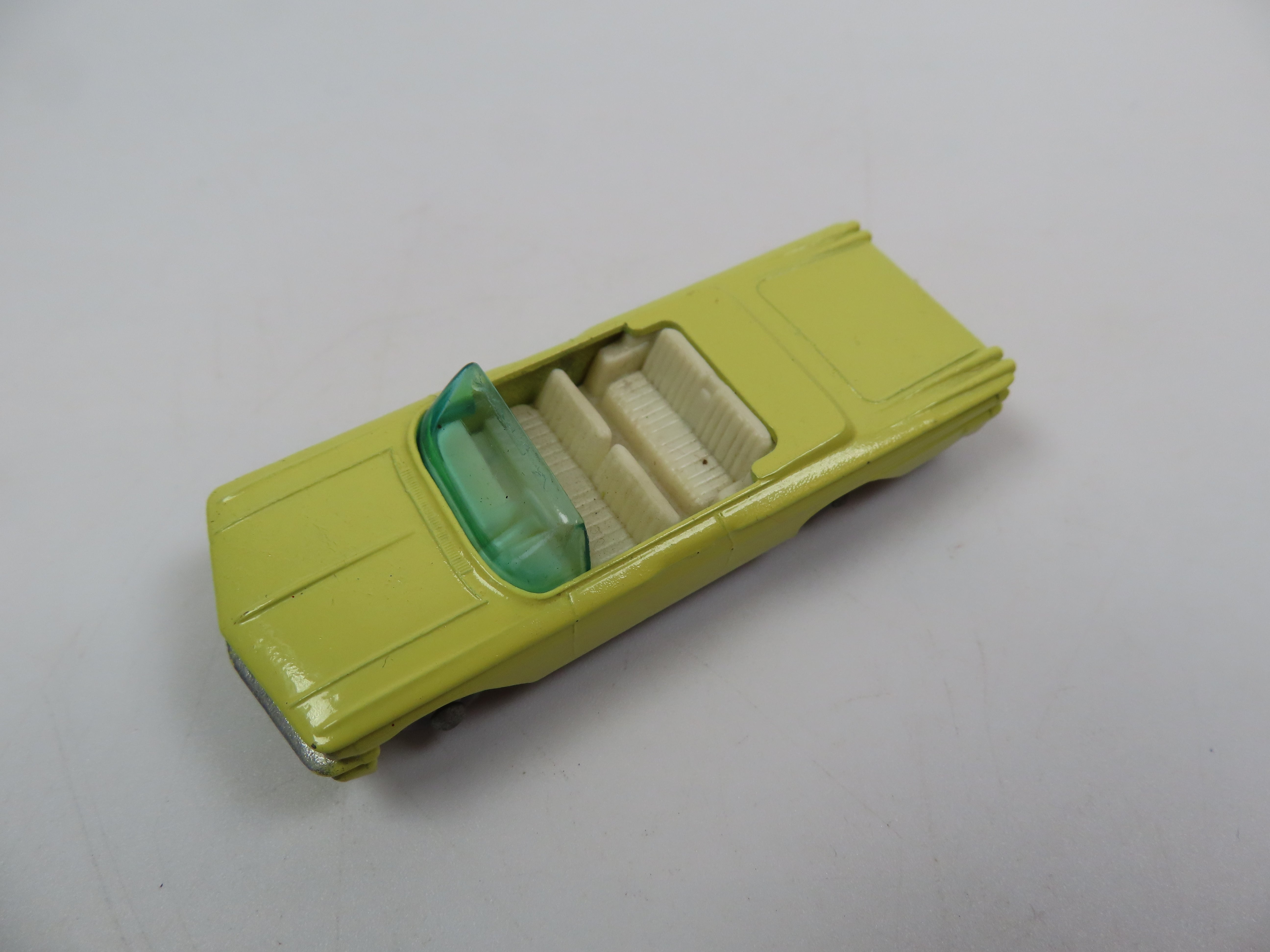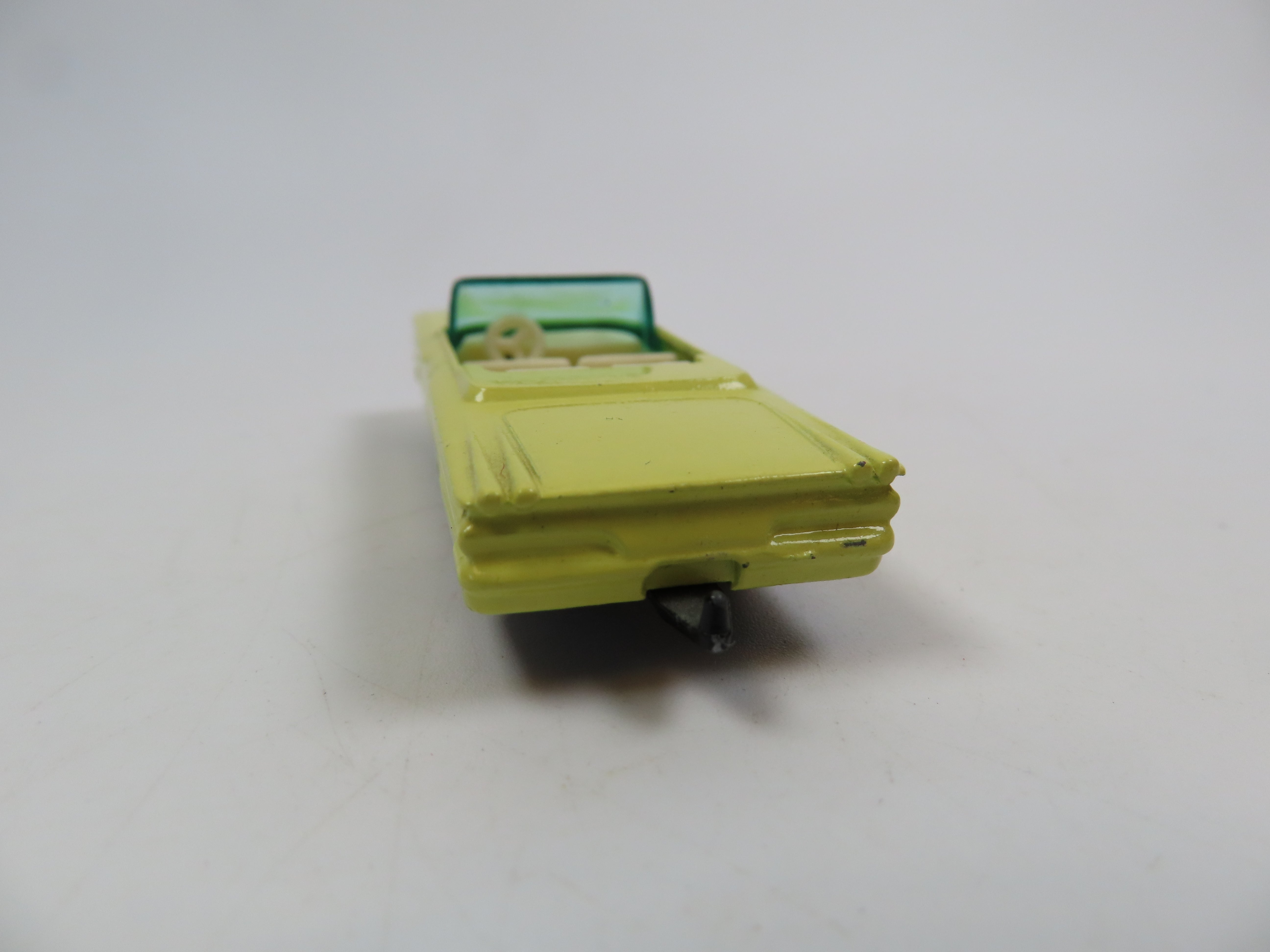 Matchbox No.39 Pontiac Convertible in light yellow, with green windscreen and black painted baseplate and tow hook.