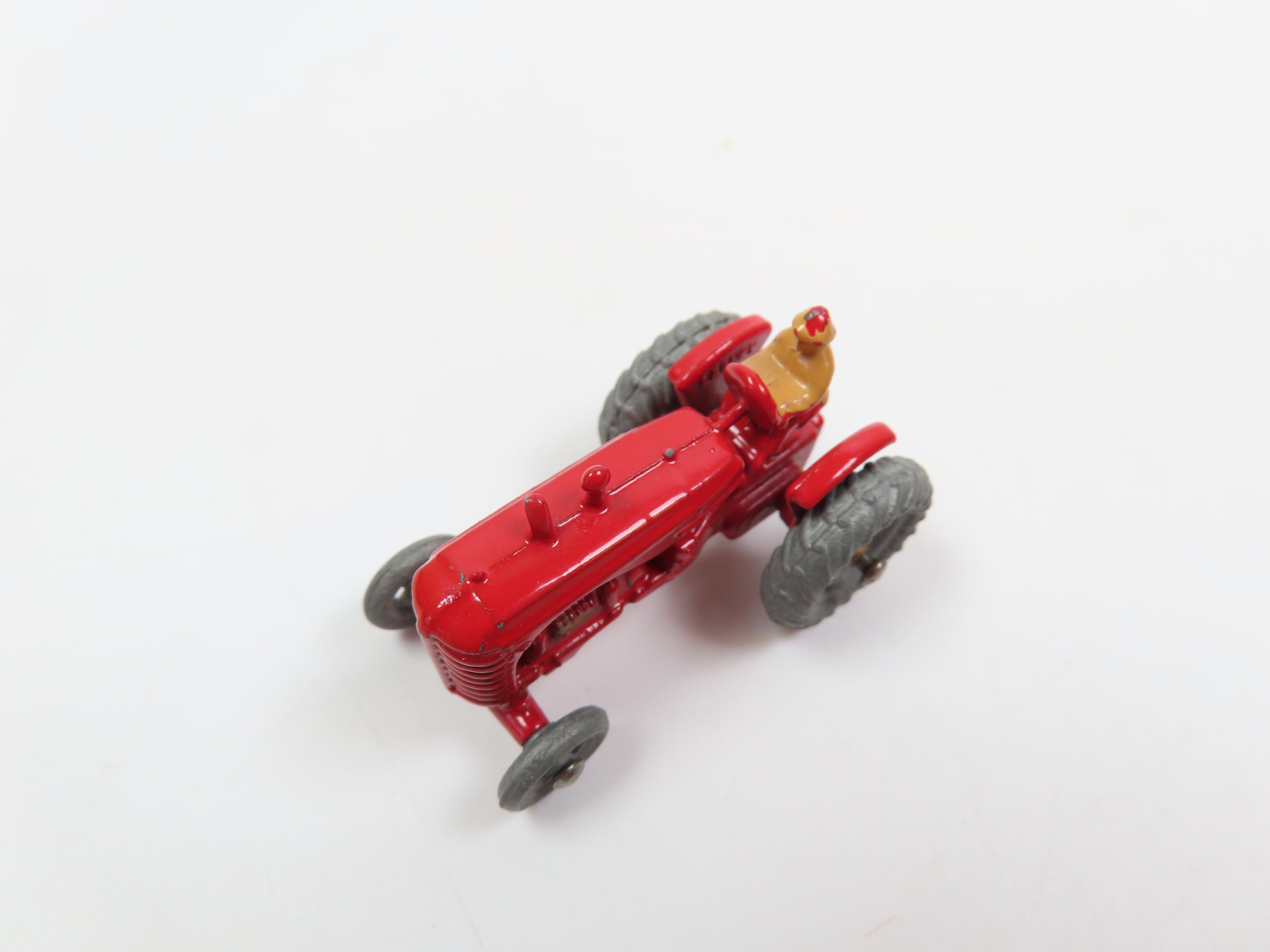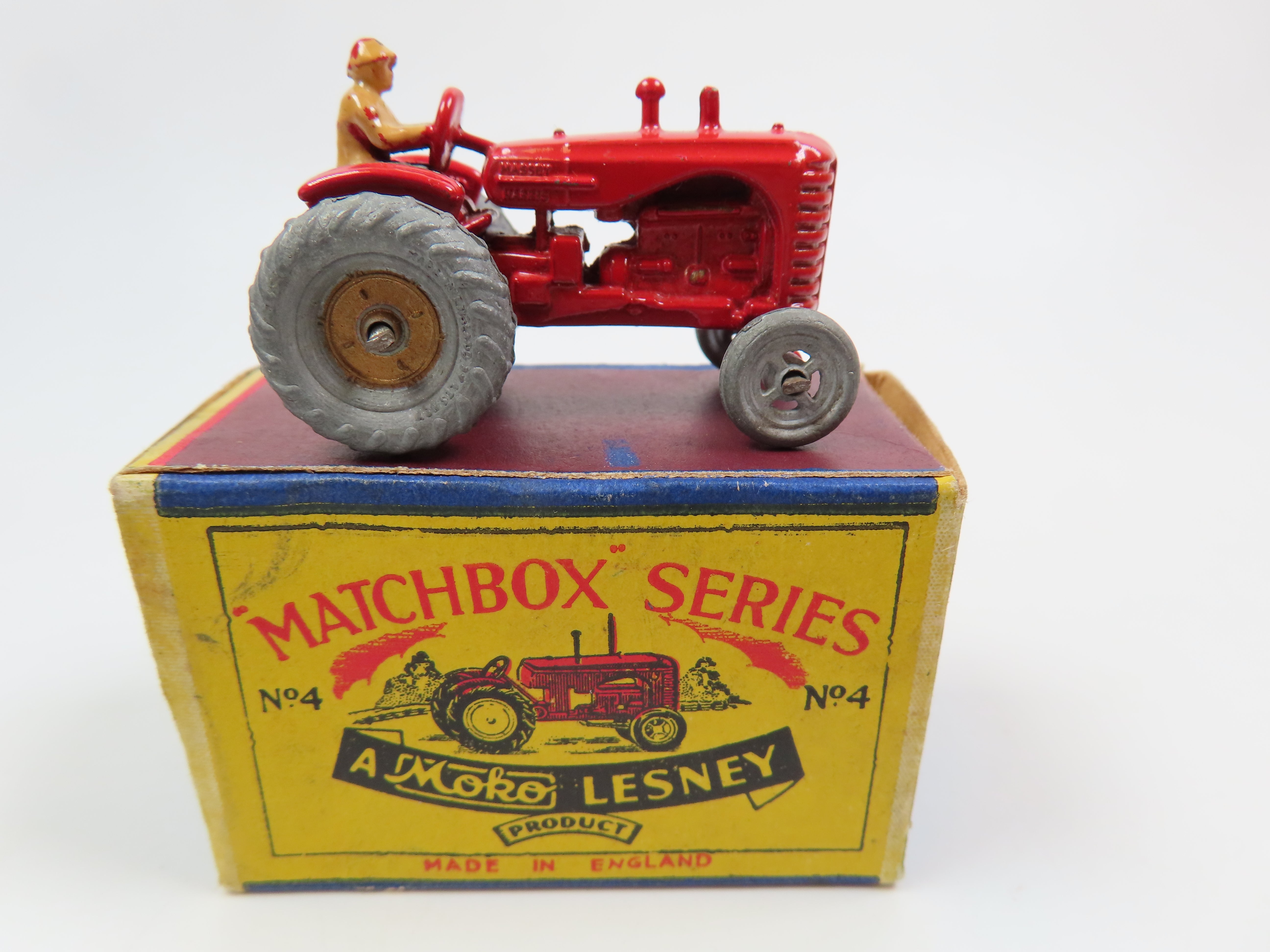 Matchbox No.4a Massey Harris Tractor in bright red, with gold painted hubs and motor, and tan driver figure.