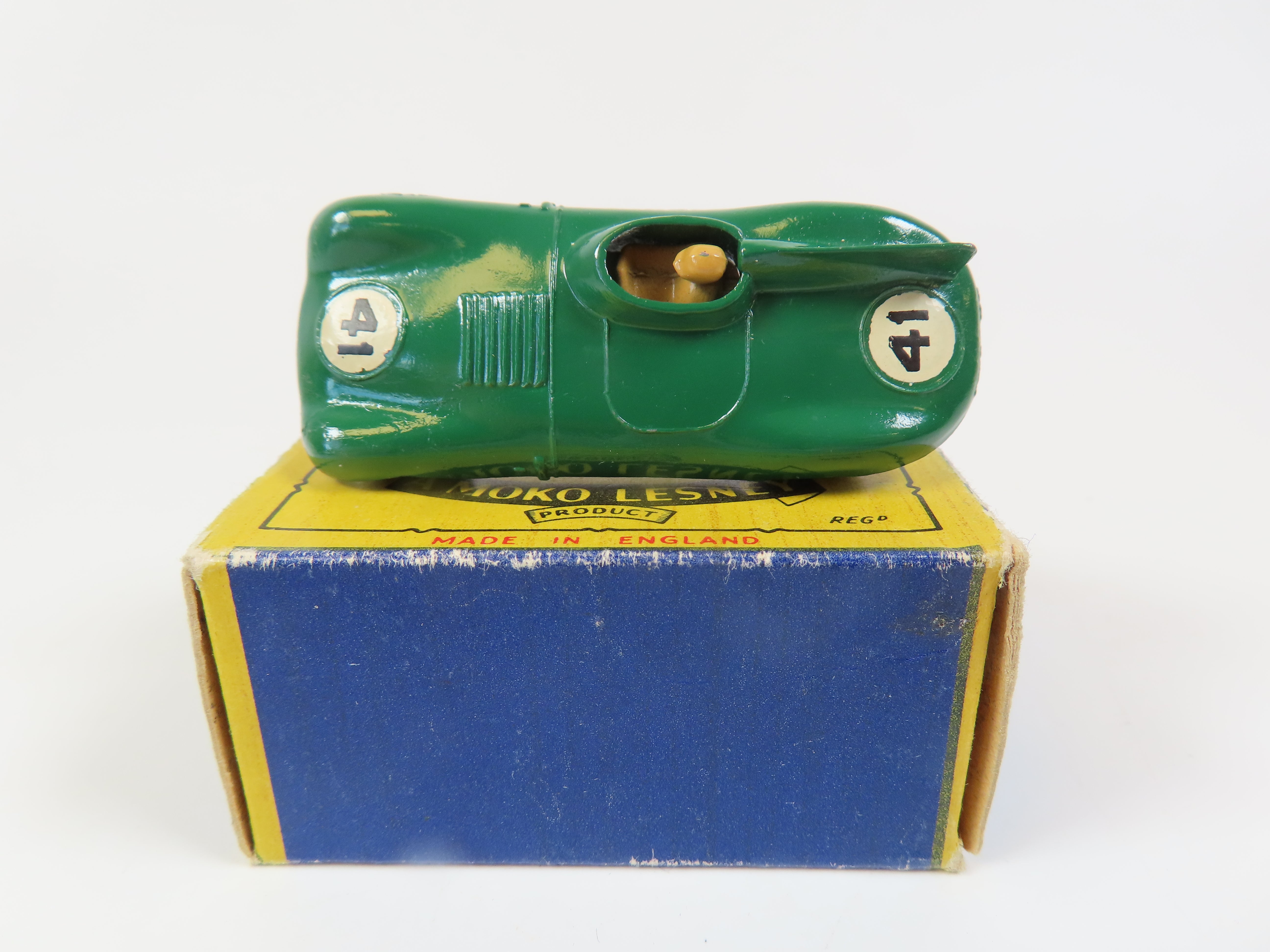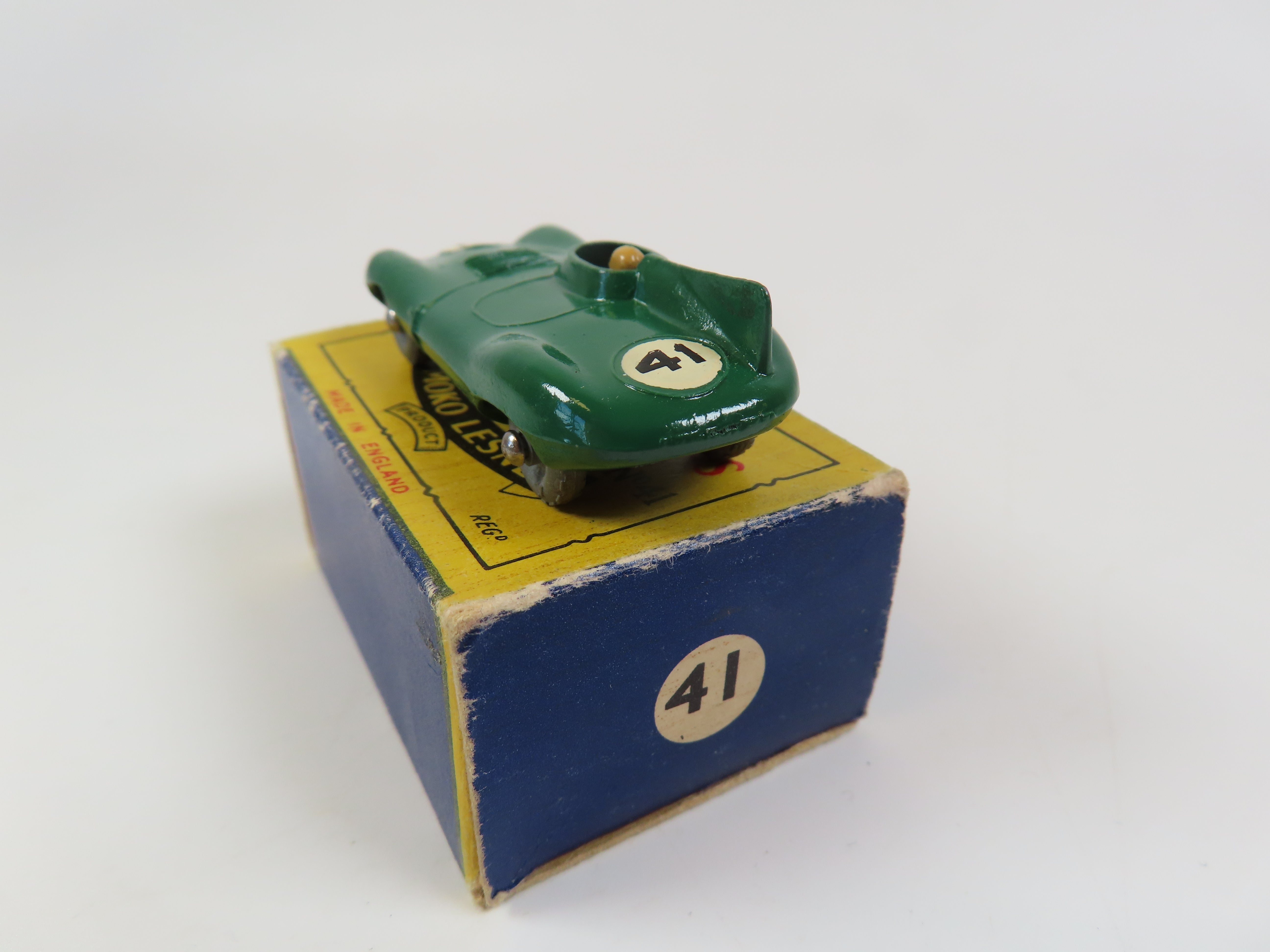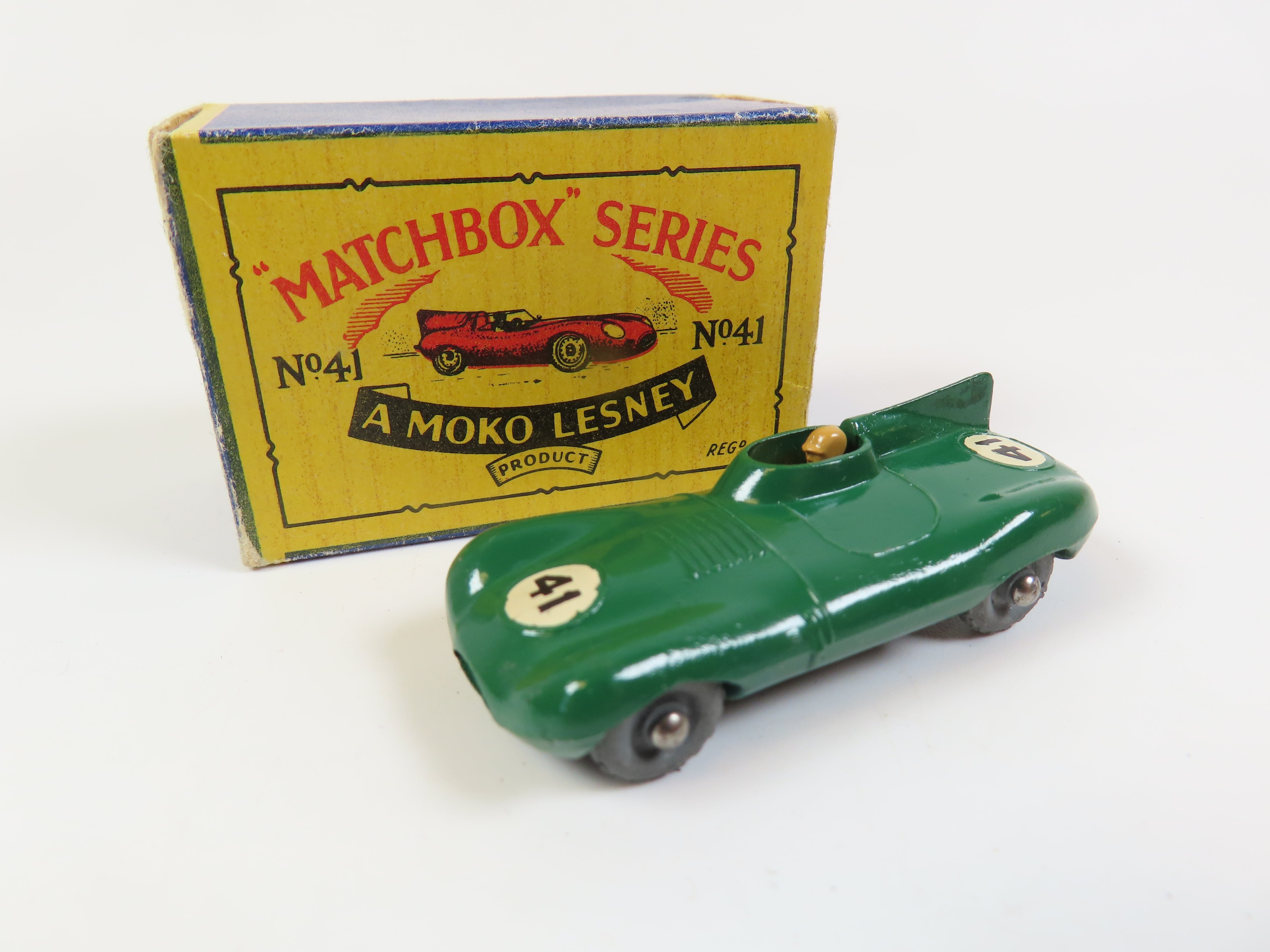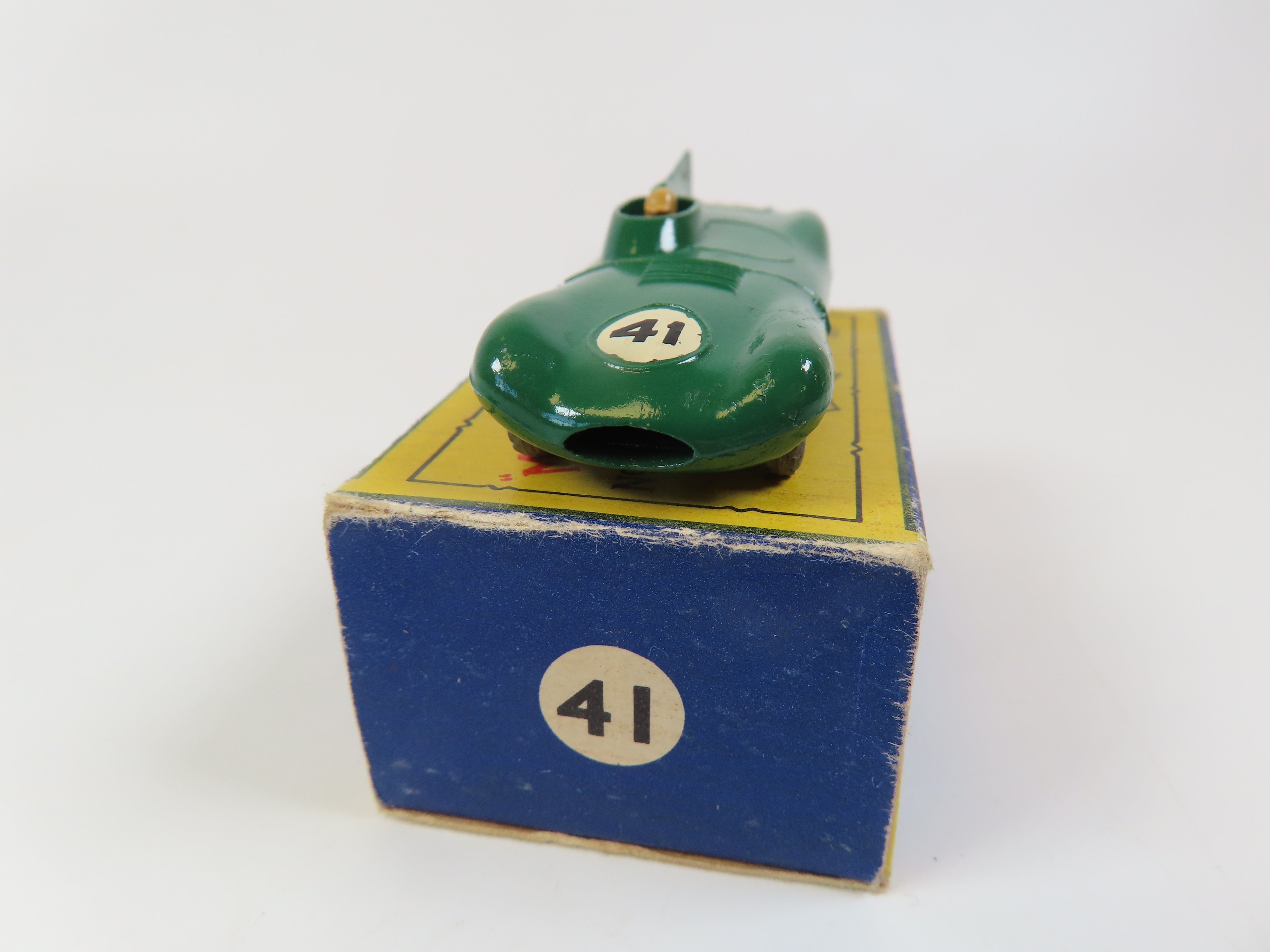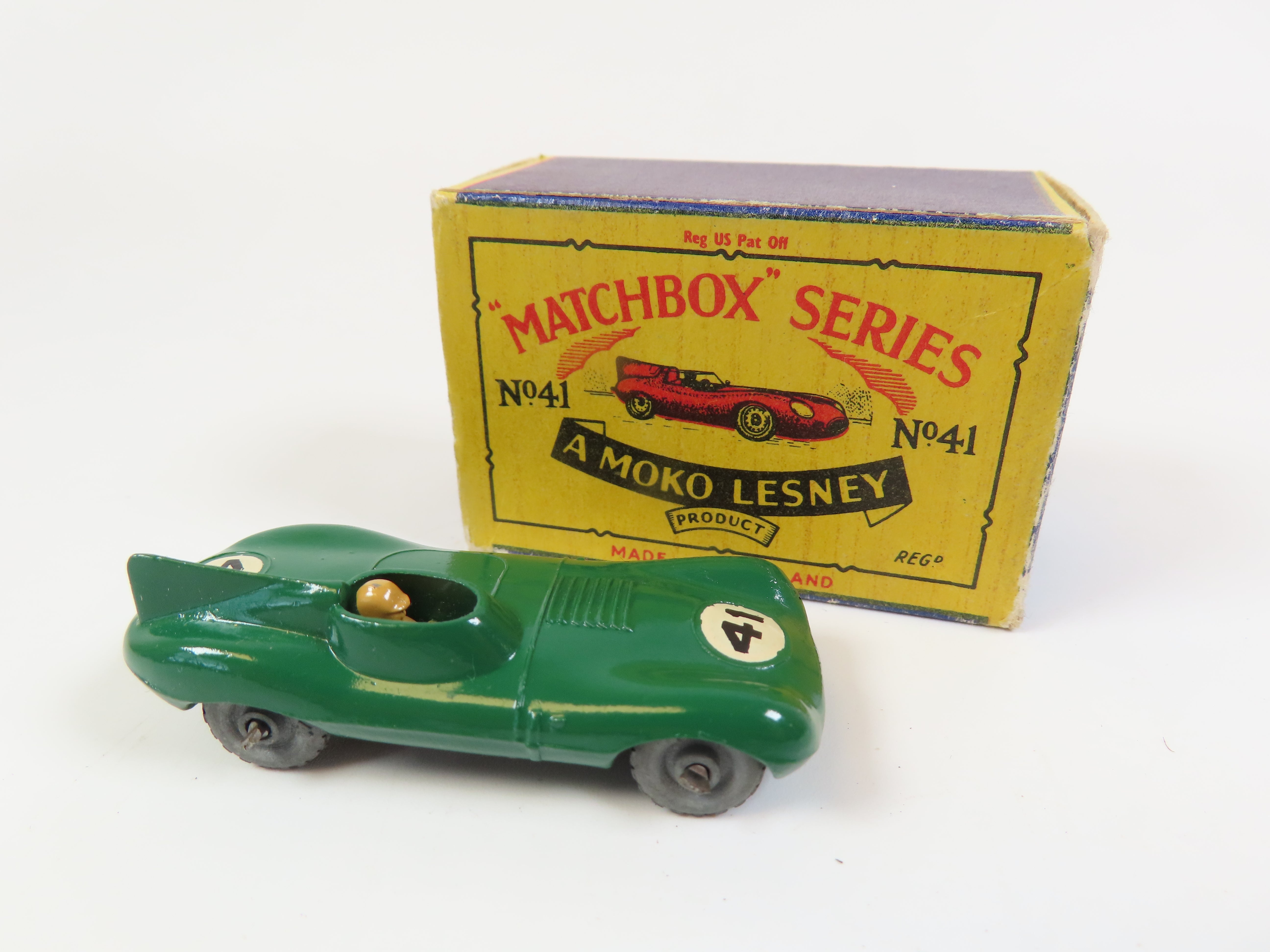 Matchbox No.41 D Type Jaguar in dark green, with tan driver figure and '41' decals to the front and rear. grey metal wheels.
