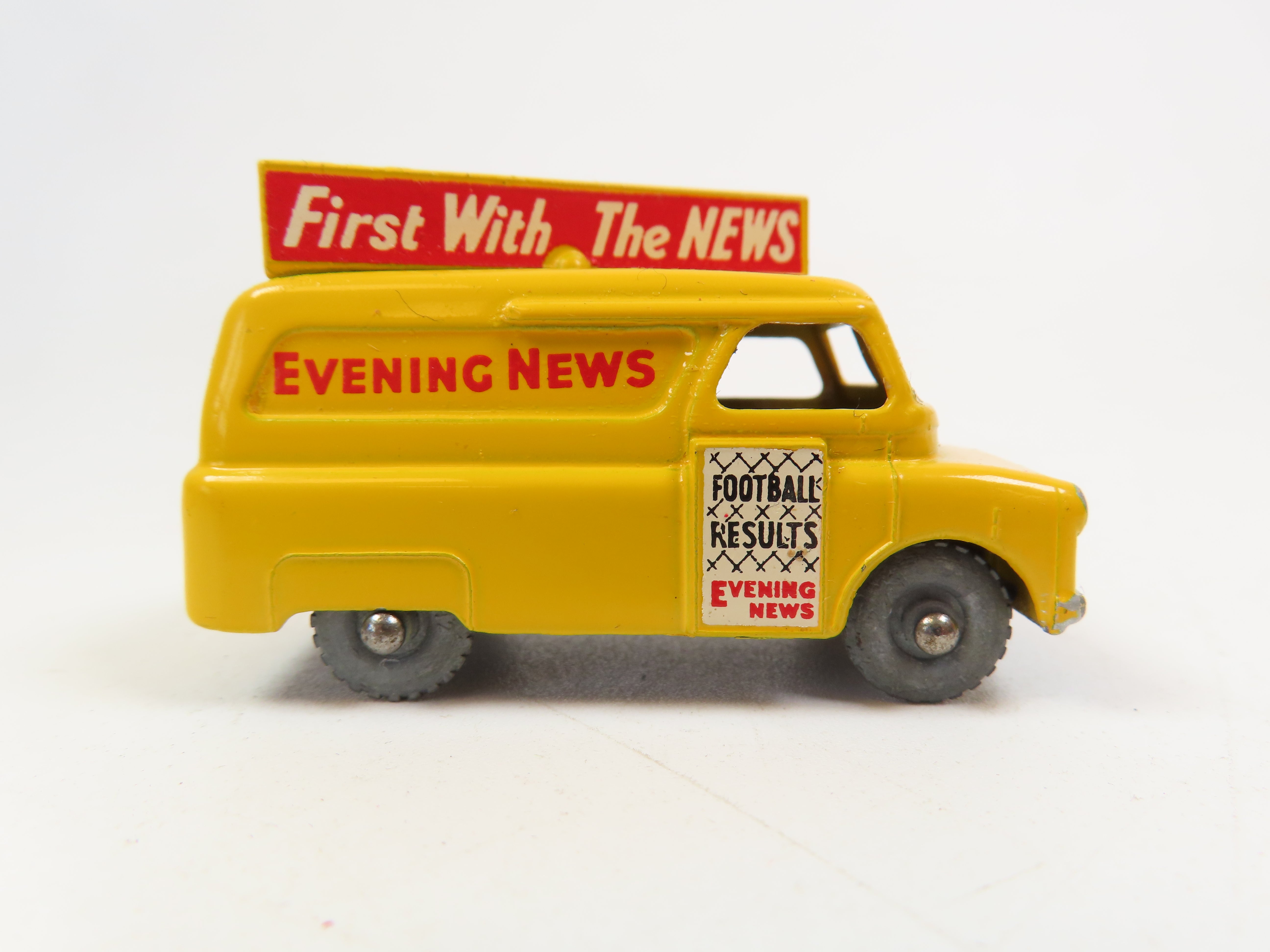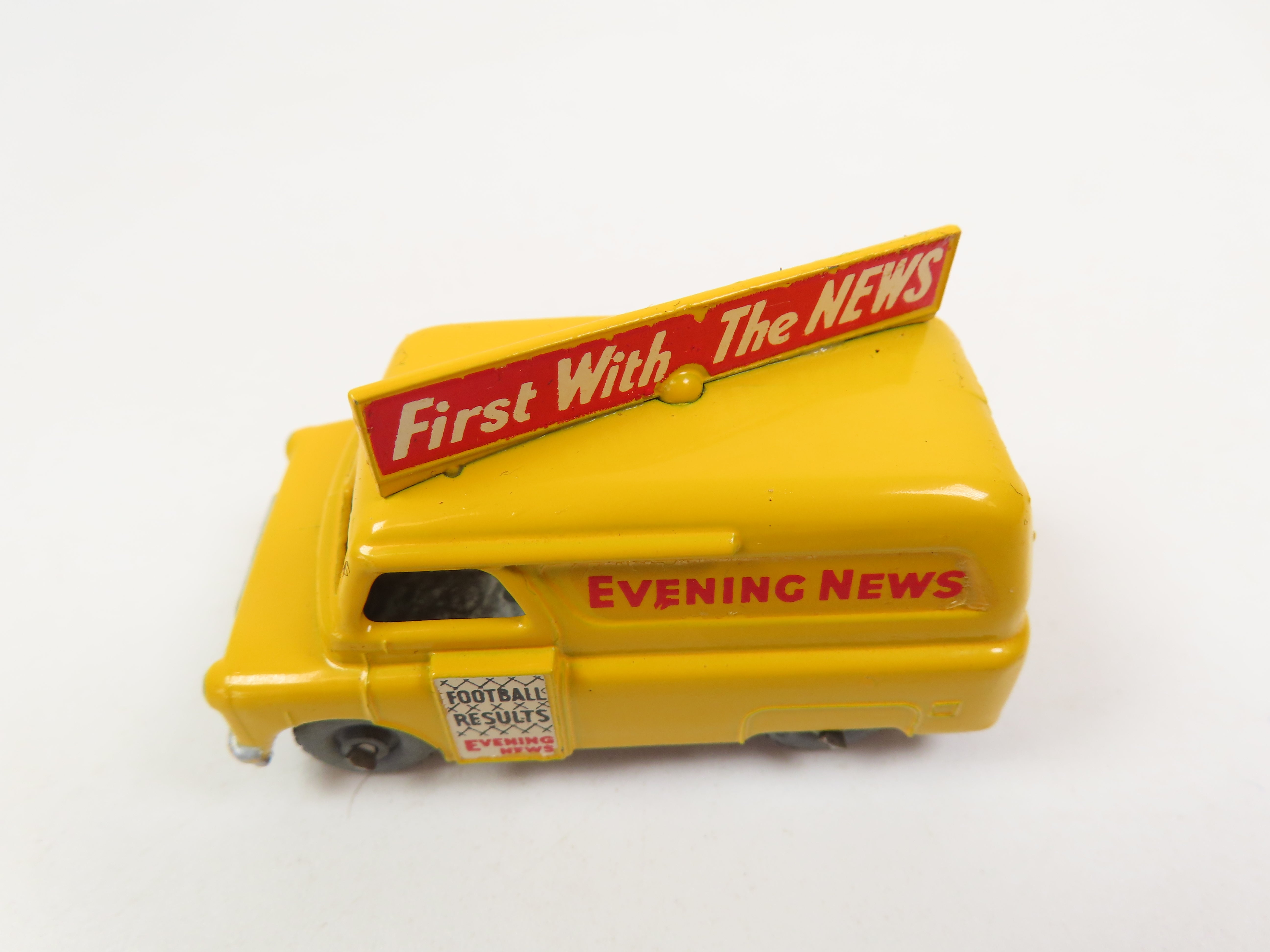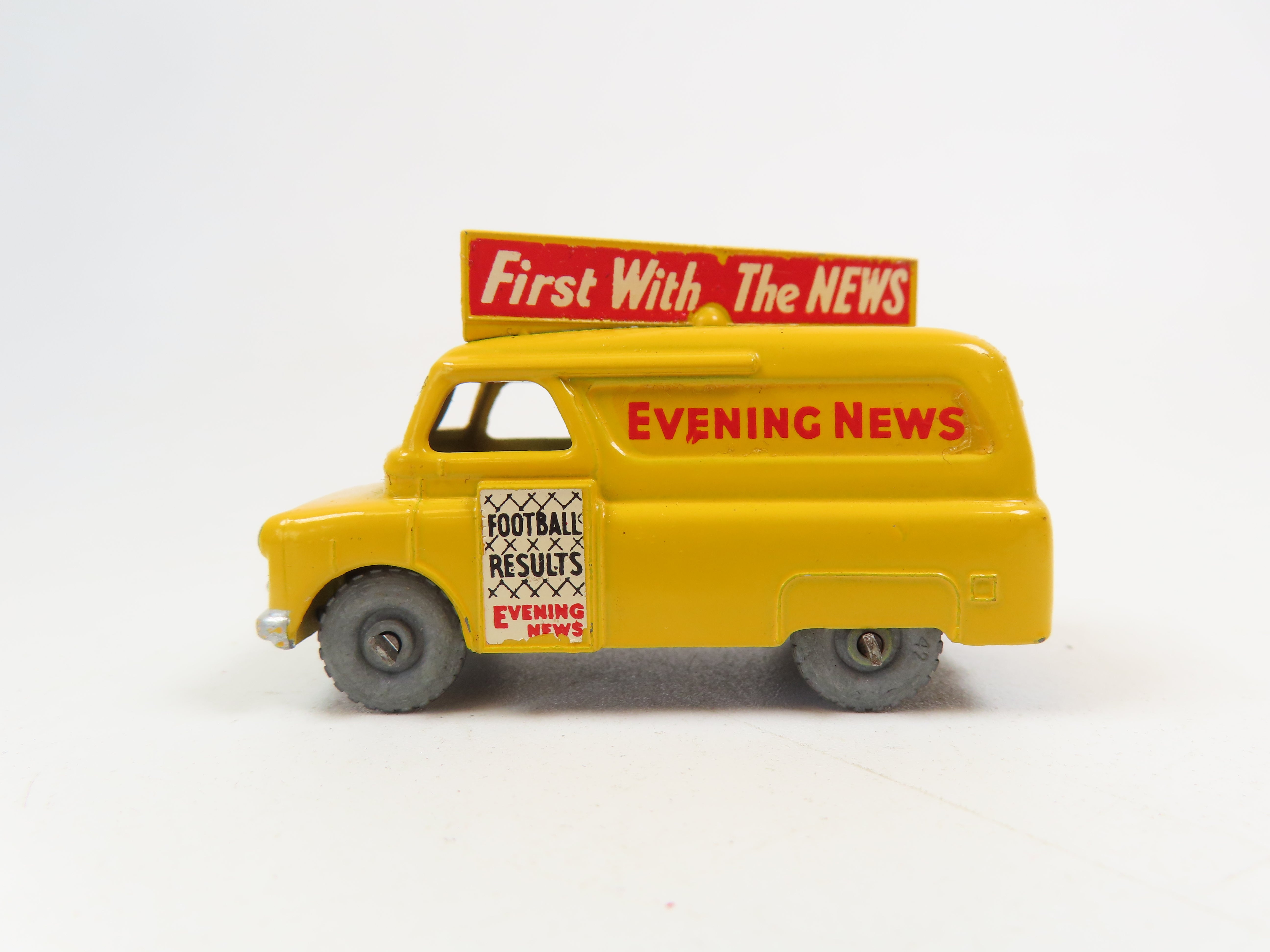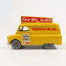 Matchbox No. 42 Evening News Van in yellow with 'Evening News' decals to each side and to the roof sign. Grey metal wheels.