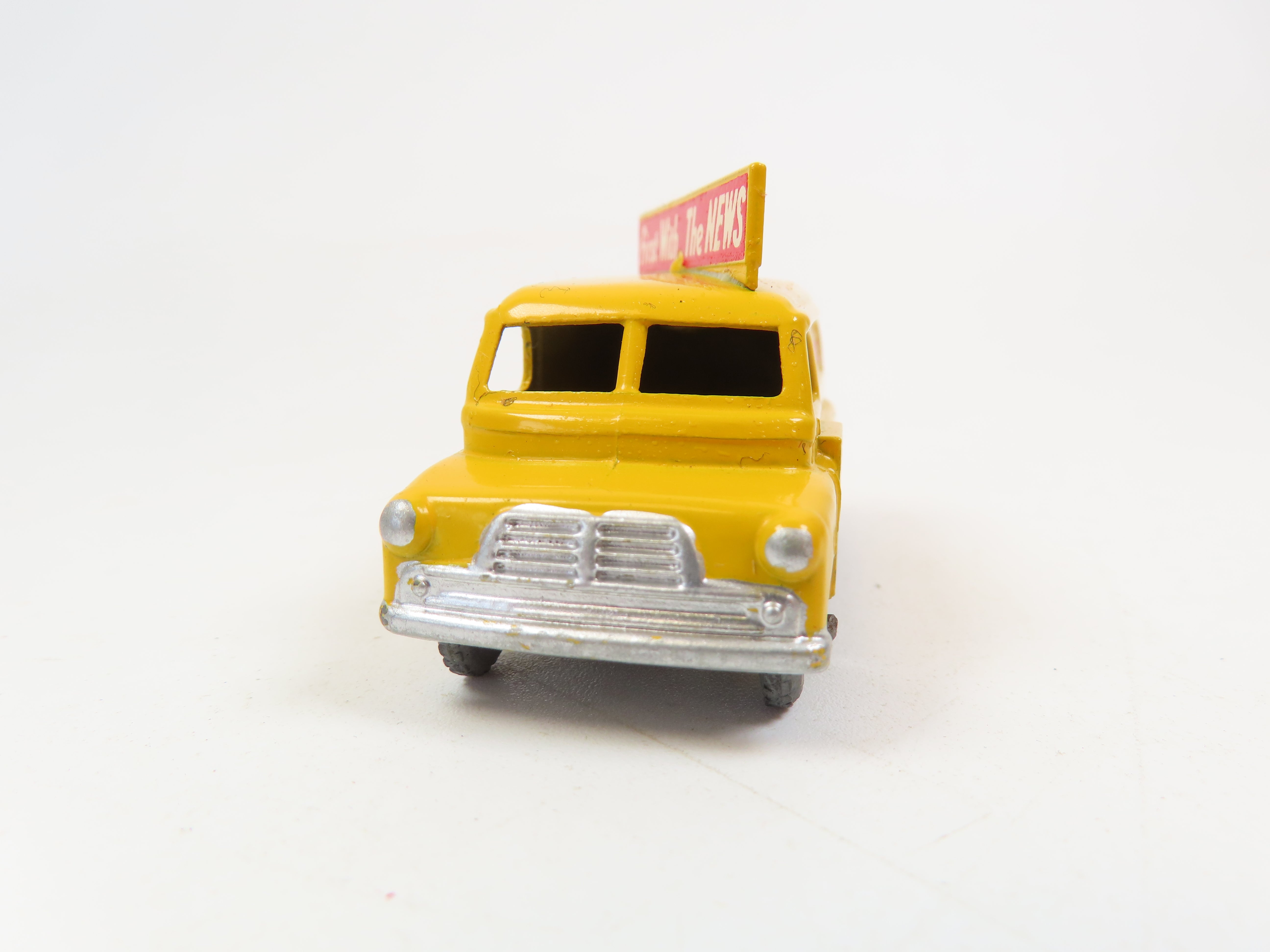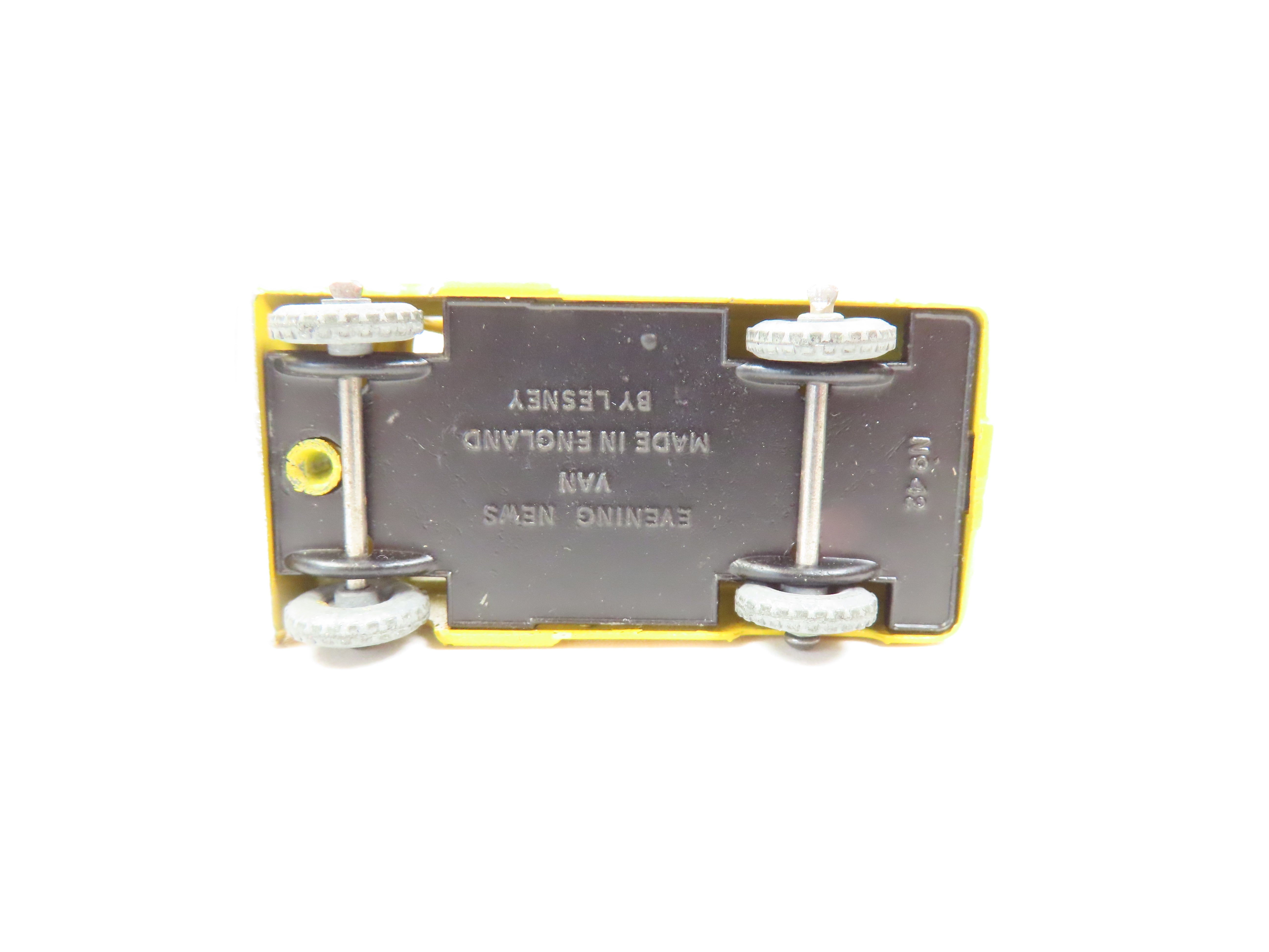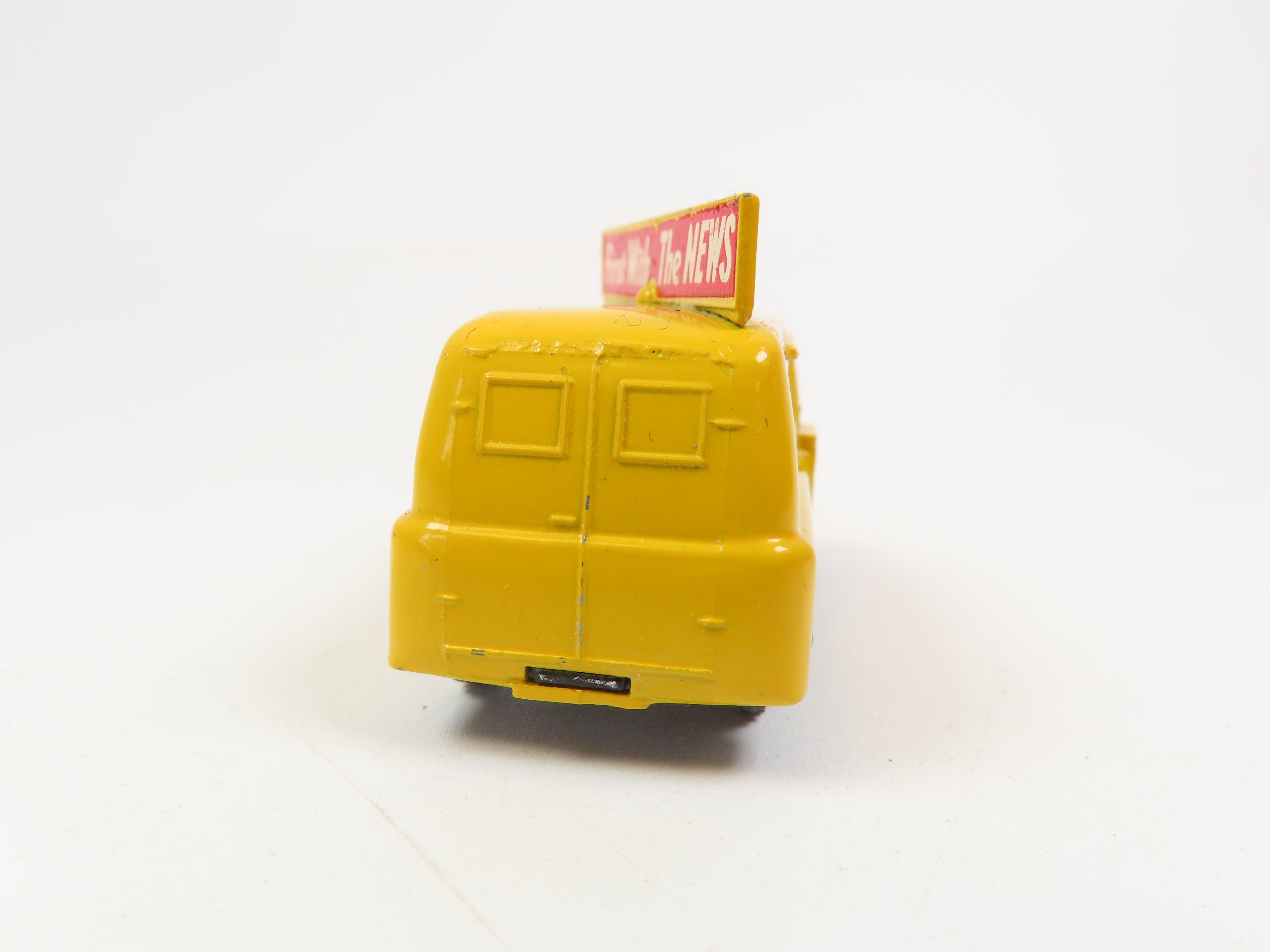 Matchbox No. 42 Evening News Van in yellow with 'Evening News' decals to each side and to the roof sign. Grey metal wheels.