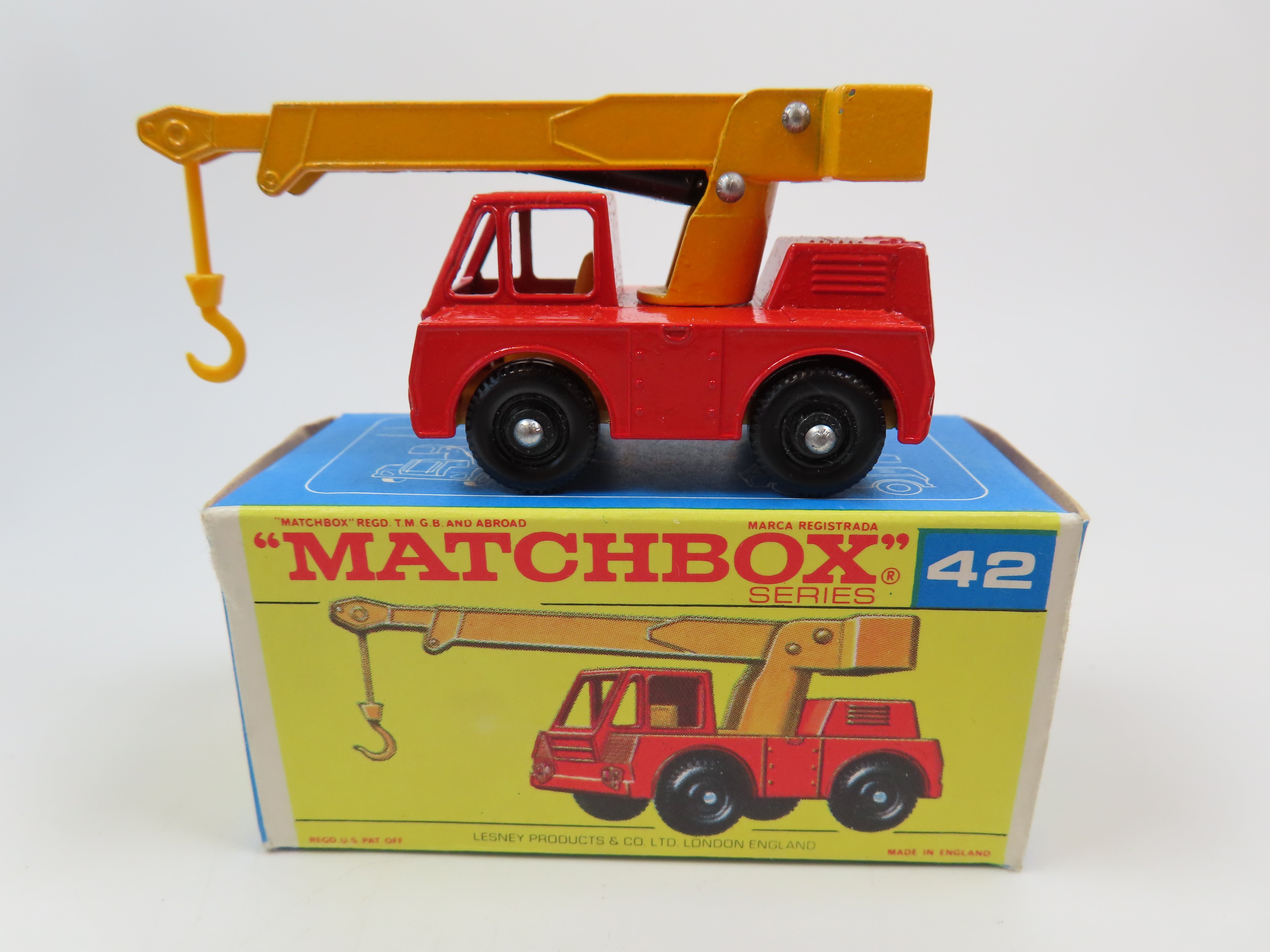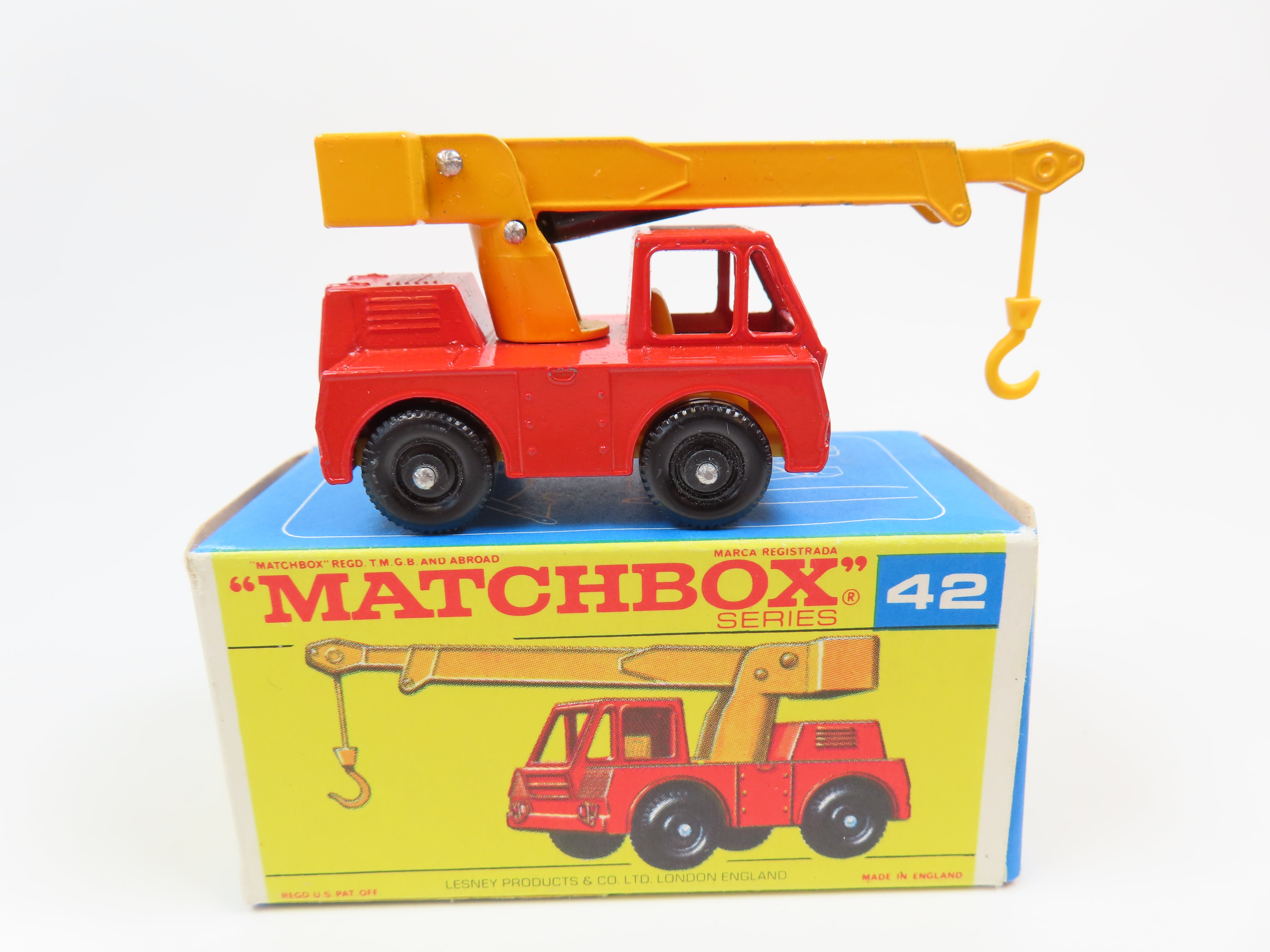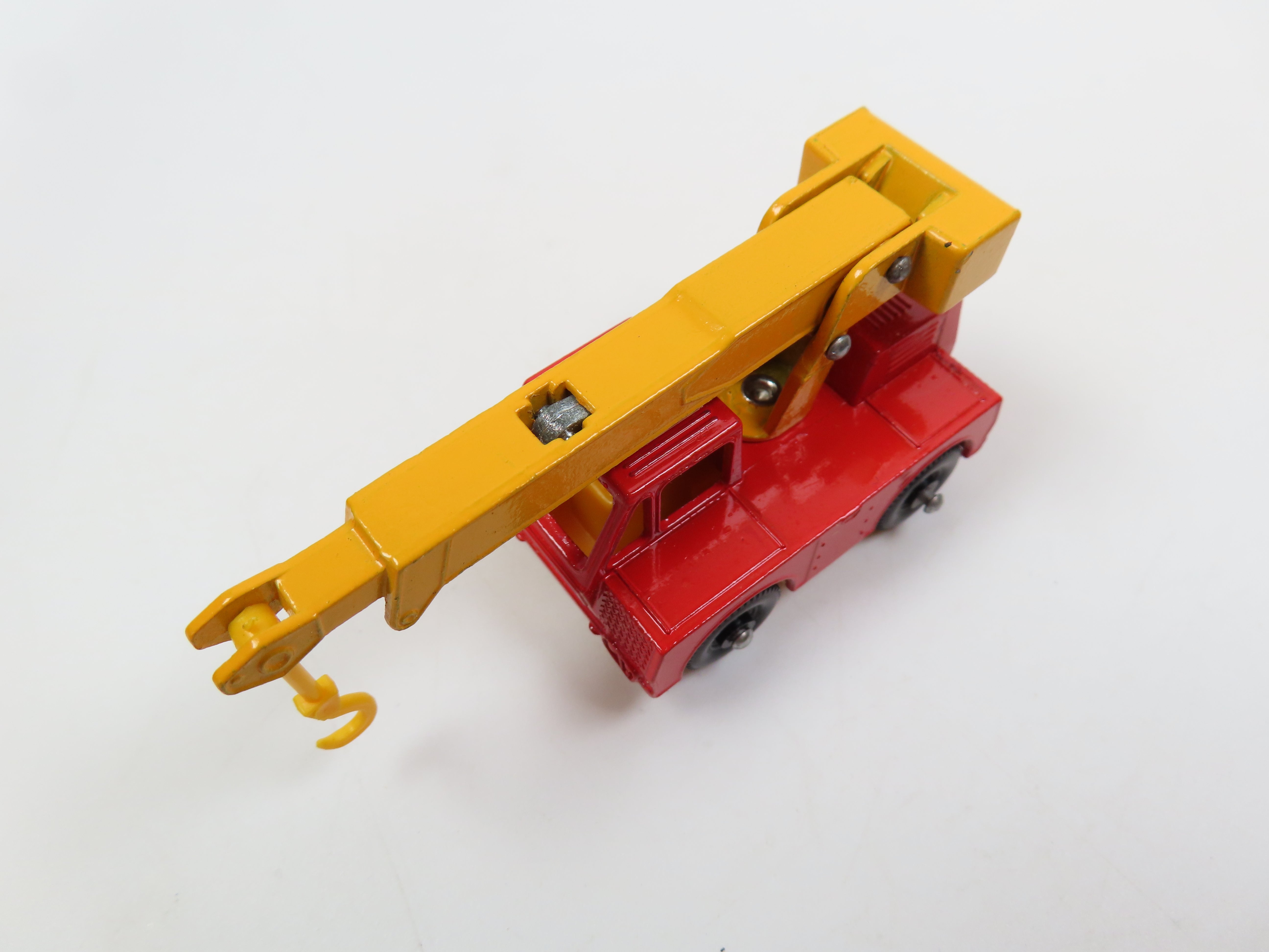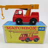 Matchbox No. 42 Iron Fairy Crane in red with dark yellow crane arm and plastic hook.