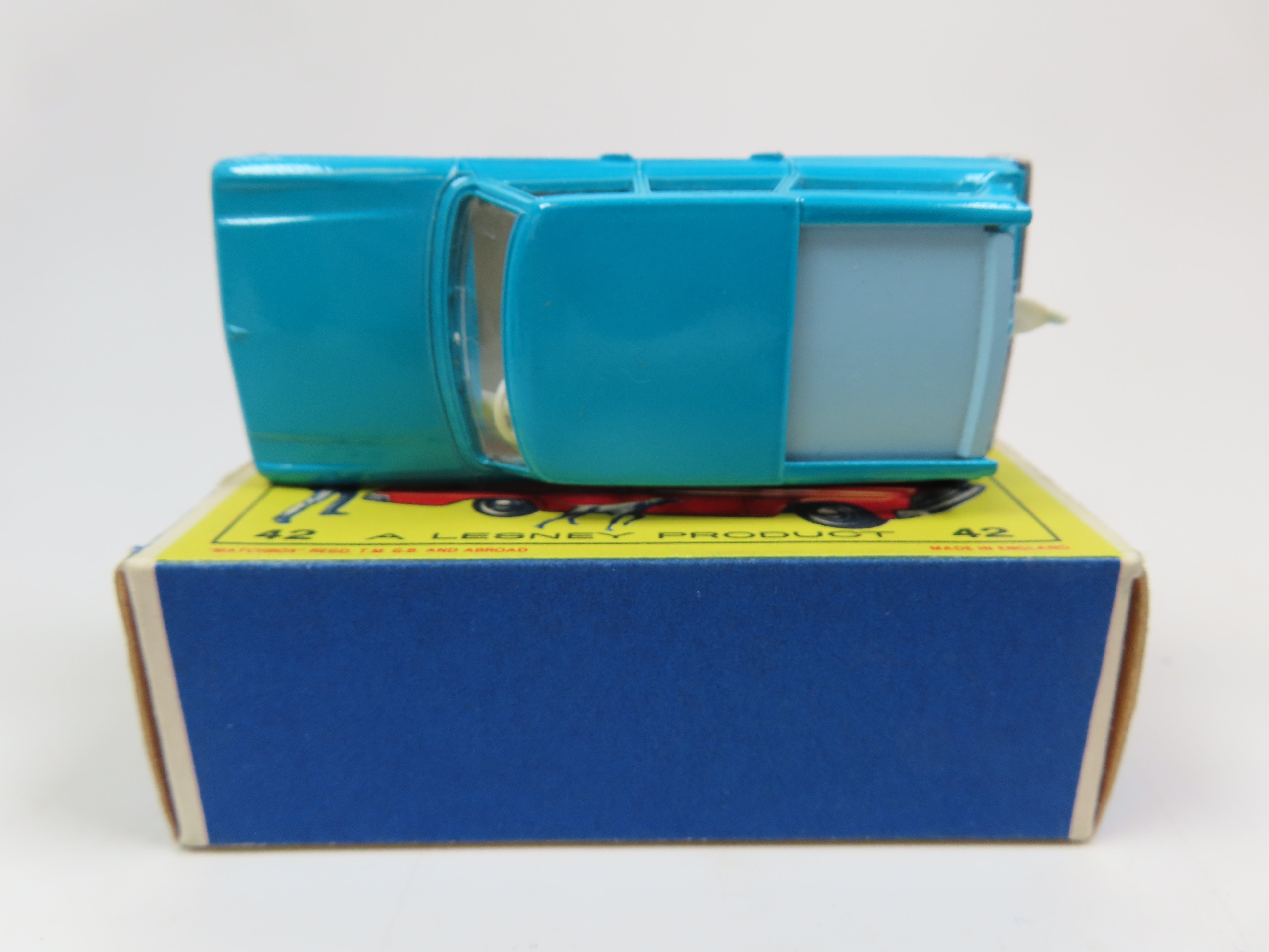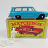 Matchbox No.42 Studebaker Station Wagon in turquoise , with pale blue sliding roof panel and complete with plastic man and and dog figure.