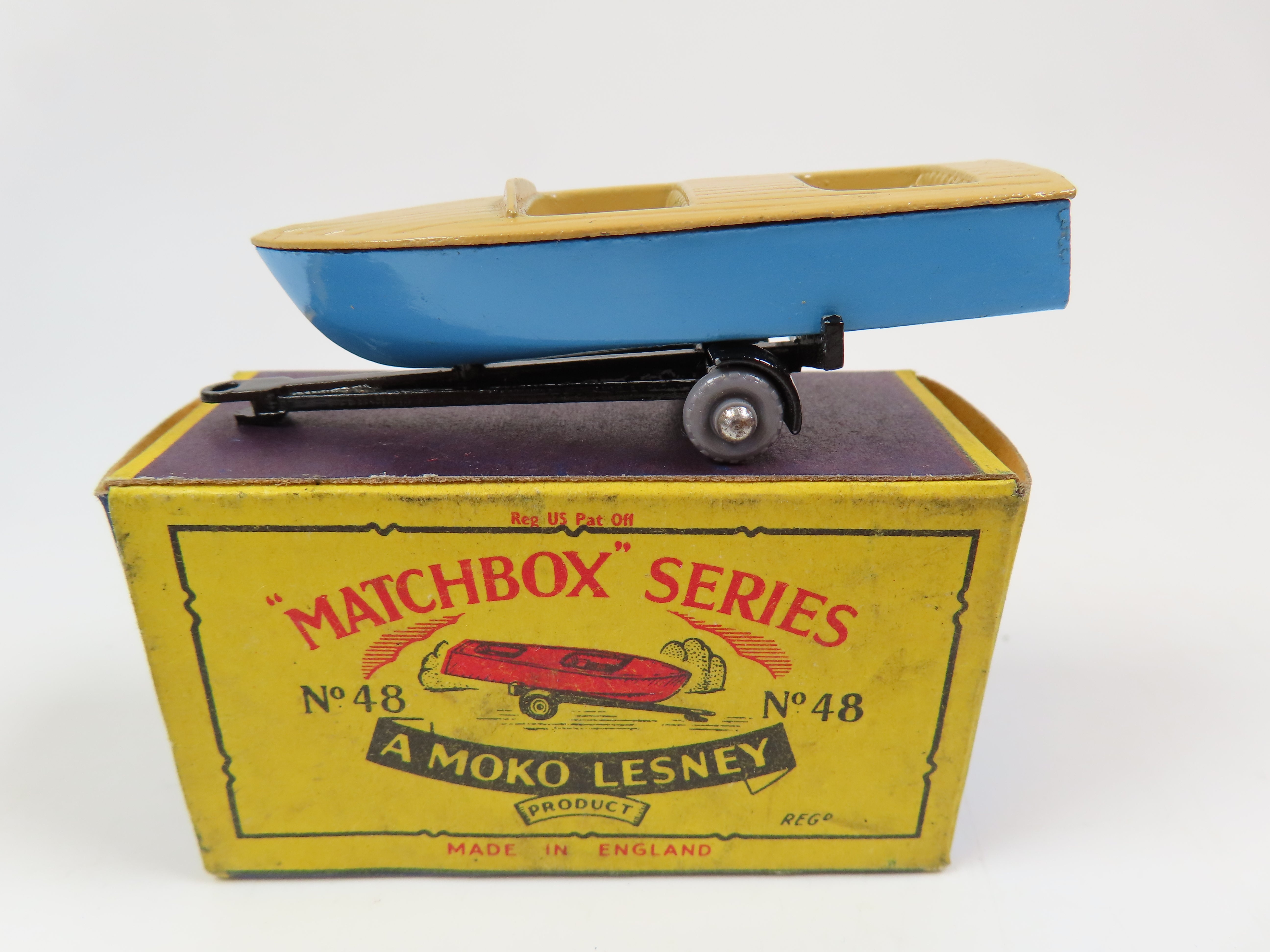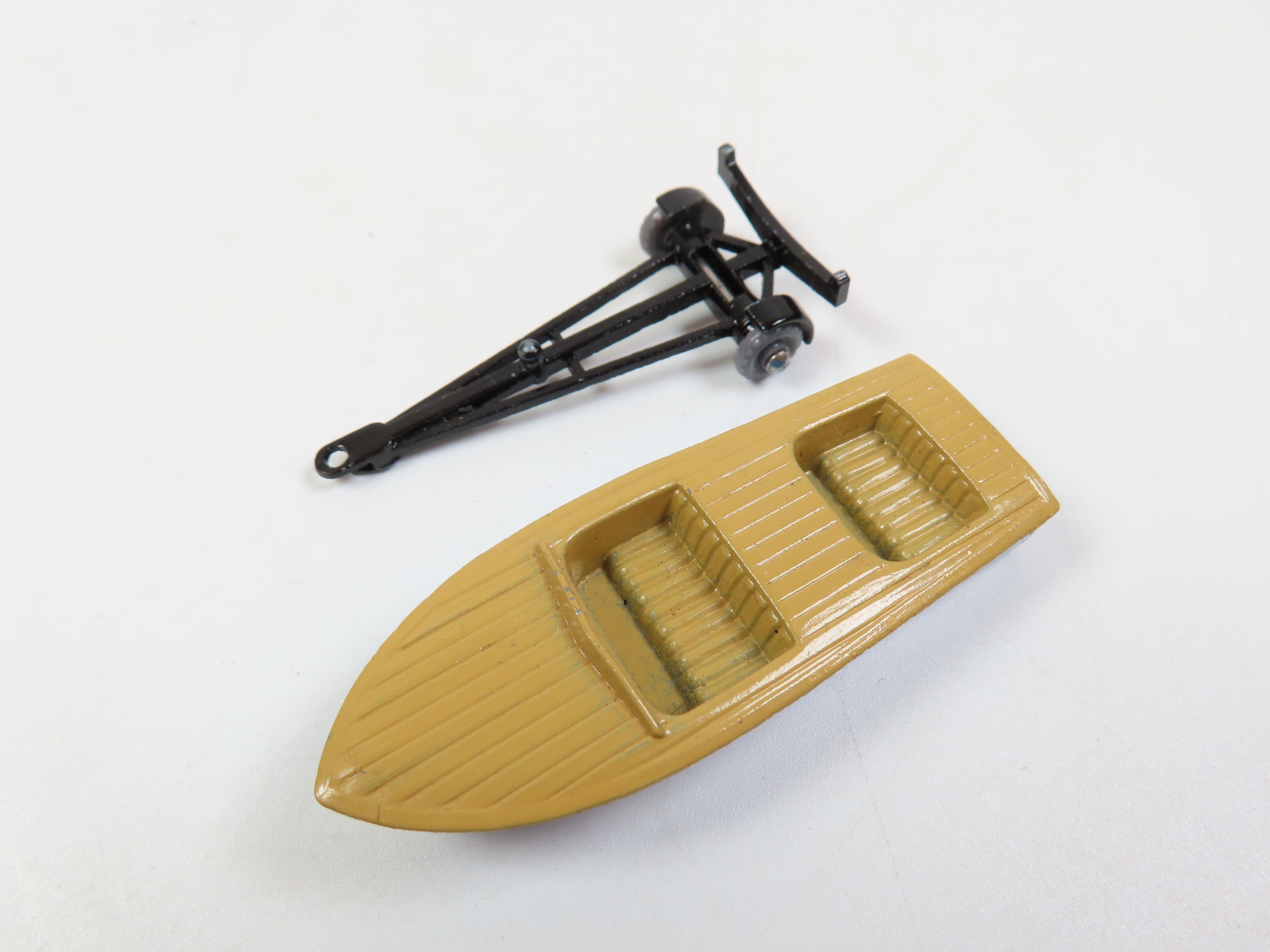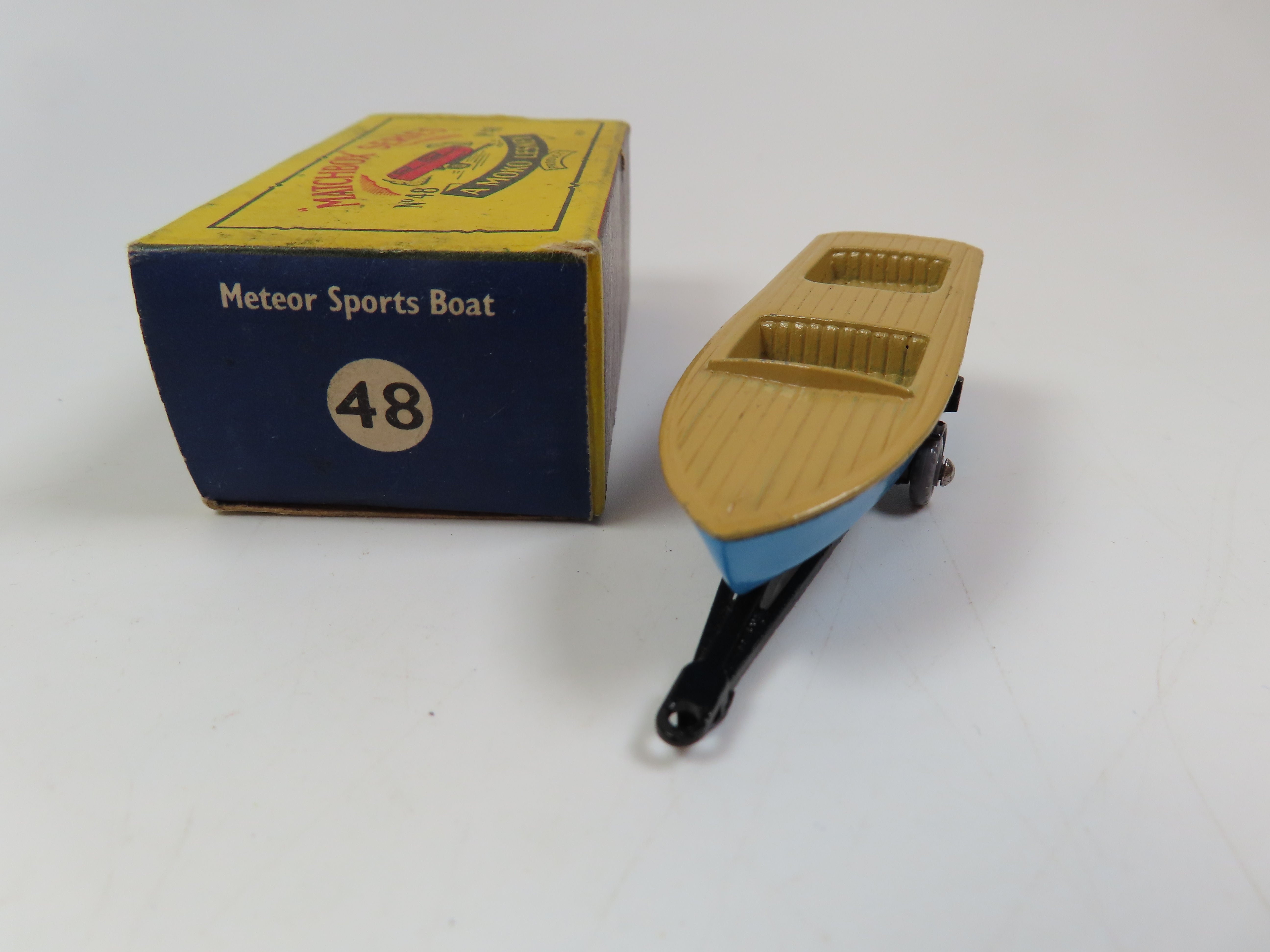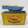 Matchbox No.48 Meteor Sports Boat, metal blue and tan boat, black trailer and scarce grey plastic wheels.