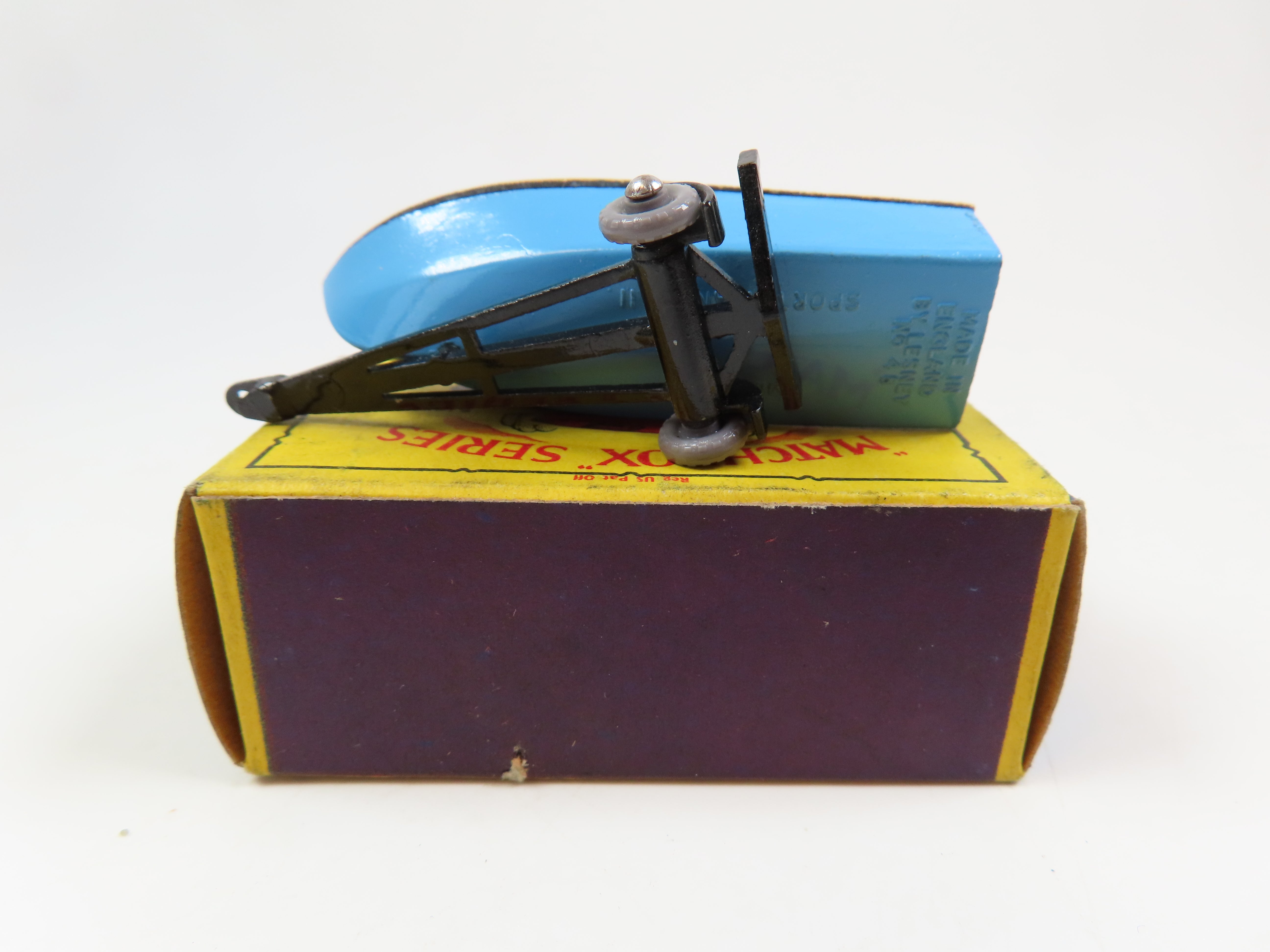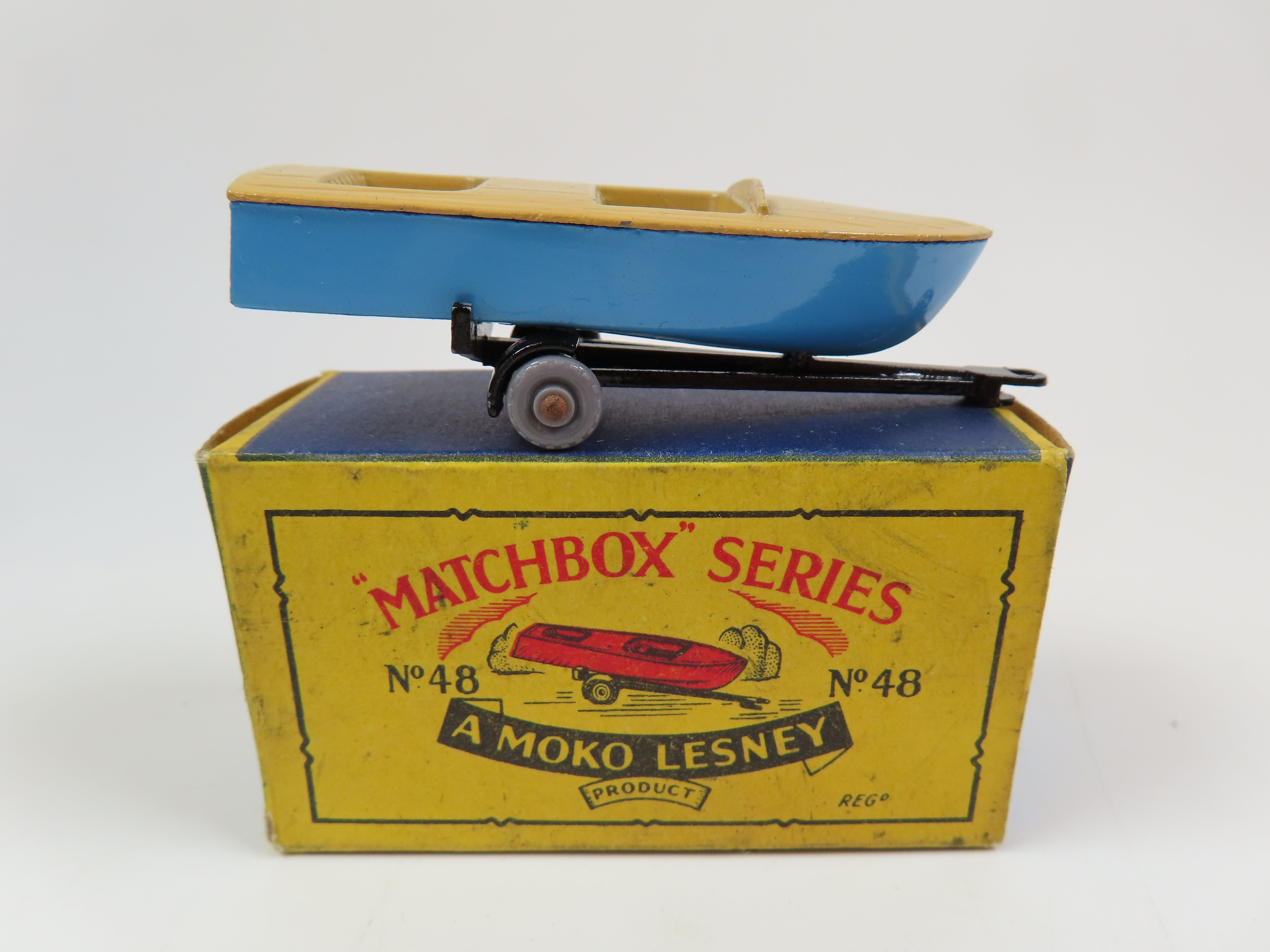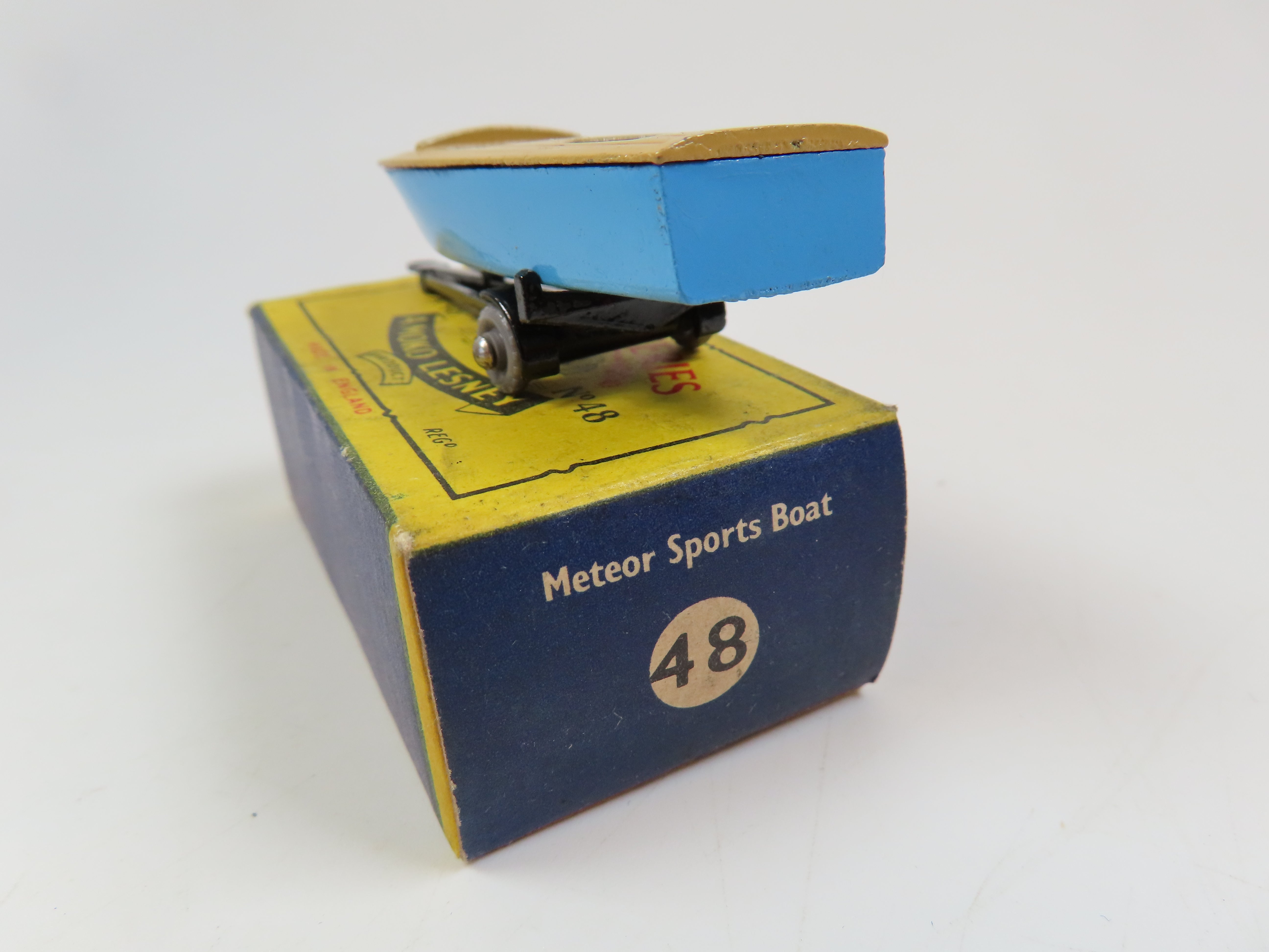 Matchbox No.48 Meteor Sports Boat, metal blue and tan boat, black trailer and scarce grey plastic wheels.