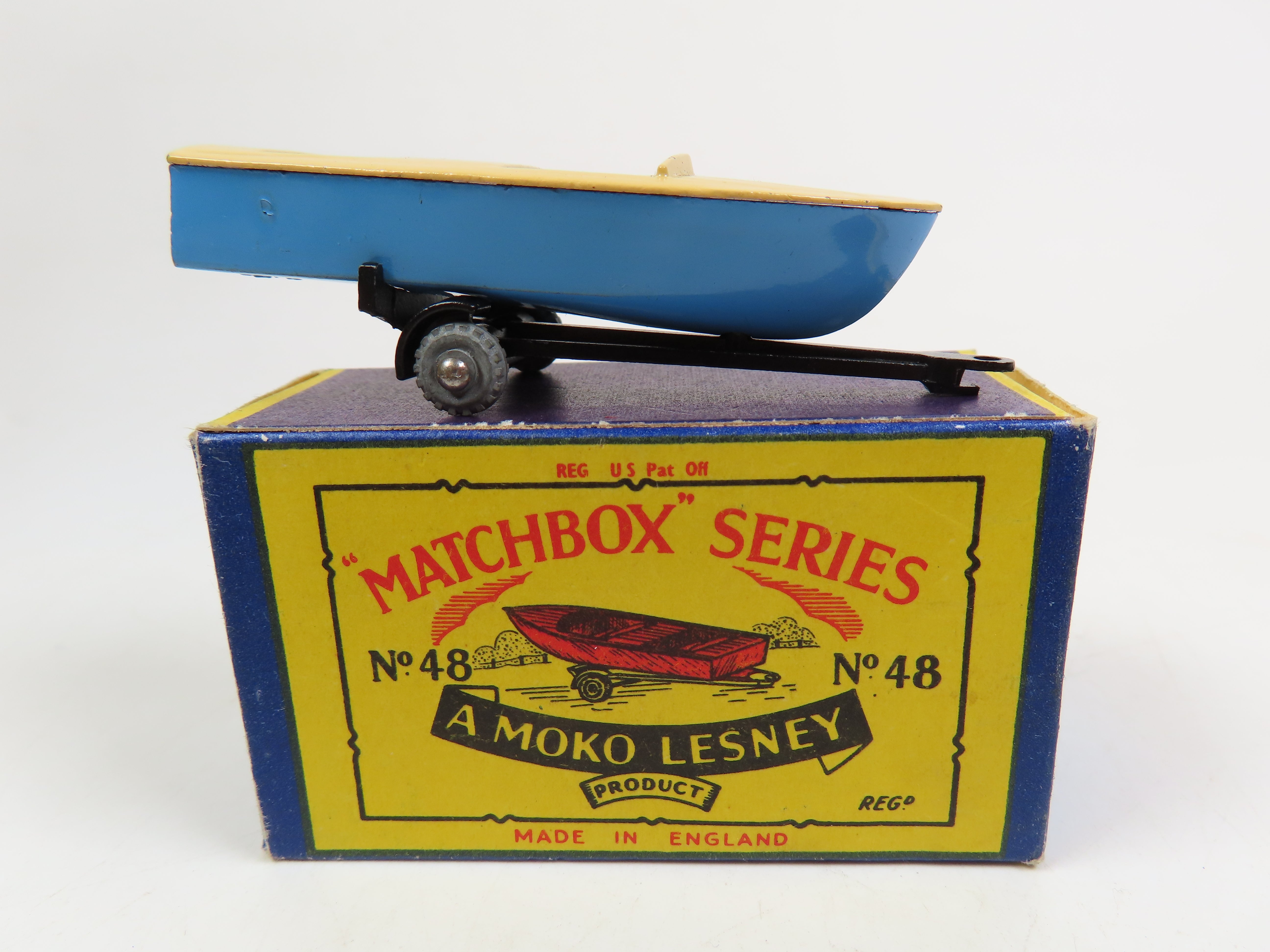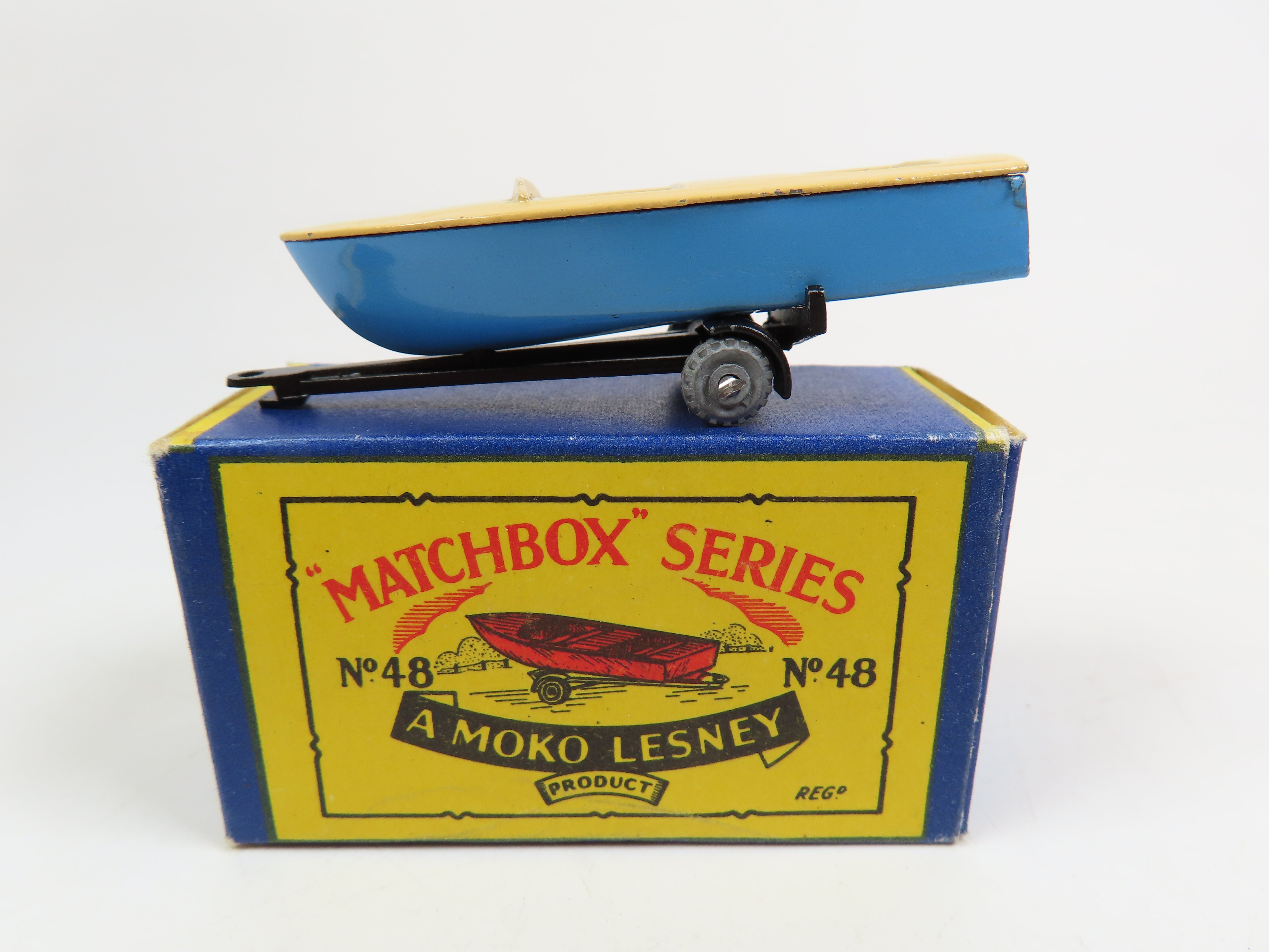 Matchbox No.48 Meteor Sports Boat & Trailer with a lovely tan and blue boat and black trailer with metal wheels.