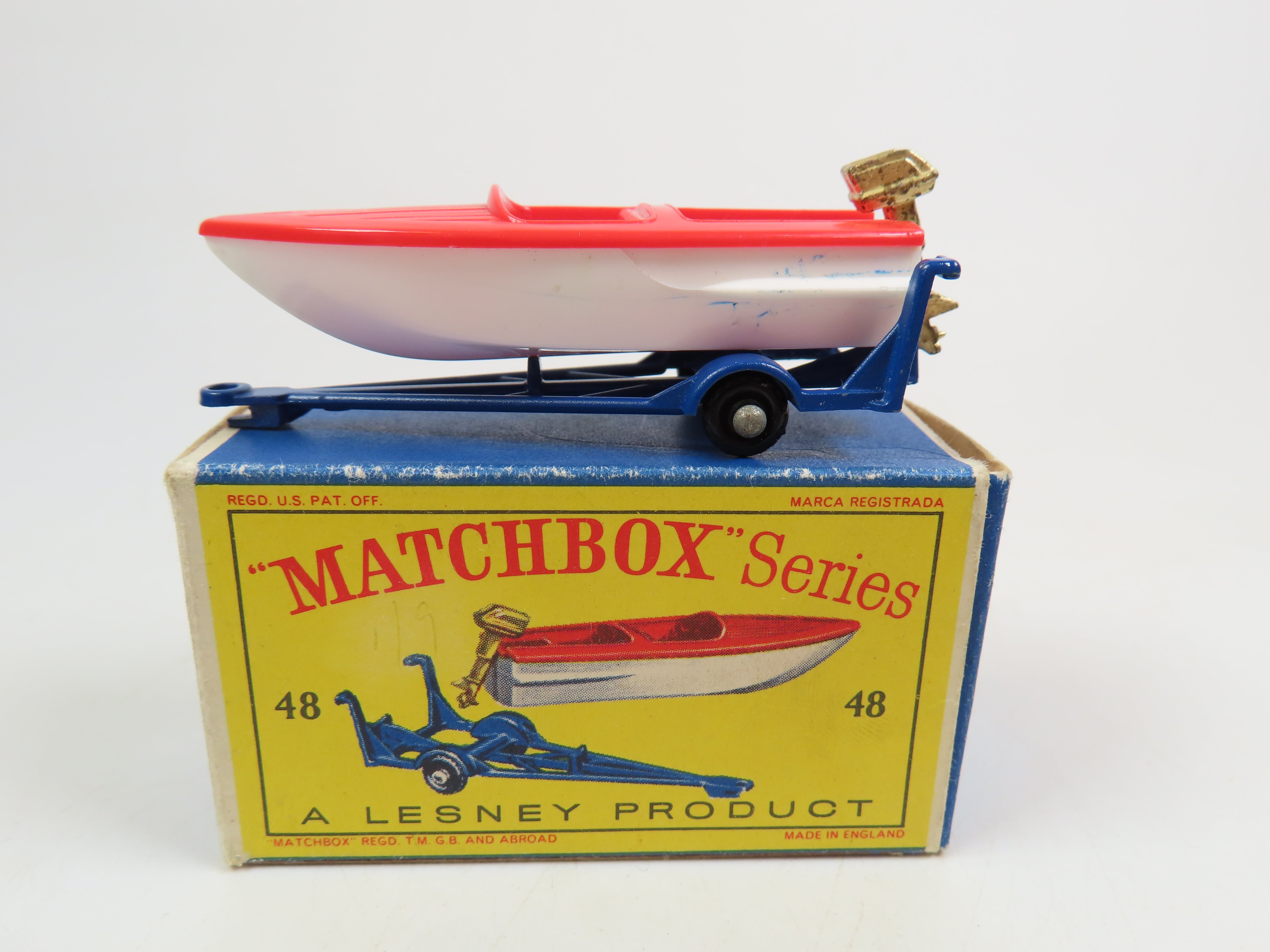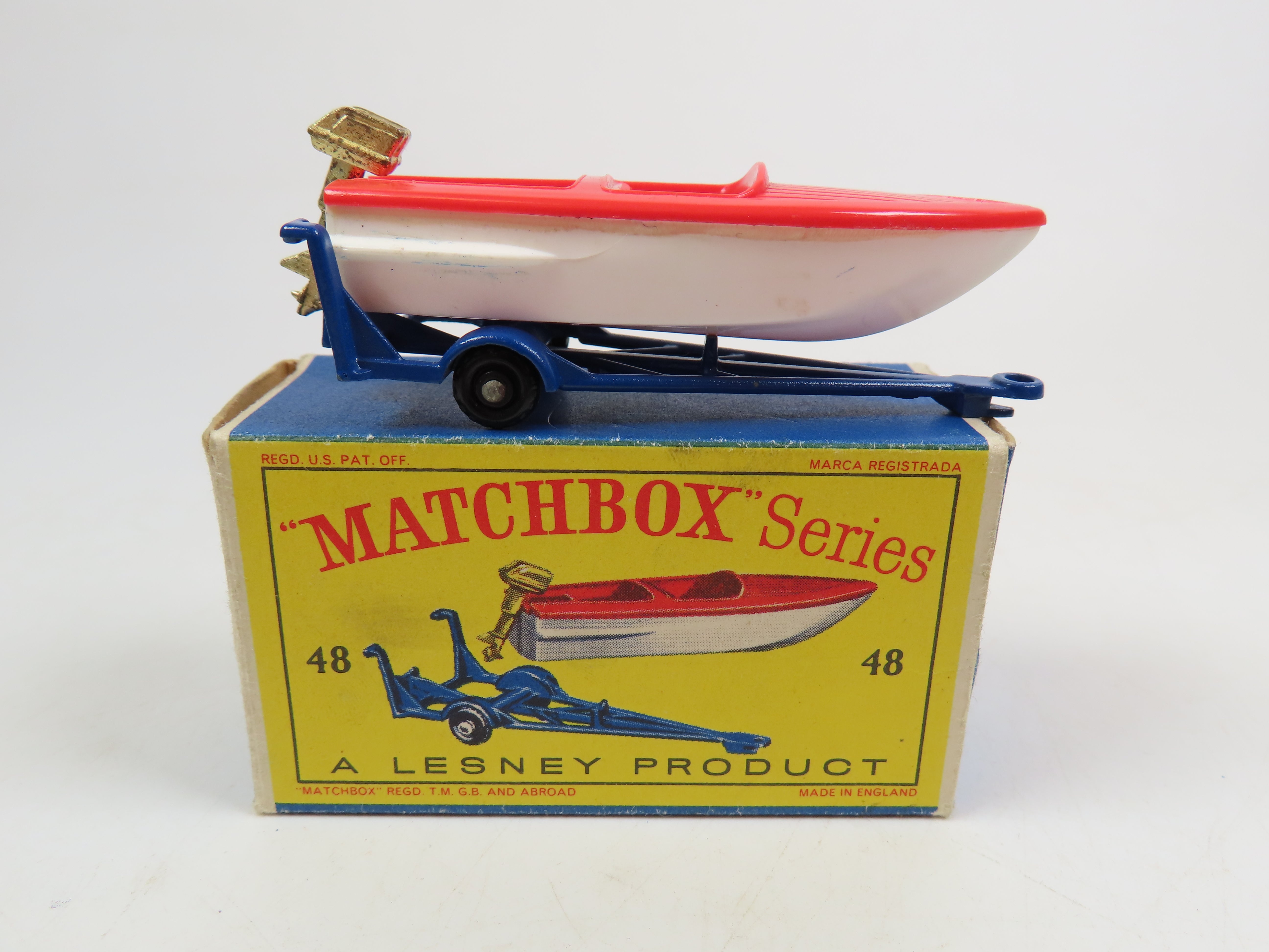 Matchbox No.48 Trailer with Removable Sports Boat with blue trailer and red and white plastic boat.