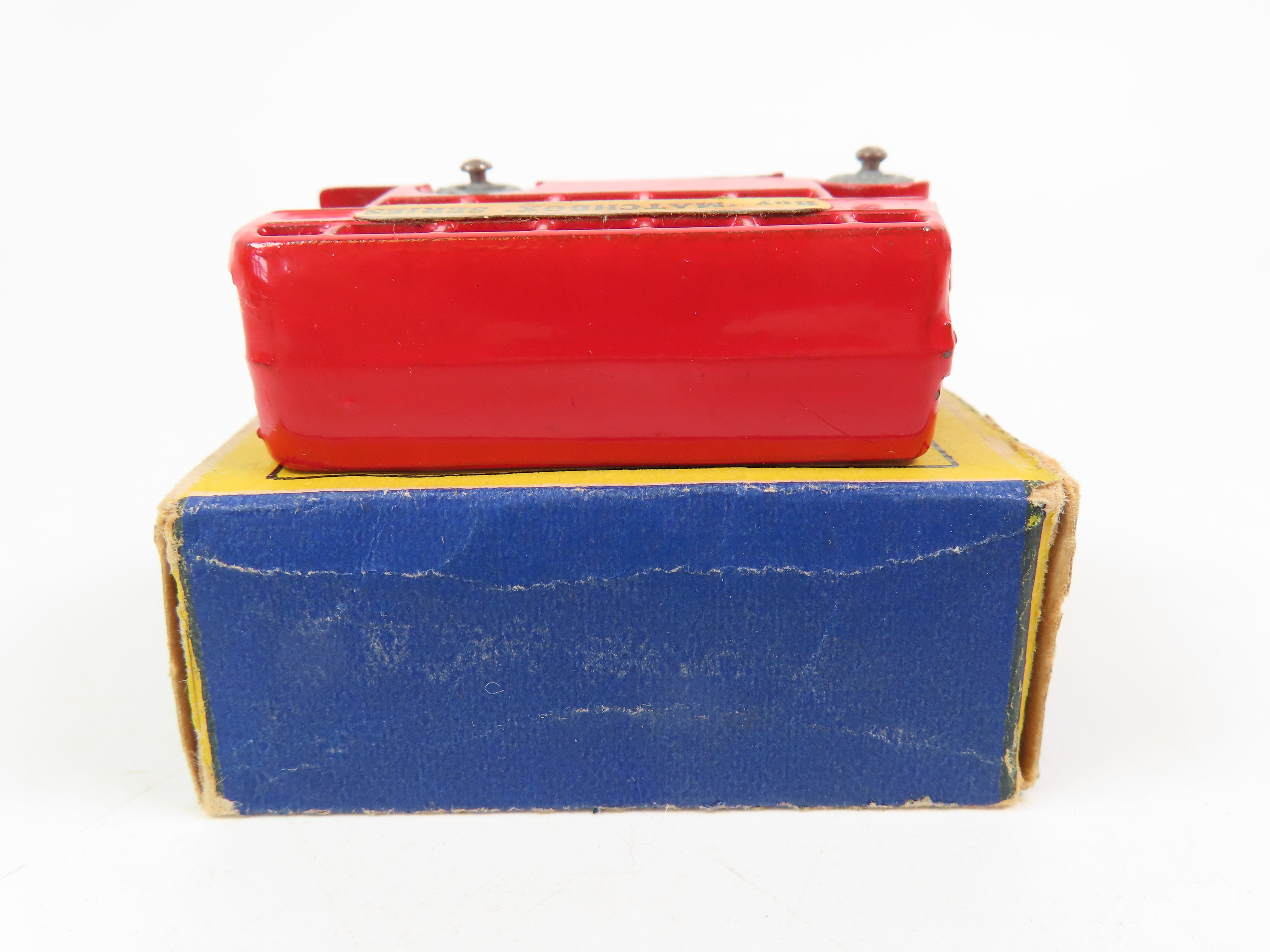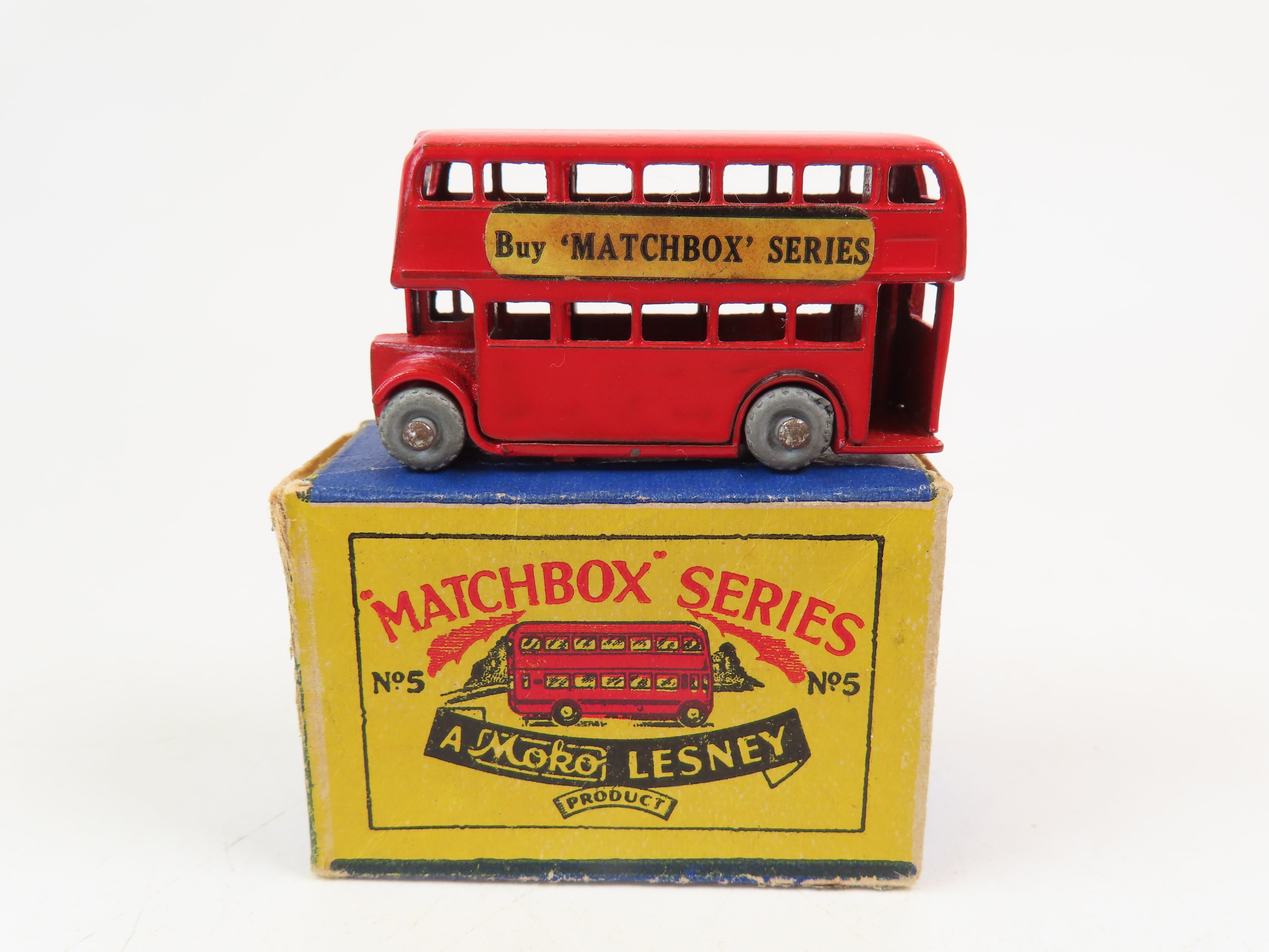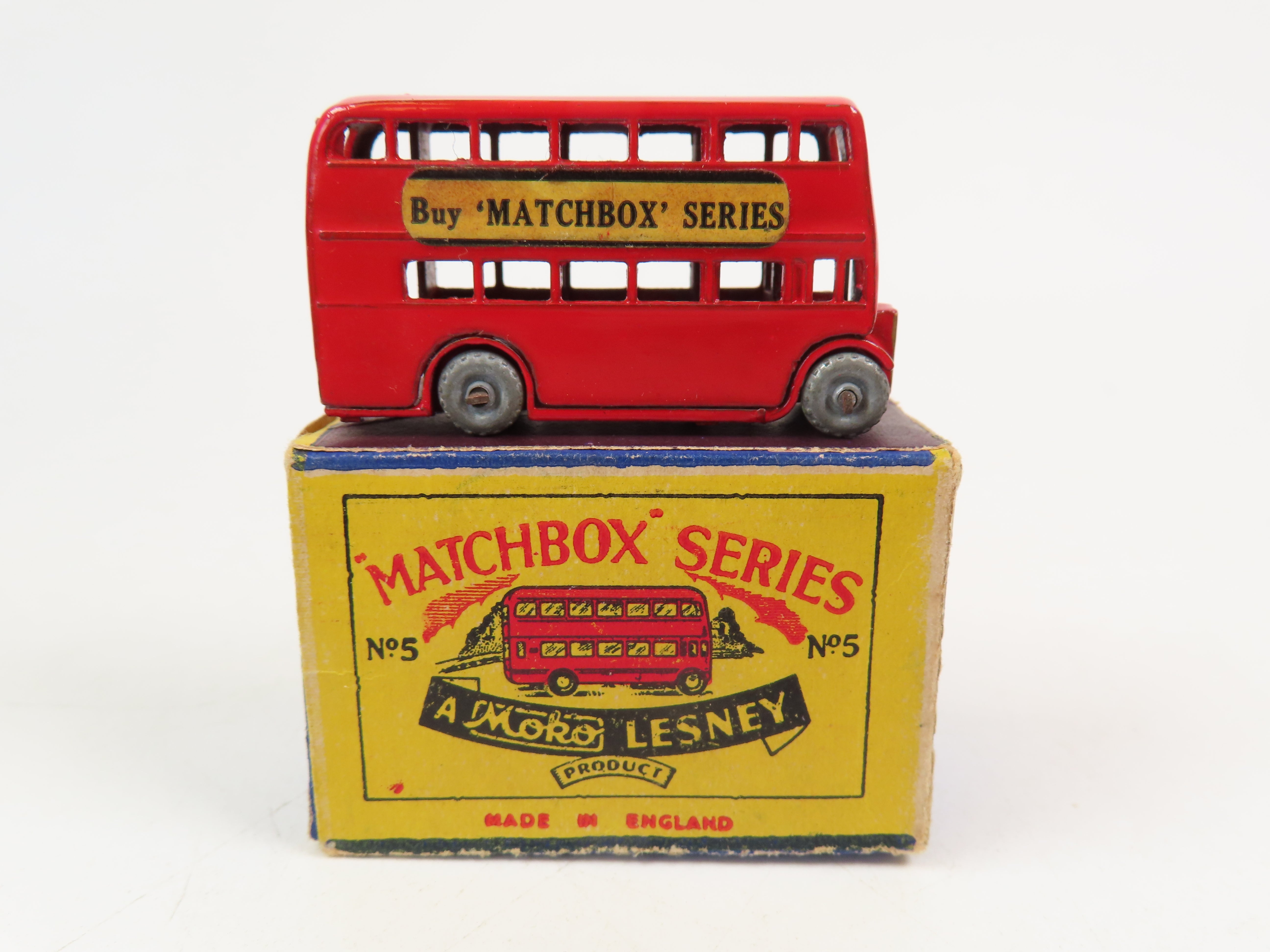 Matchbox No.5 London Bus in bright red, with gold painted grille, 'Buy Matchbox Series' decals and metal wheels,