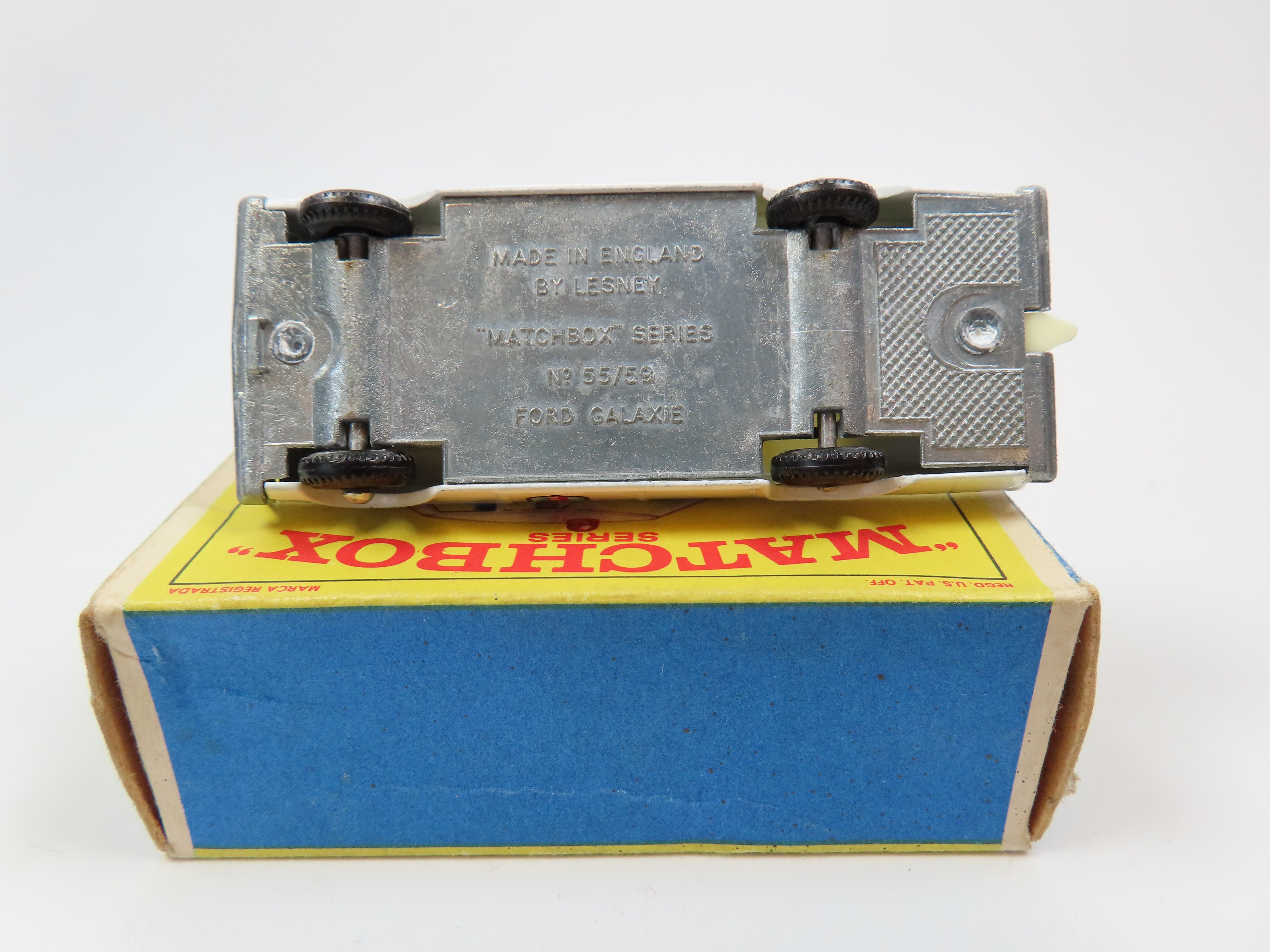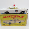 Matchbox No.55 Police Car with red dome light to the roof as well as 'Police' and emblem decals to the front and sides.