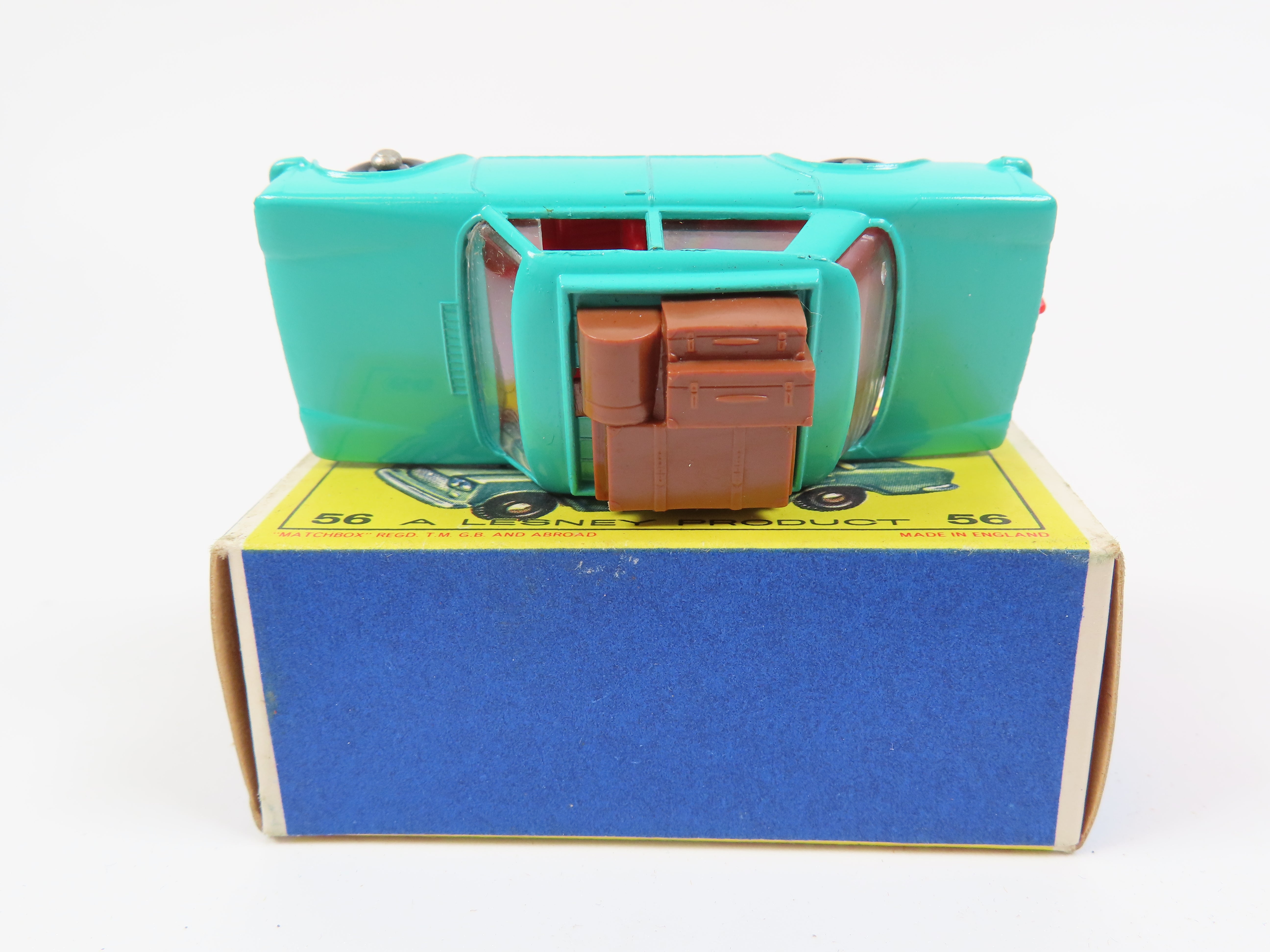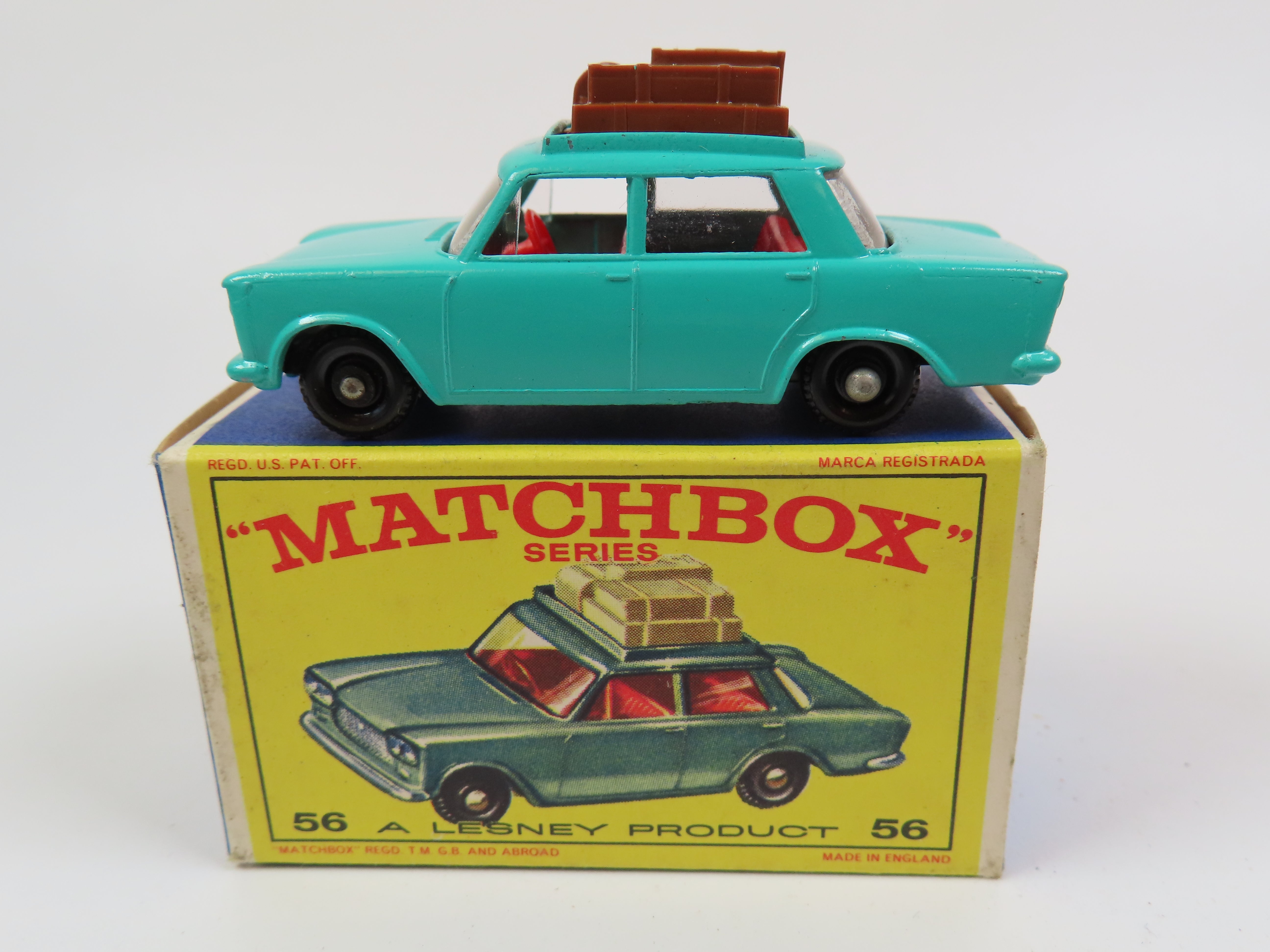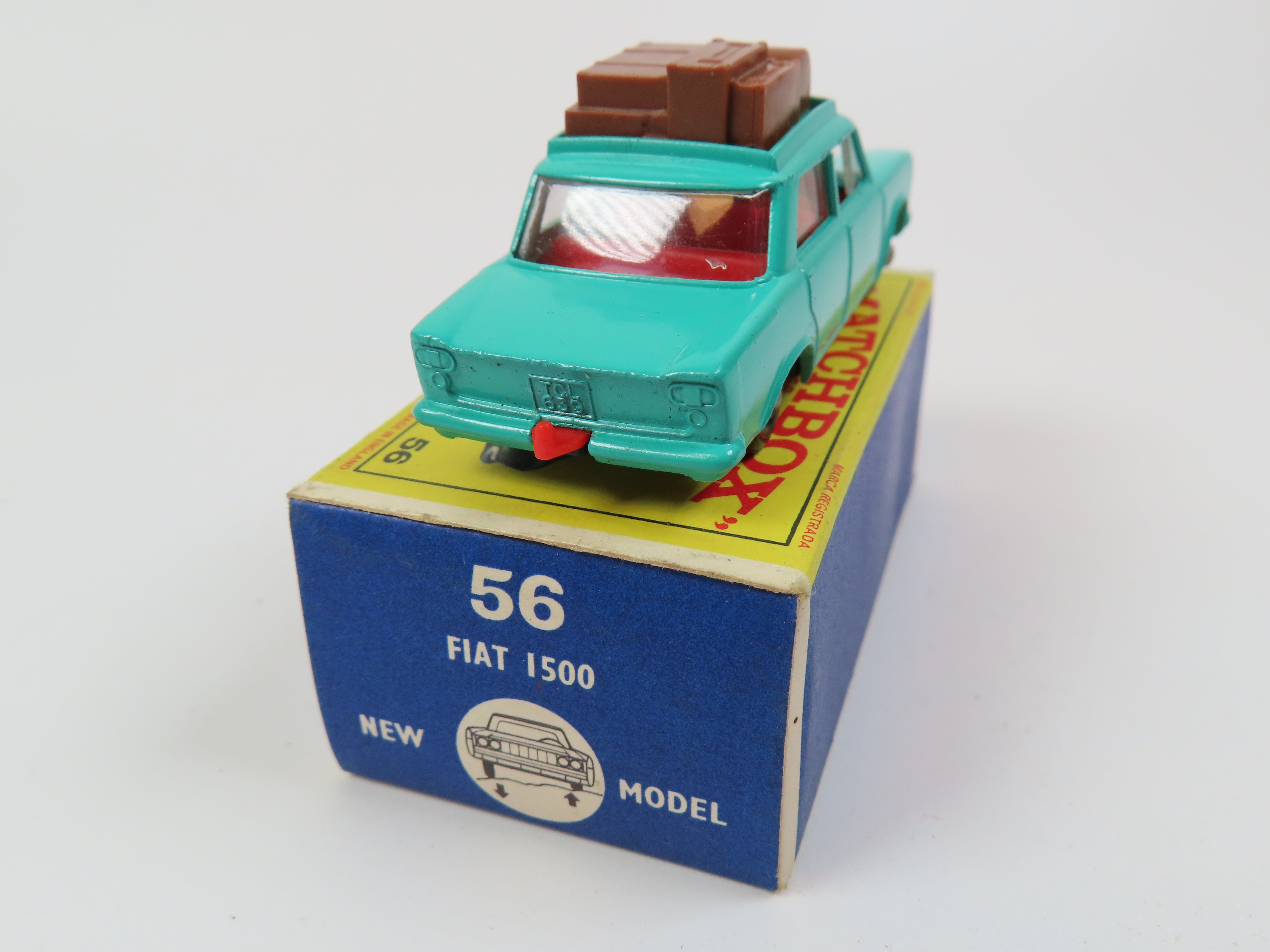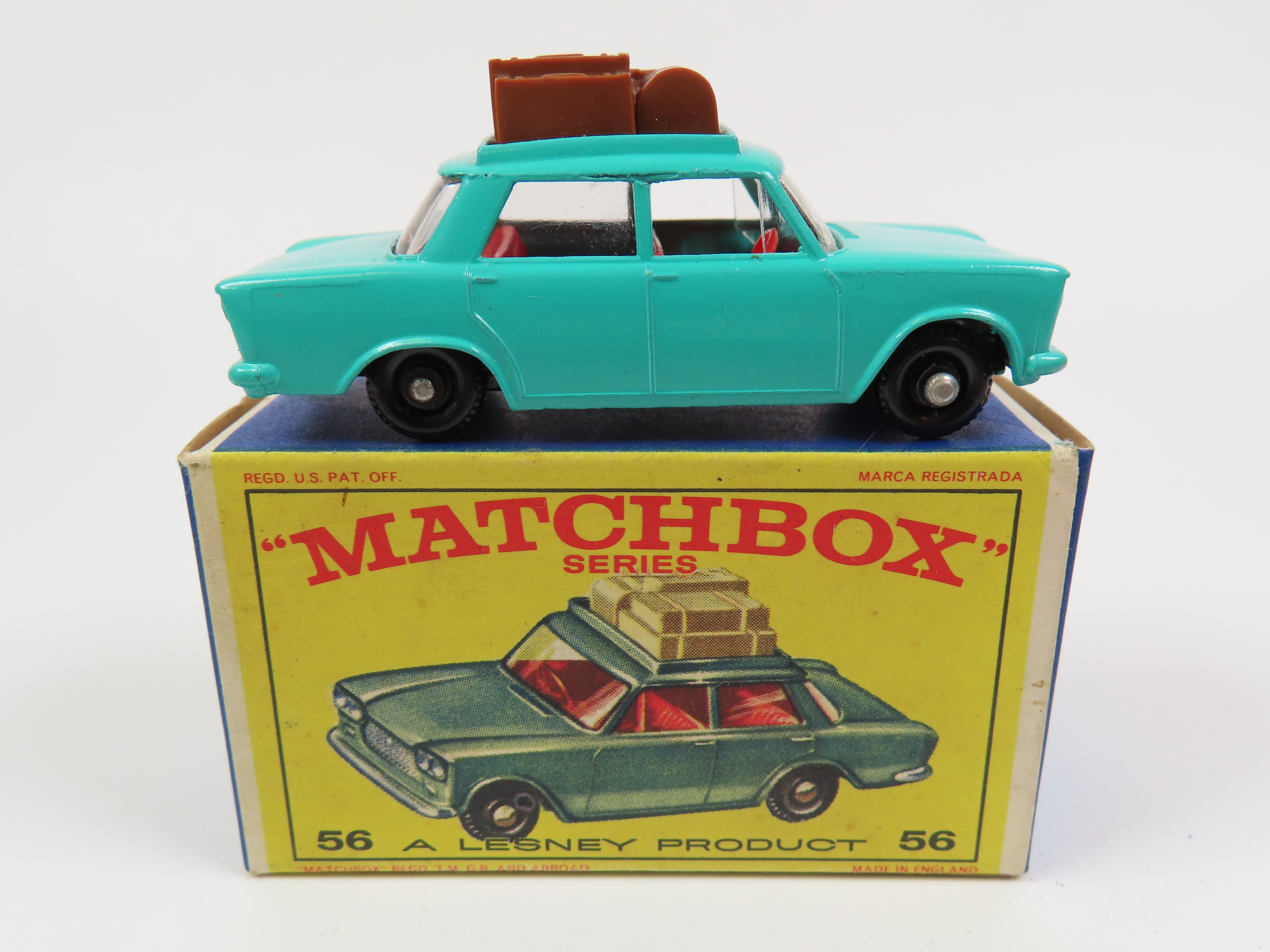 Matchbox No.56 Fiat 1500 in green with red interior and brown plastic luggage to the roof.
