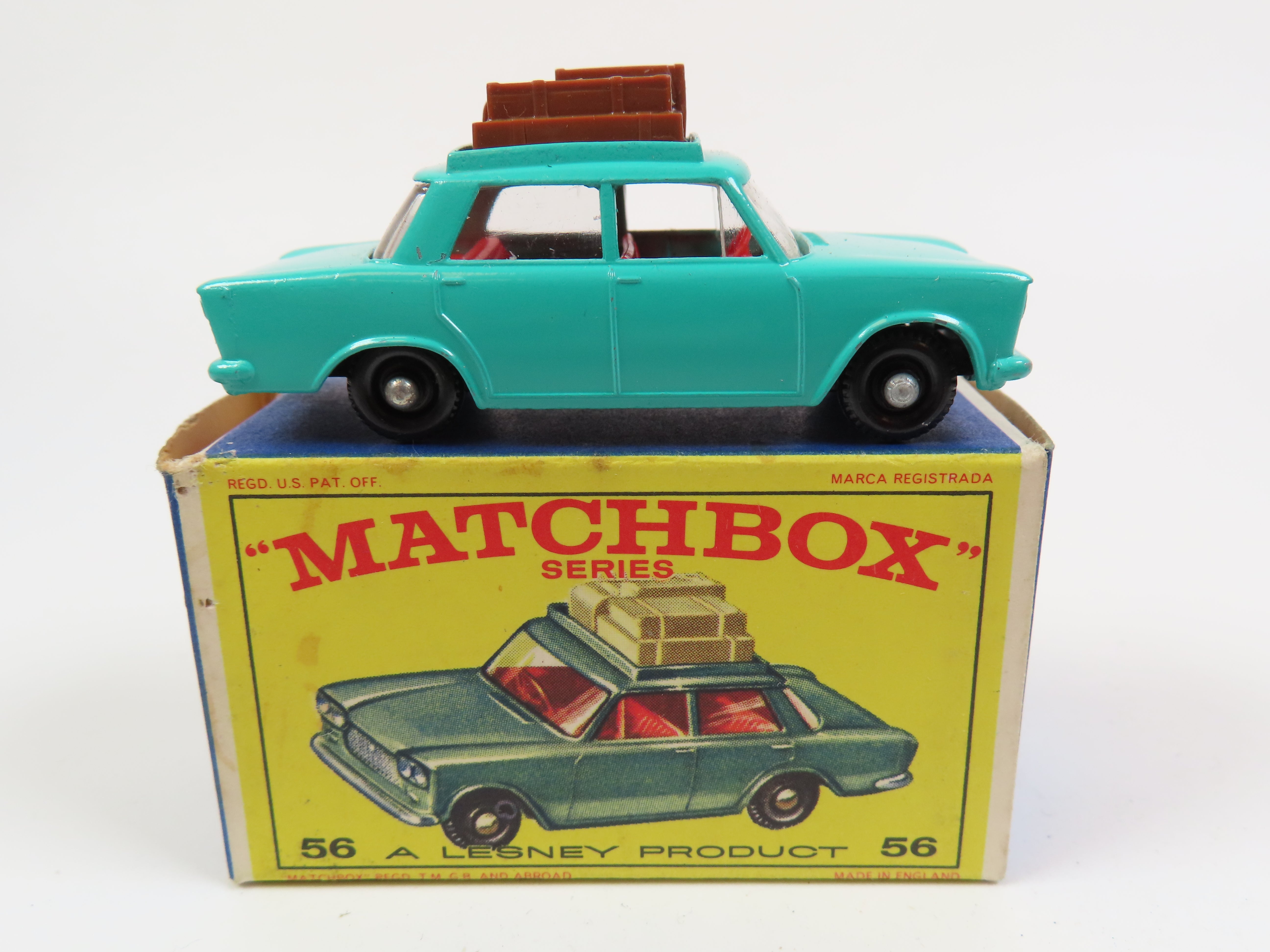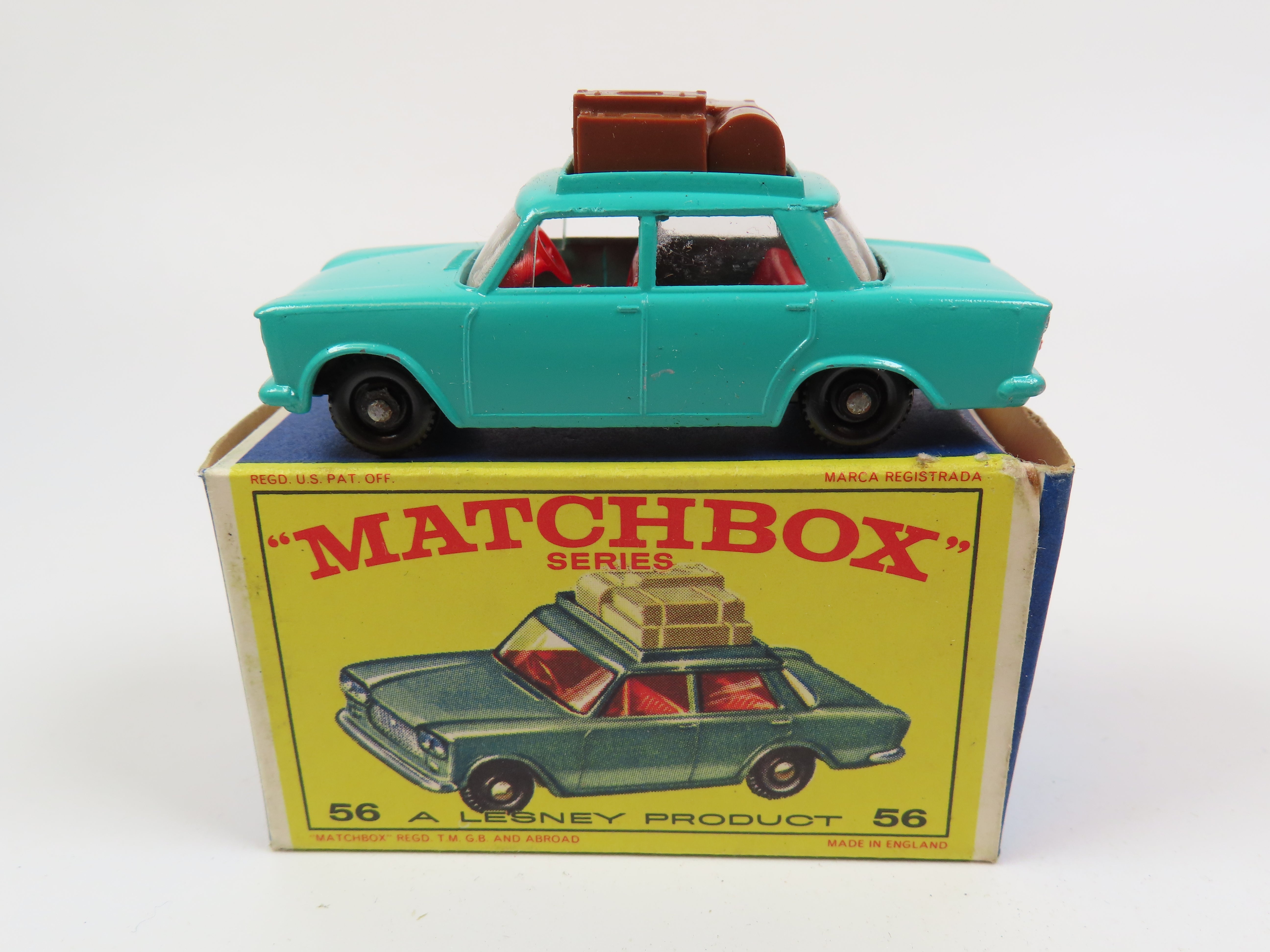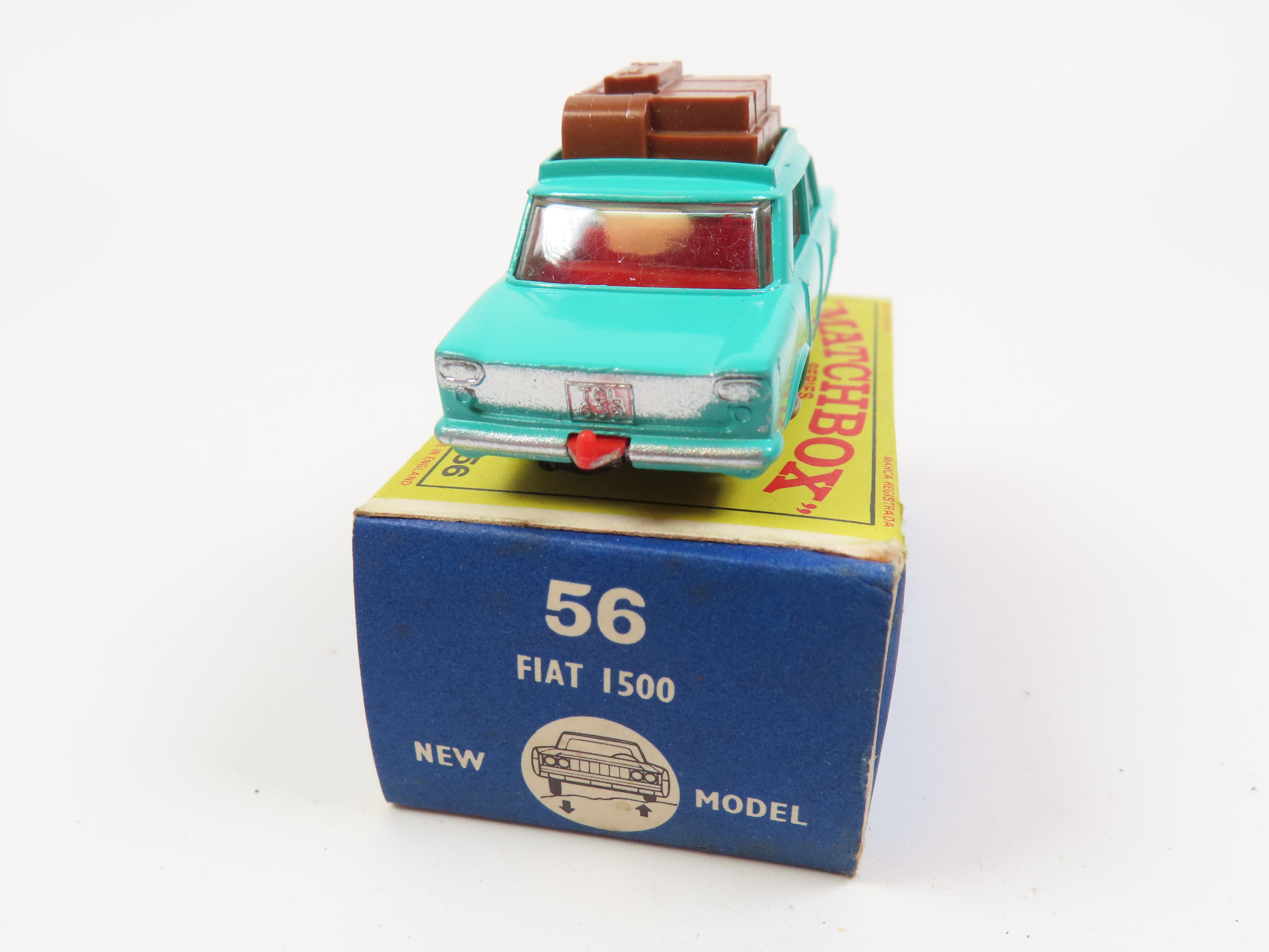 Matchbox No.56 Fiat 1500 in green with red interior and brown plastic luggage to the roof.