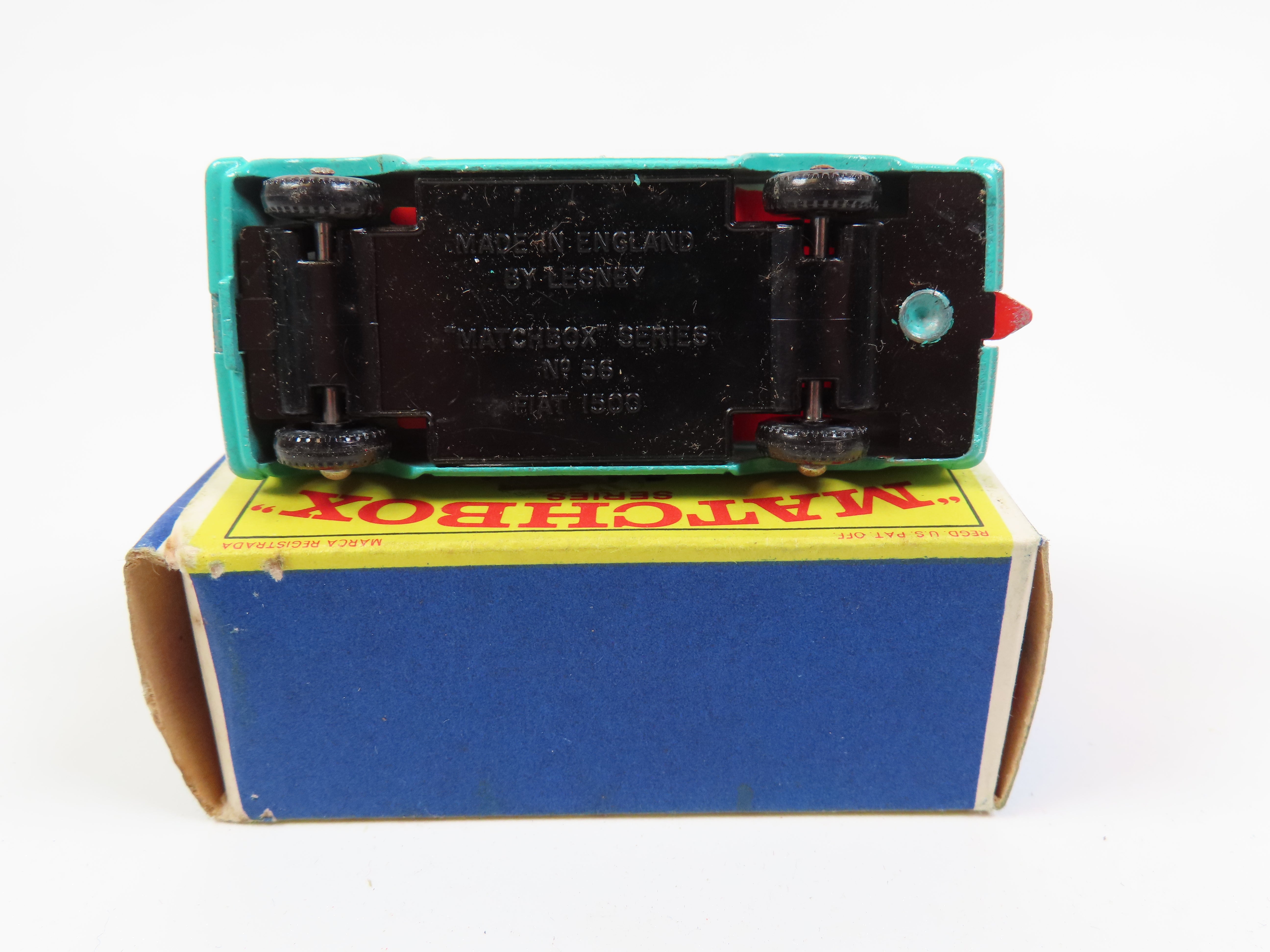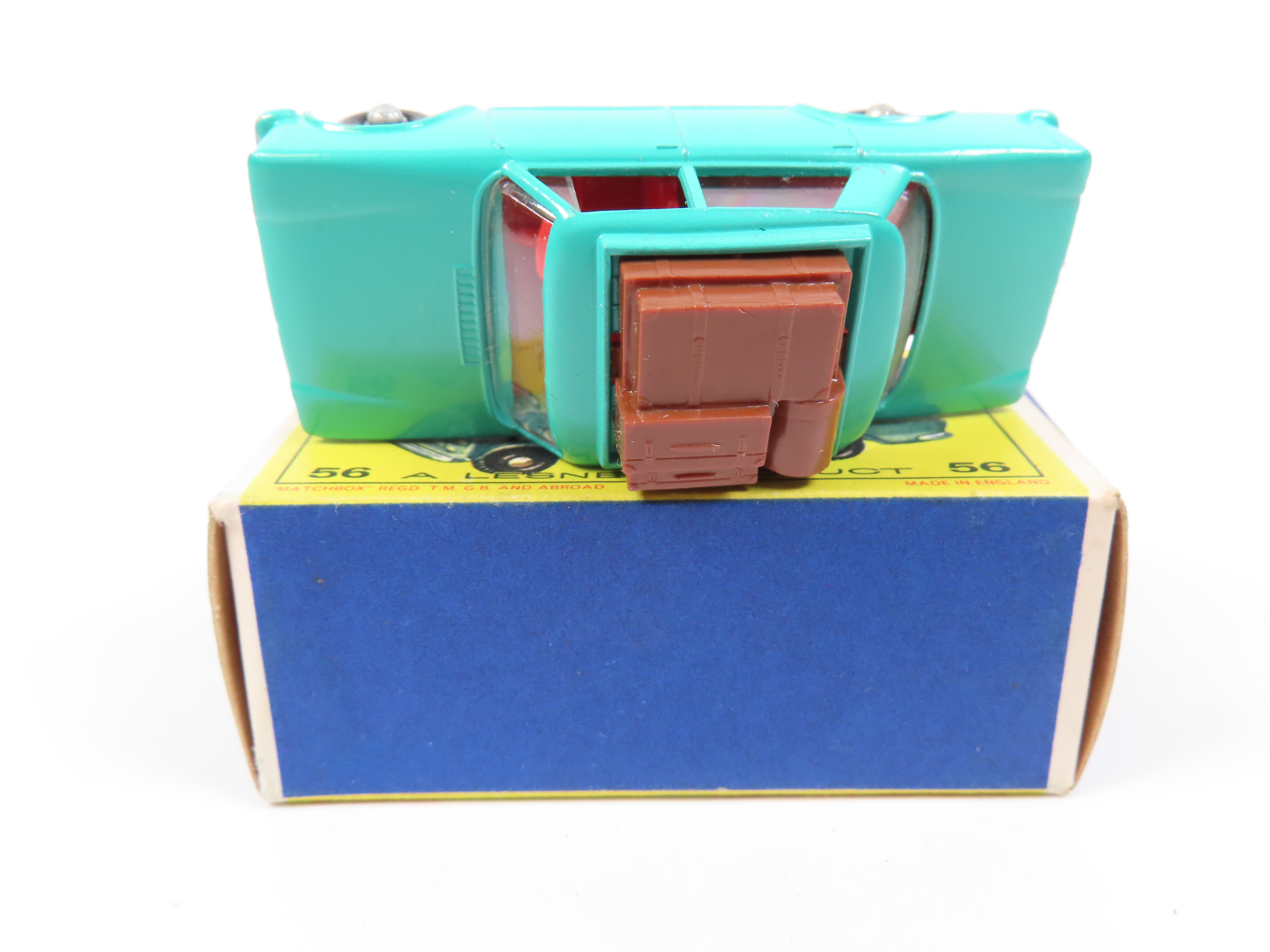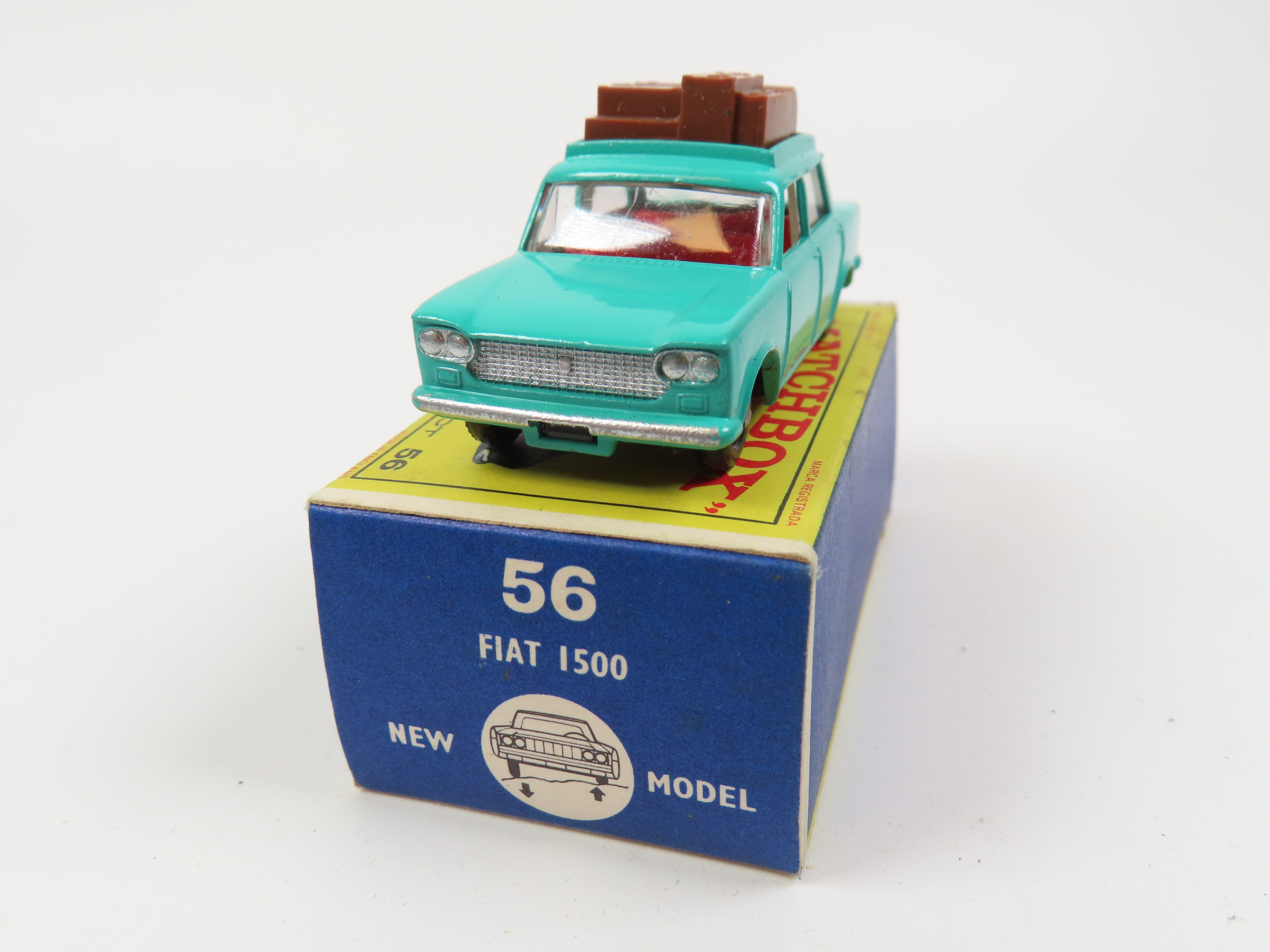 Matchbox No.56 Fiat 1500 in green with red interior and brown plastic luggage to the roof.