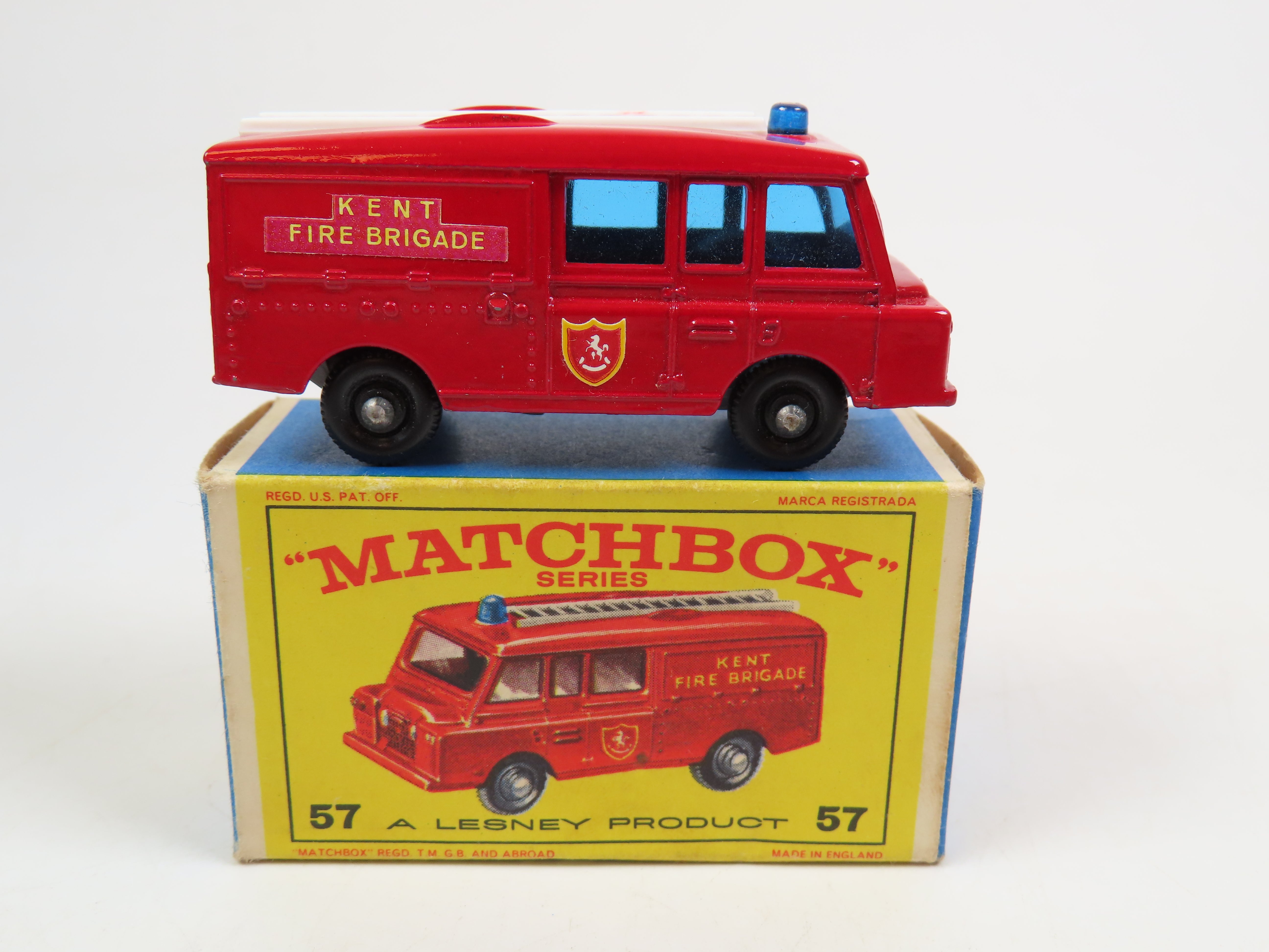 Matchbox No.57 Land Rover Fire Truck in red, with 'Kent Fire Brigade' decals to each side, blue dome light to the roof and blue tinted windows.