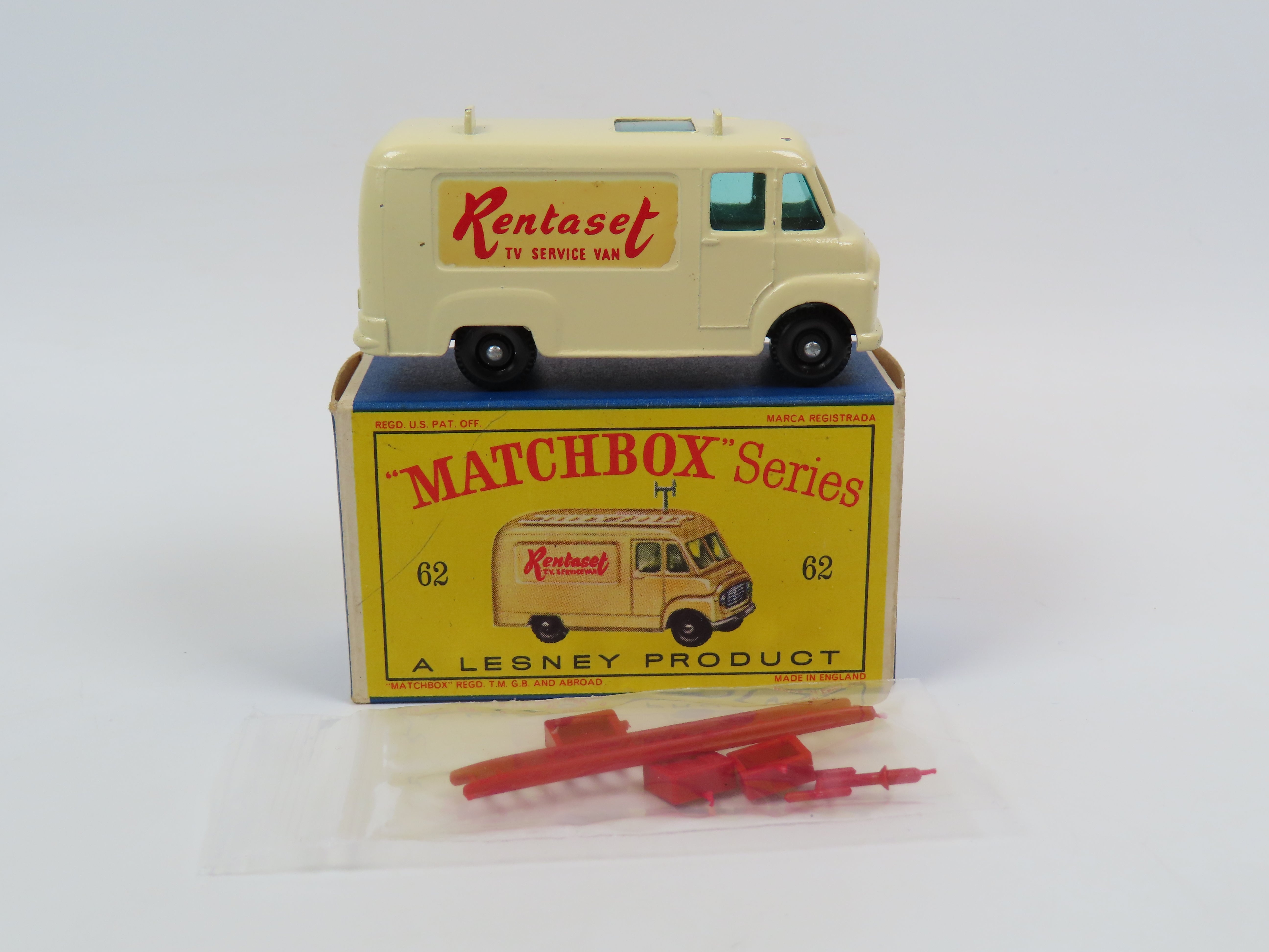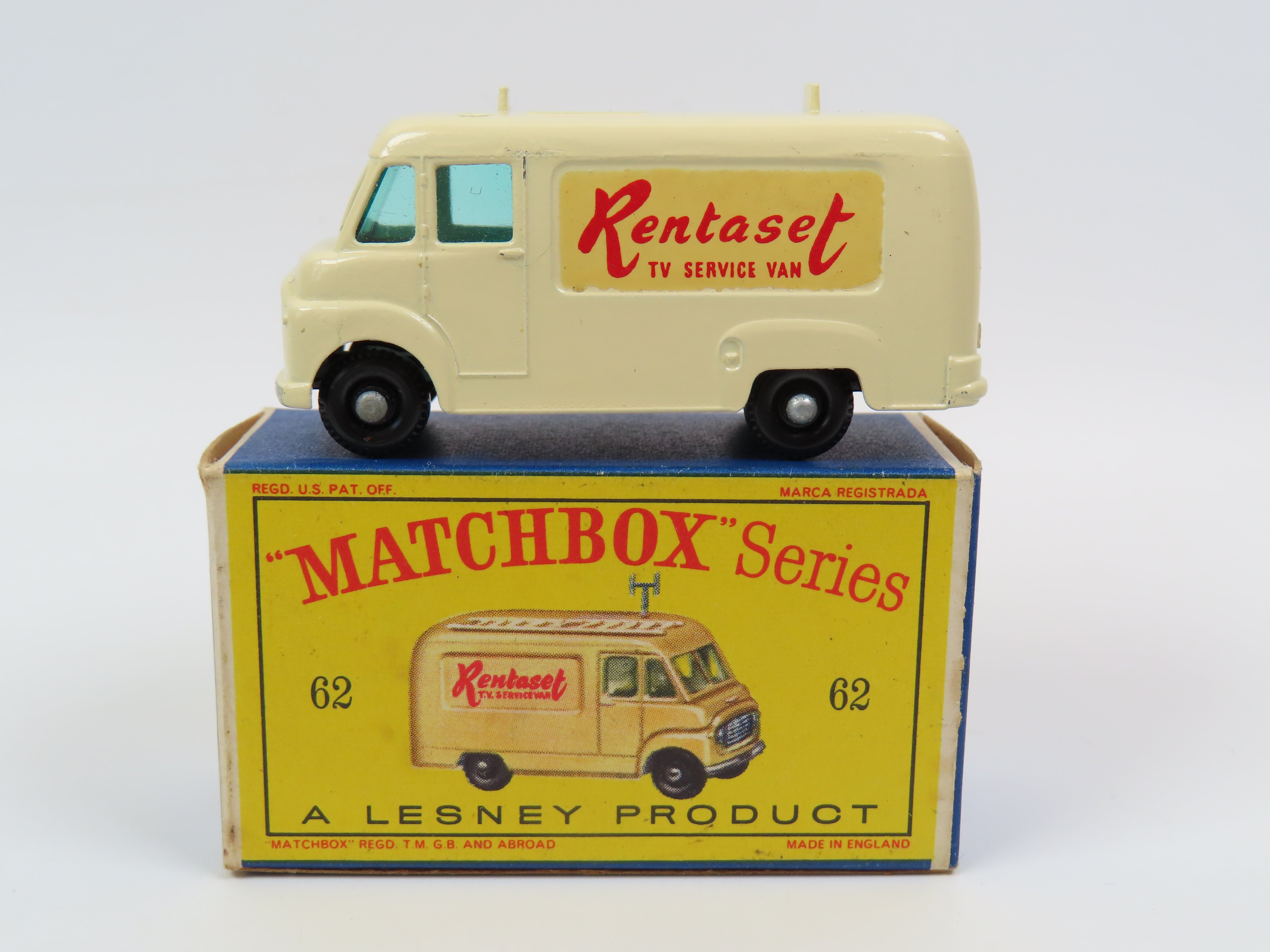 Matchbox No.62 TV Service Van in cream with green tinted windows and 'Rentaset' decals to each side. Comes with the original plastic accessories.