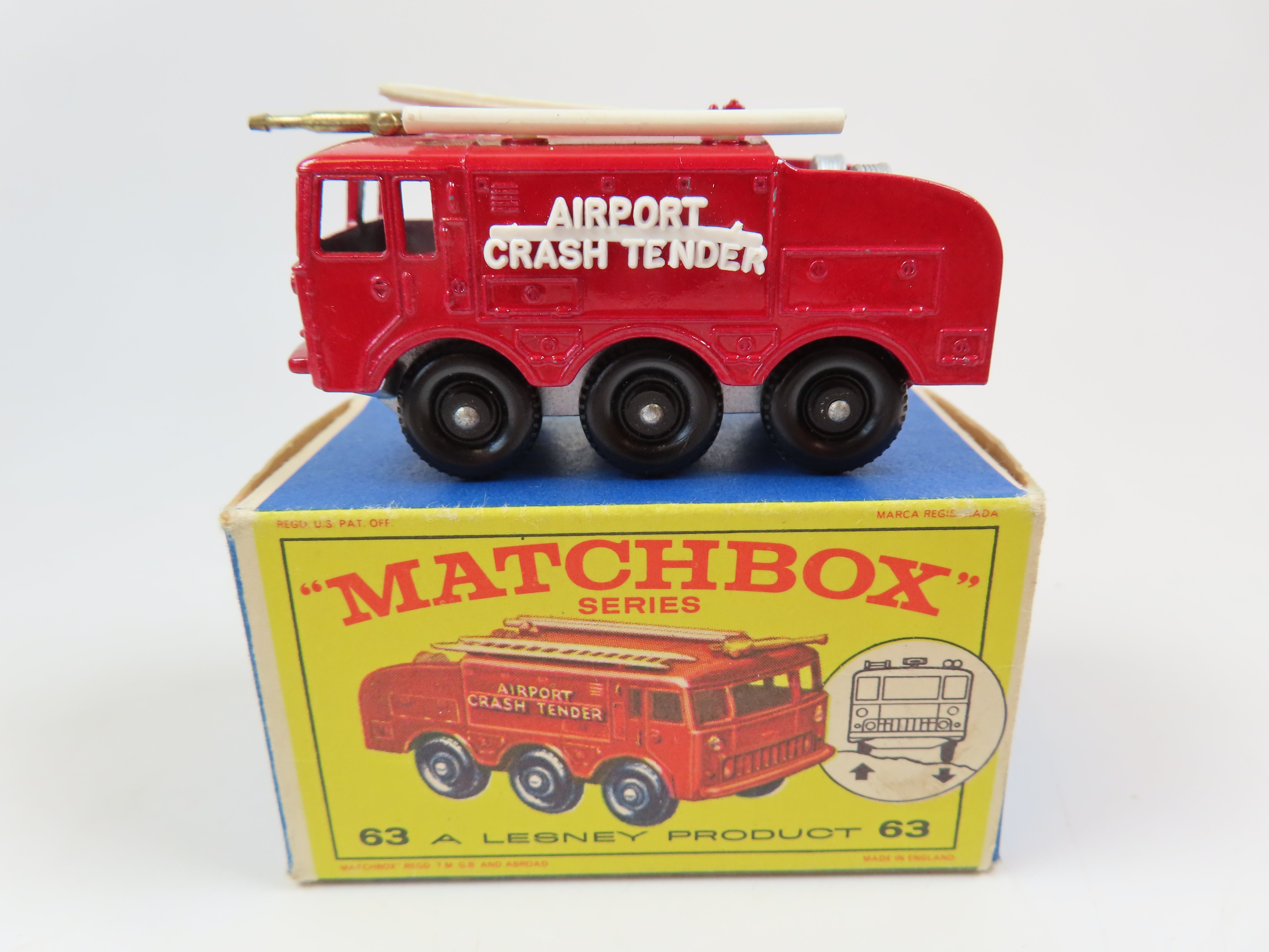Matchbox No.63 Fire Fighting Crash Tender in red, with silver rear, white plastic ladder and 'Airport Crash Tender' lettering and gold hose to the roof. Black plastic wheels.