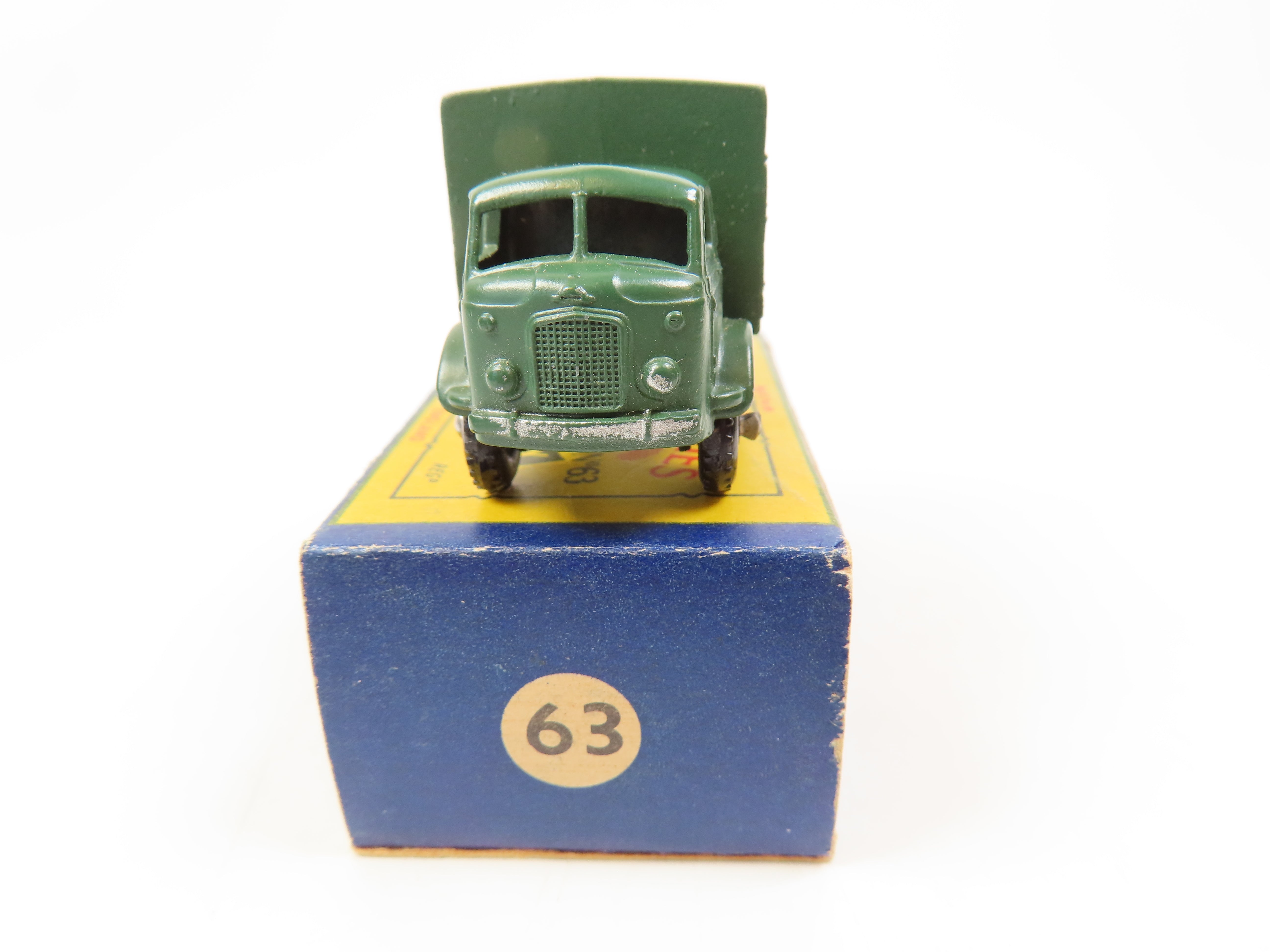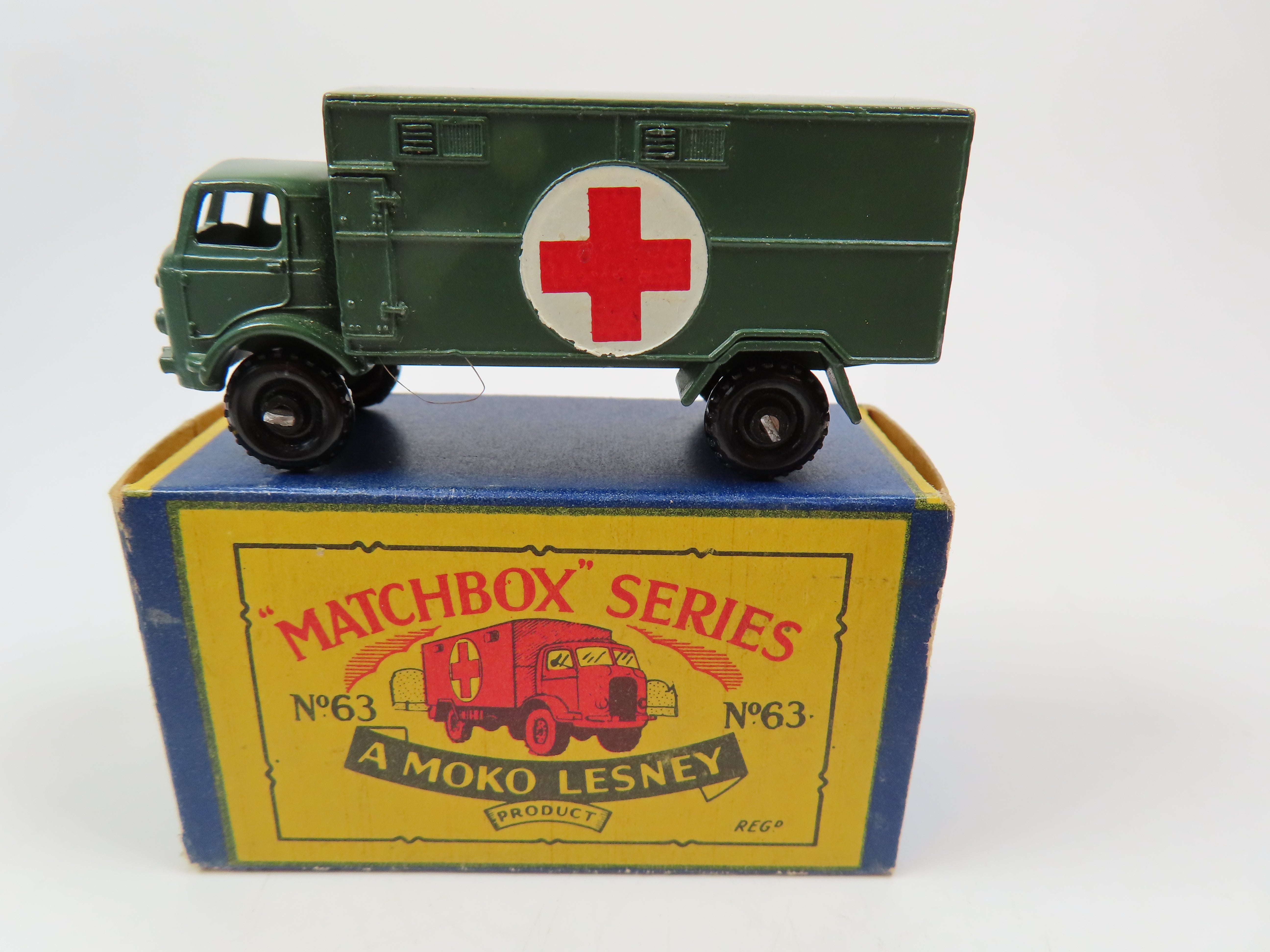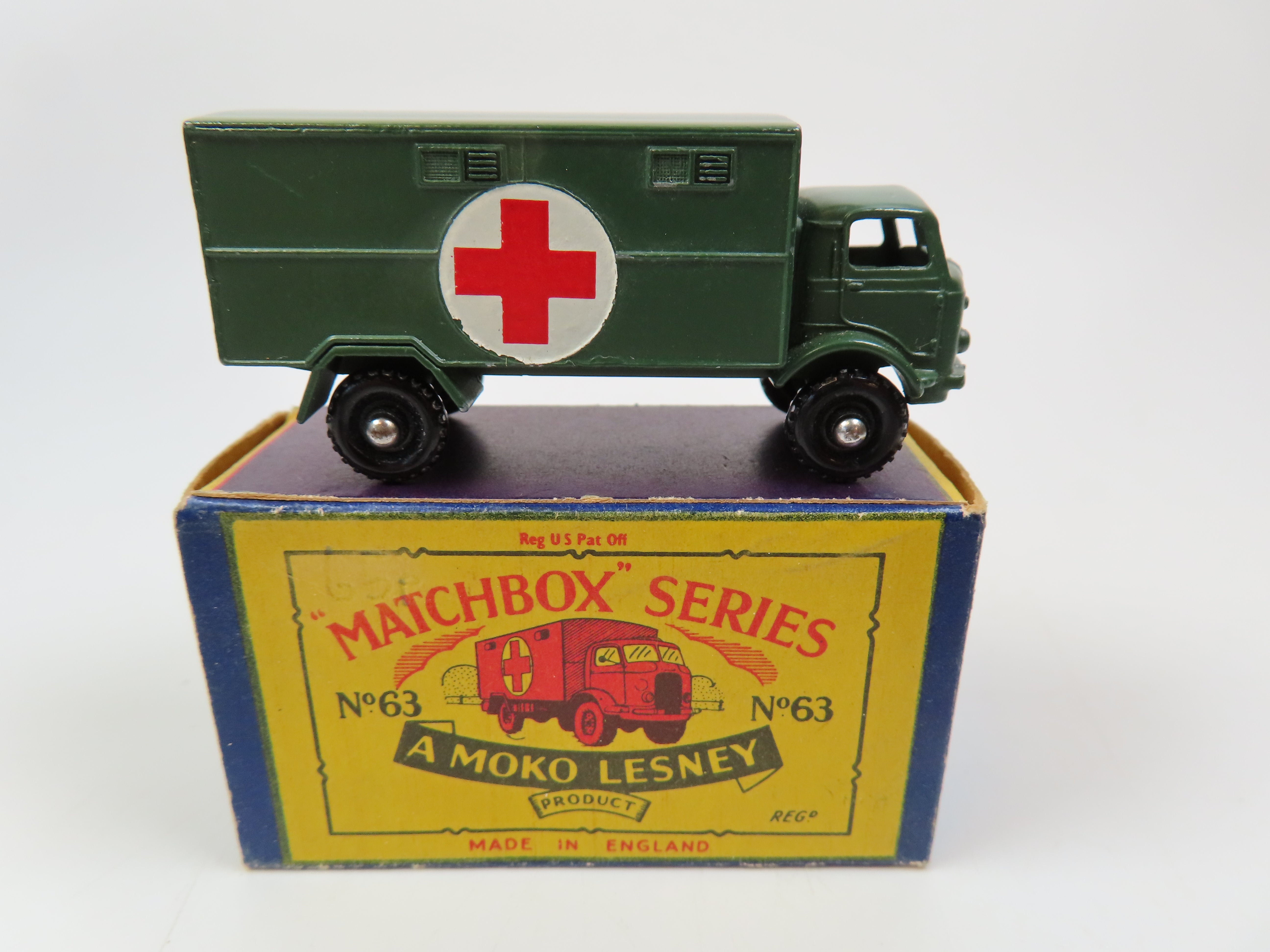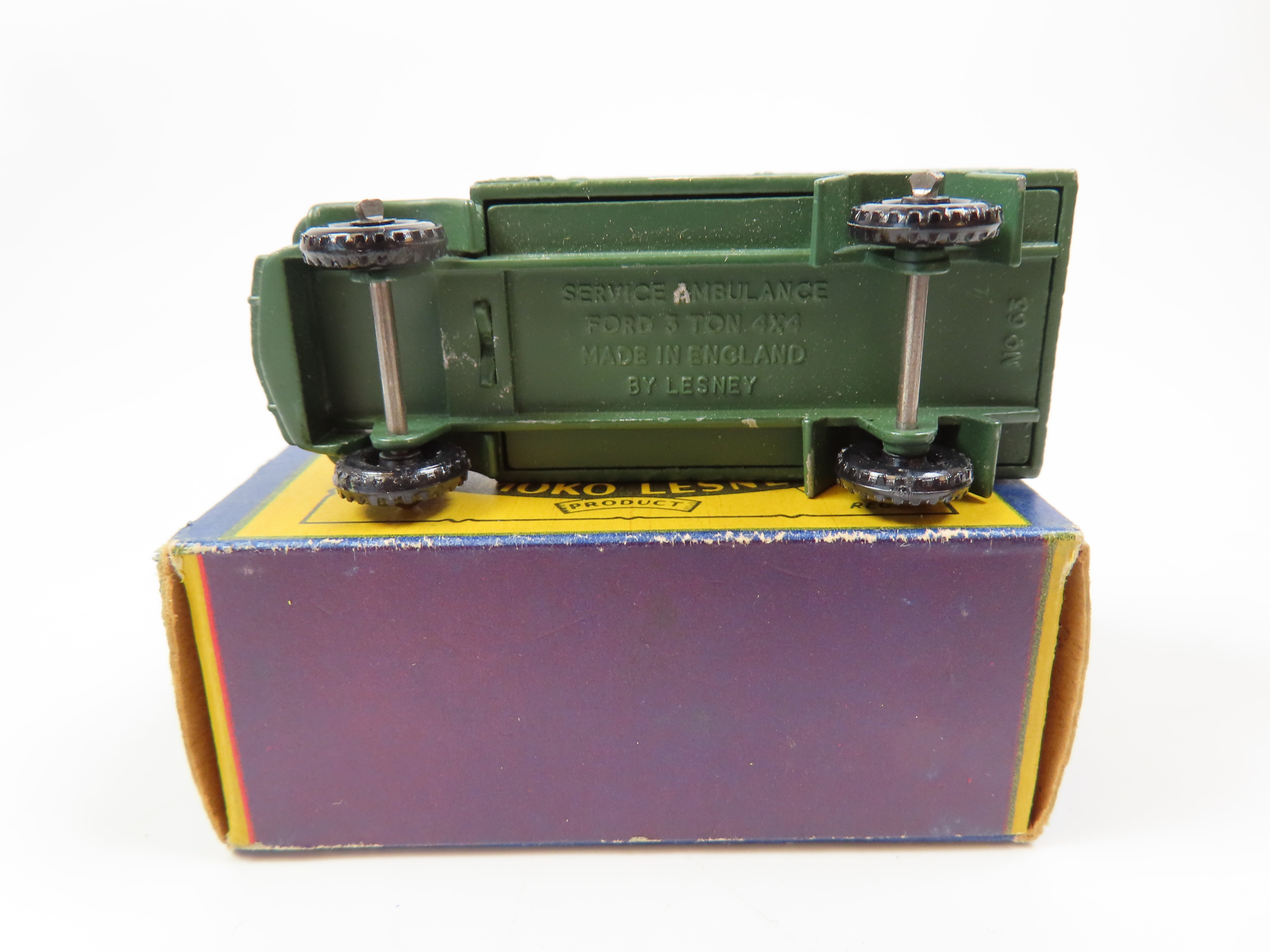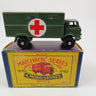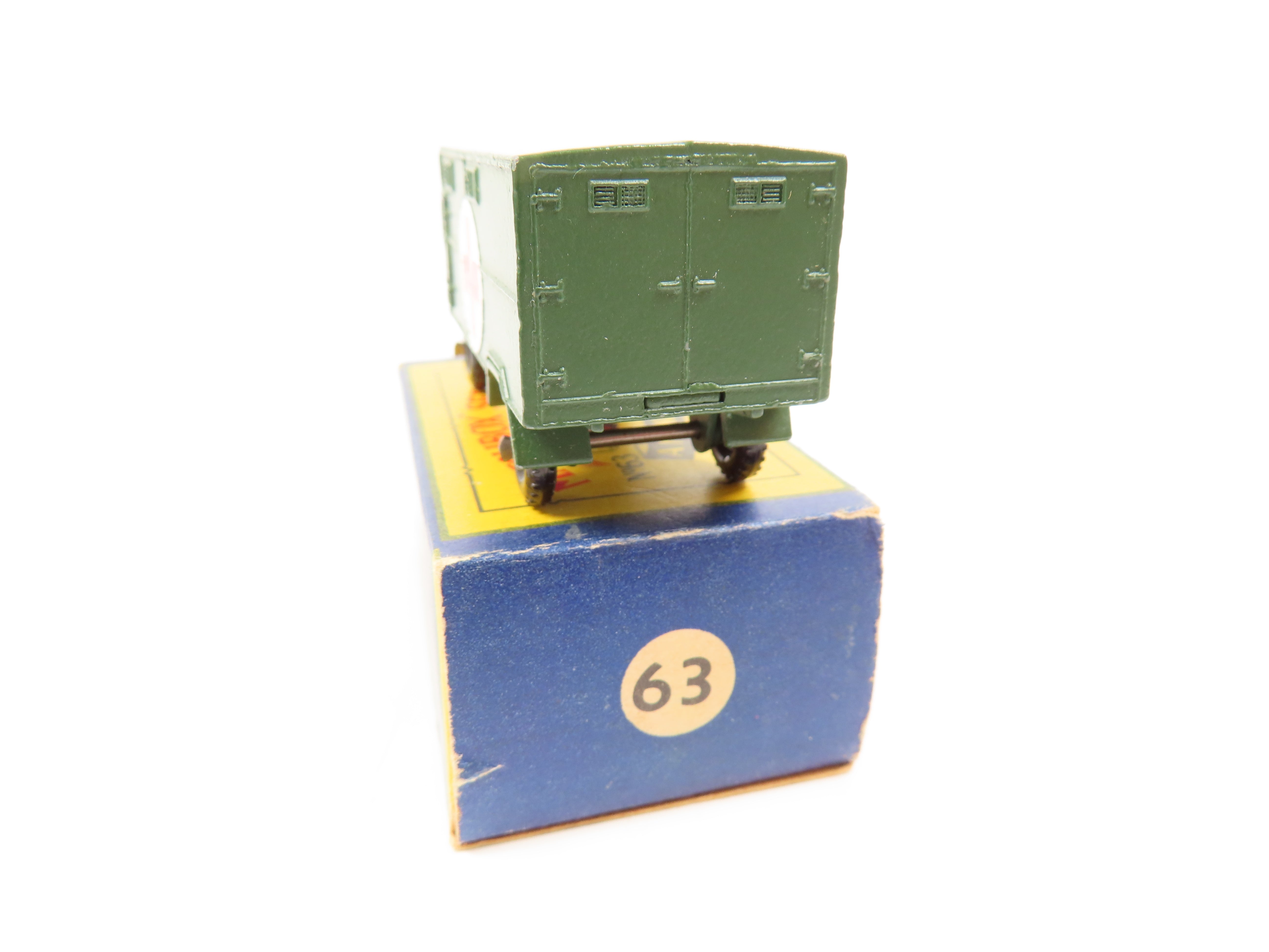 Matchbox No.63 Ford Service Ambulance in olive green with red cross on white background decal to each side.