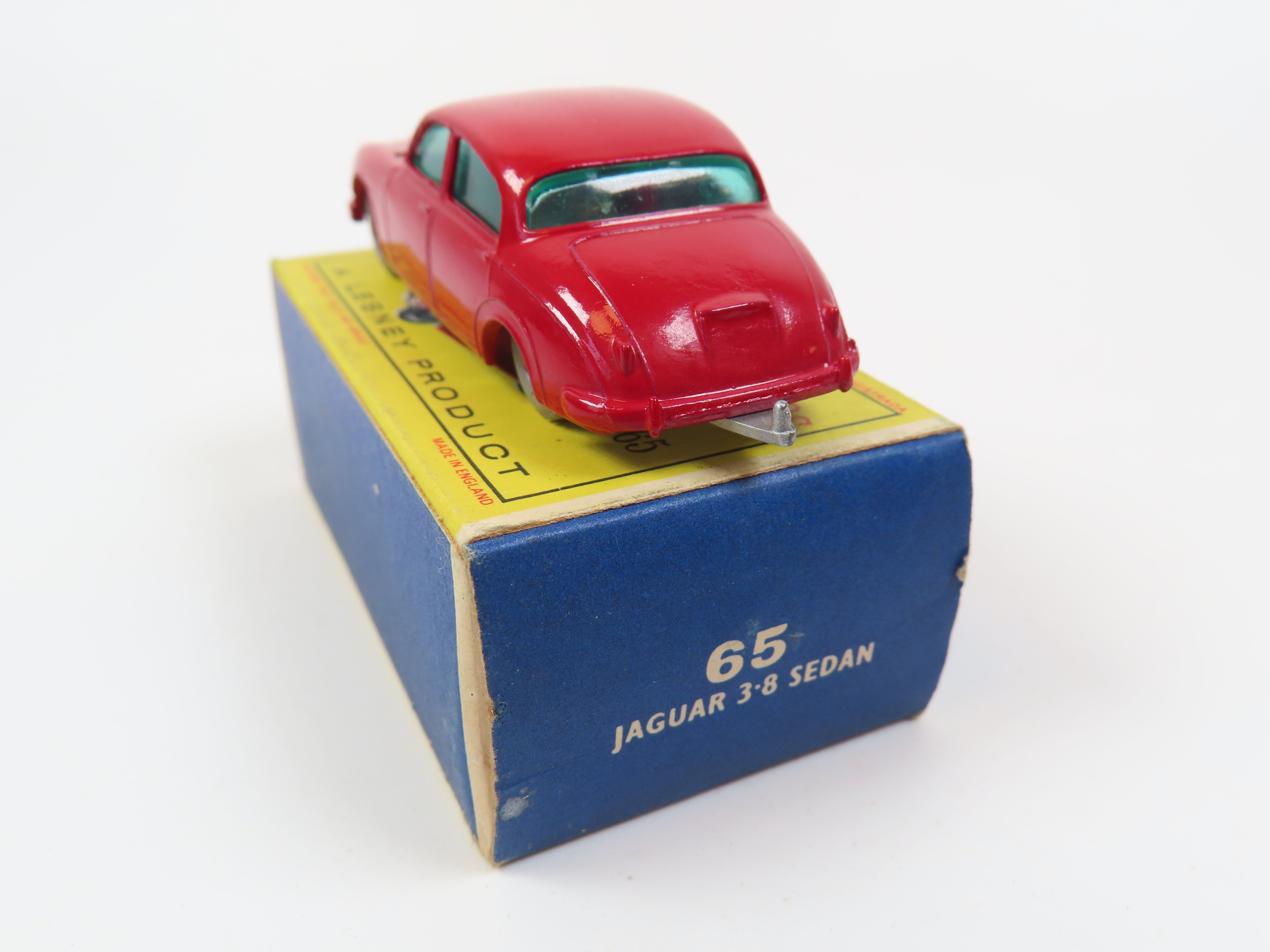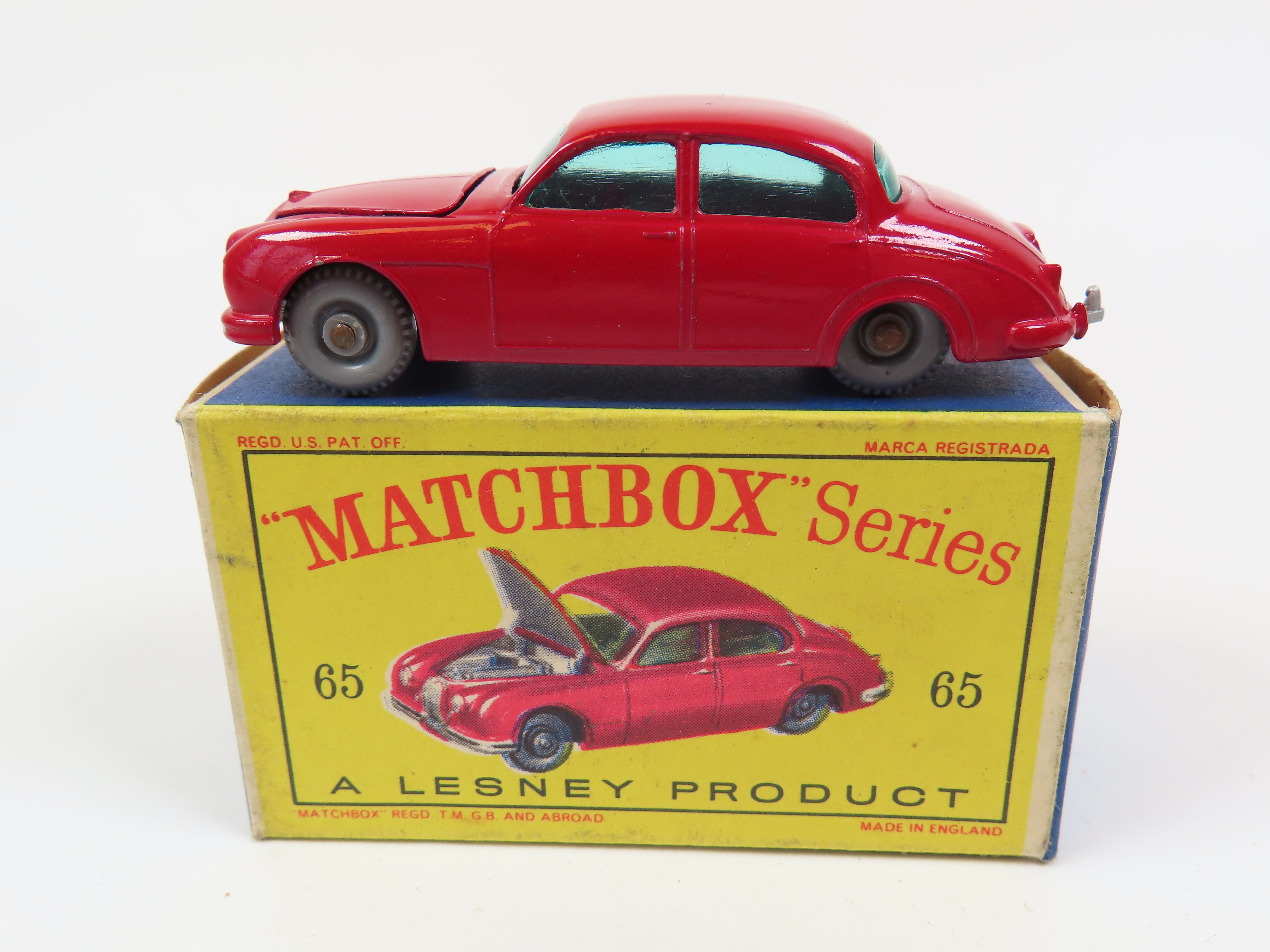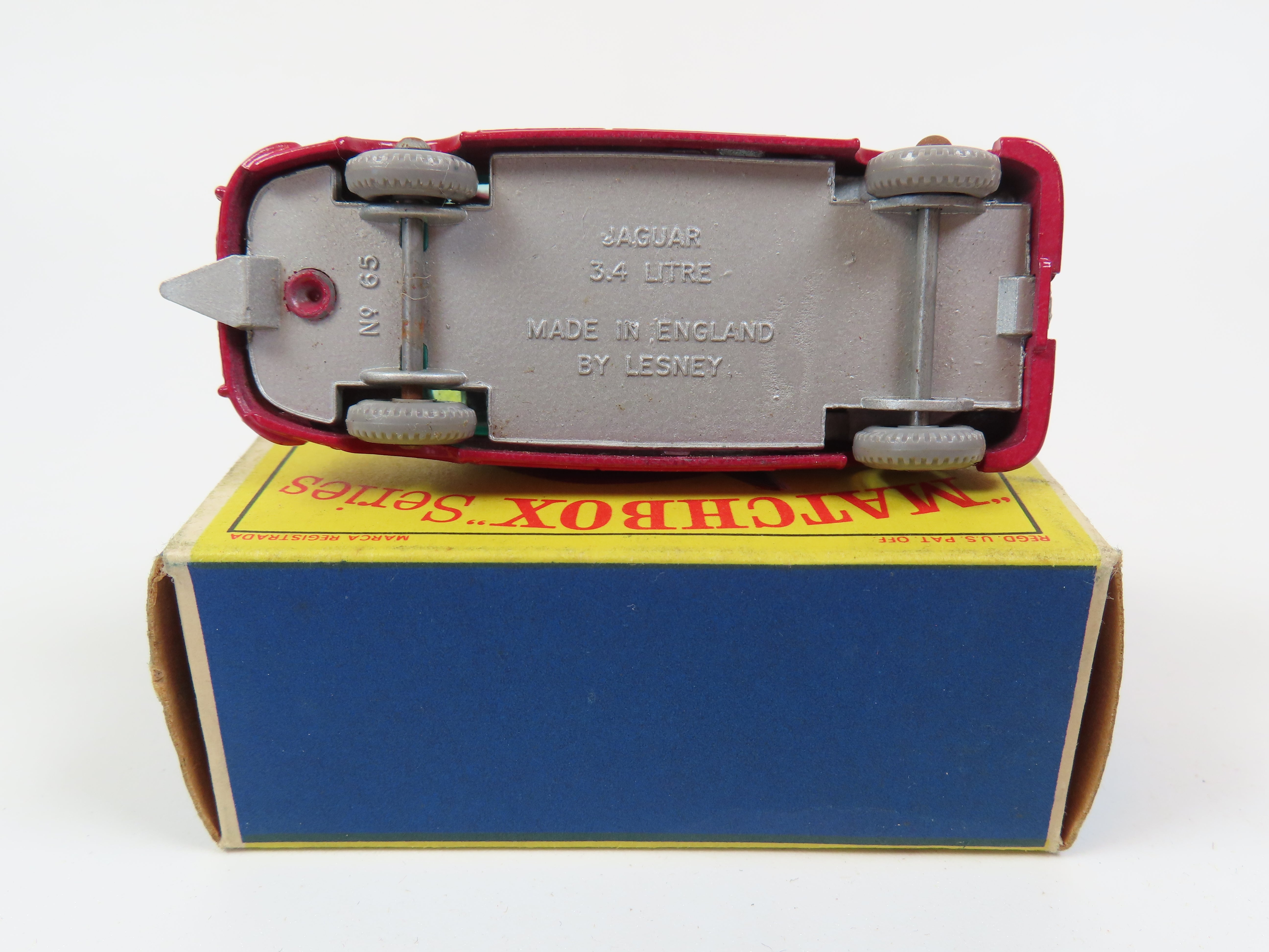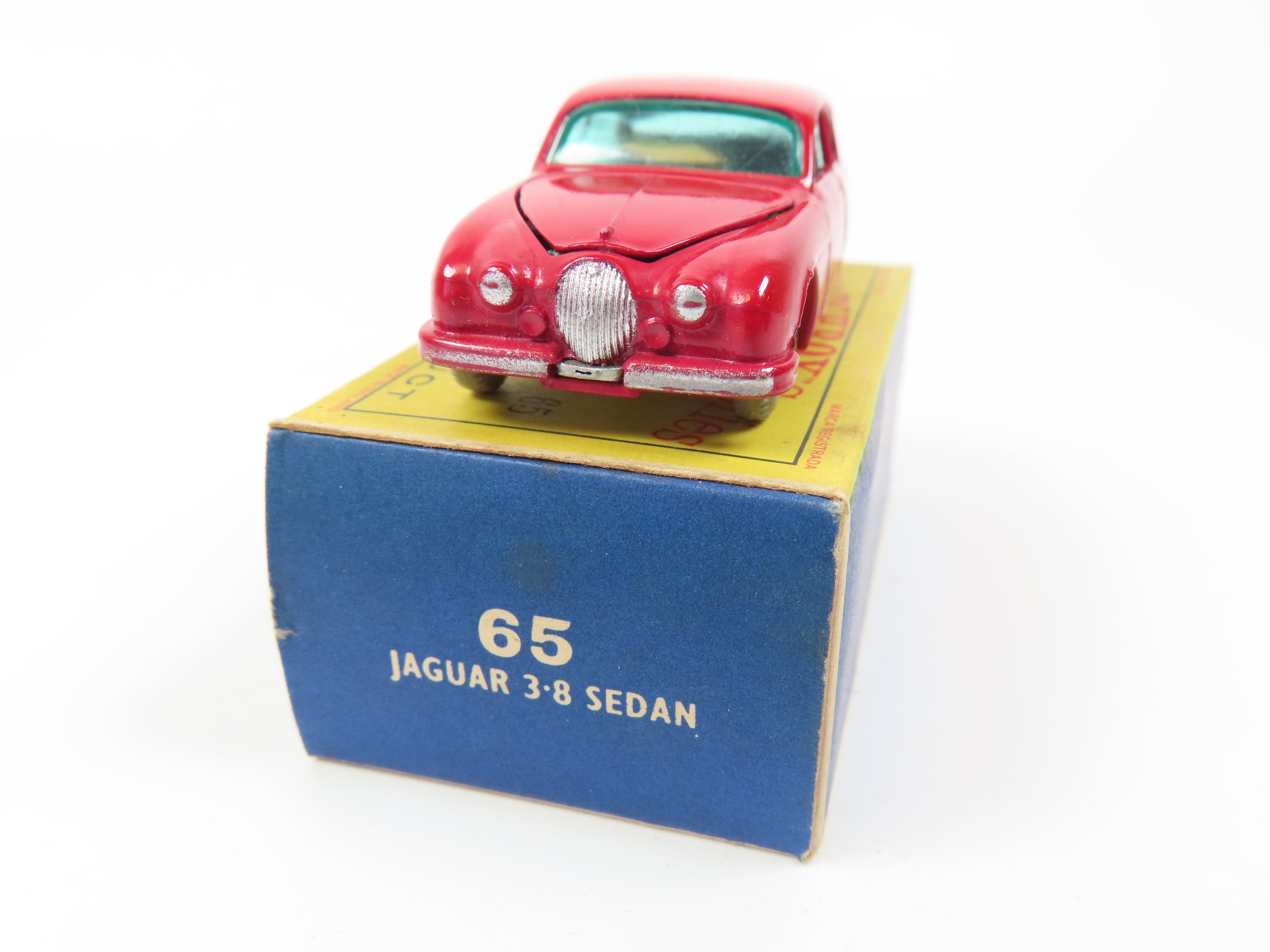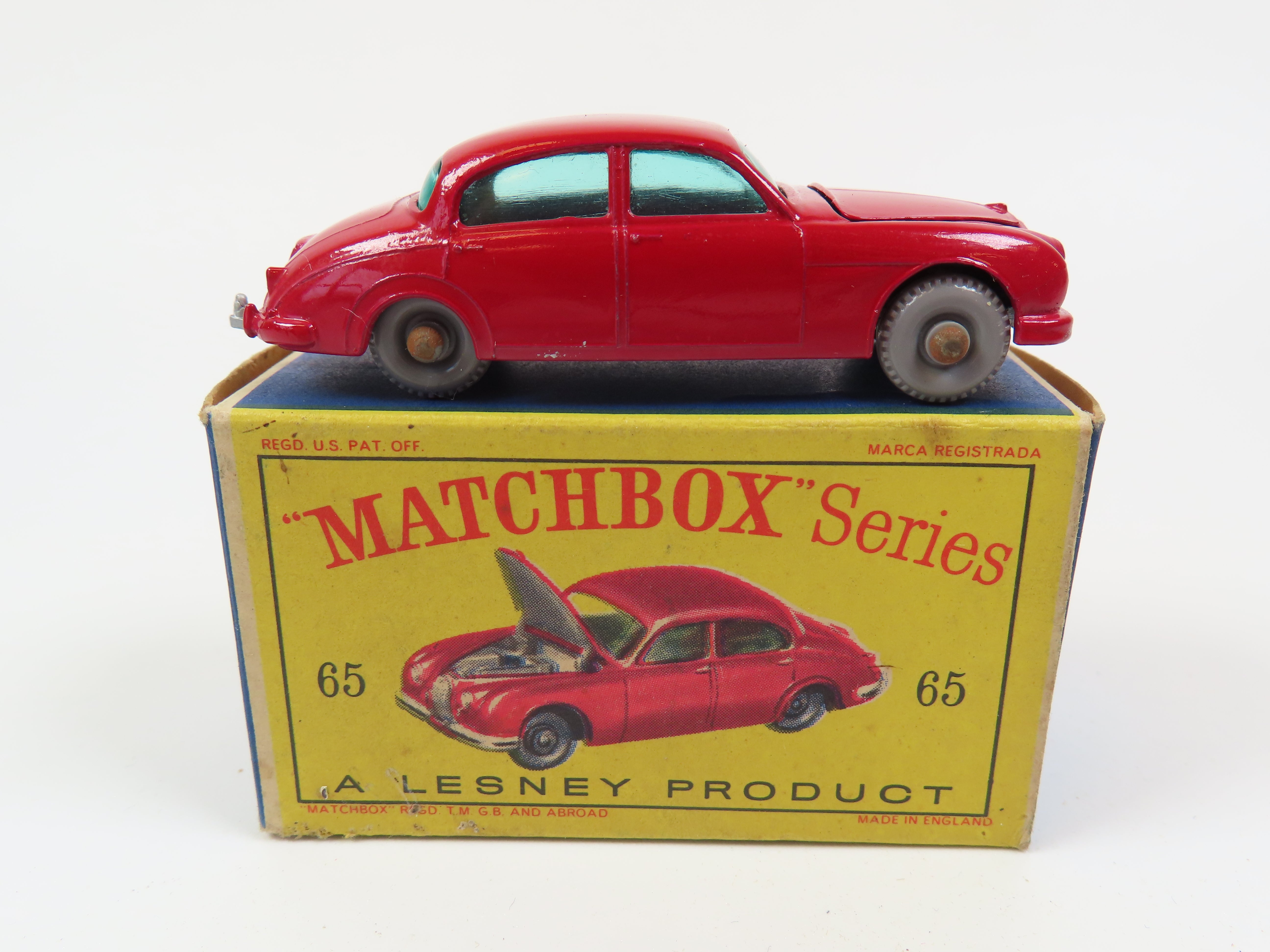 Matchbox No.65 Jaguar 3.8 Sedan in red with blue tinted windows and grey plastic tyres.