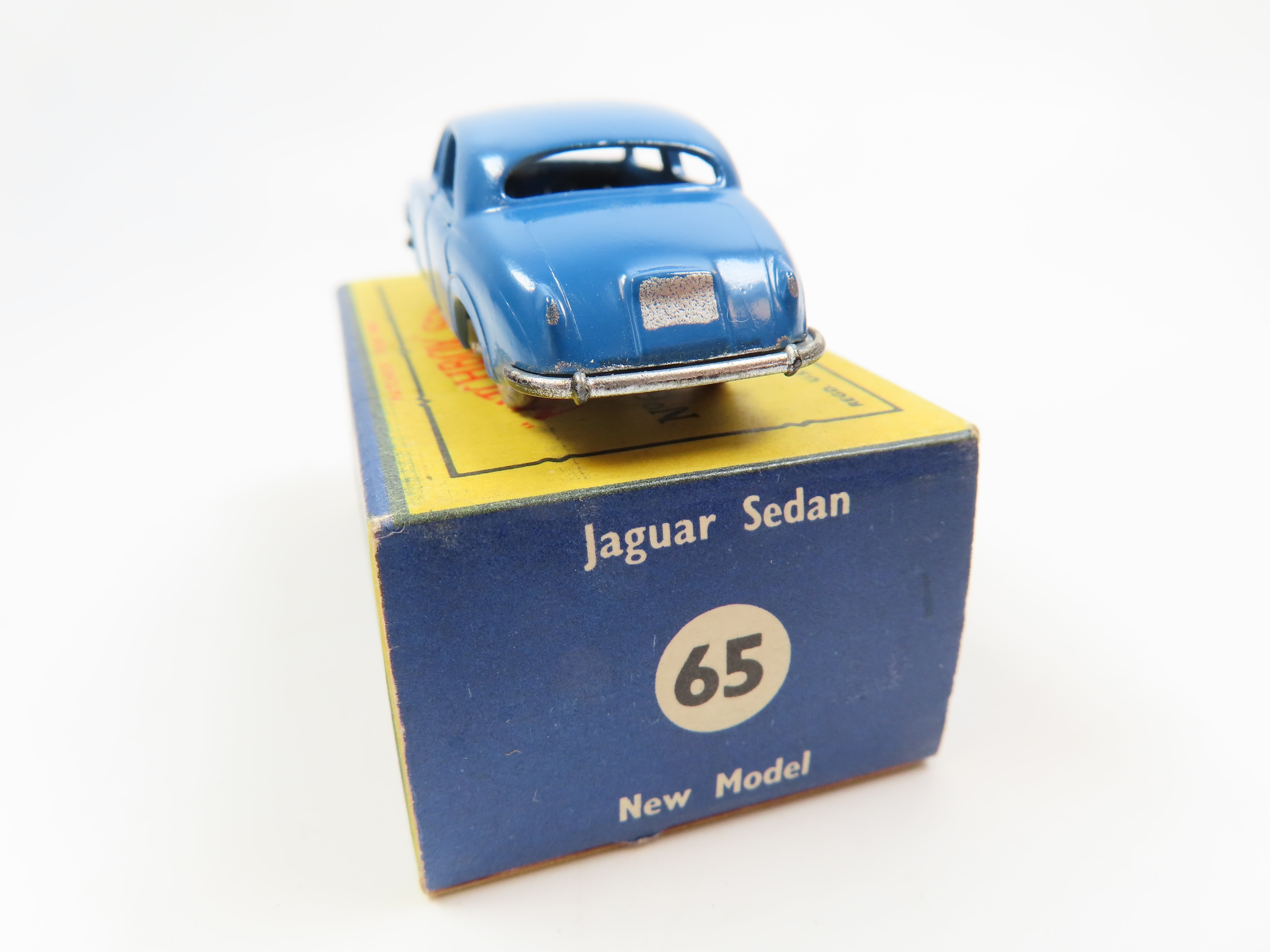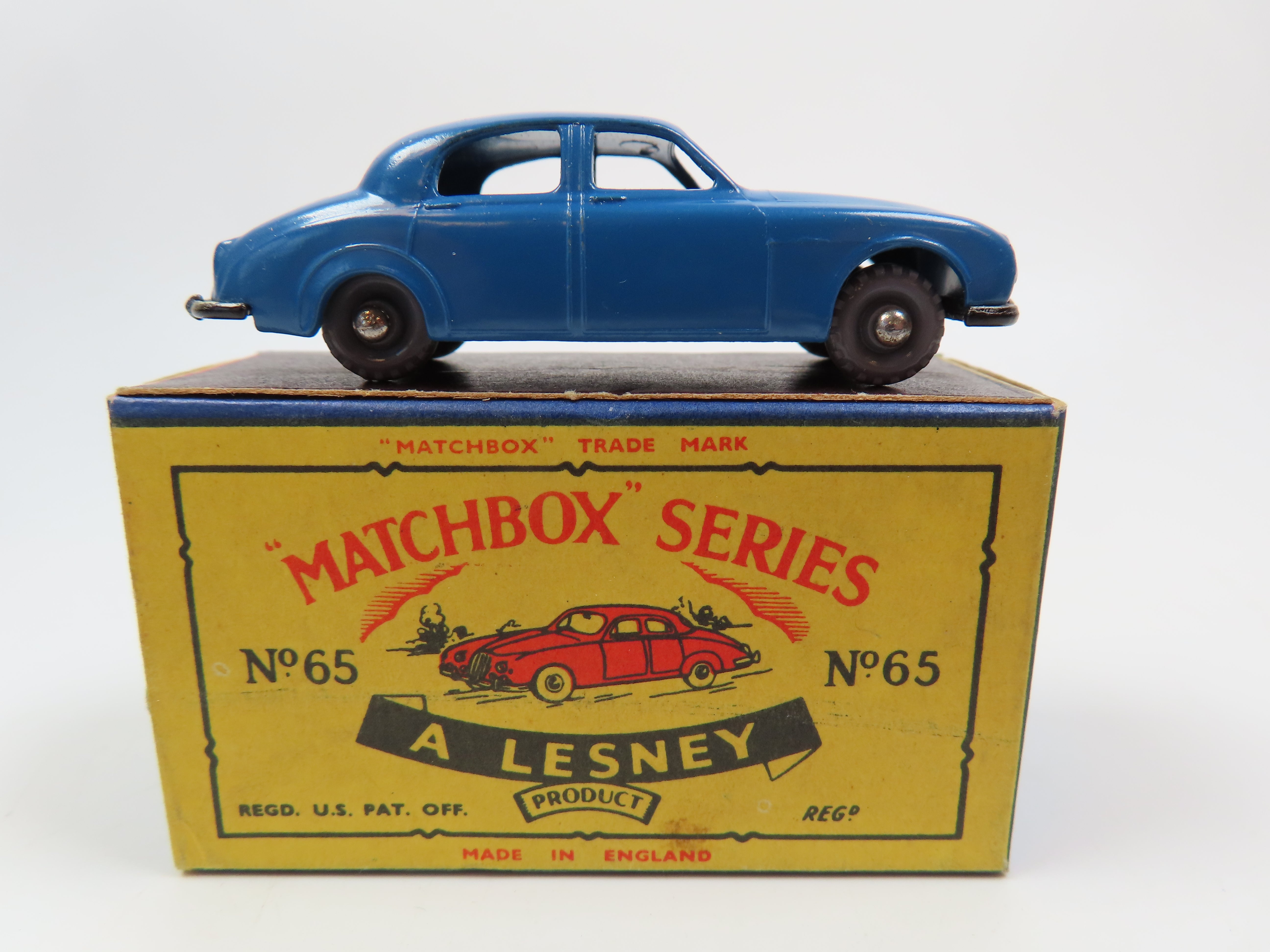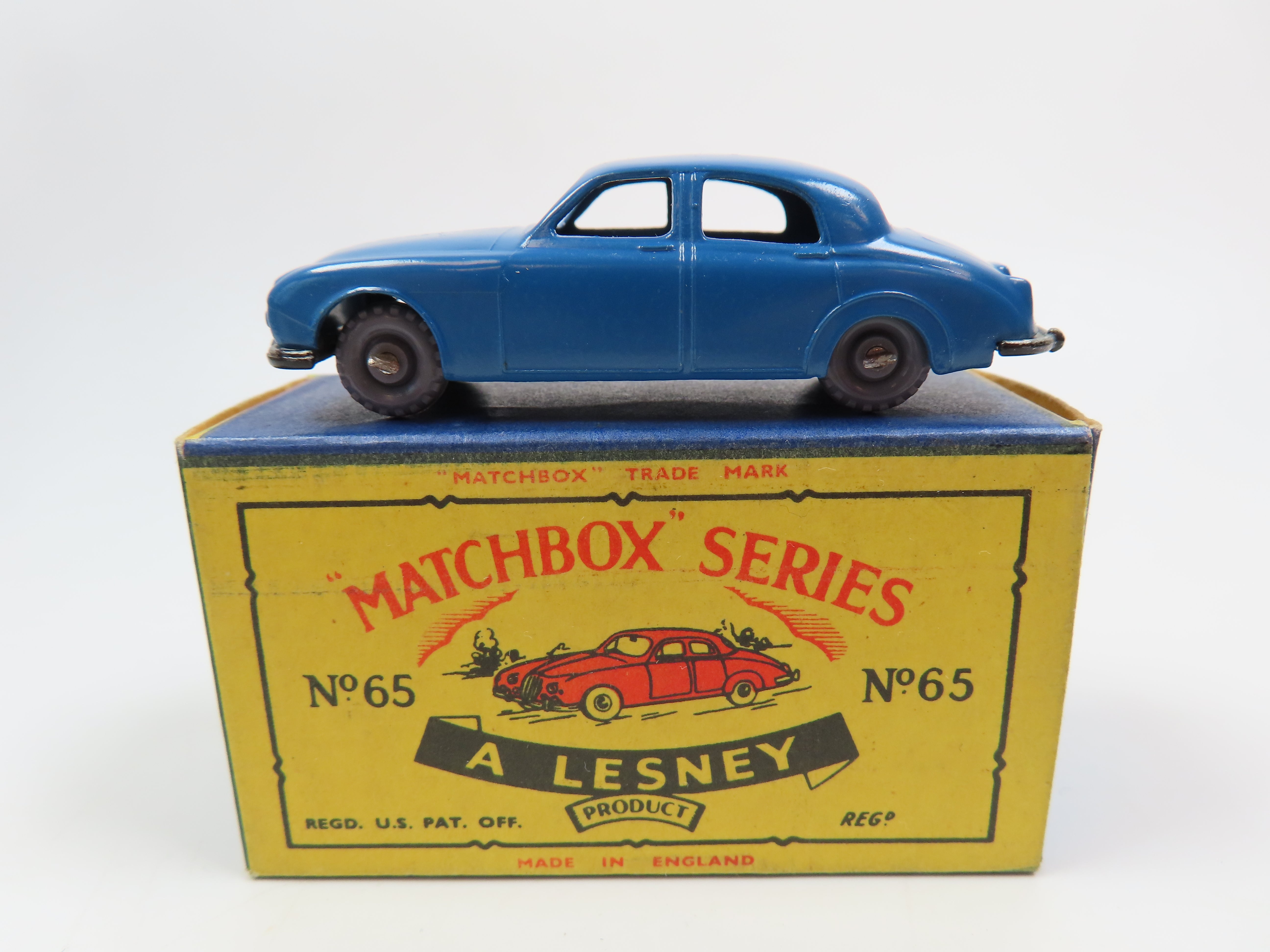 Matchbox No.65 Jaguar Sedan in blue with grey plastic wheels and first issued in 1962.