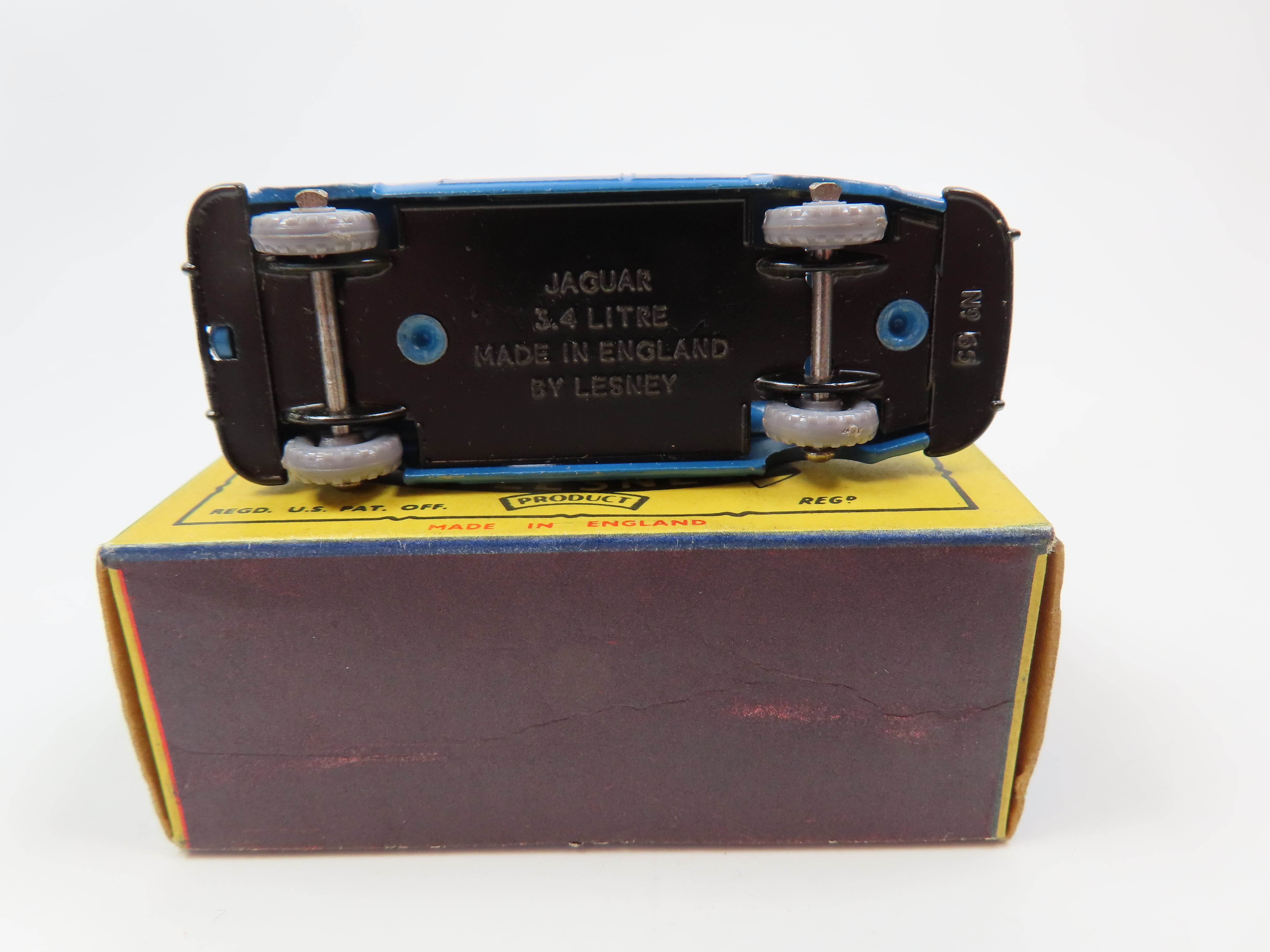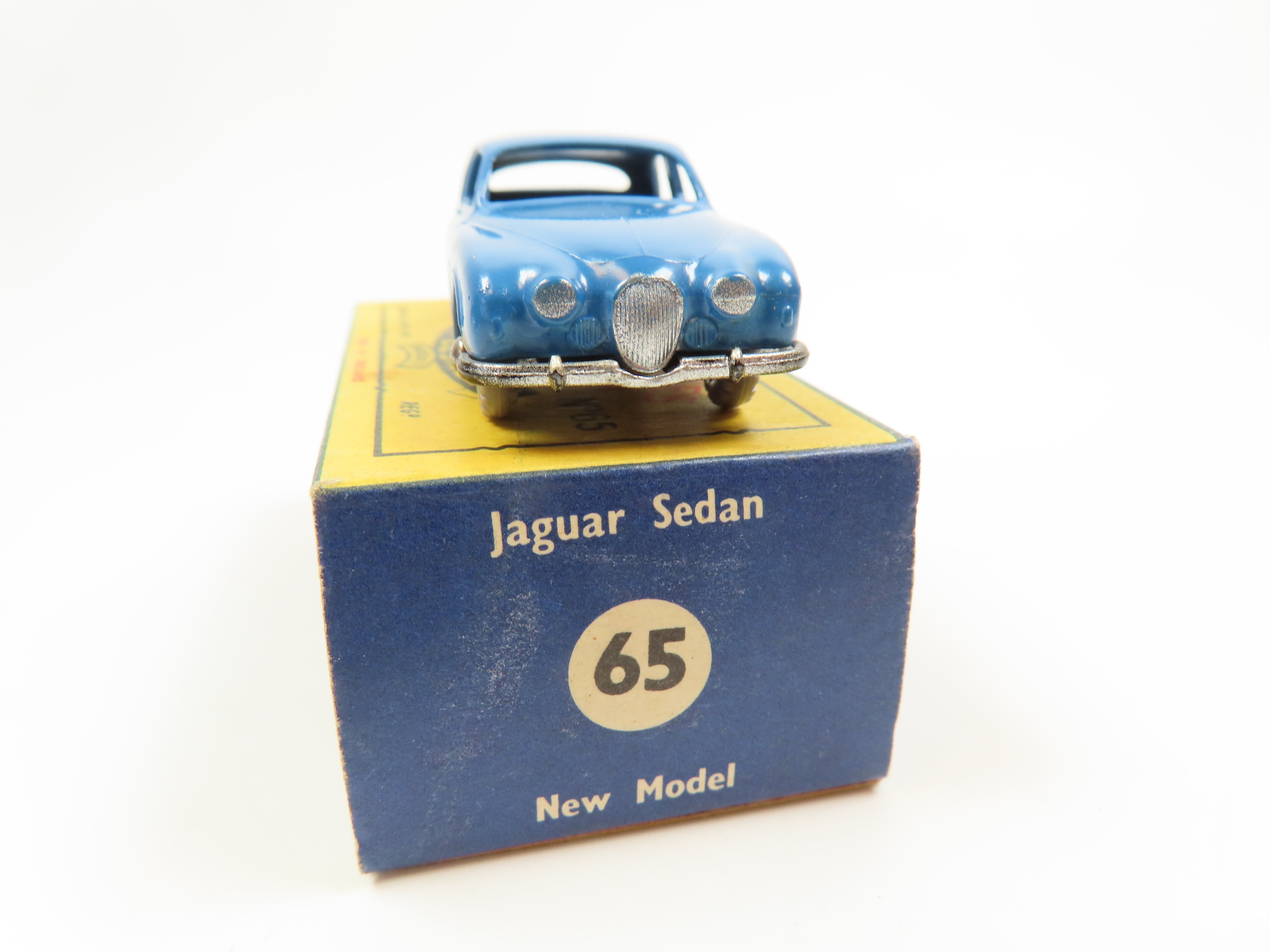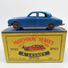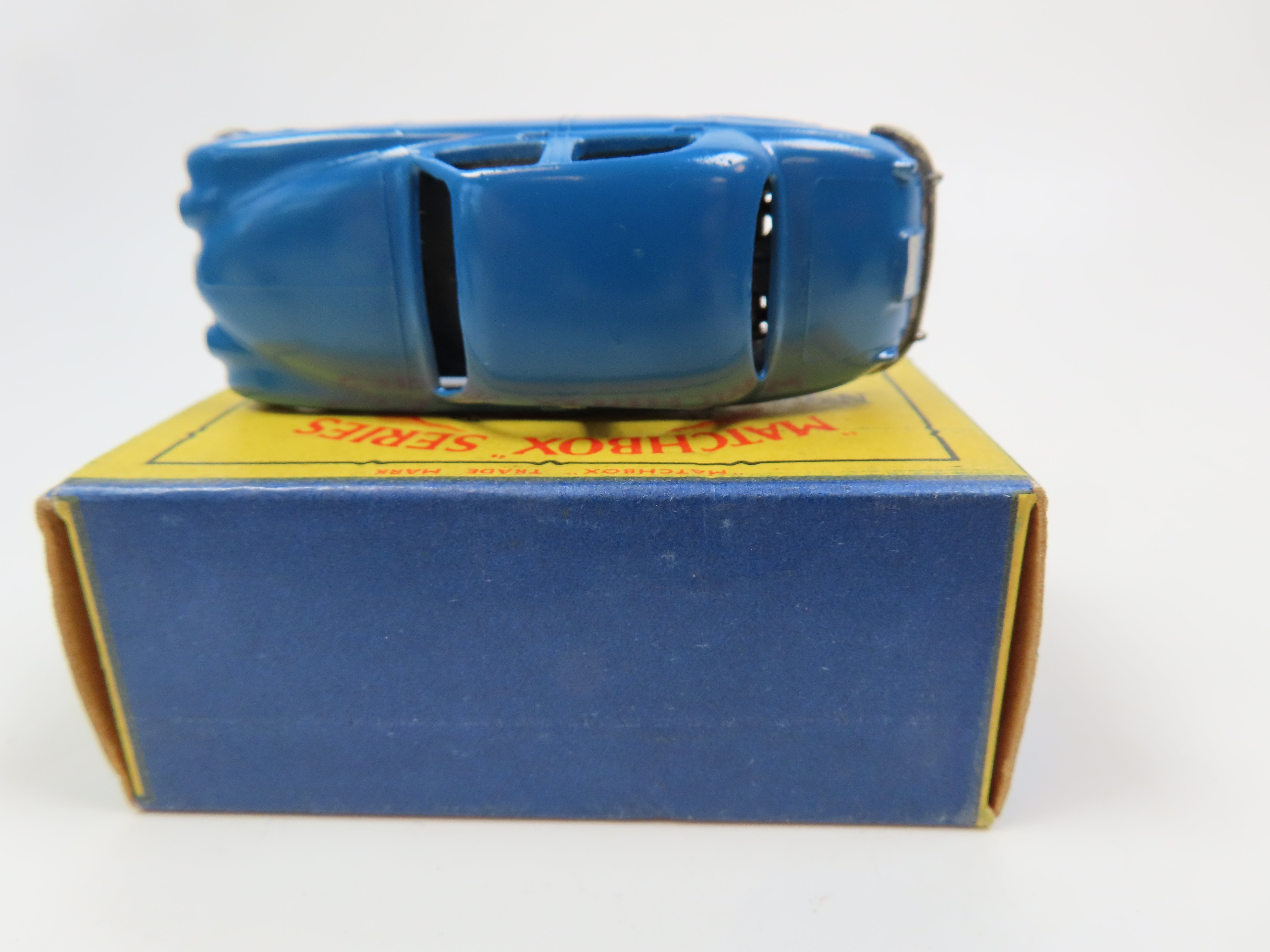 Matchbox No.65 Jaguar Sedan in blue with grey plastic wheels and first issued in 1962.