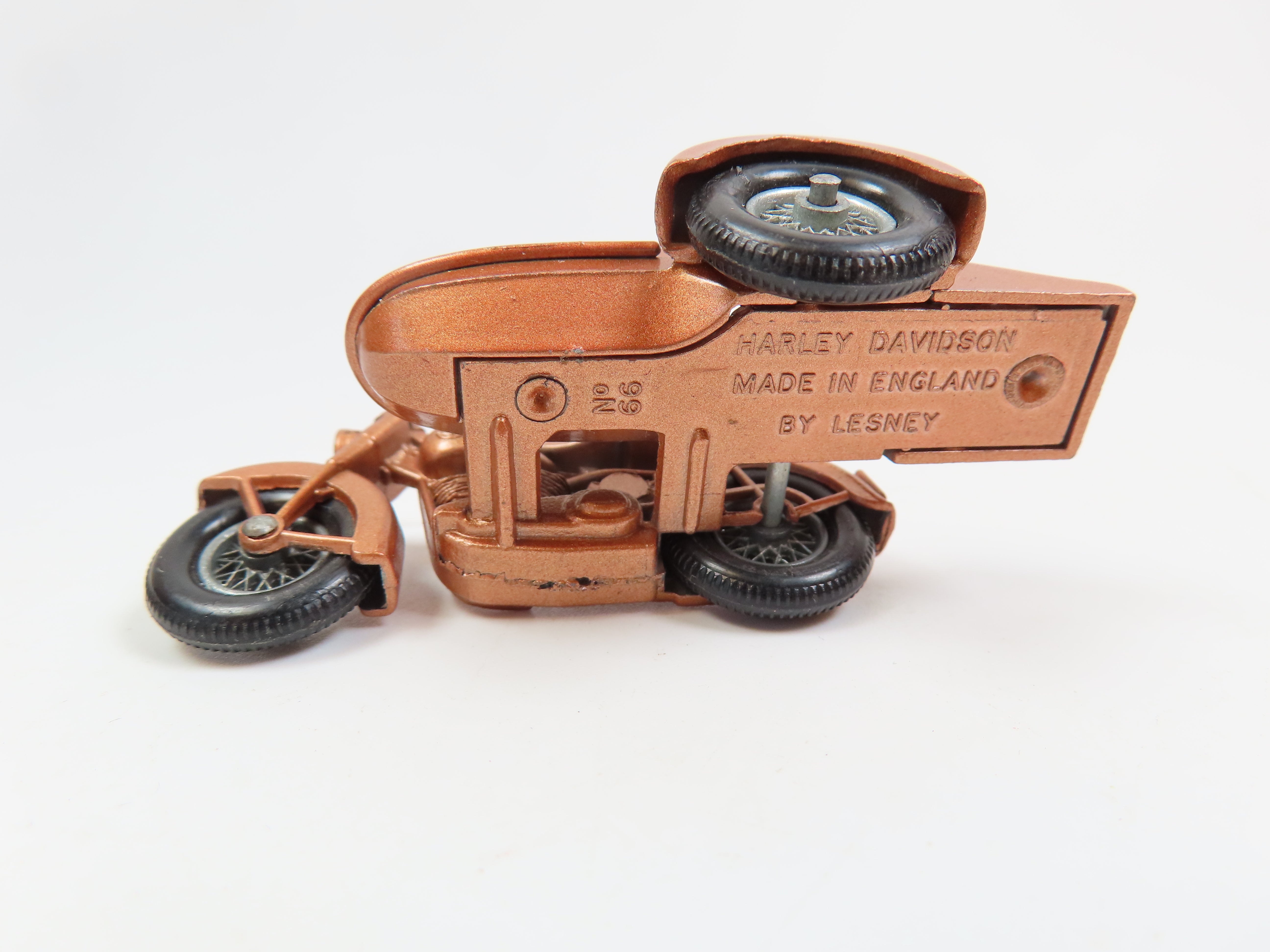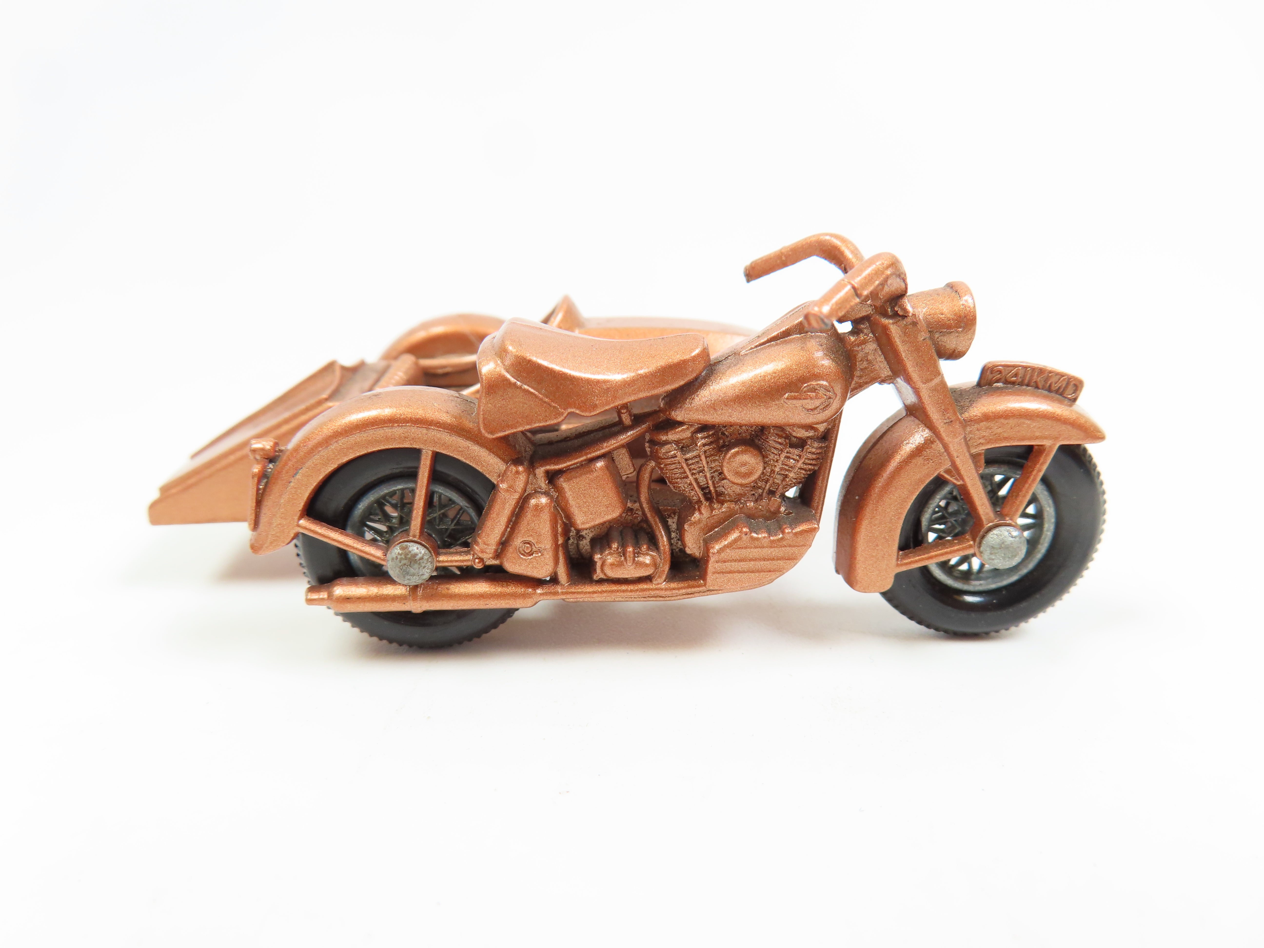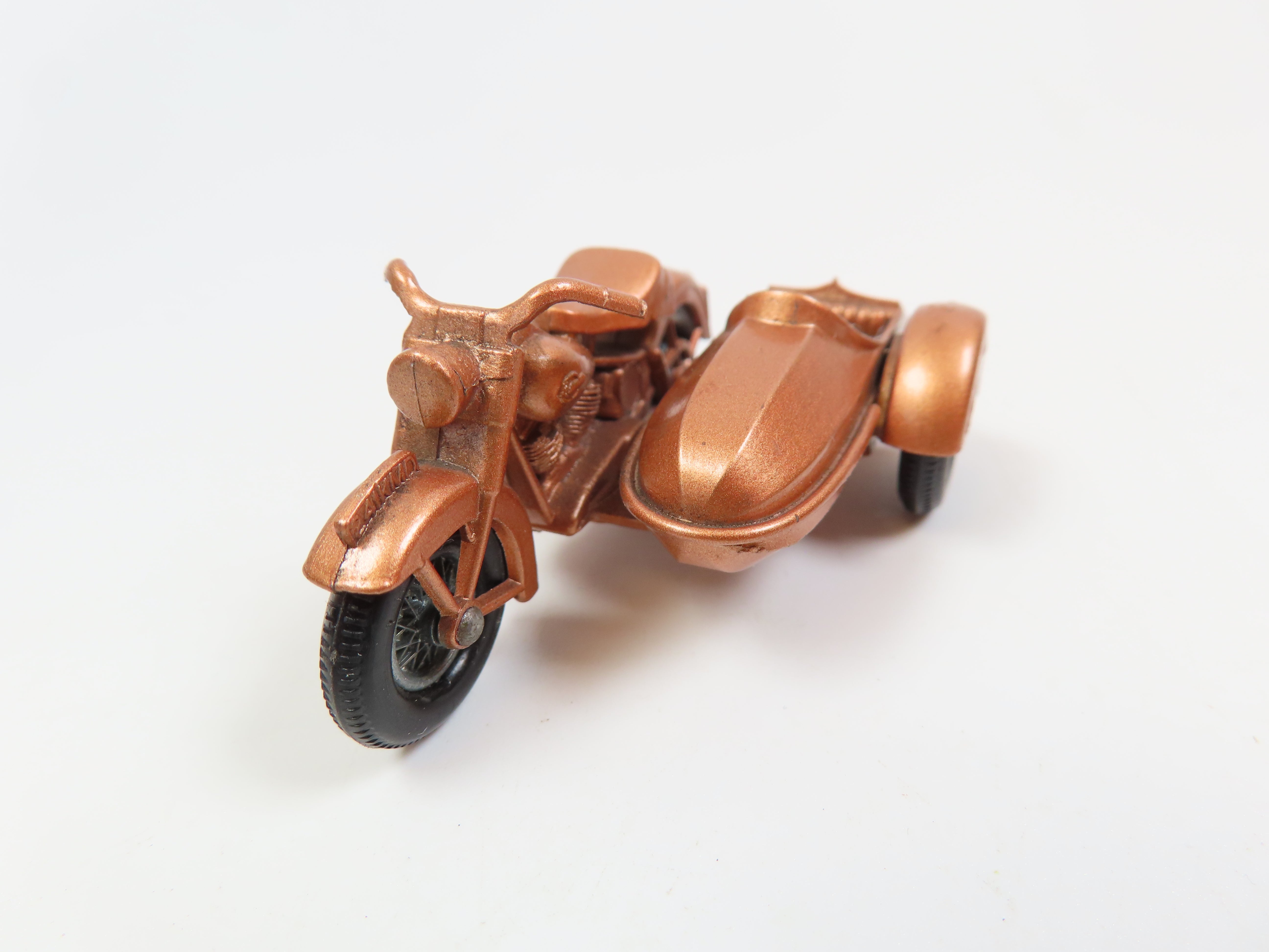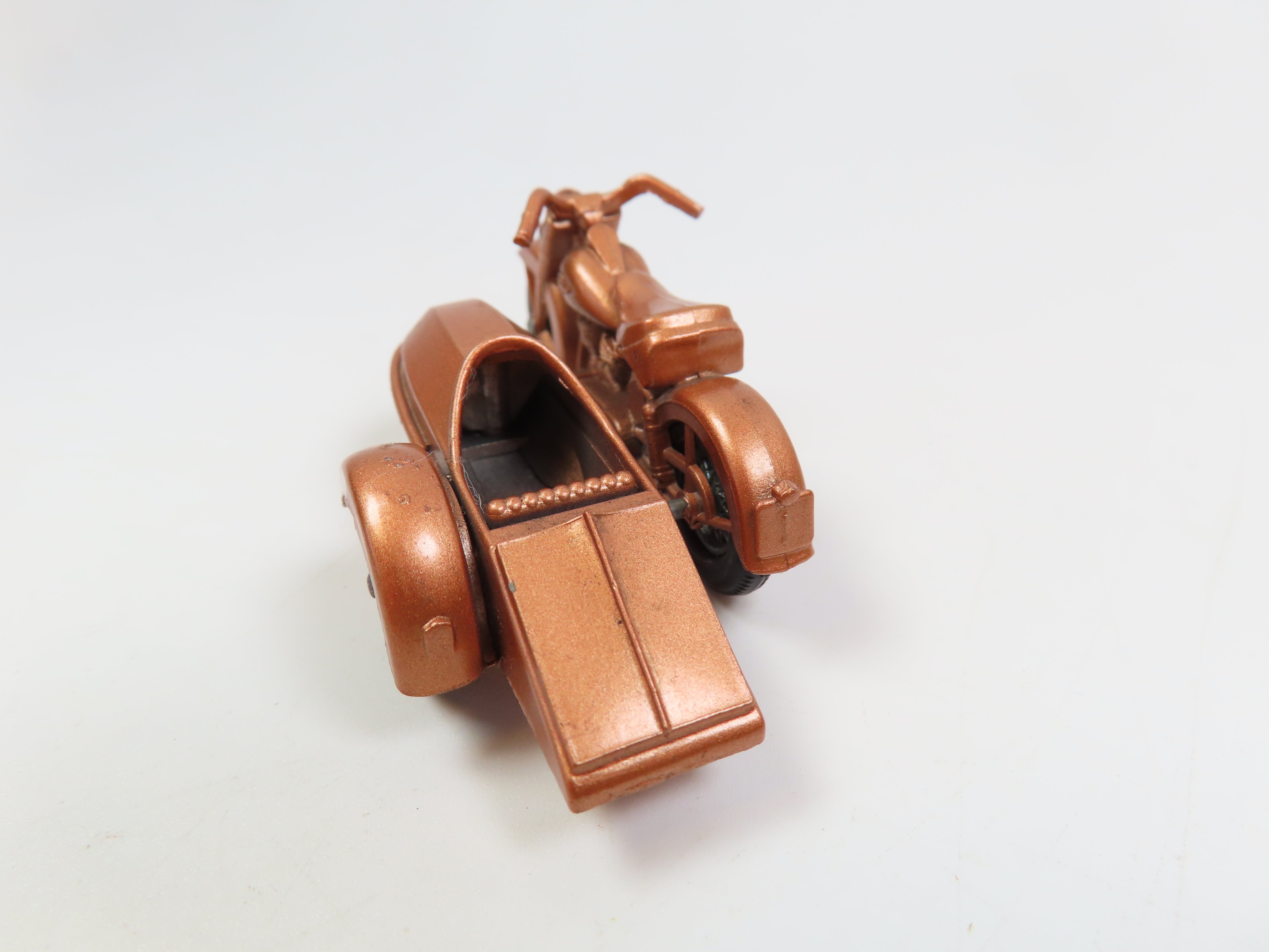 Matchbox No.66 Harley Davidson & Sidecar in metallic bronze and first issued in 1962.