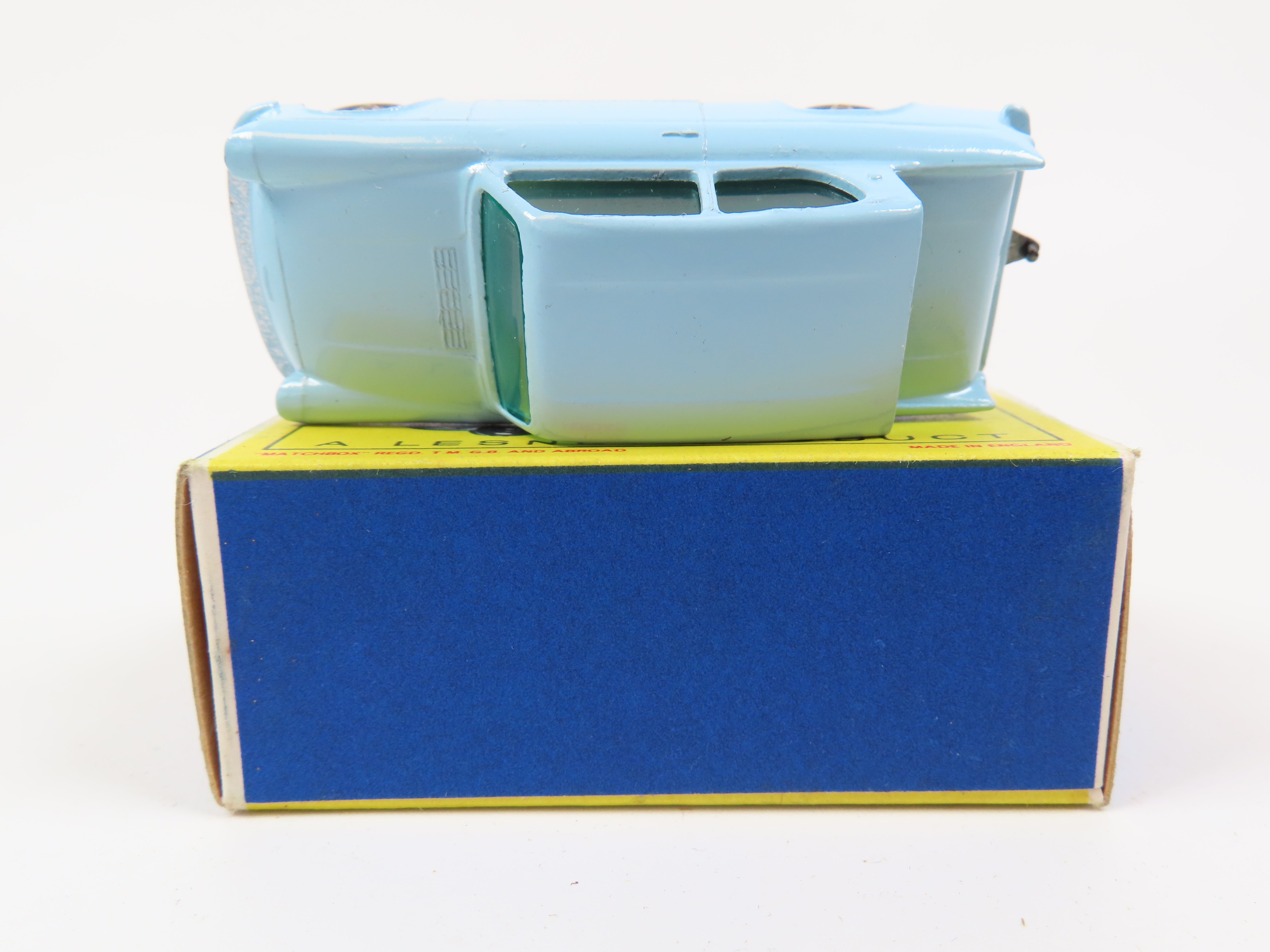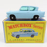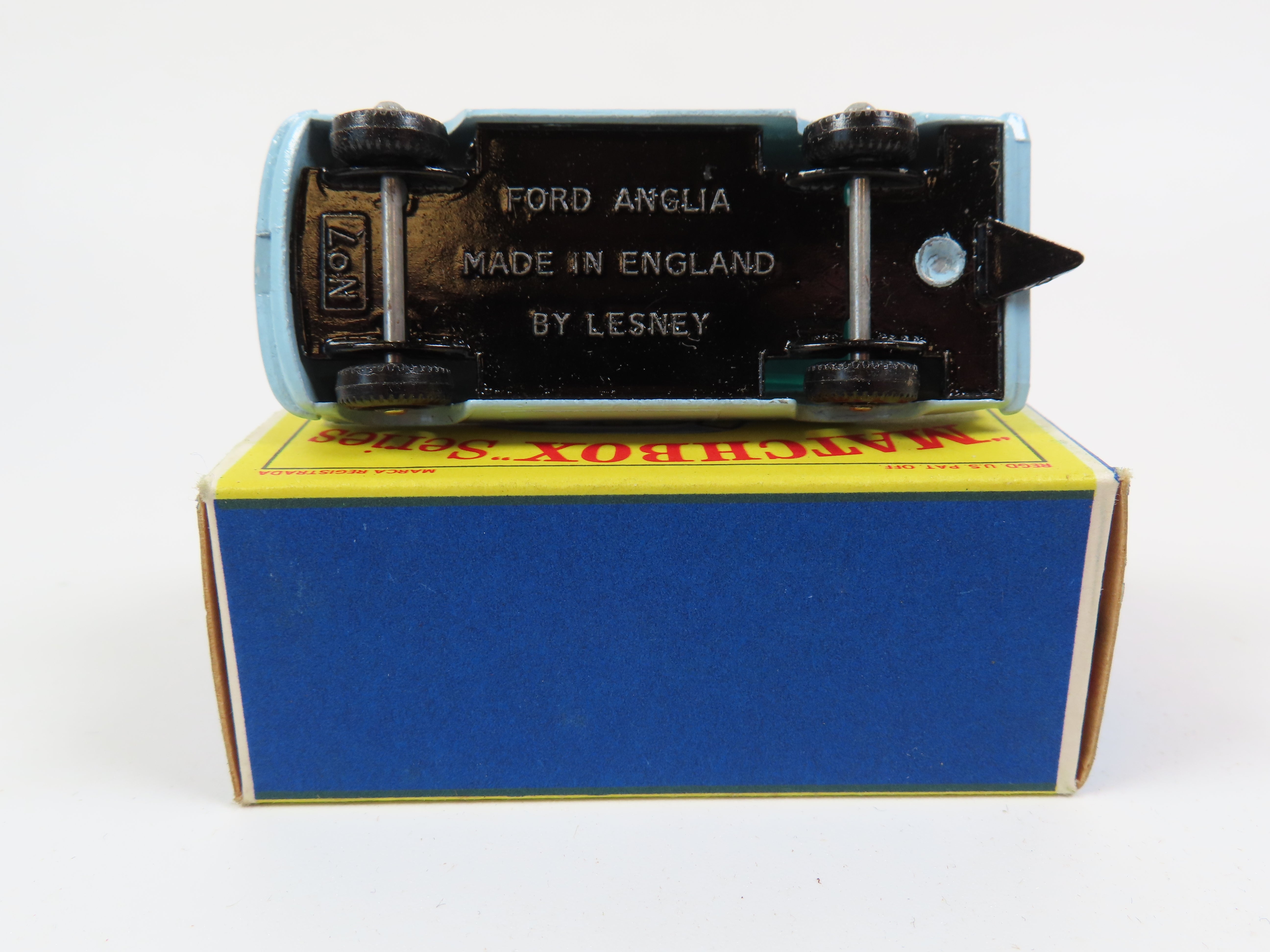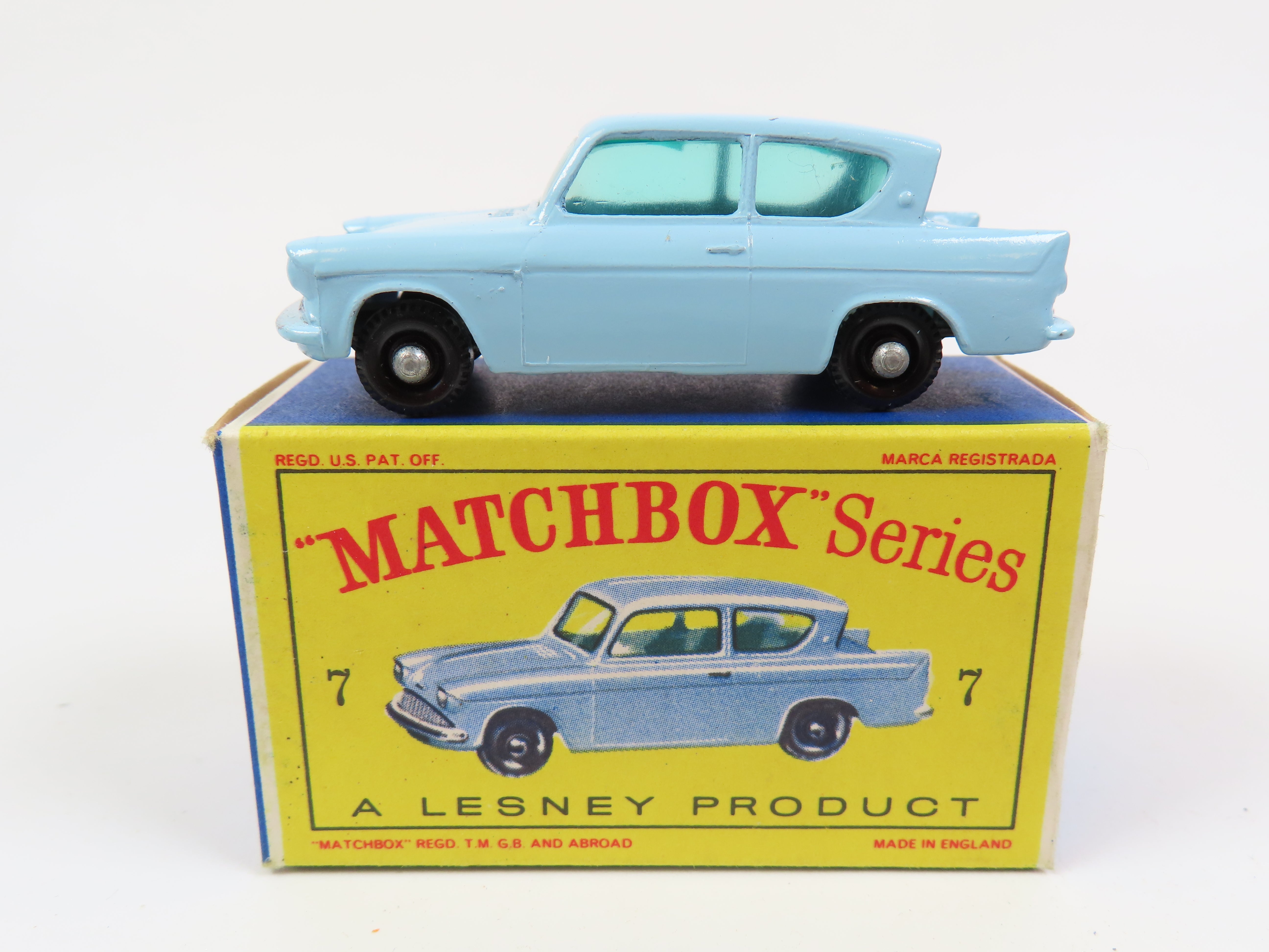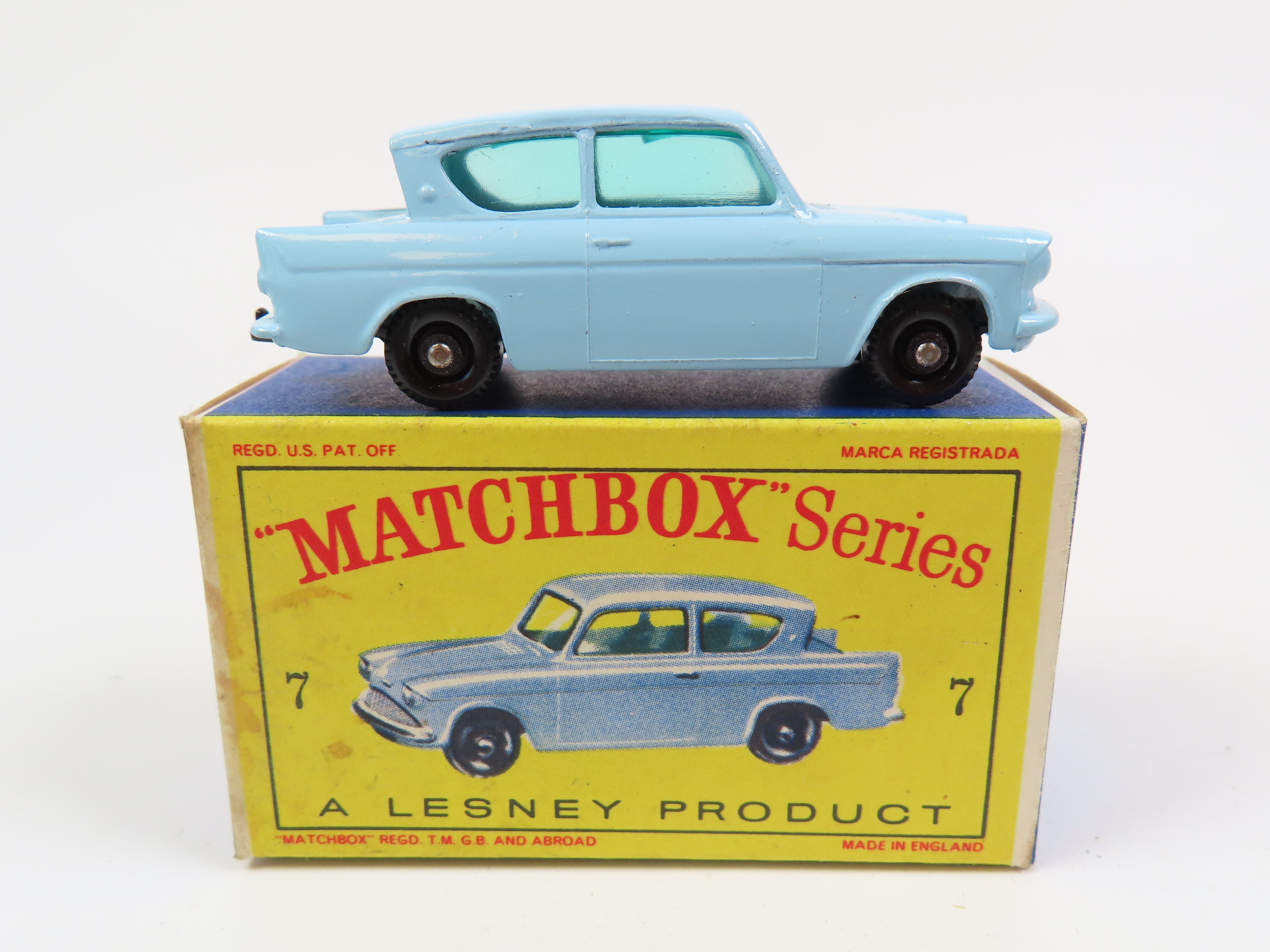 Matchbox No.7 Ford Anglia in light blue, with blue tinted windows and black baseplate and plastic wheels.