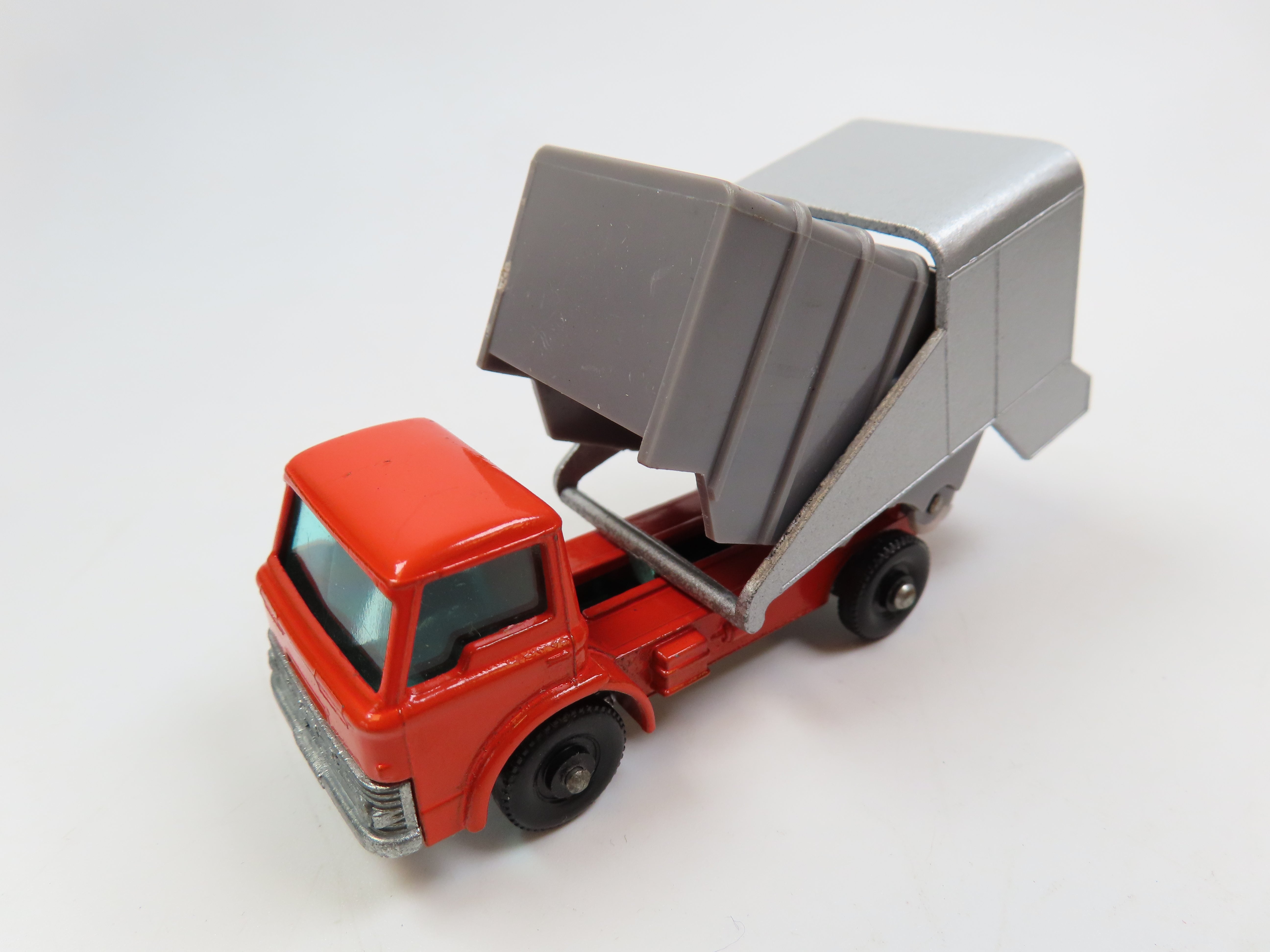 Matchbox No.7 Refuse Truck, with bright orange cab, blue tinted windows and grey and silver tipper to the rear.