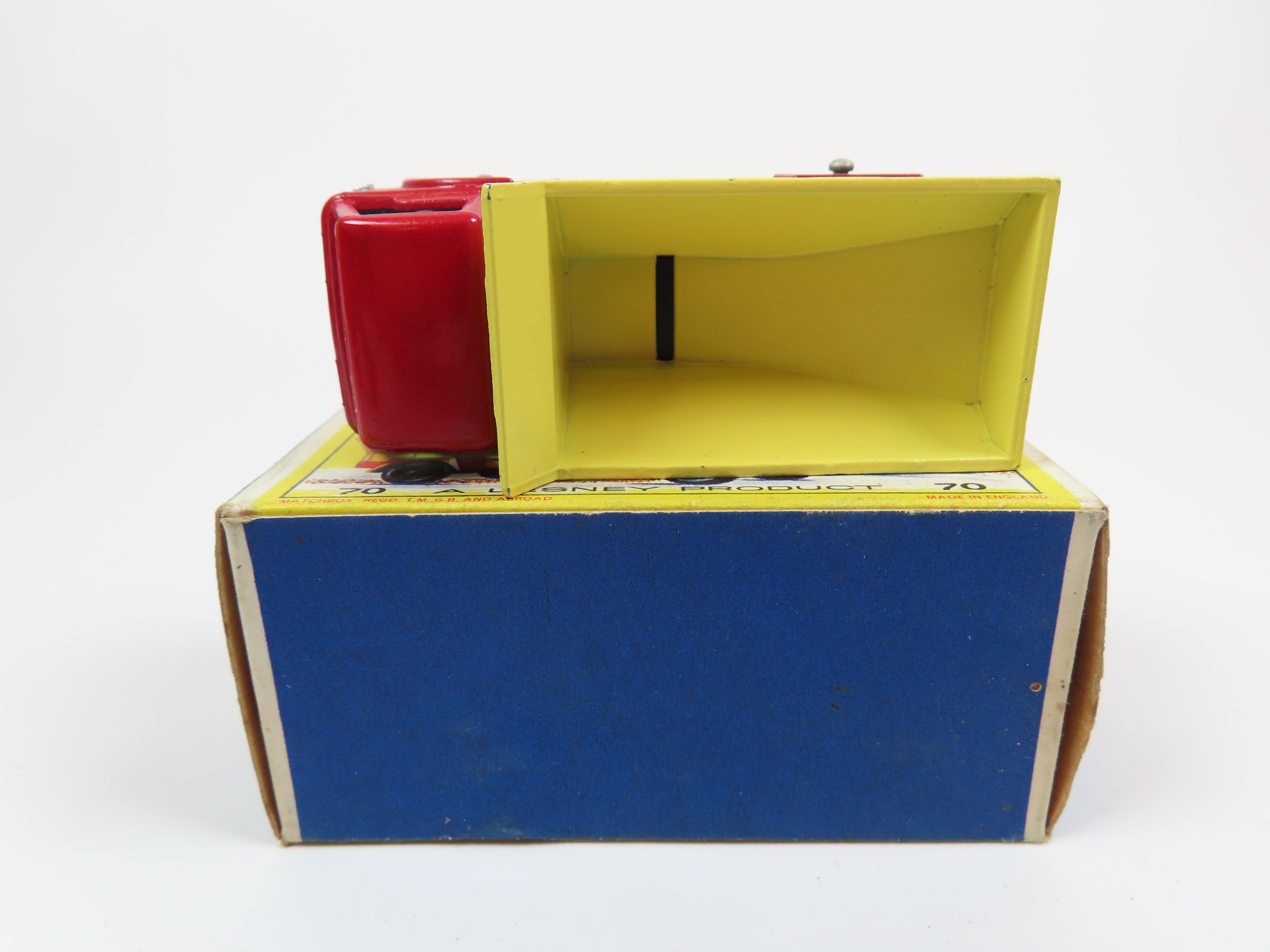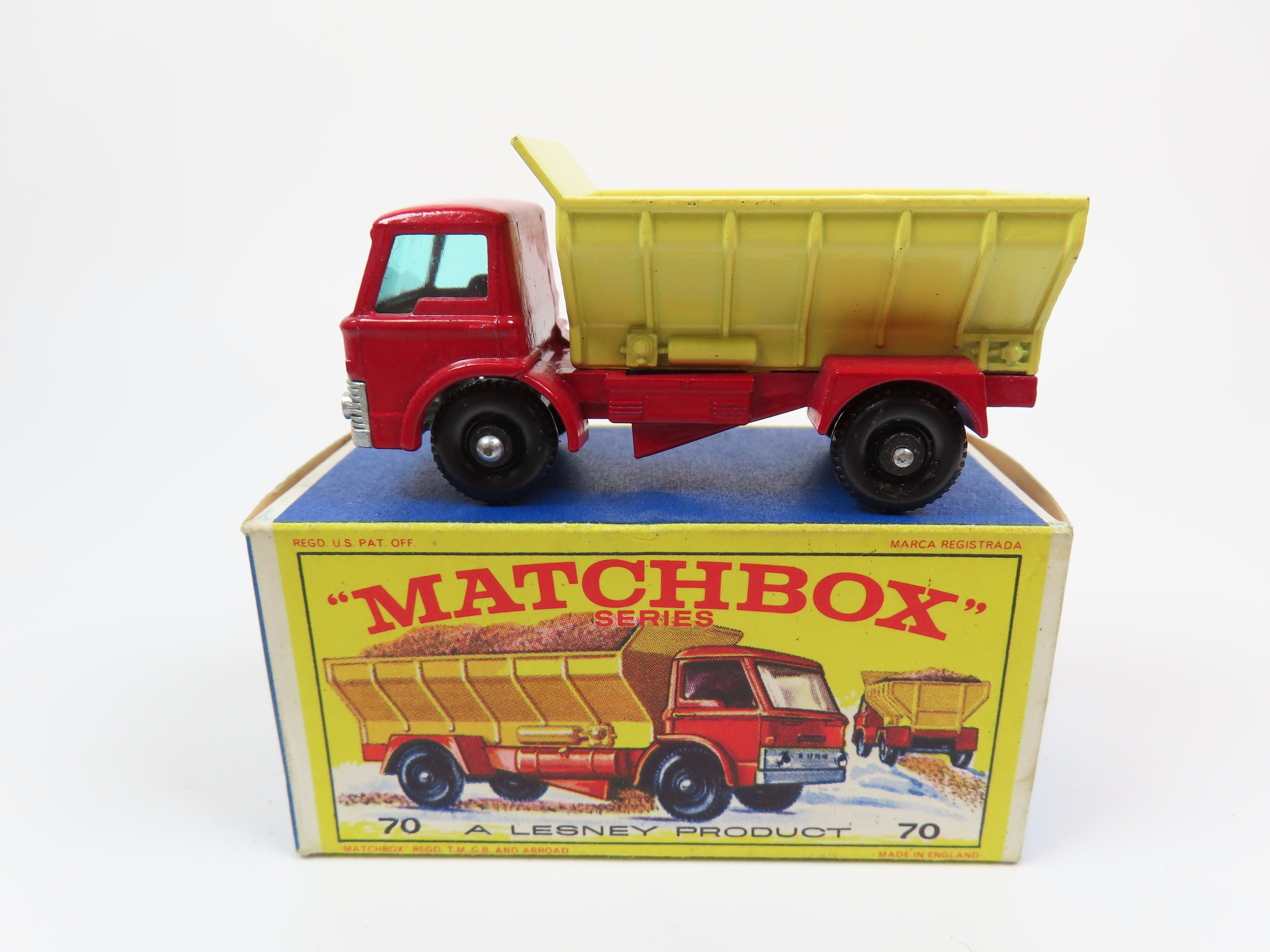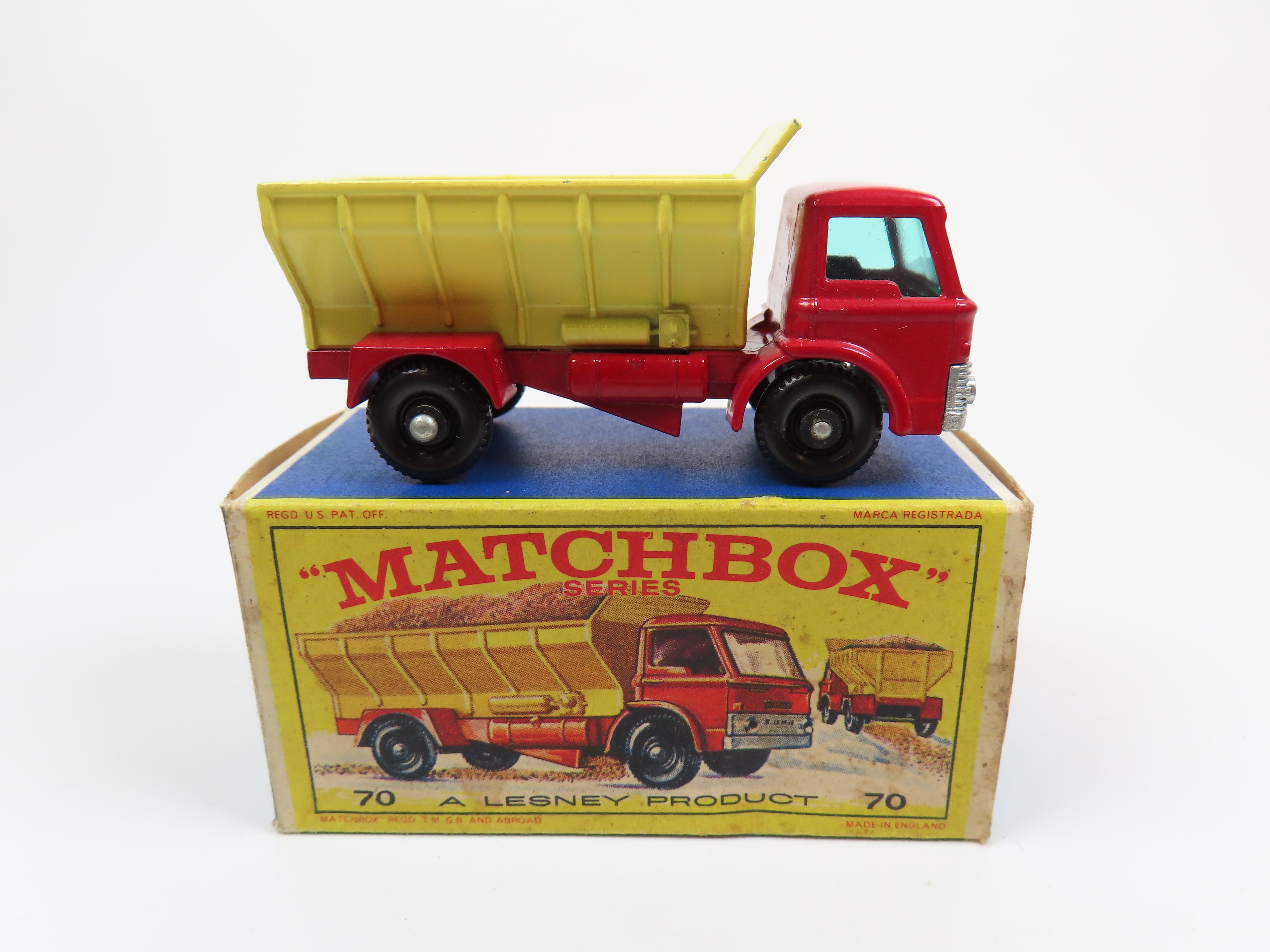 Matchbox No.70 Grit-Spreading Truck in bright red with yellow tipper and blue tinted windows.