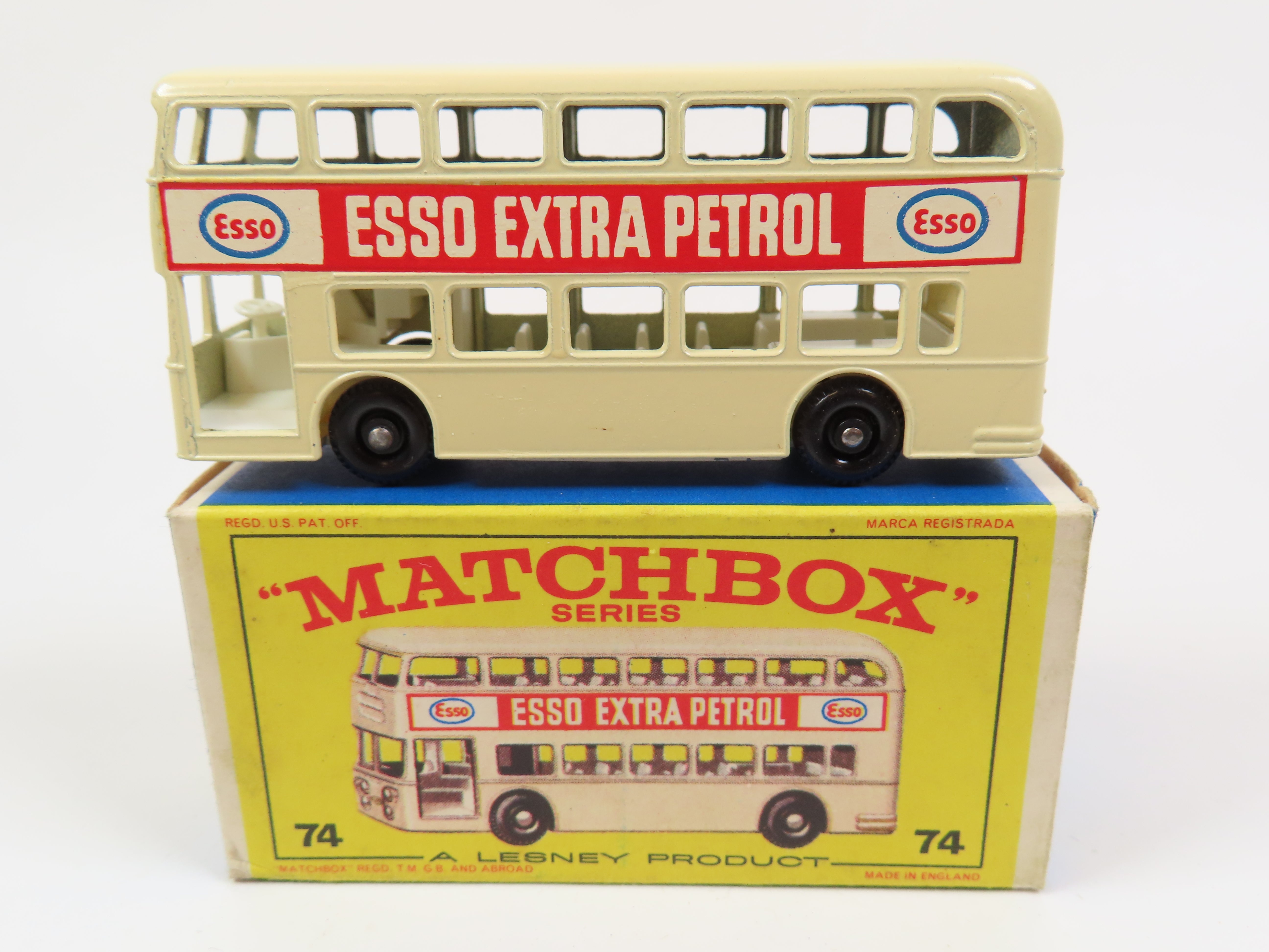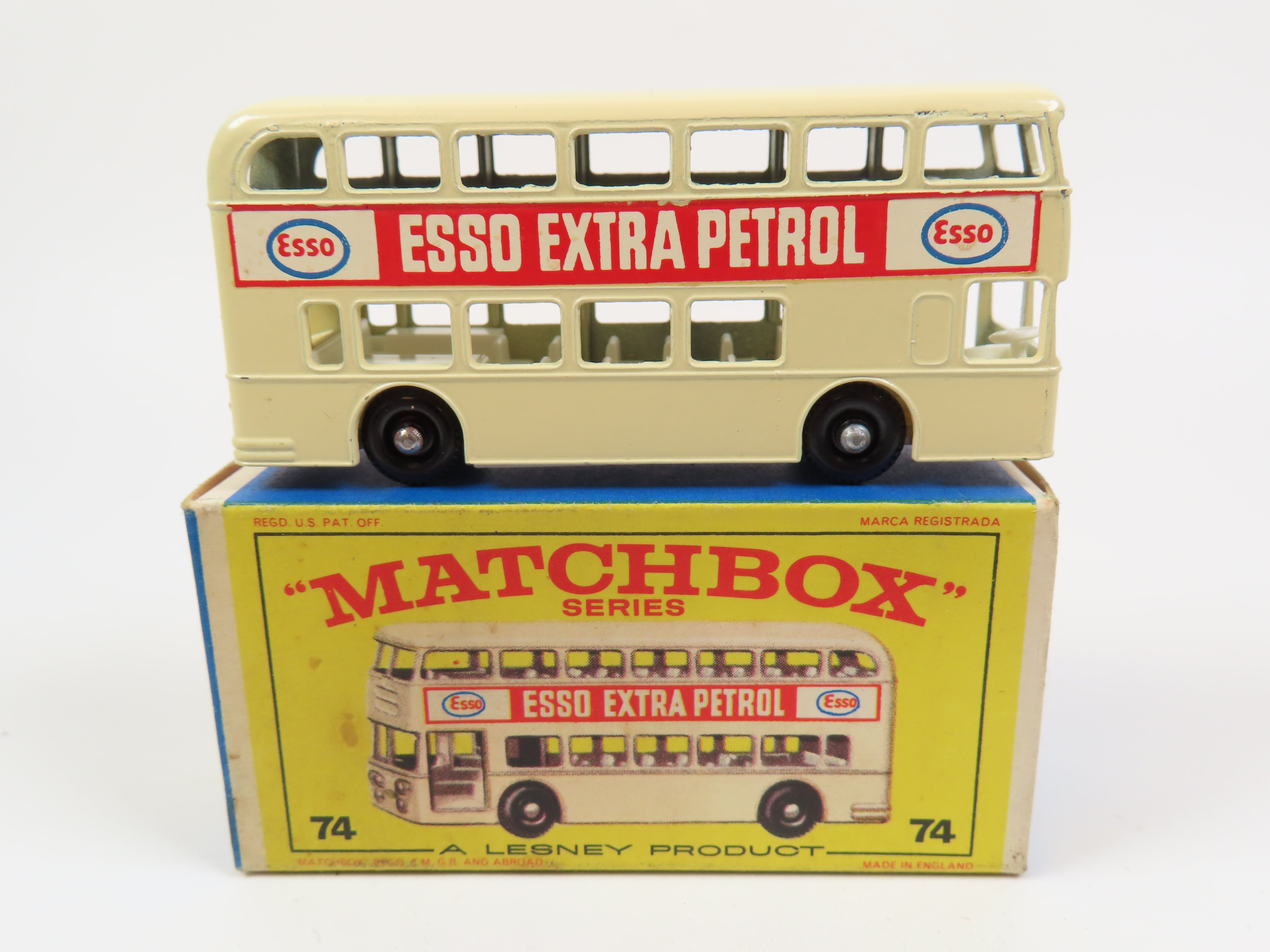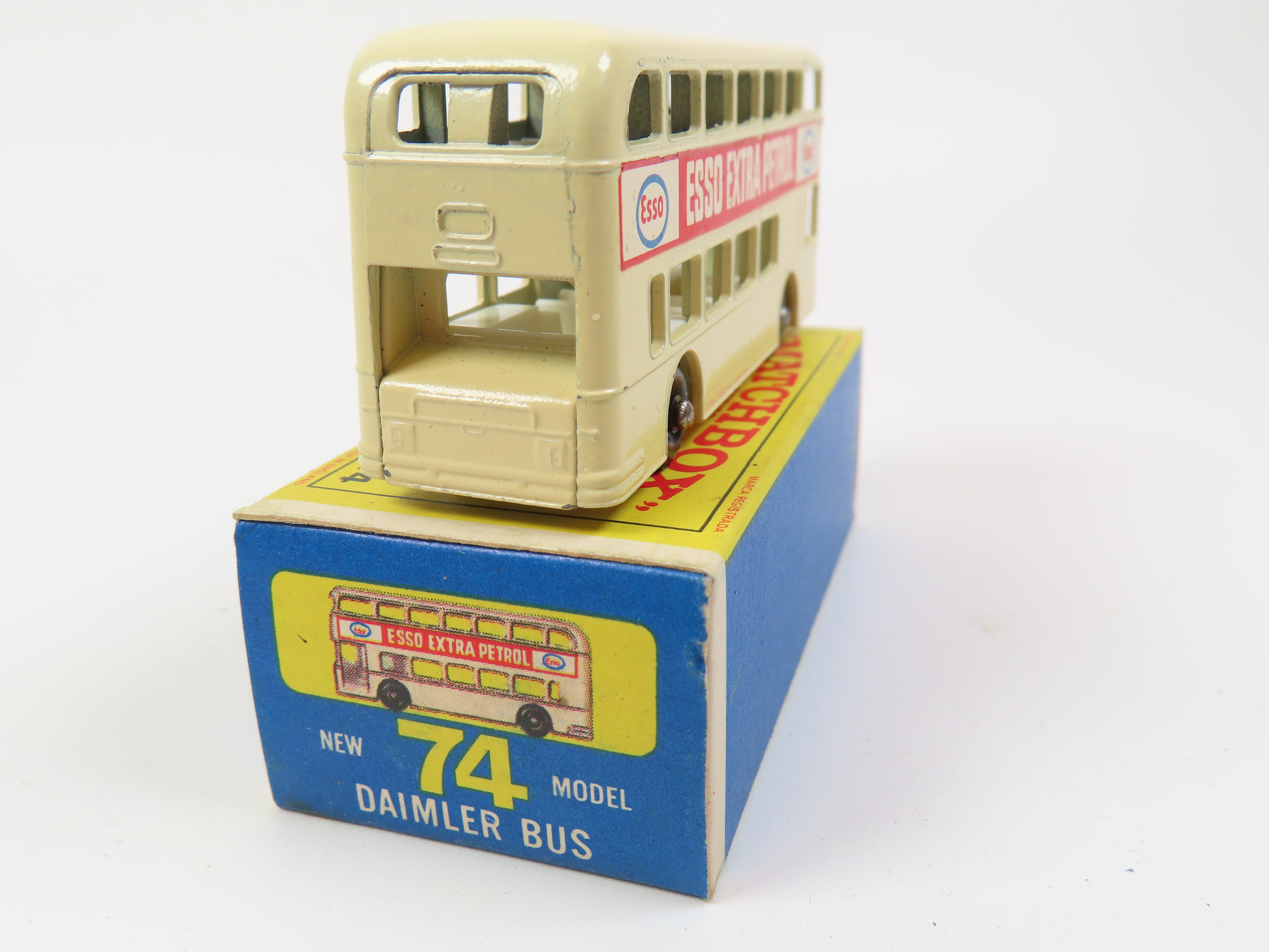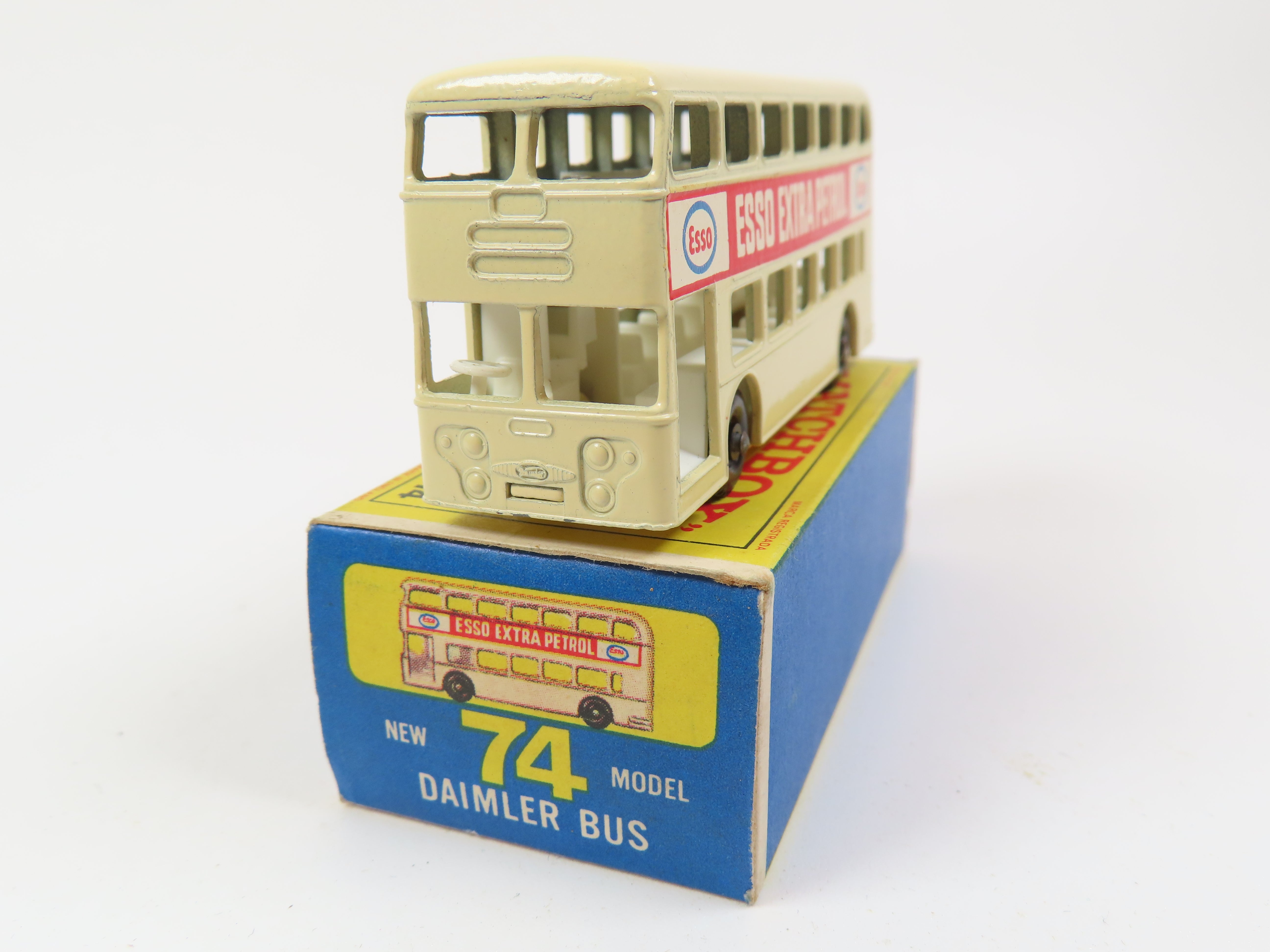 Matchbox No.74 Daimler Bus in cream and with 'Esso Extra Petrol' decals to each side.