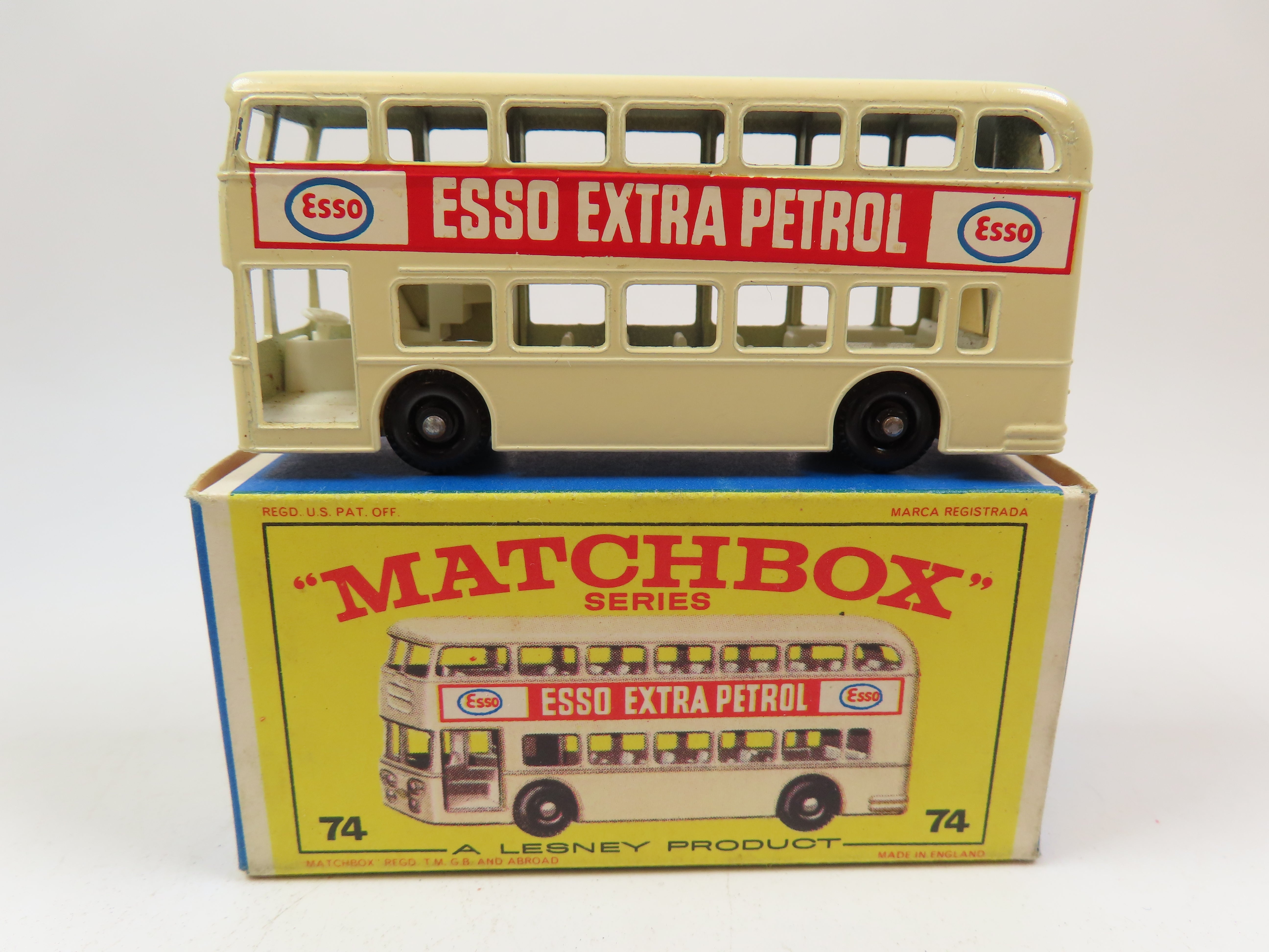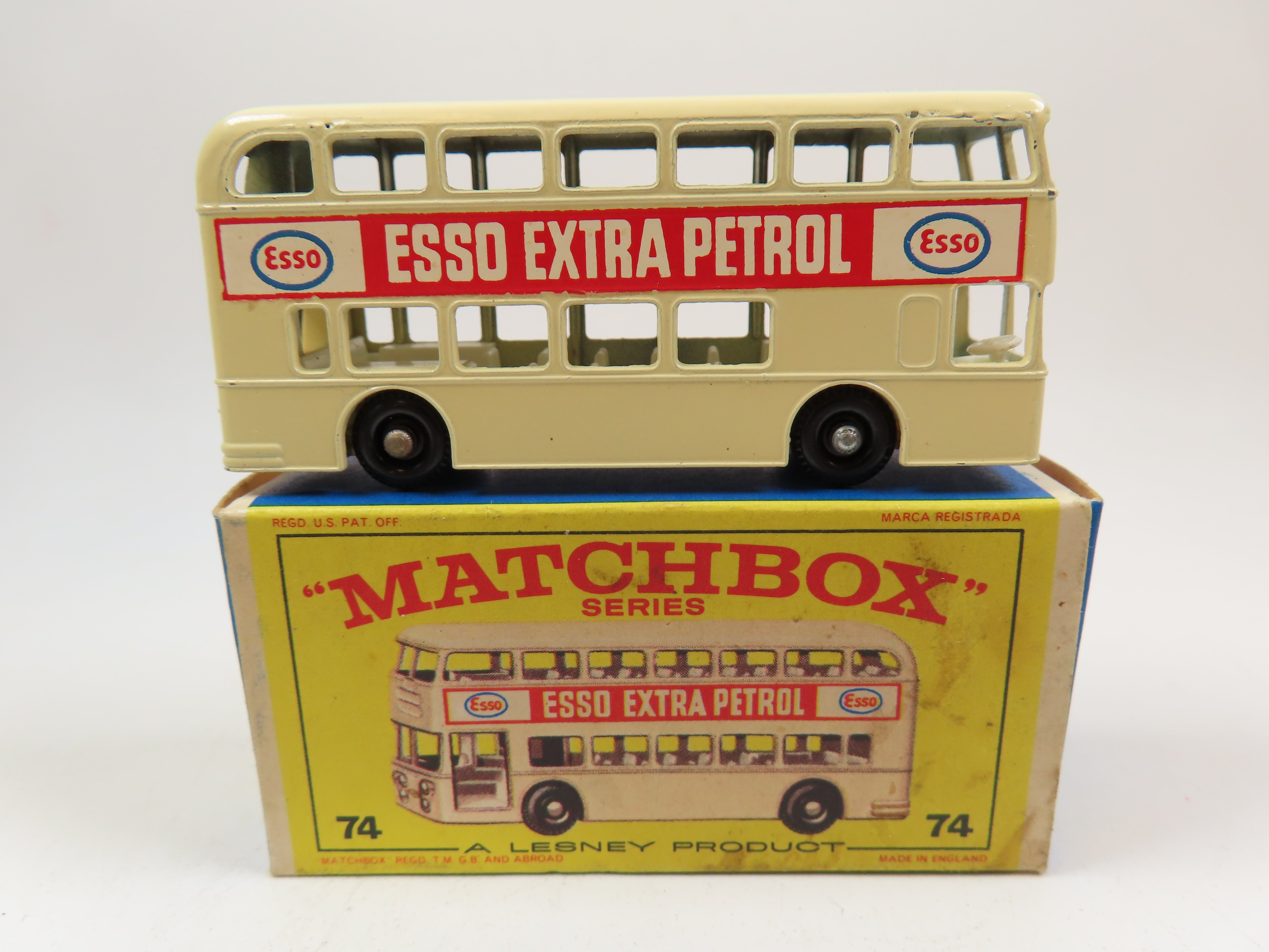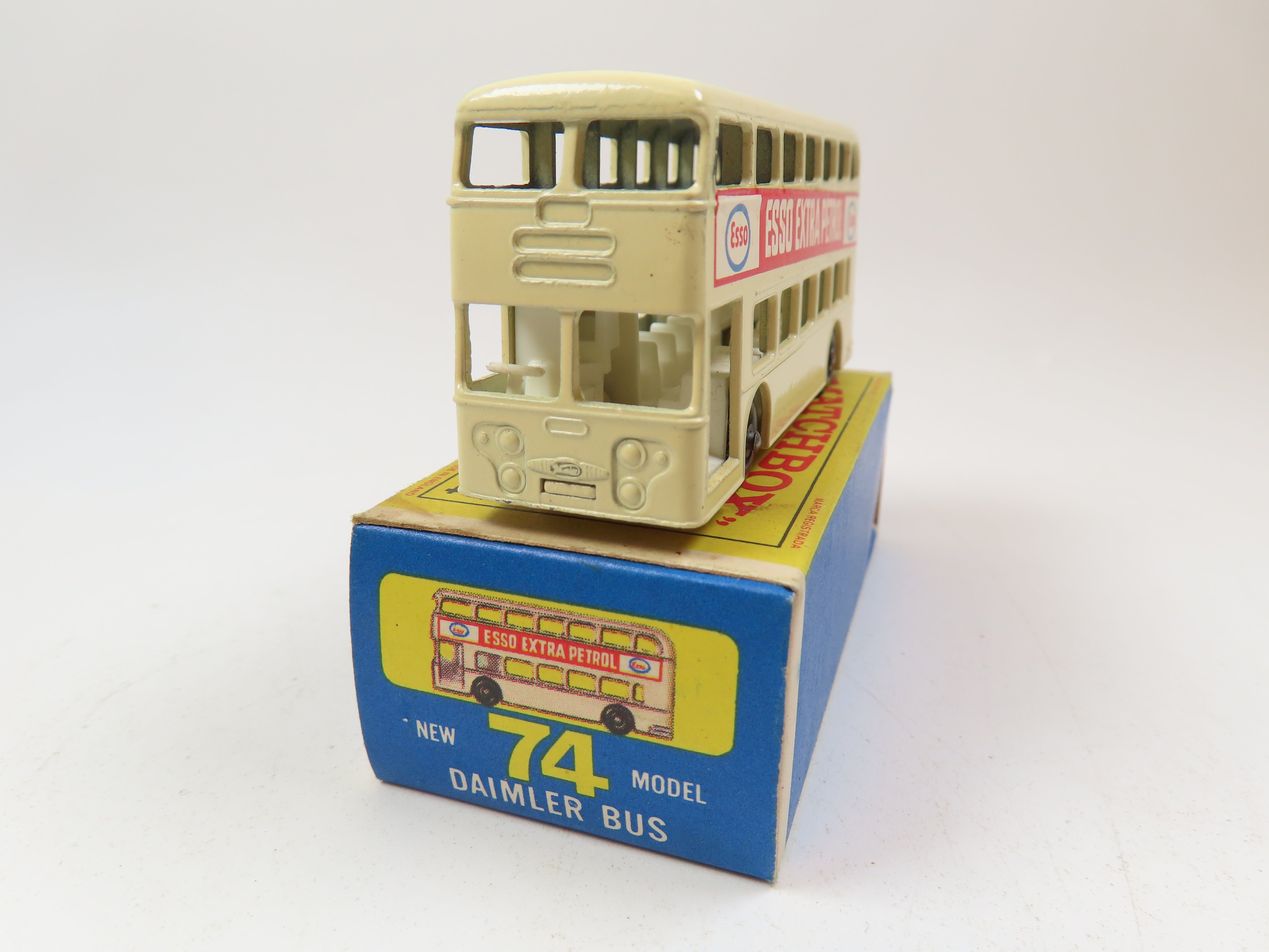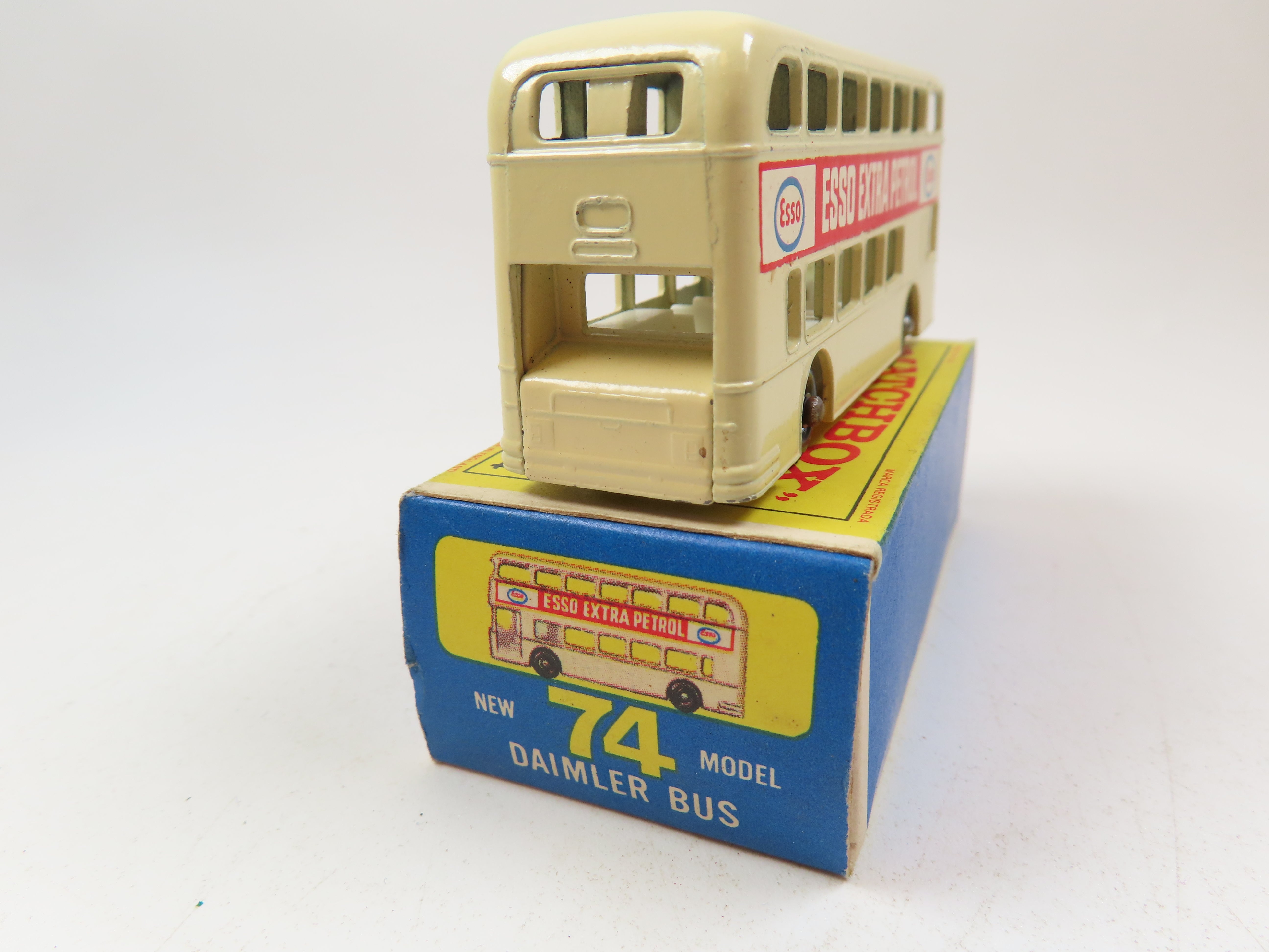 Matchbox No.74 Daimler Bus in cream and with 'Esso Extra Petrol' decals to each side.