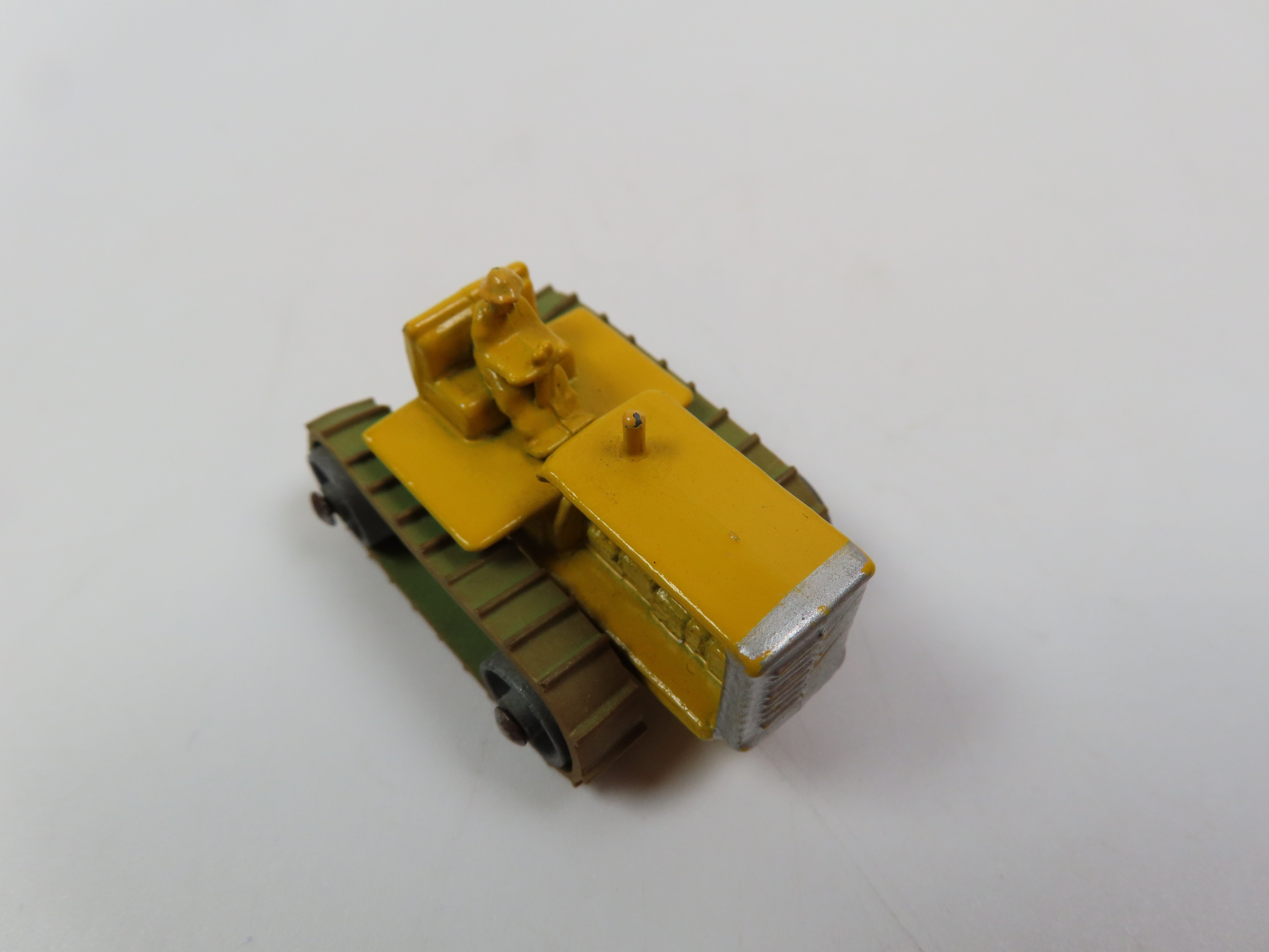 Matchbox No.8a Caterpillar Tractor in yellow with green rubber treads and silver painted grille.