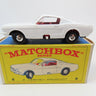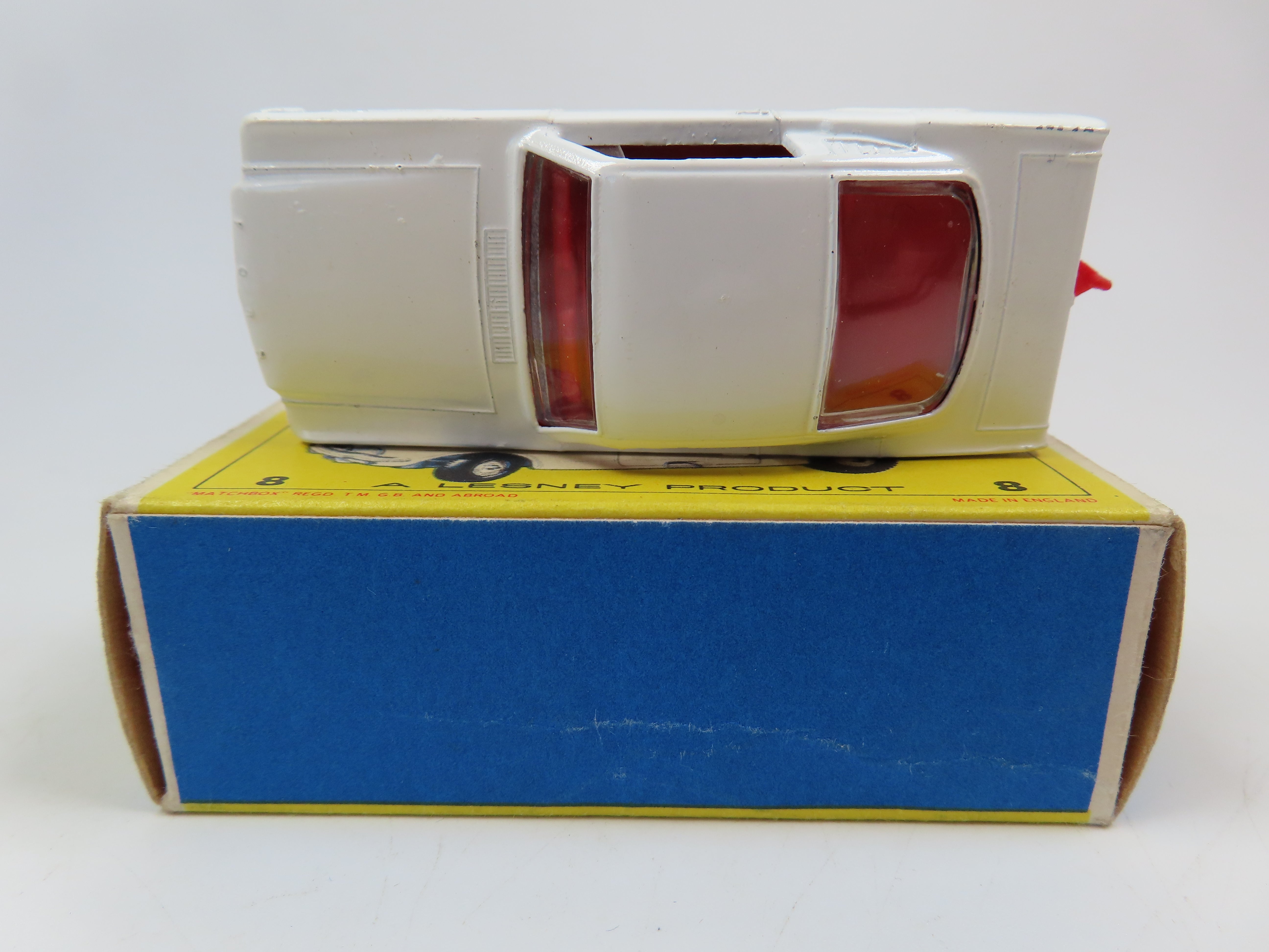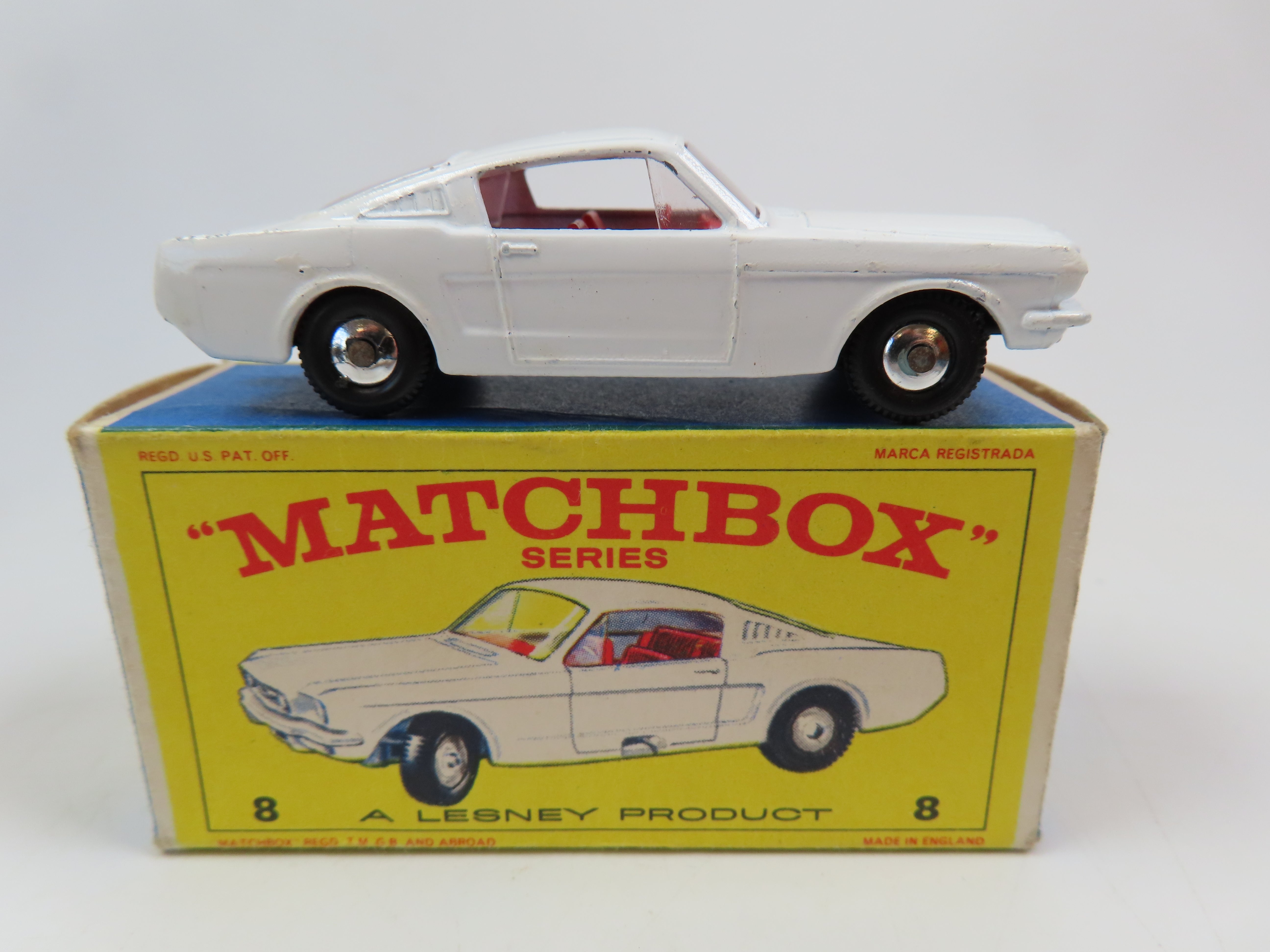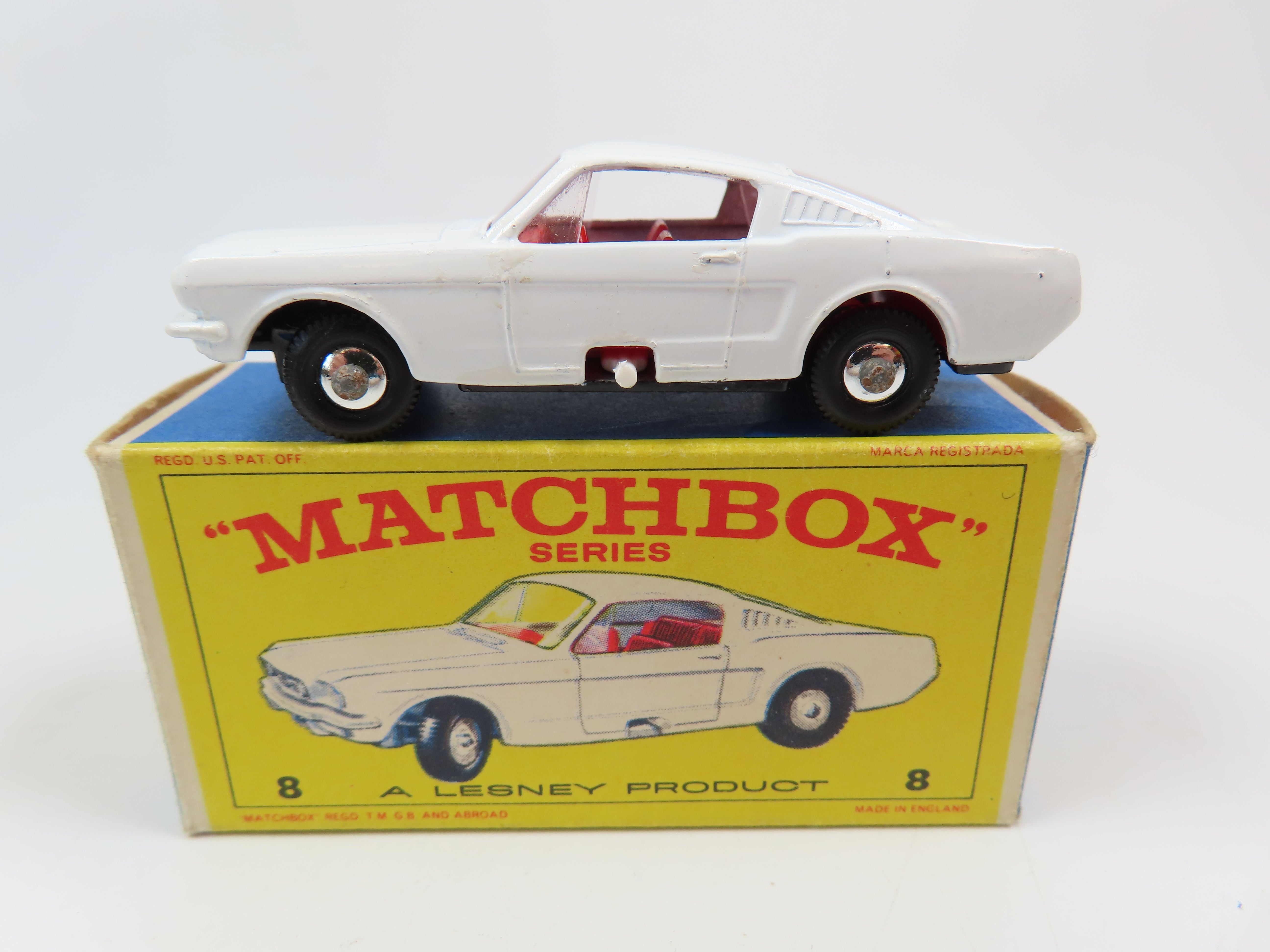 Matchbox No.8 Ford Mustang in white, with red plastic interior and tow hook and with a hole in the base for steering.