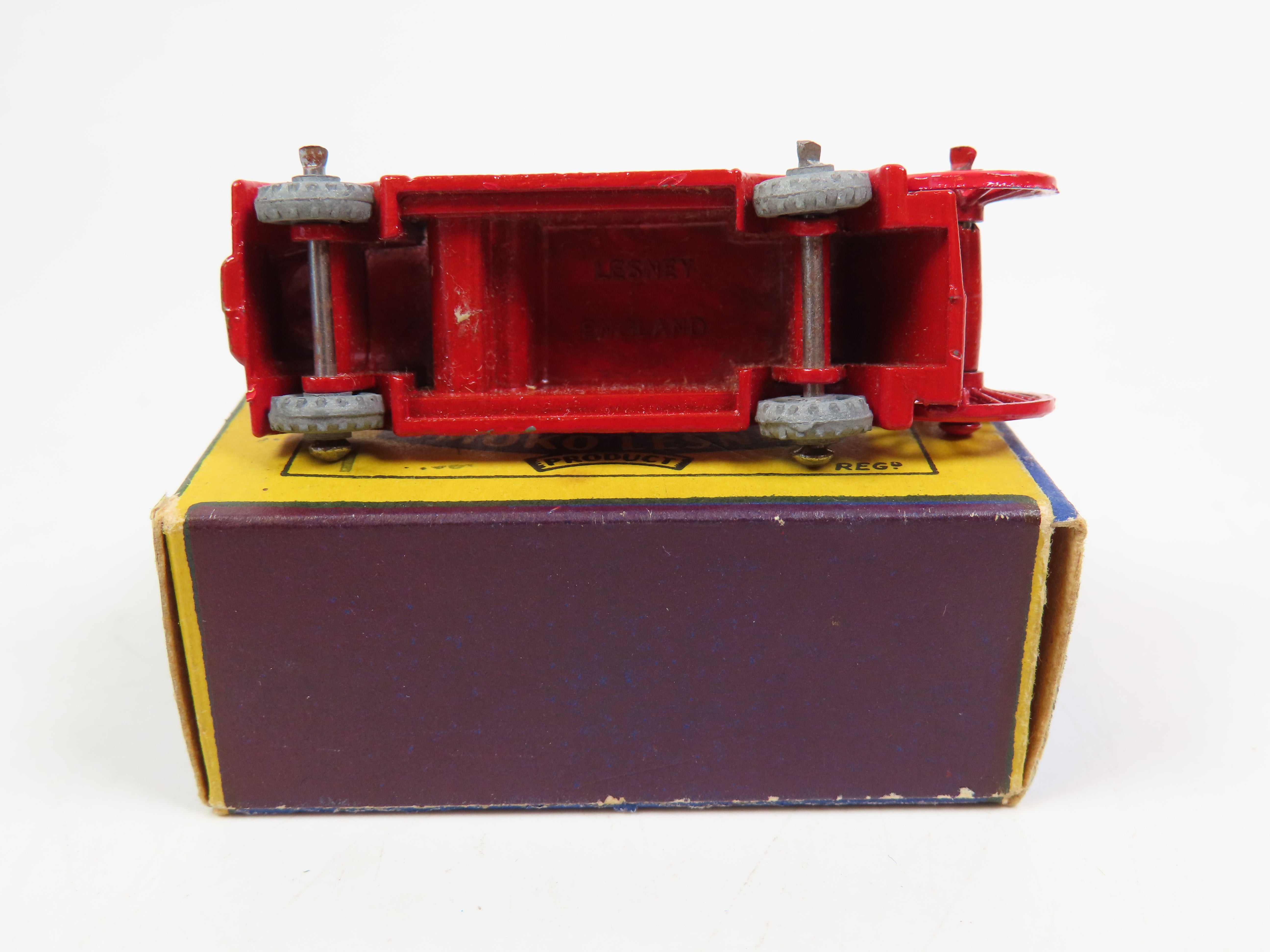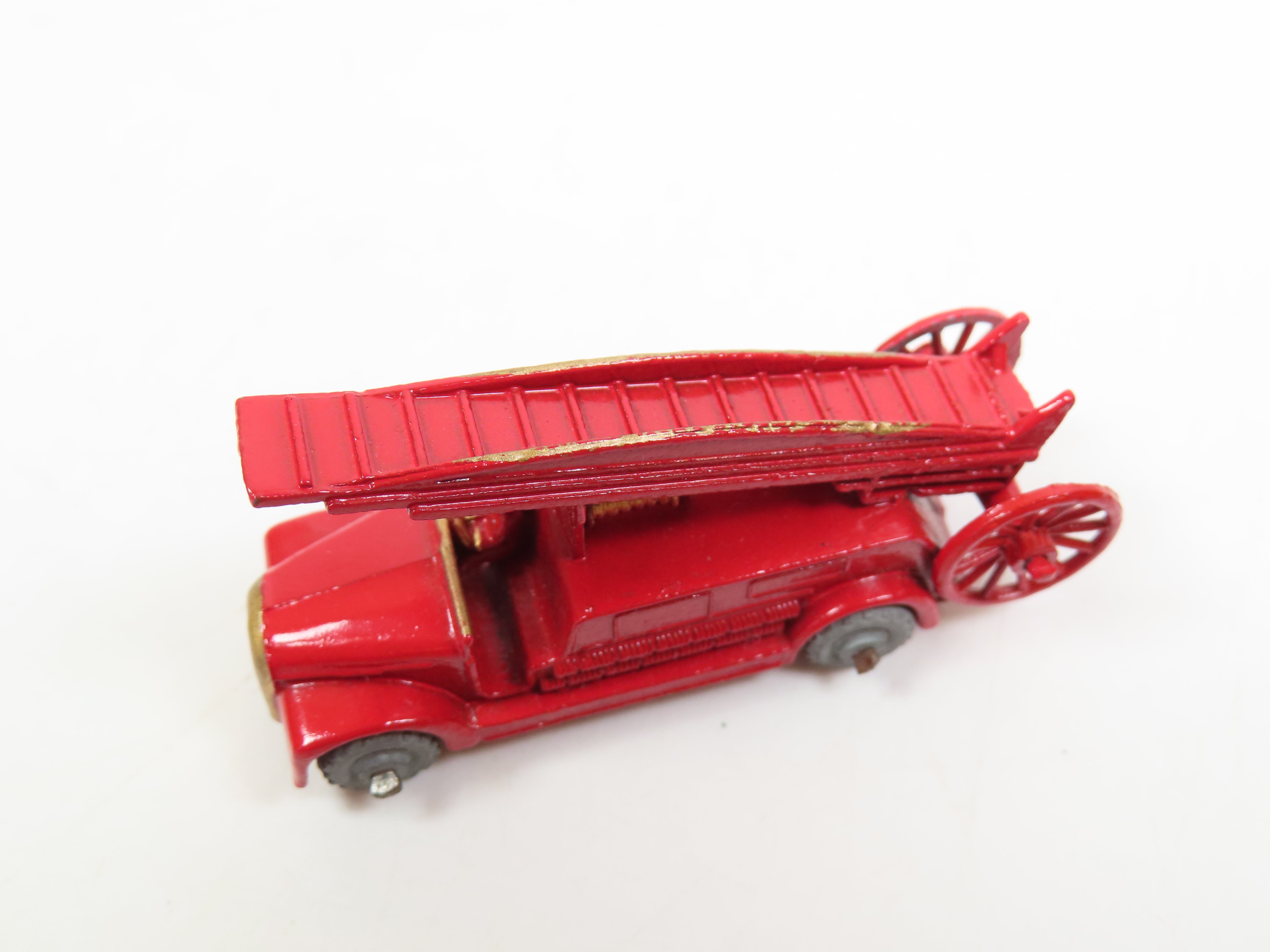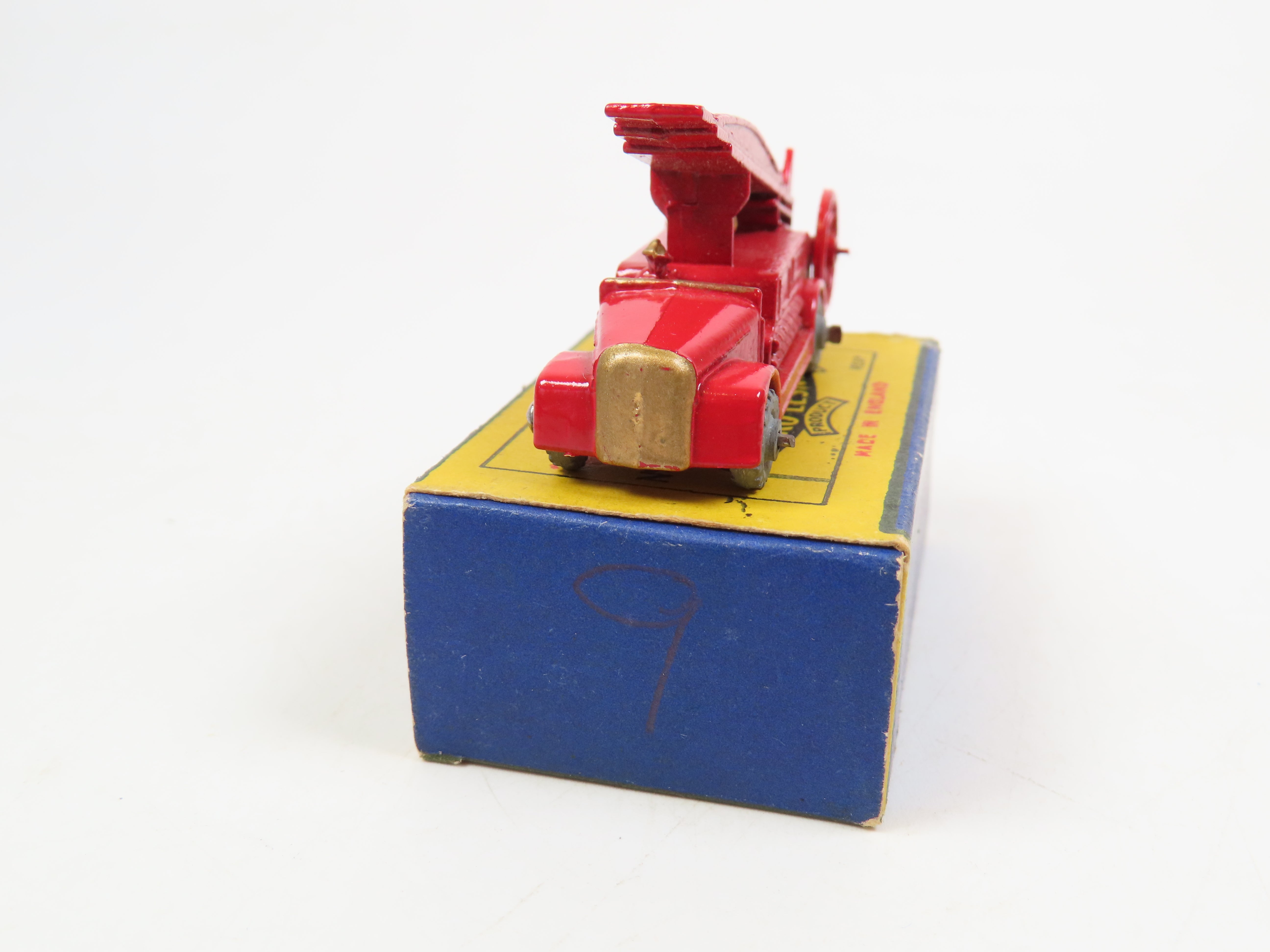 Matchbox No.9 Dennis Fire Escape Engine in red with gold detailing and grey metal wheels.