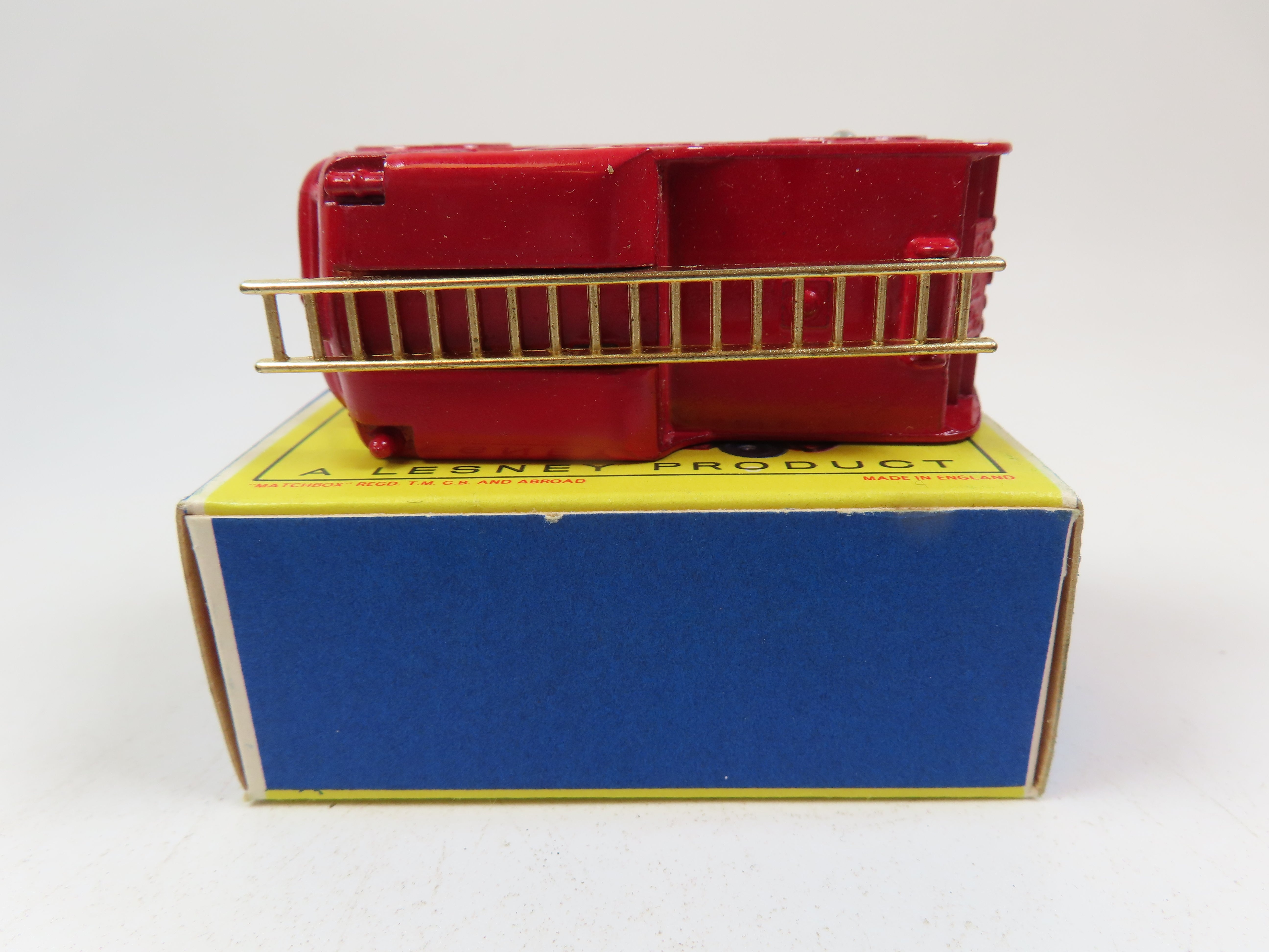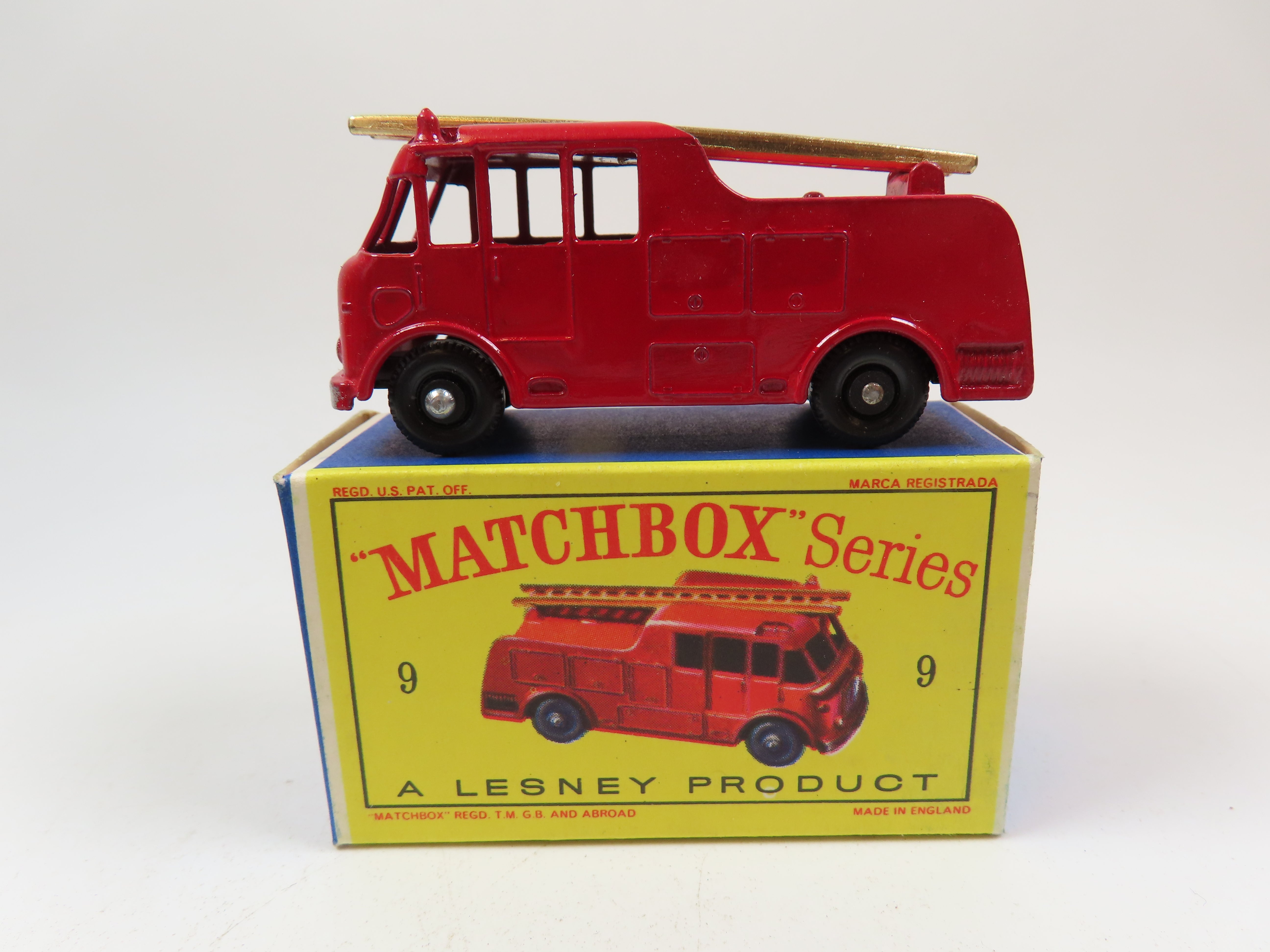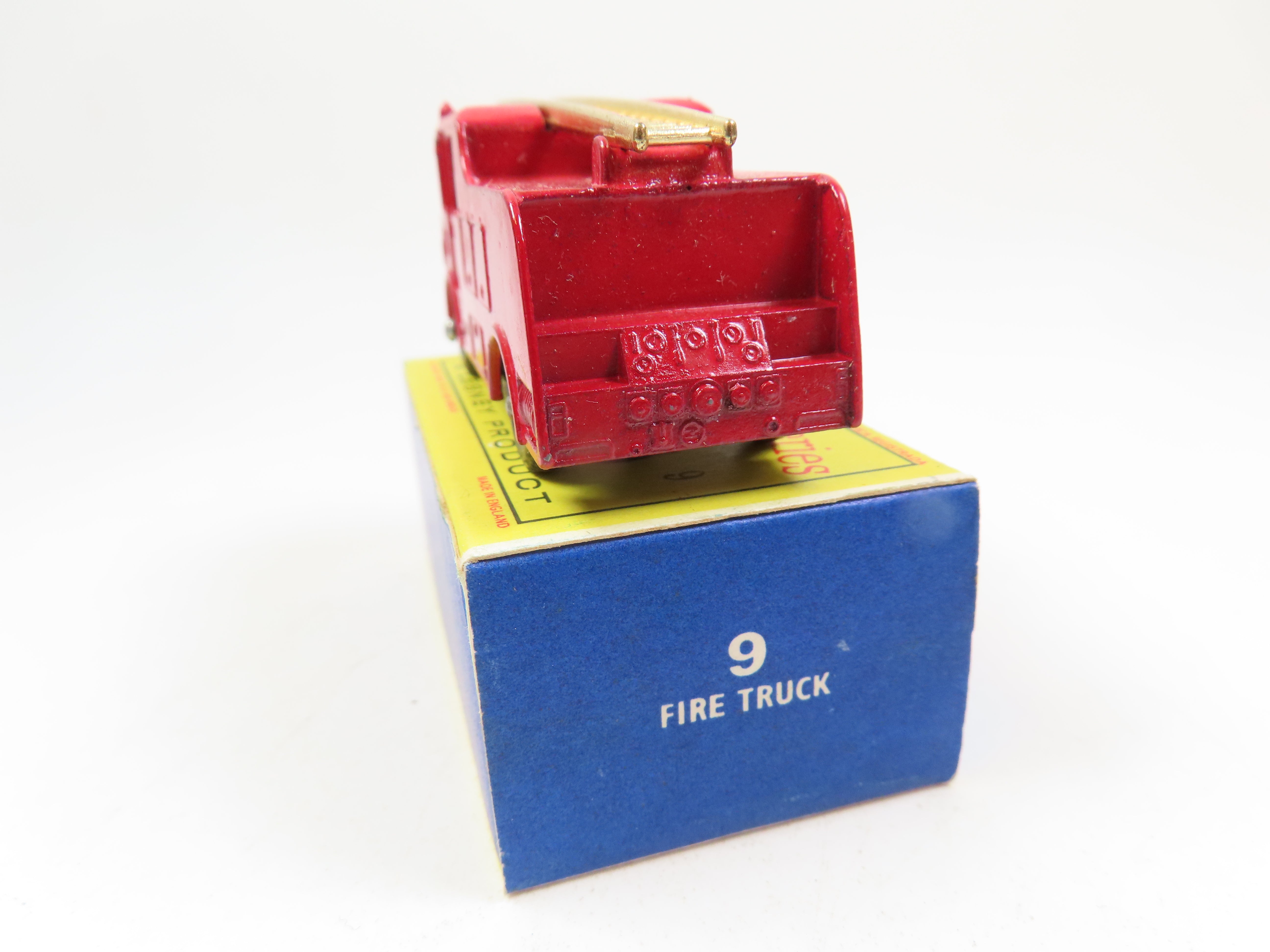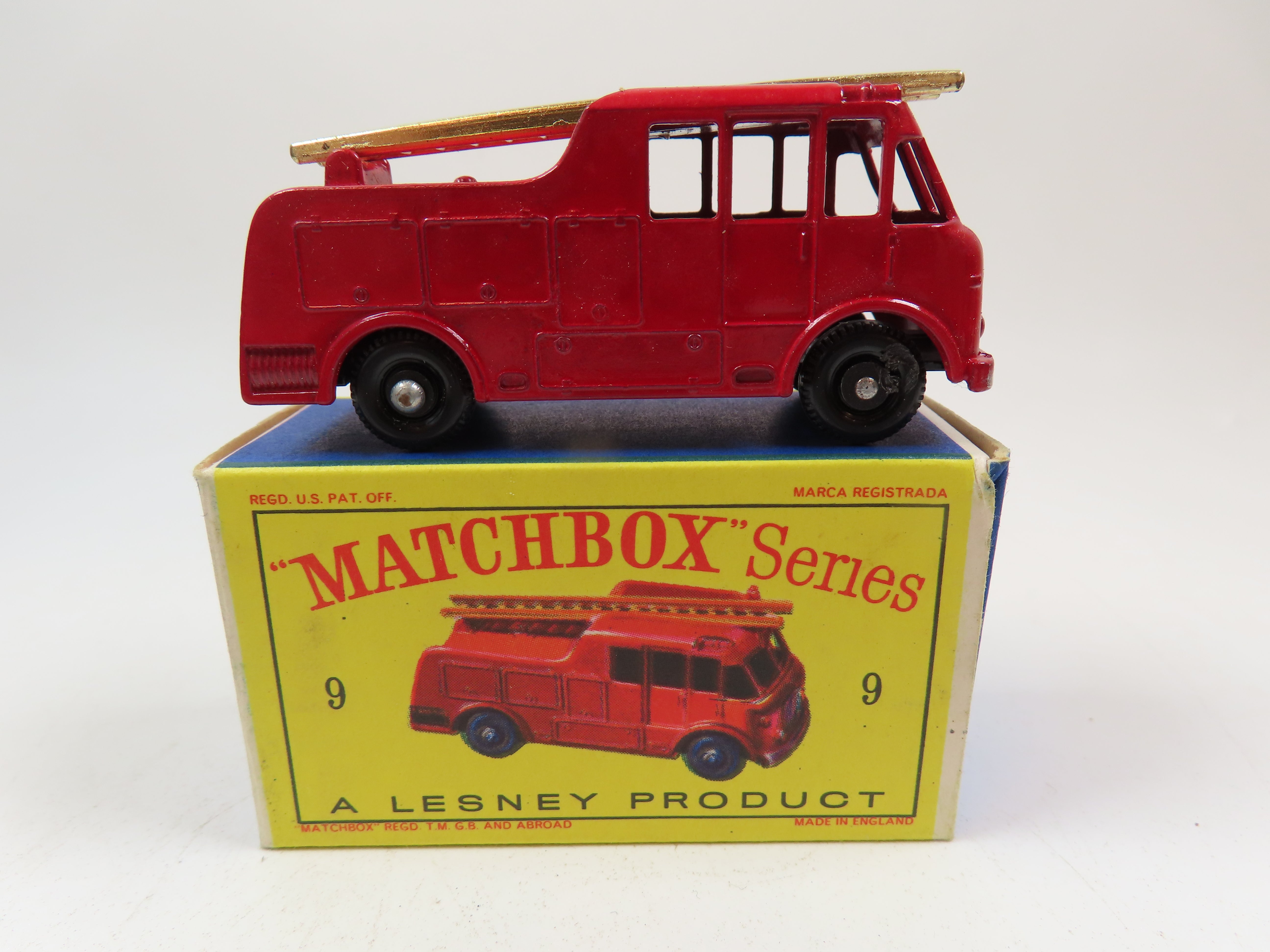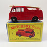 Matchbox No.9 Merryweather Fire Truck in bright red, with gold ladder to the roof and black plastic wheels.