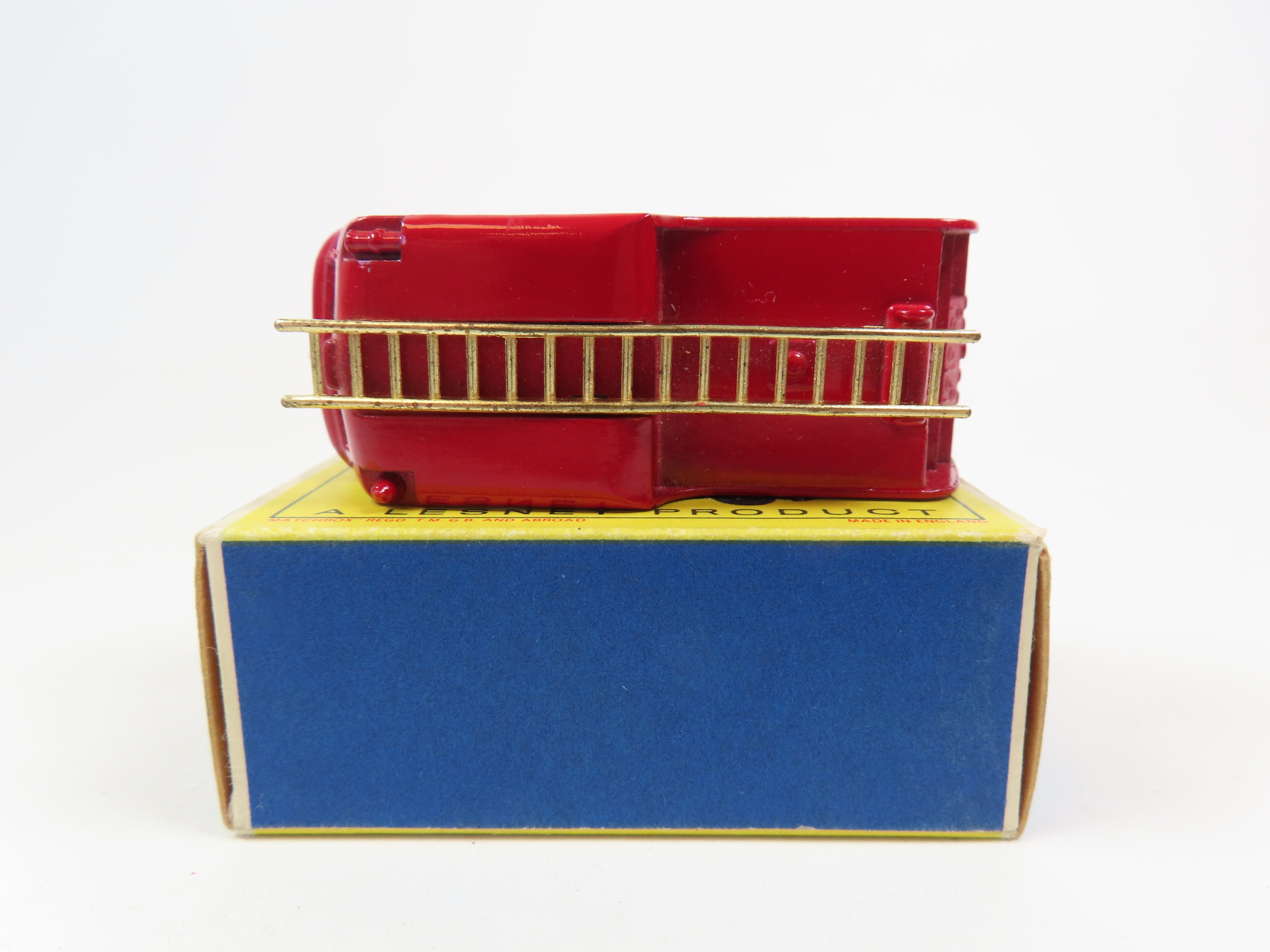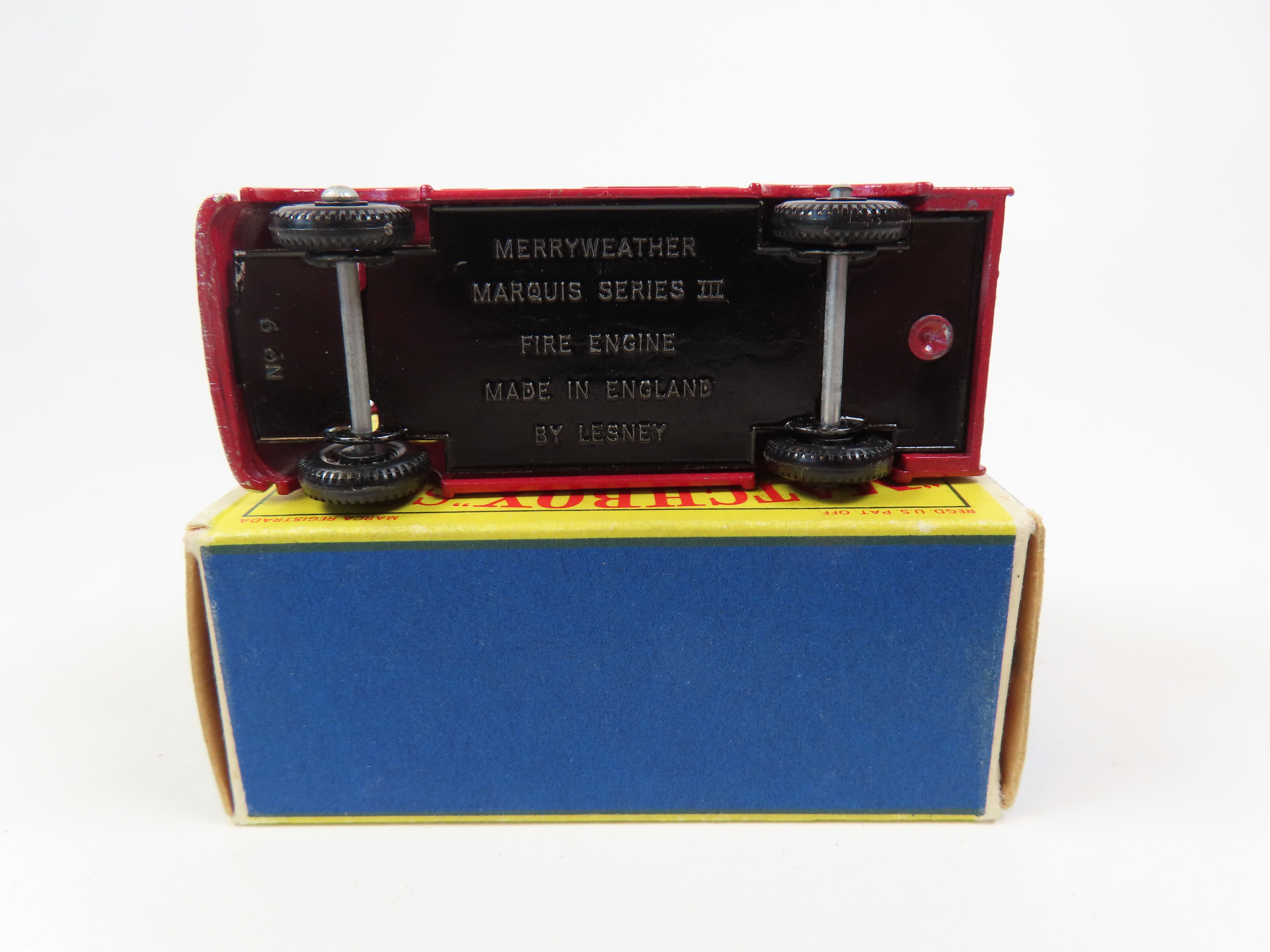 Matchbox No.9 Merryweather Marquis Fire Truck in red with gold ladder to the roof and black plastic wheels.