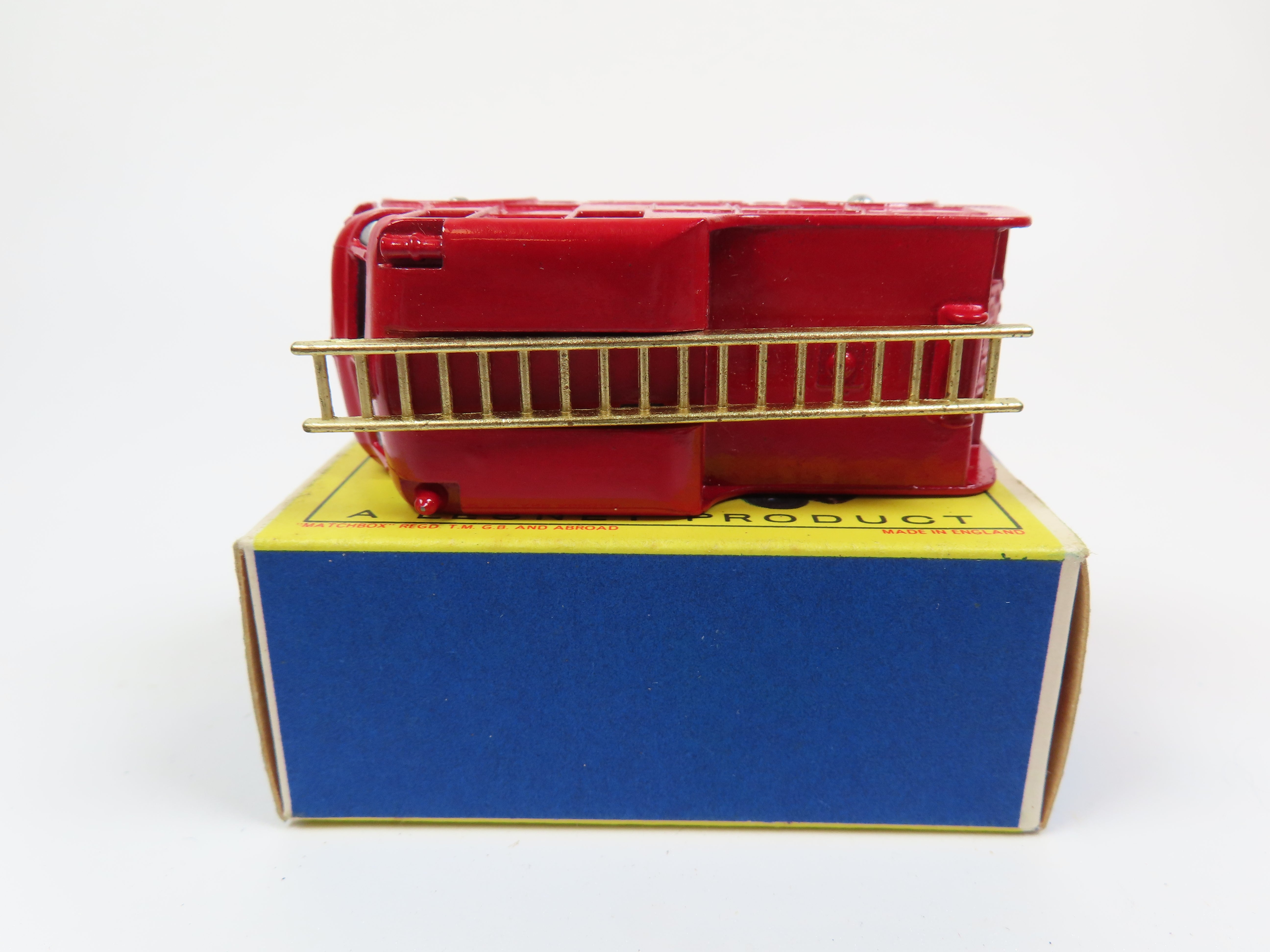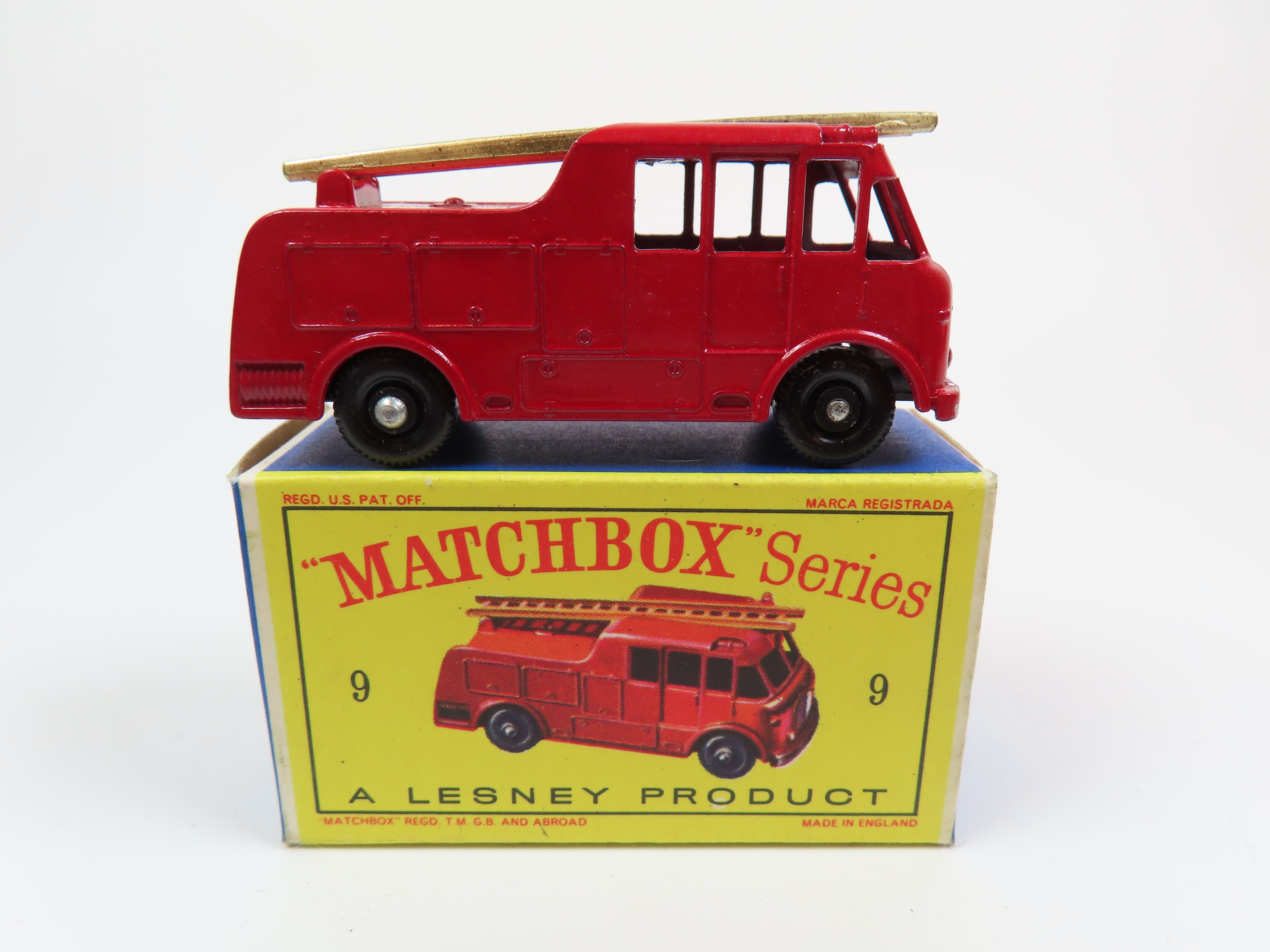 Matchbox No.9 Merryweather Fire Truck in bright red, with gold ladder to the roof and black plastic wheels.