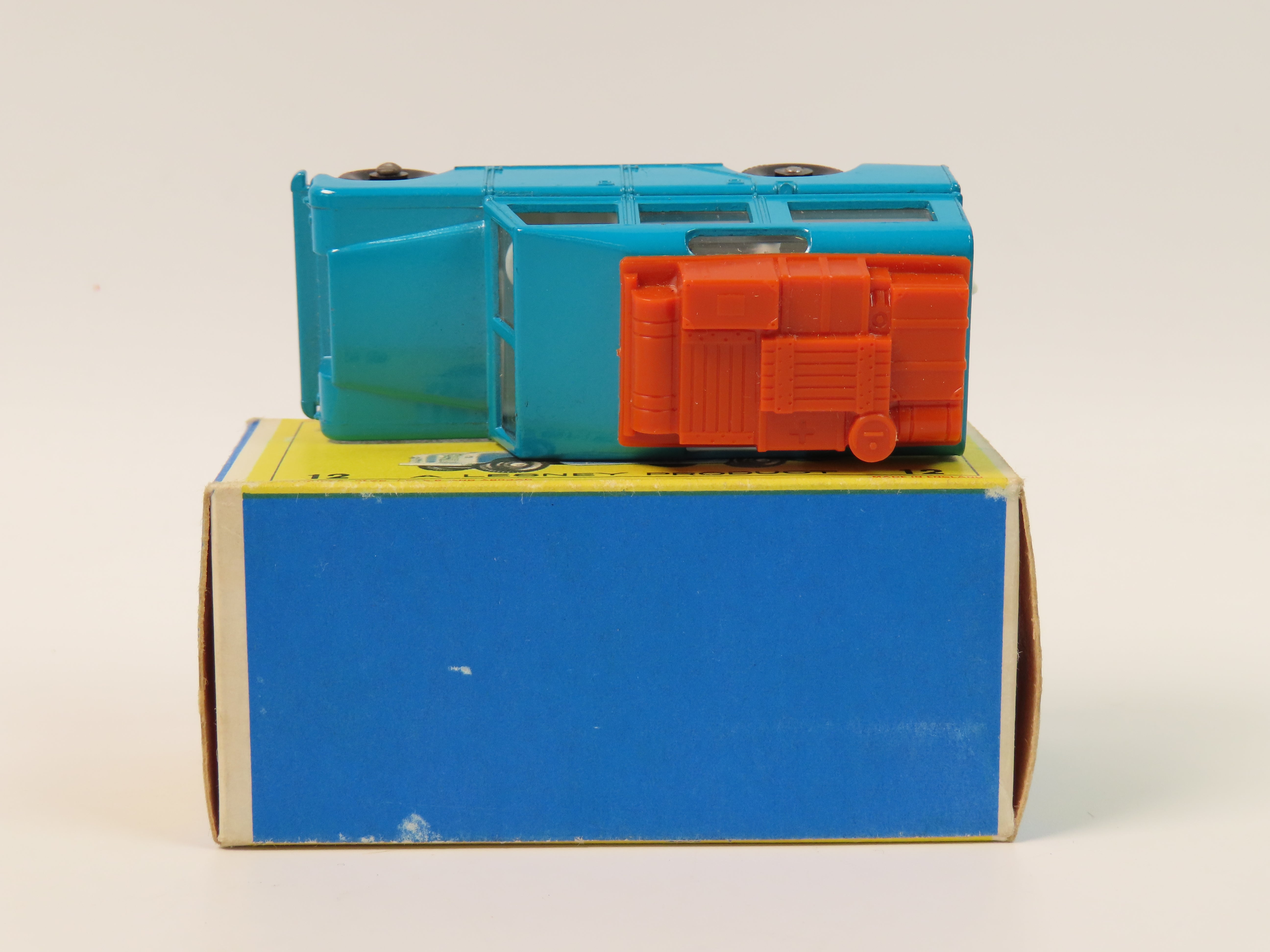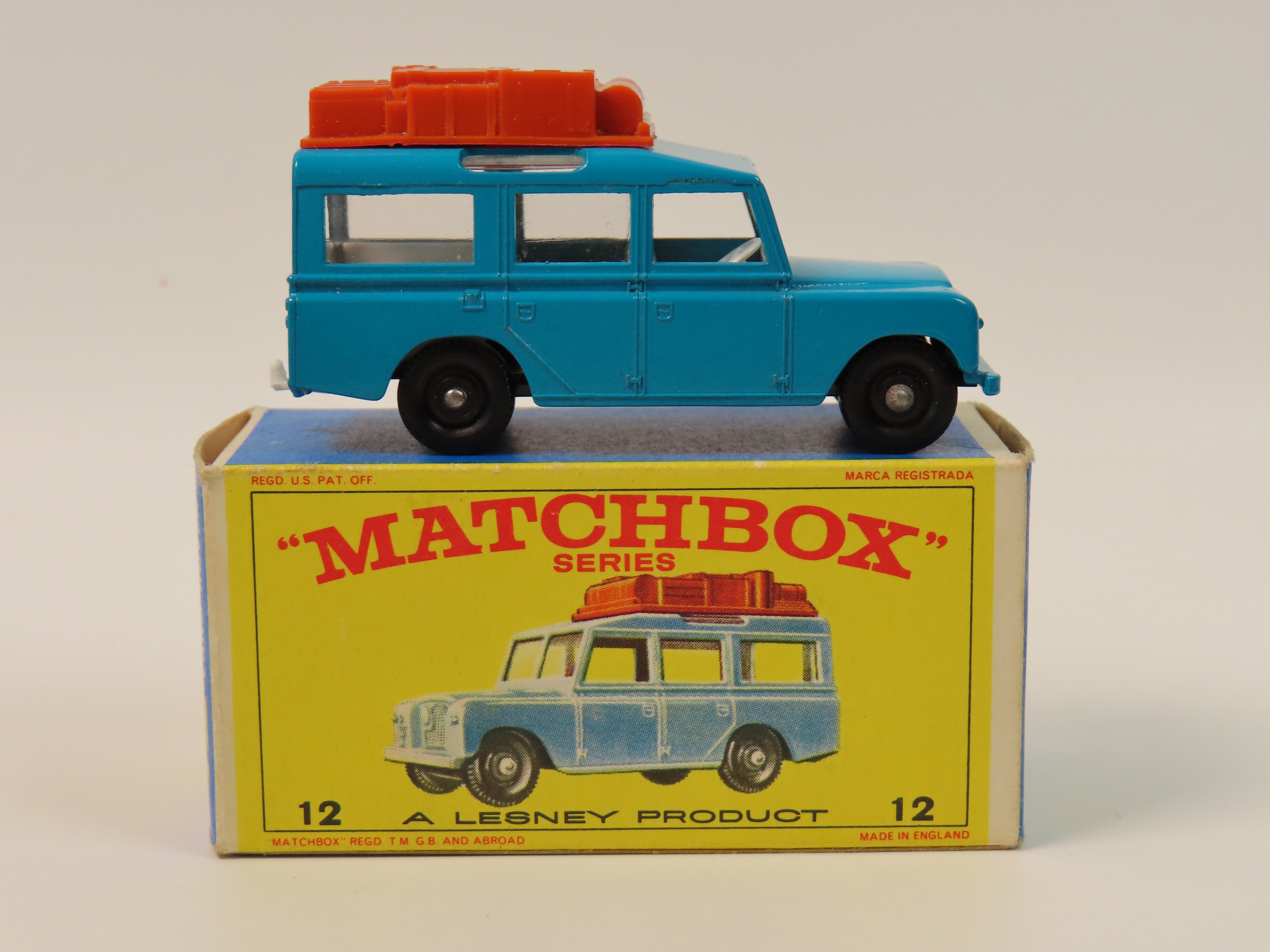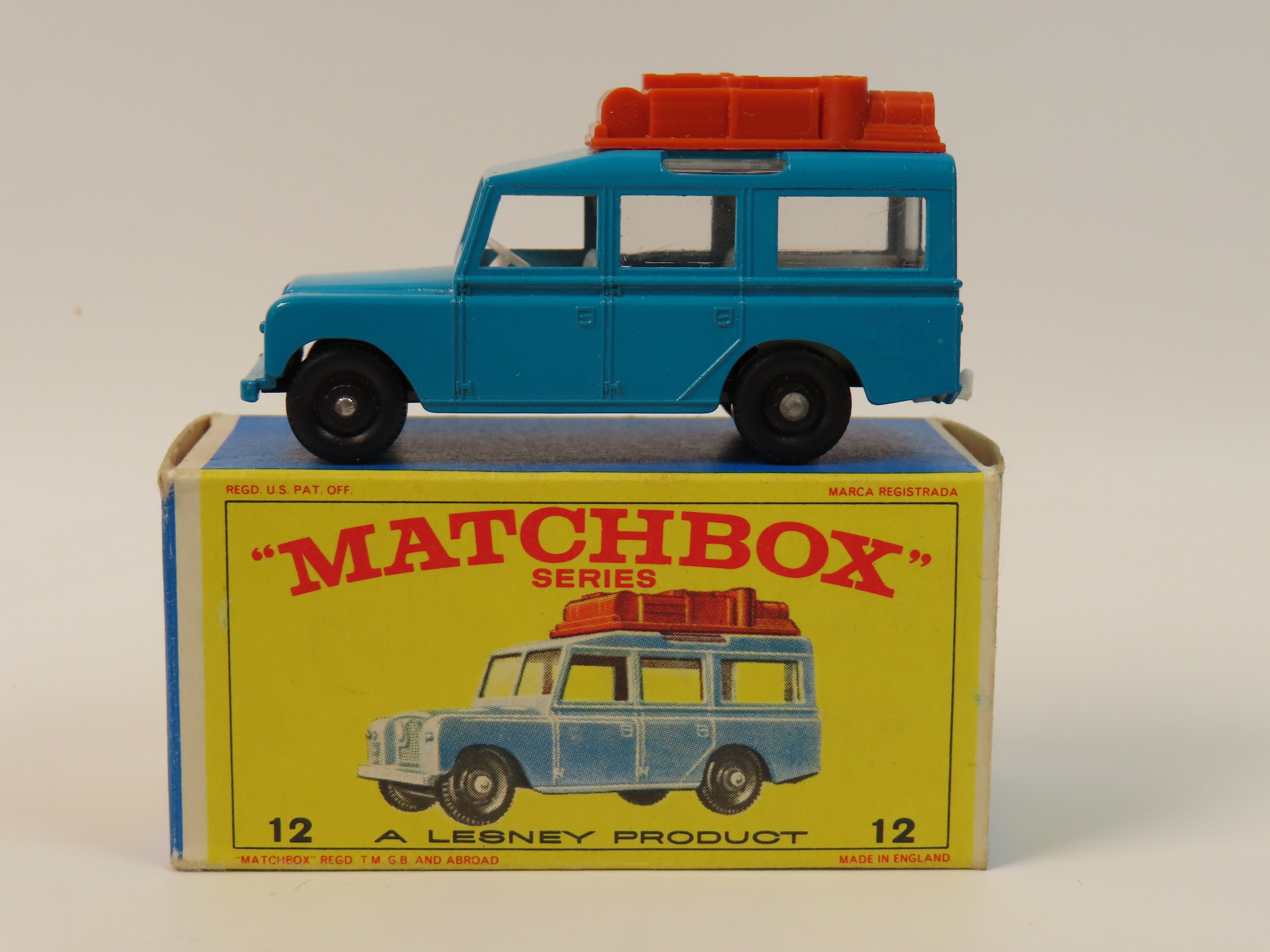 Matchbox Series No.12 Safari Land Rover in a lovely green/blue colour with brown plastic luggage to the roof and white interior.