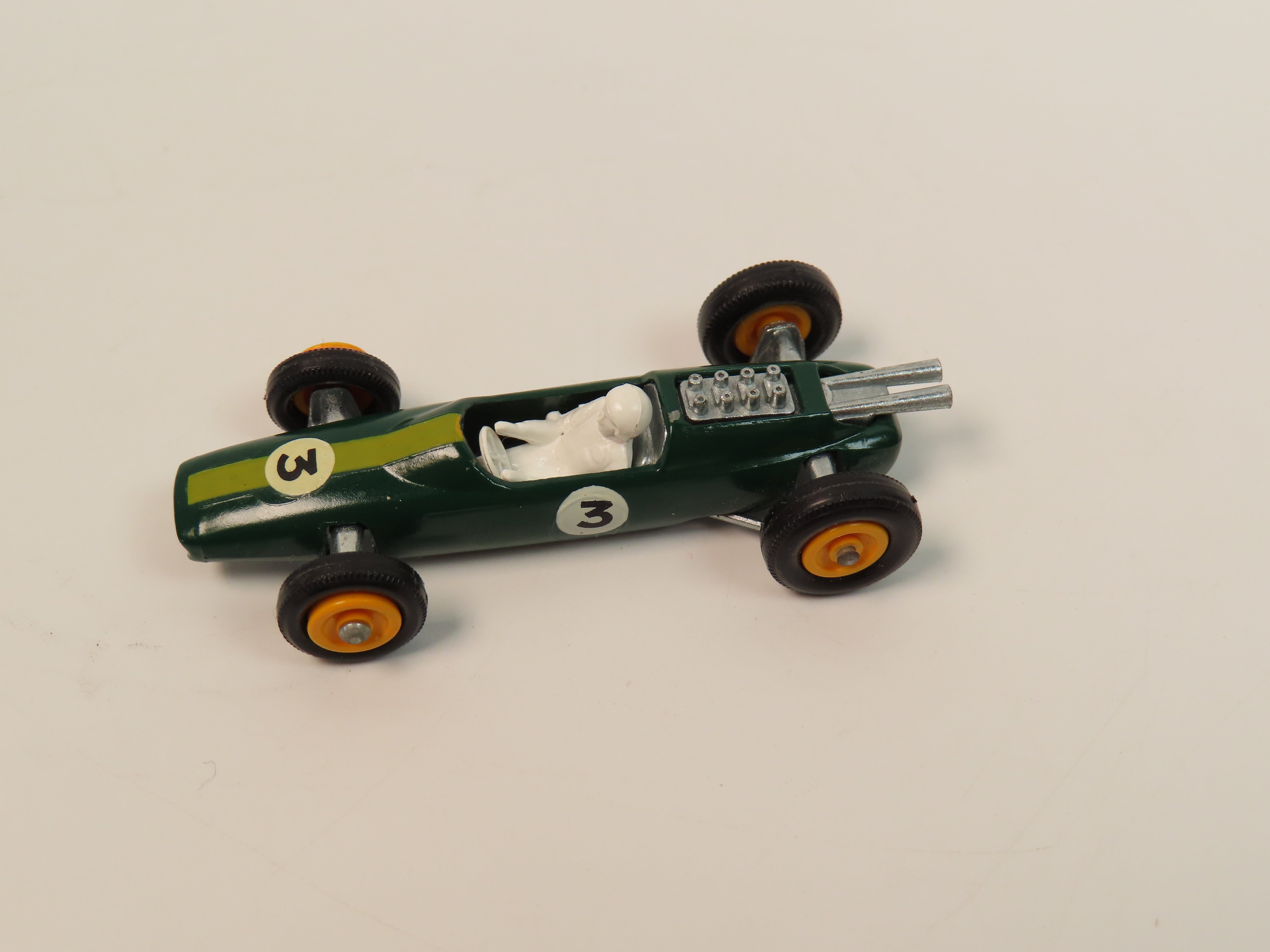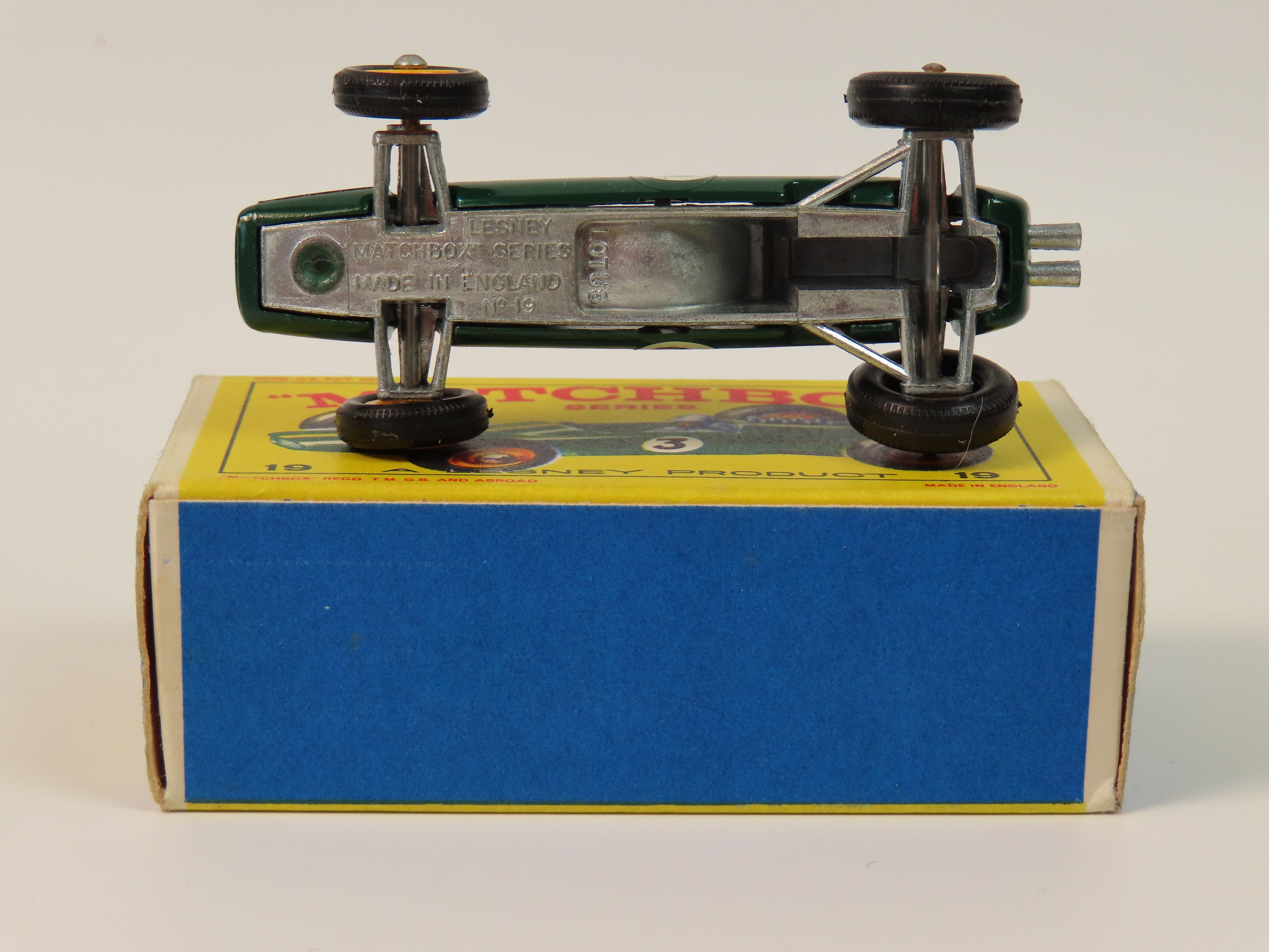 Matchbox Series No.19 Lotus Racing Car in dark green, with light green racing stripe and '3' decals.