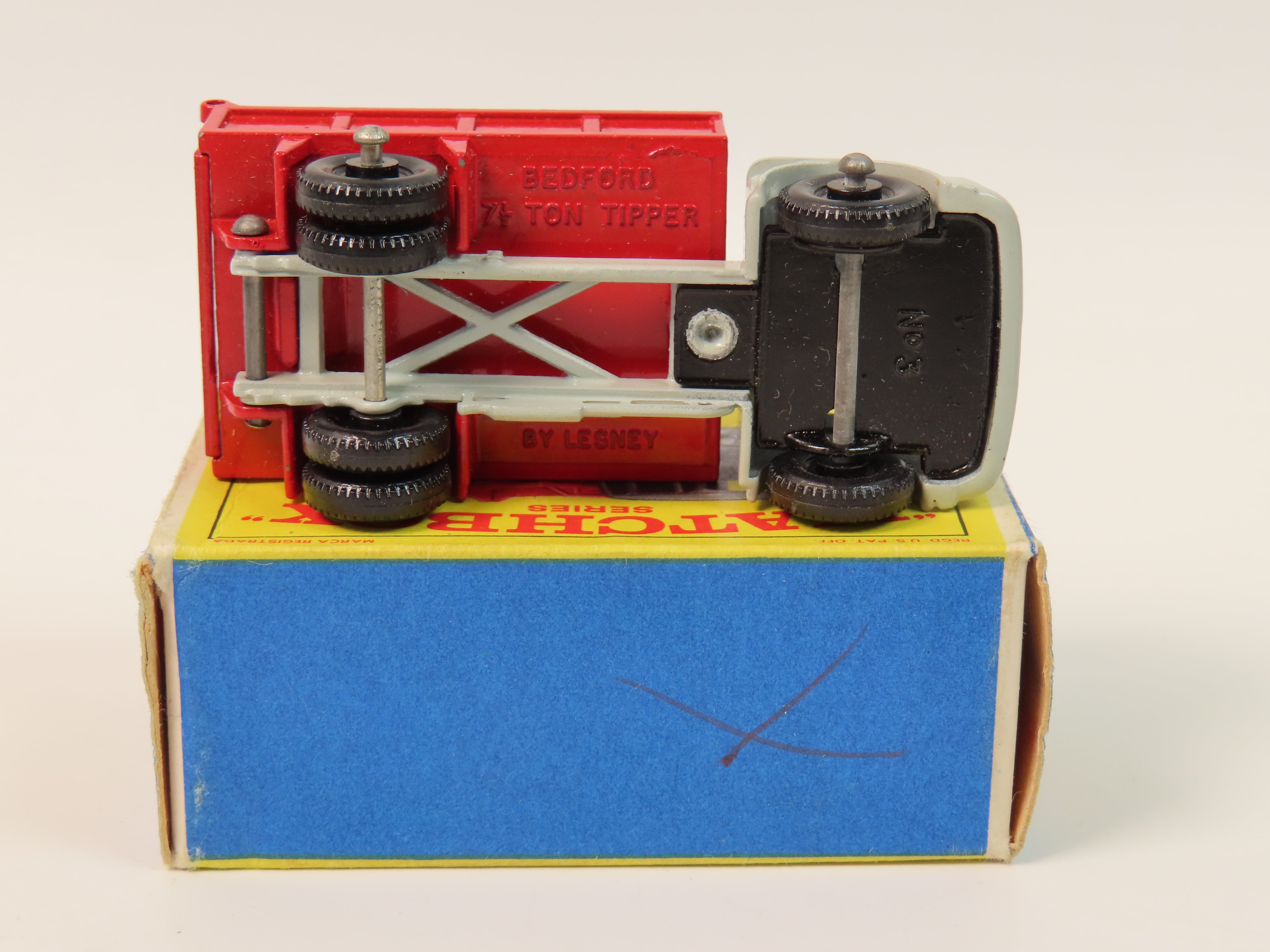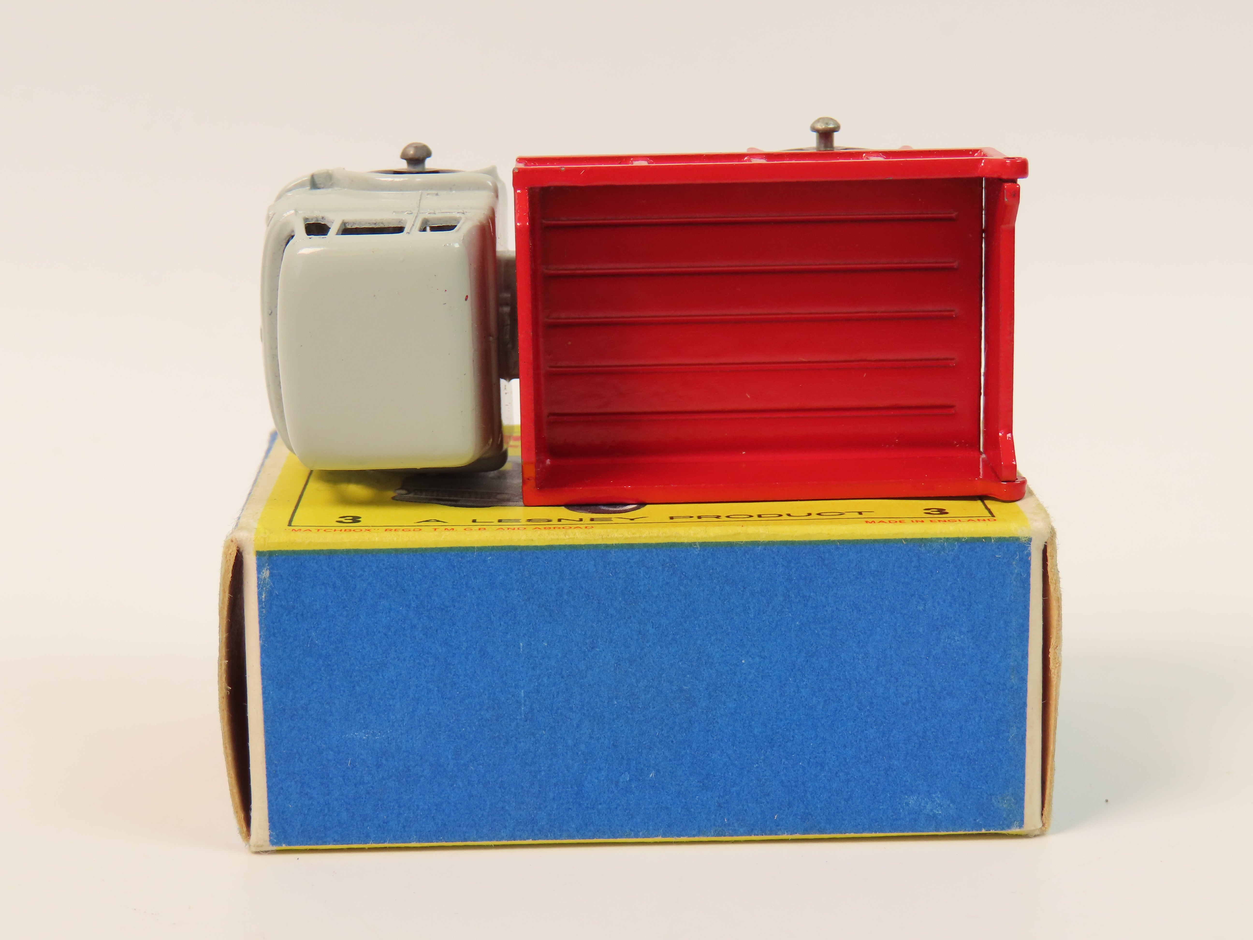 Matchbox Series No.3 Bedford Tipper Truck with a grey cab and chassis and red tipper.