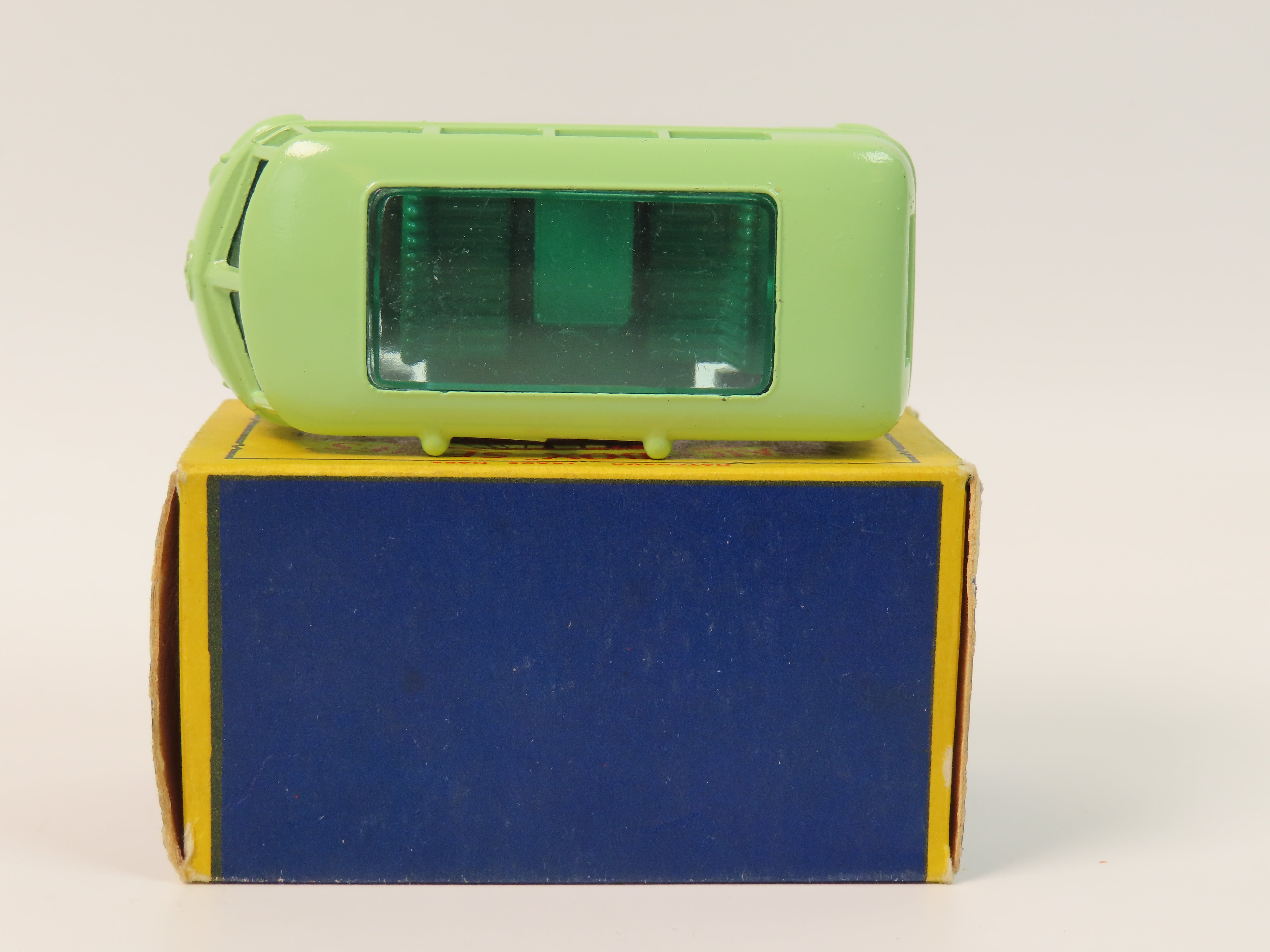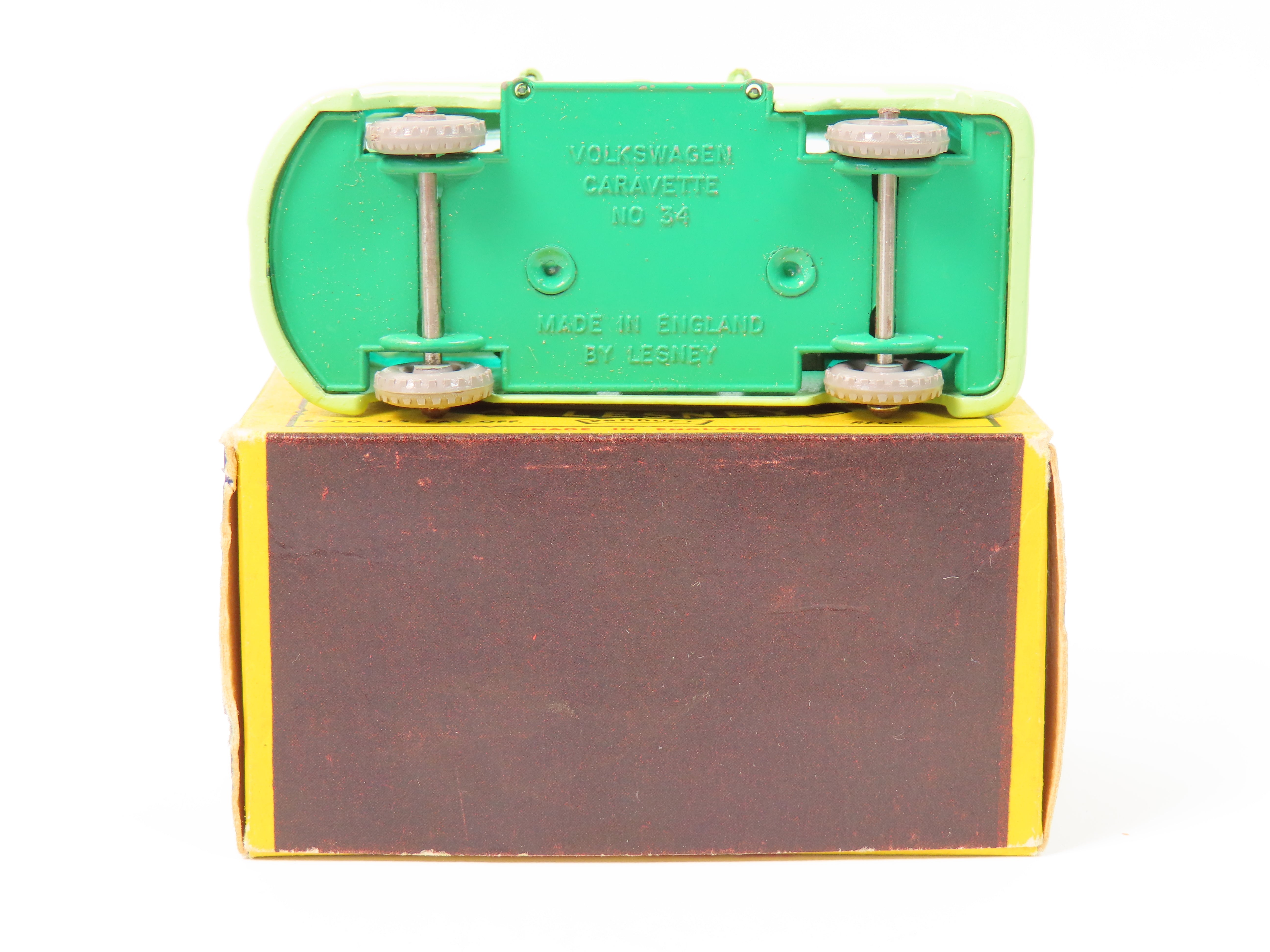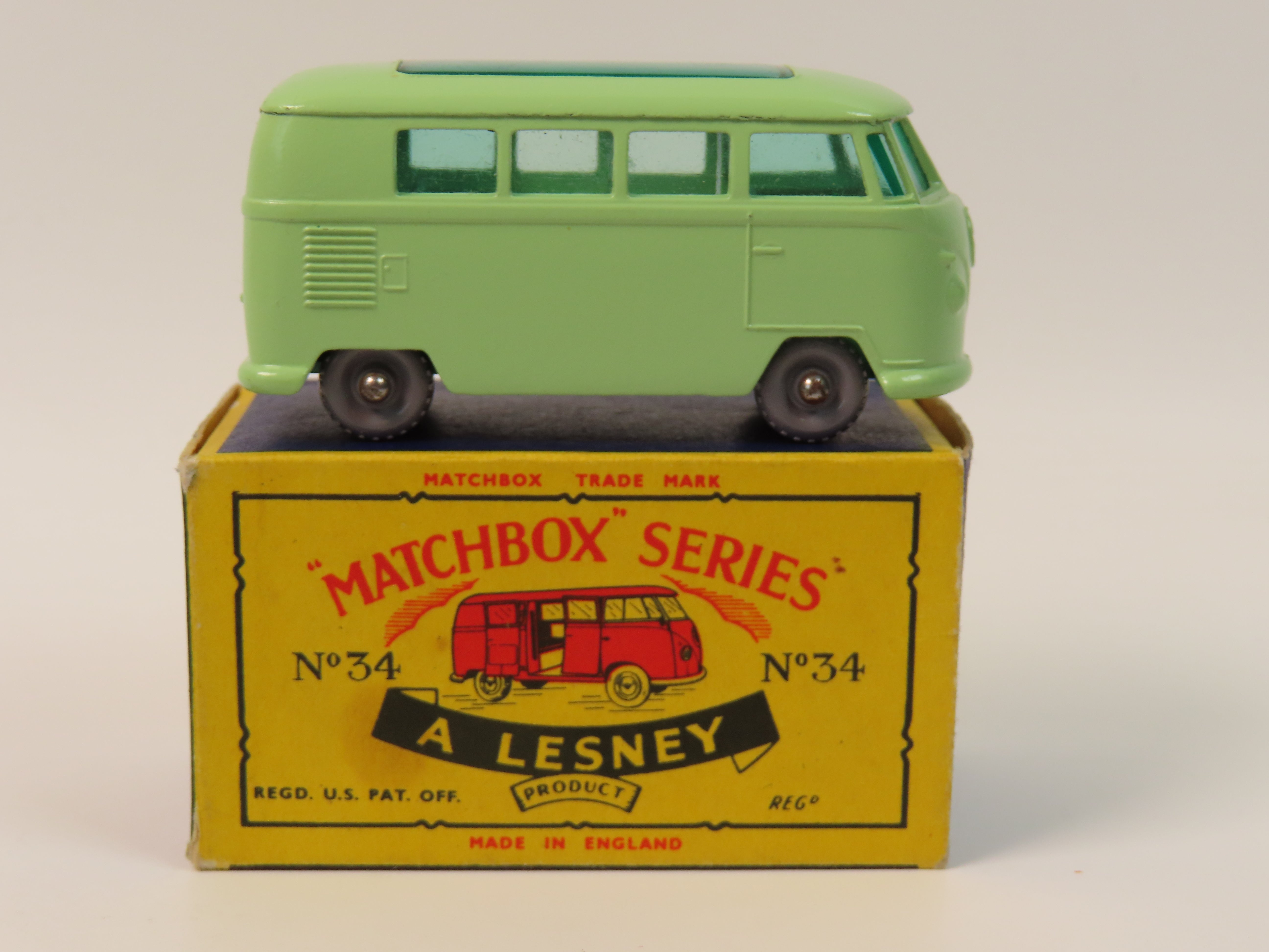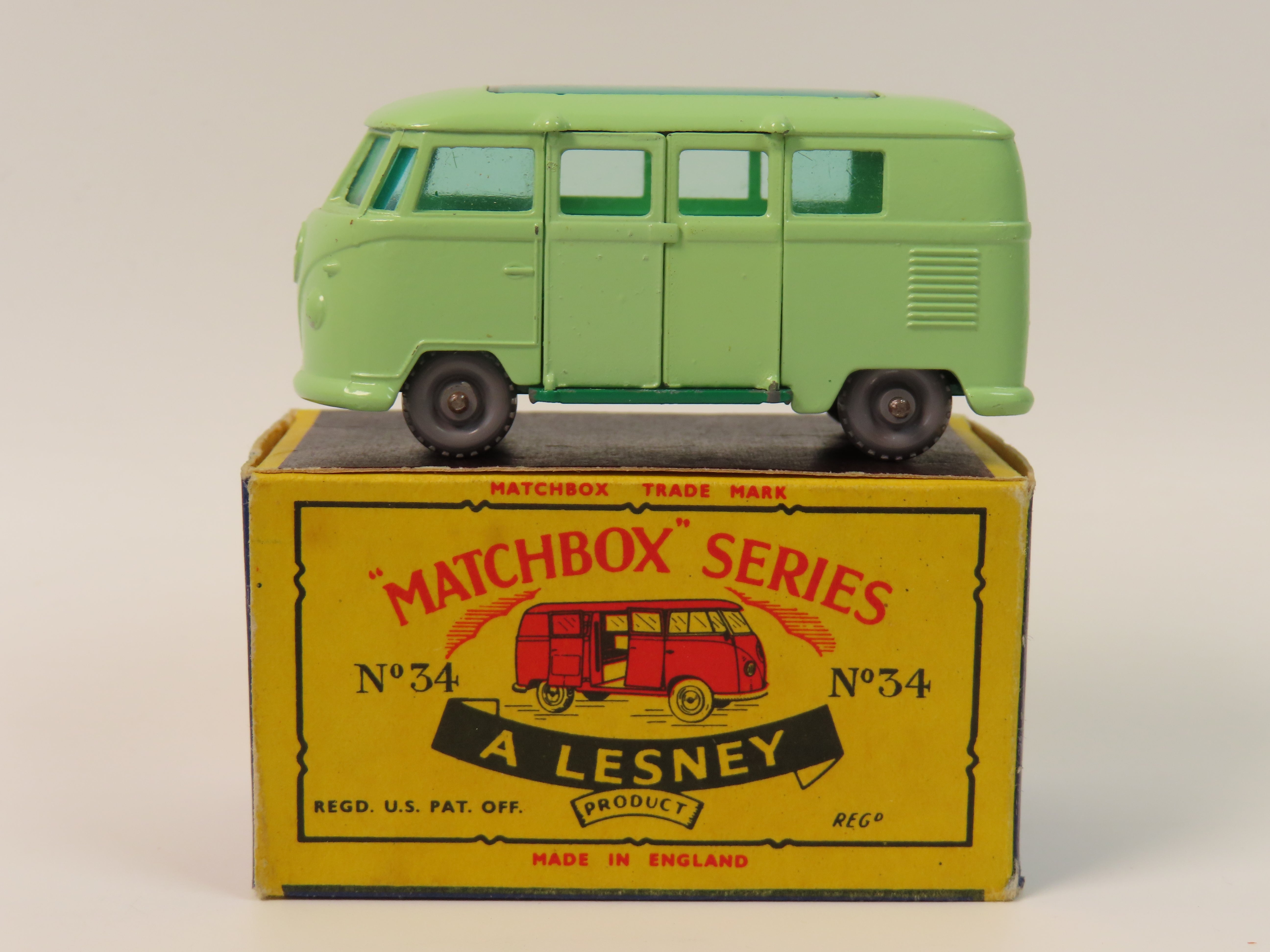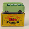 Matchbox Series No.34 Volkswagen Camping Car in light green with dark green base and green tinted windows. Grey plastic wheels.