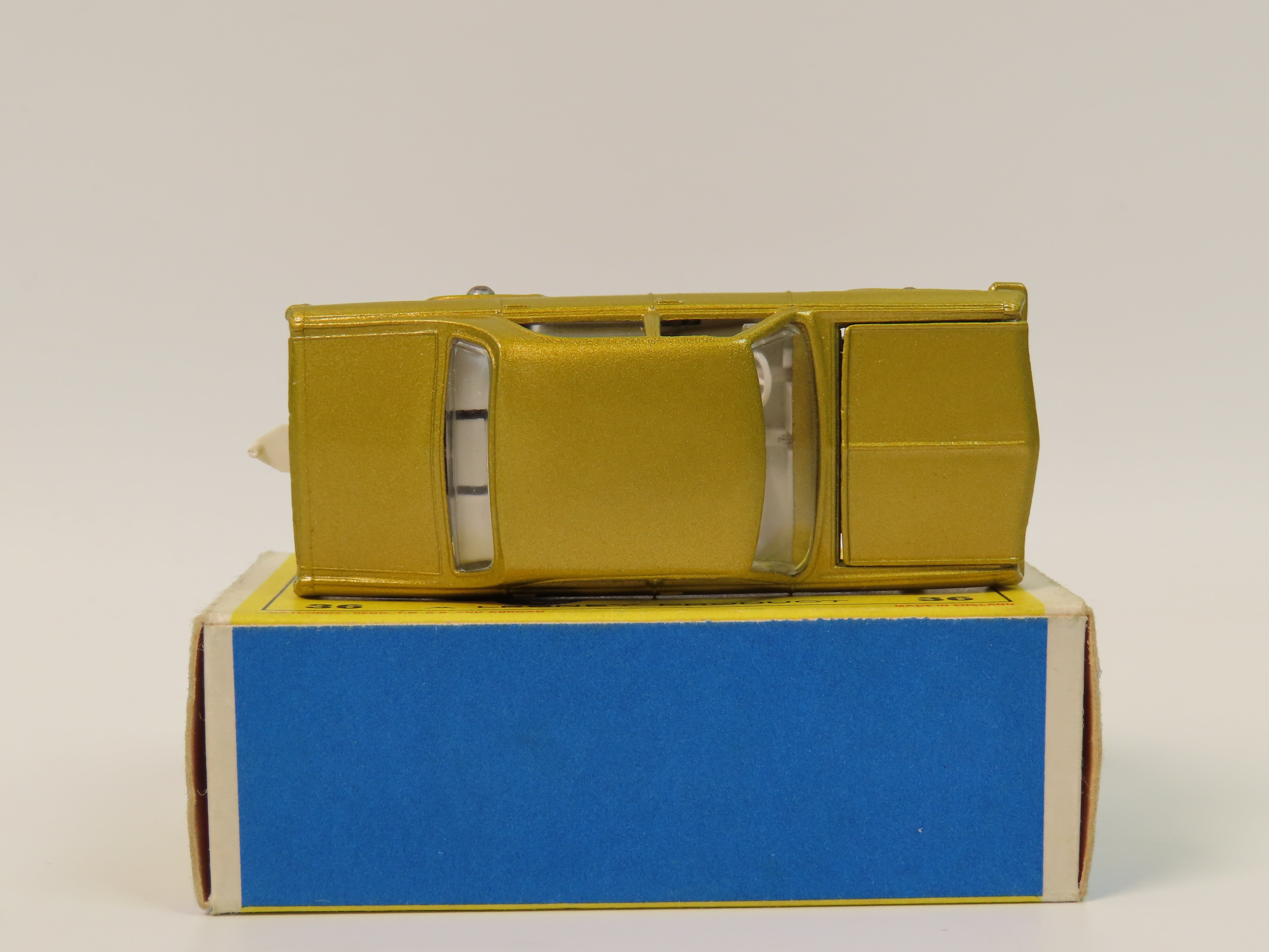 Matchbox Series No.36 Opel Diplomat in metallic gold, with a white interior and plastic tow hook.