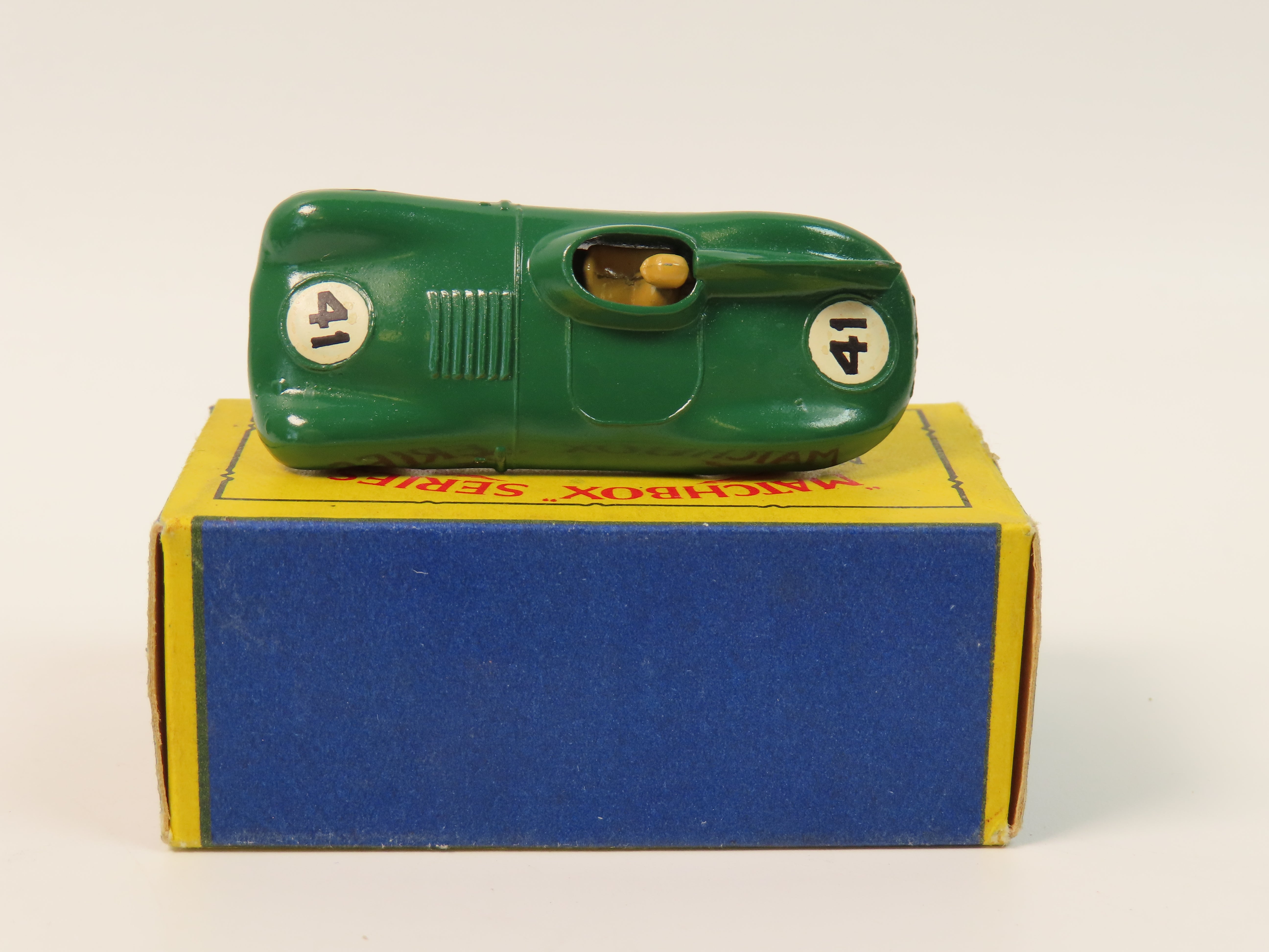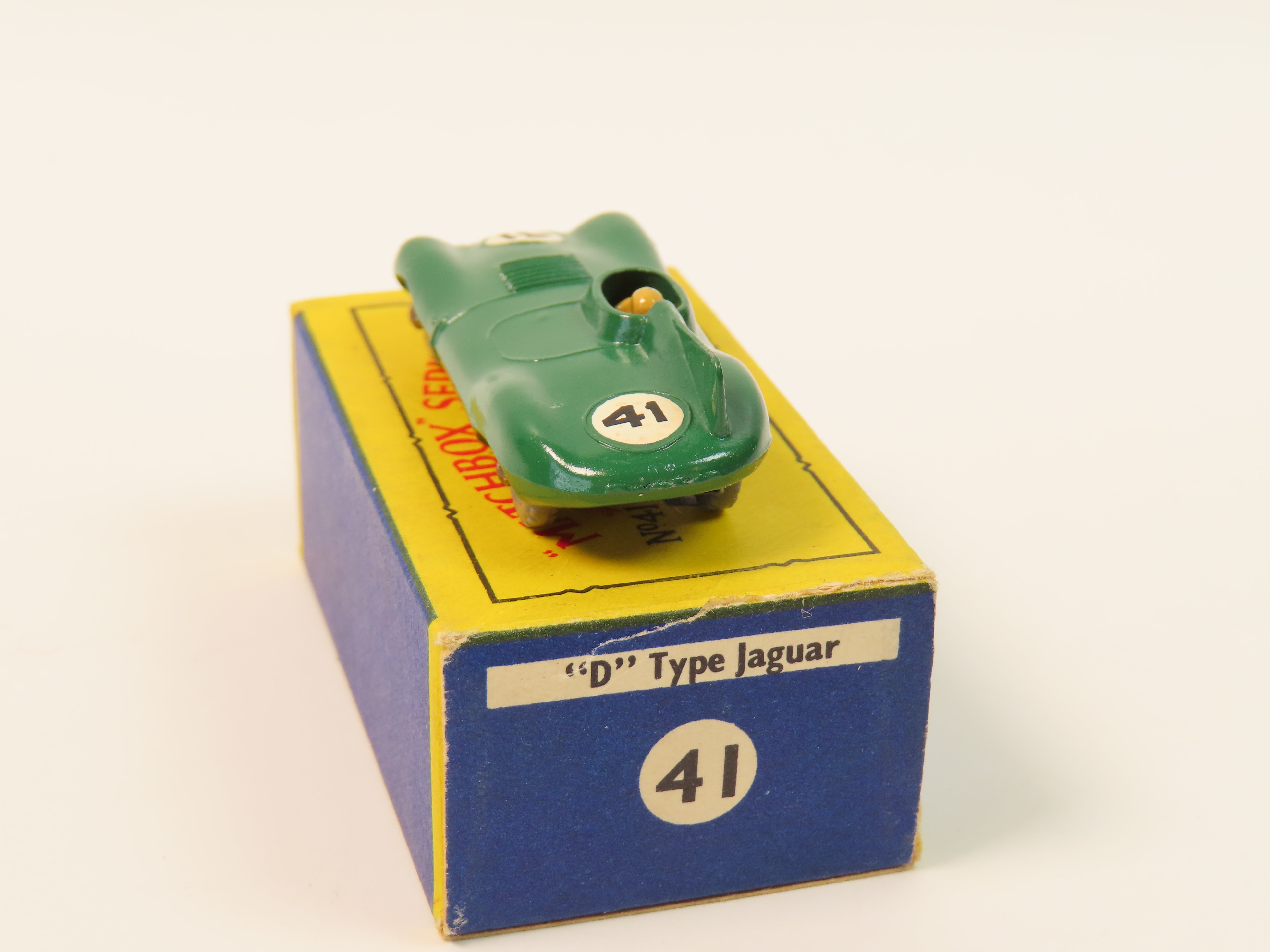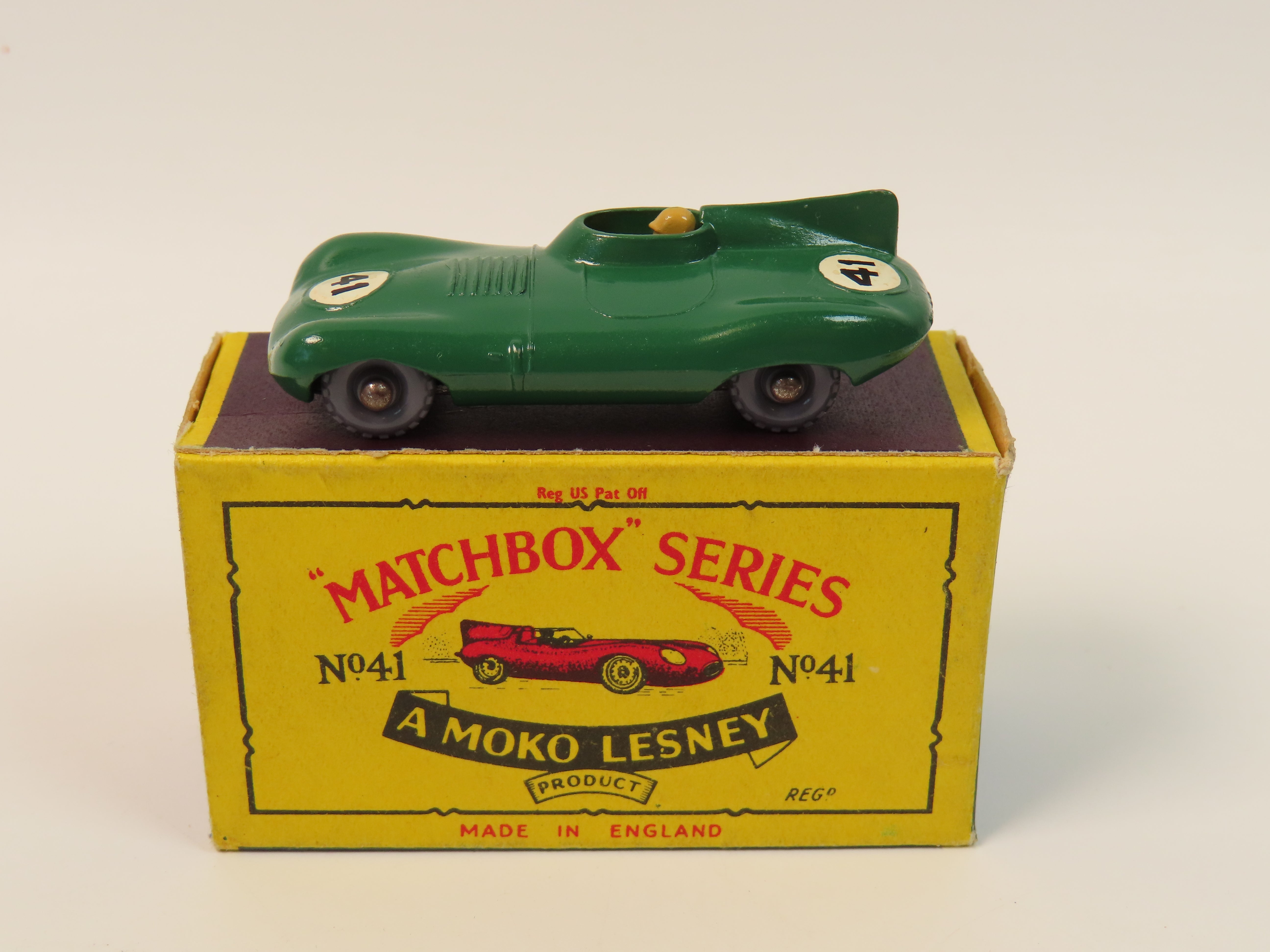 Matchbox Series No.41a "D" Type Jaguar in green with tan driver figure and '41' decals to the front and rear. Grey plastic wheels. This model is really hard to find, it's the first version (54mm) with Grey plastic wheels, only had a very short run. Also comes in the slightly bigger box with the number in a white circle.