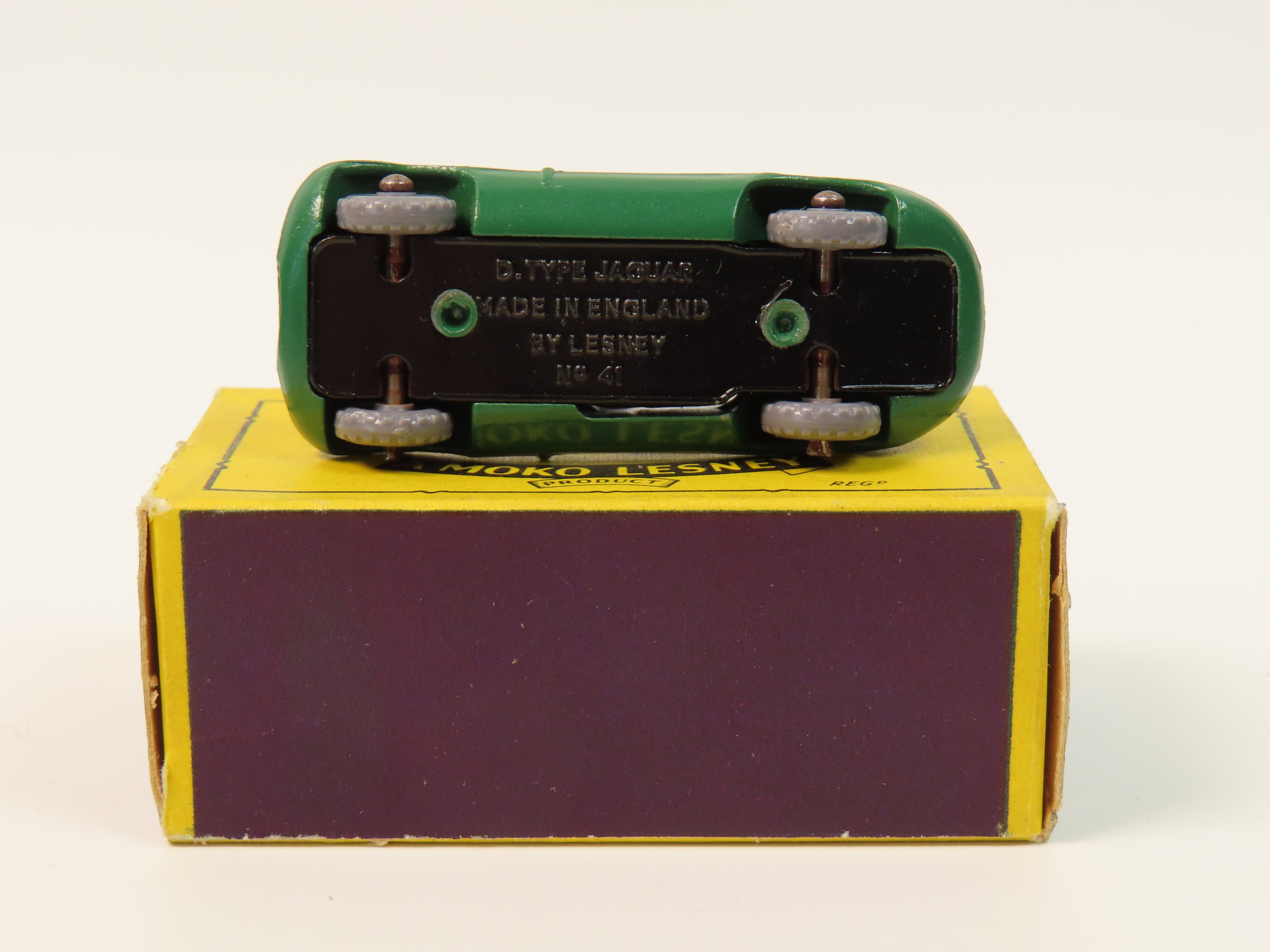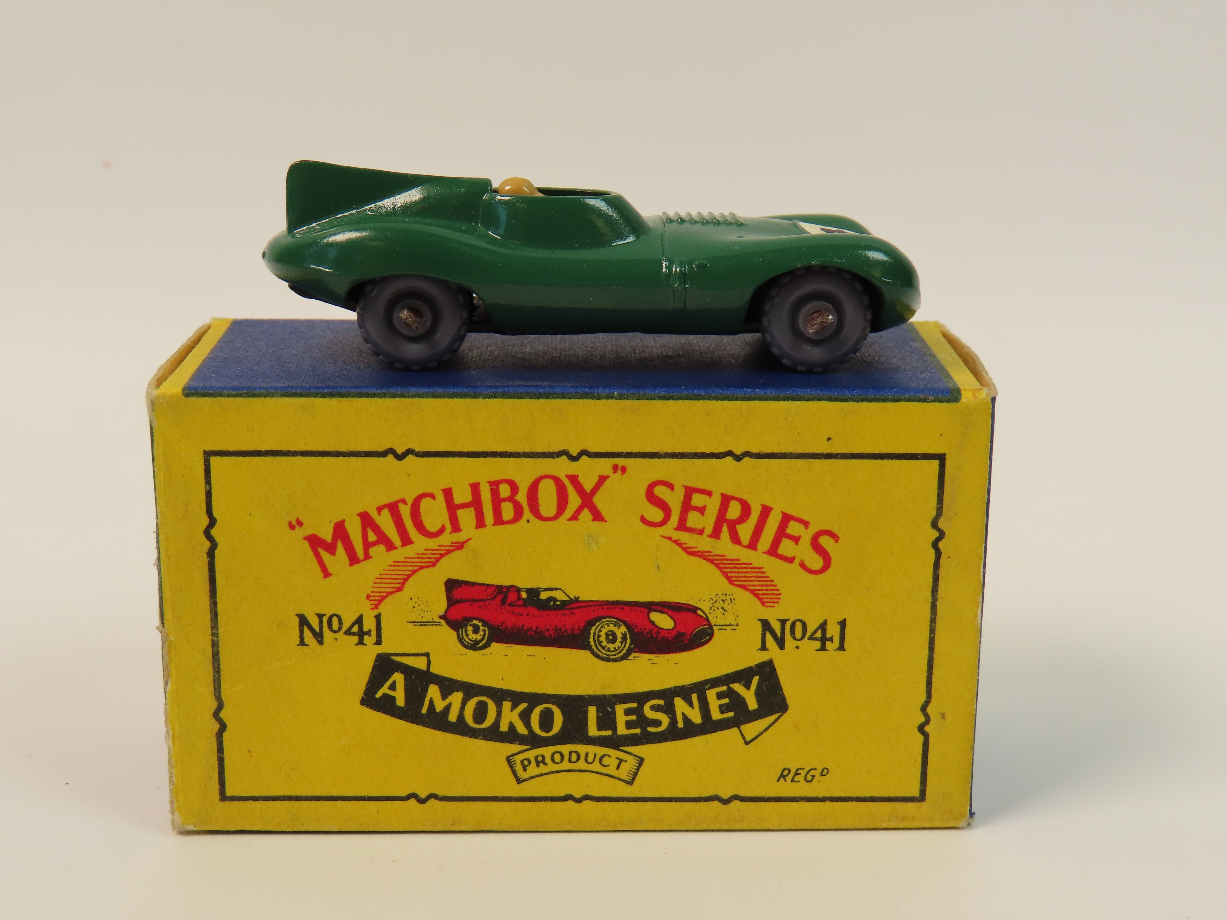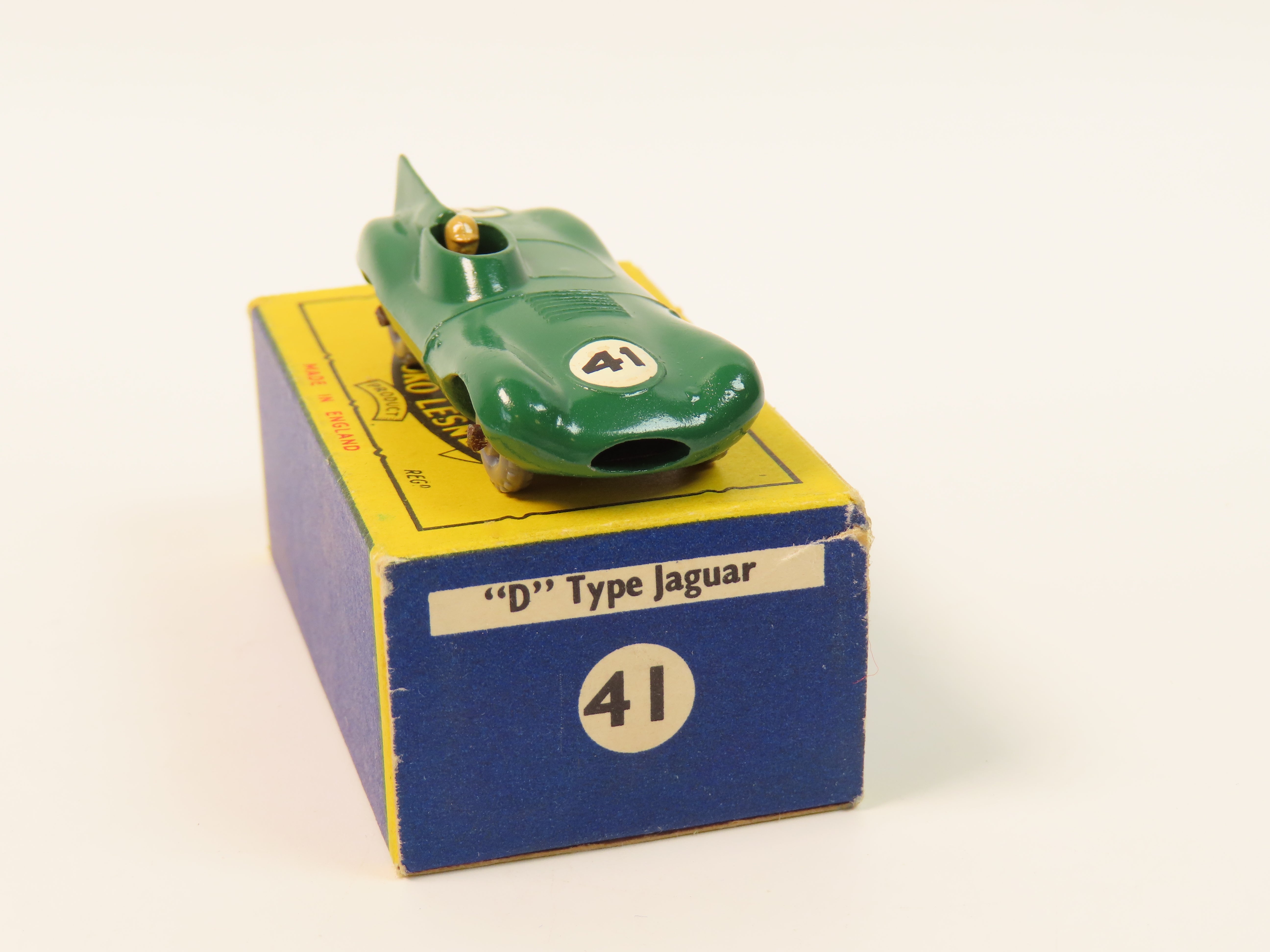 Matchbox Series No.41a "D" Type Jaguar in green with tan driver figure and '41' decals to the front and rear. Grey plastic wheels. This model is really hard to find, it's the first version (54mm) with Grey plastic wheels, only had a very short run. Also comes in the slightly bigger box with the number in a white circle.