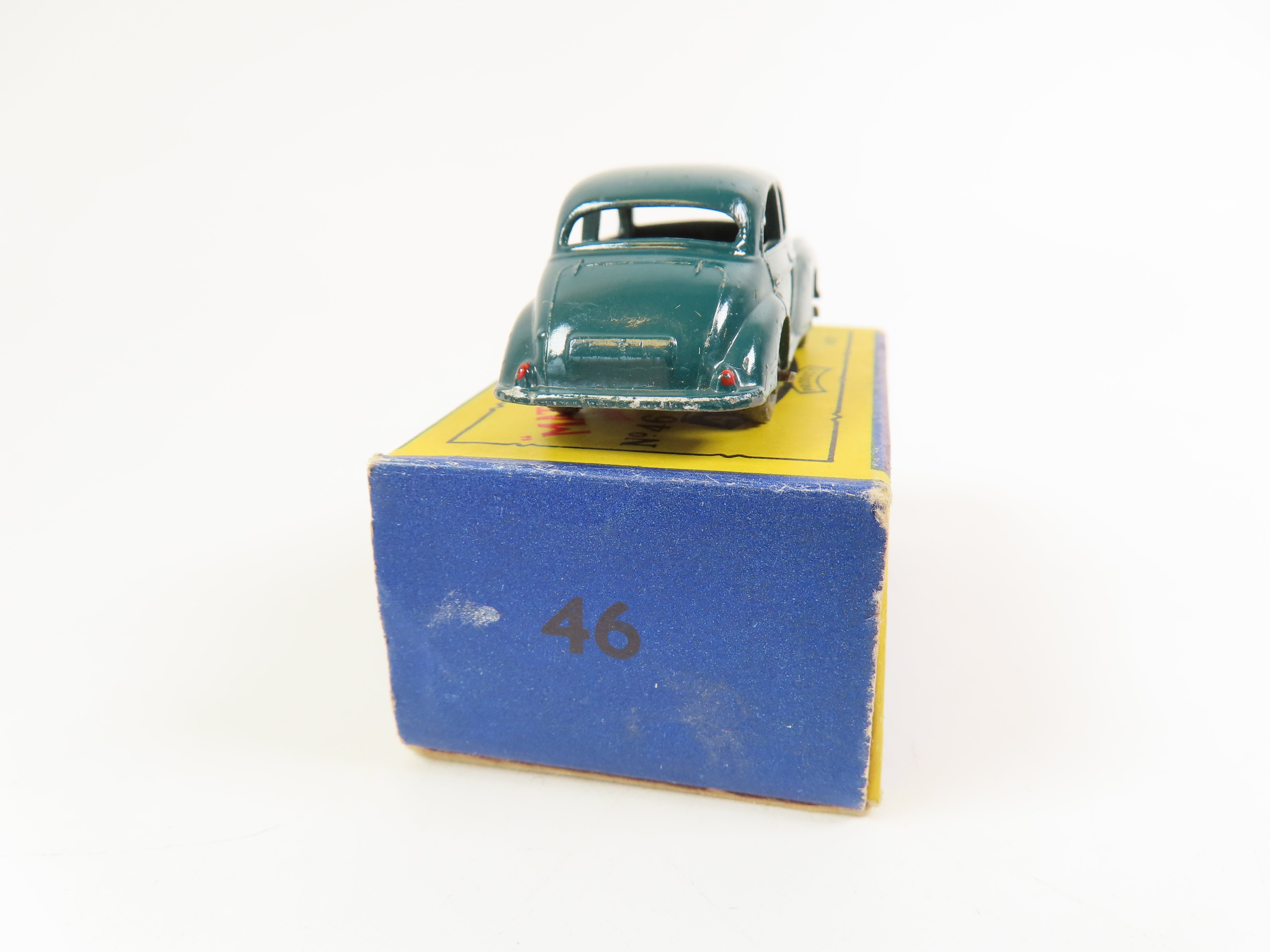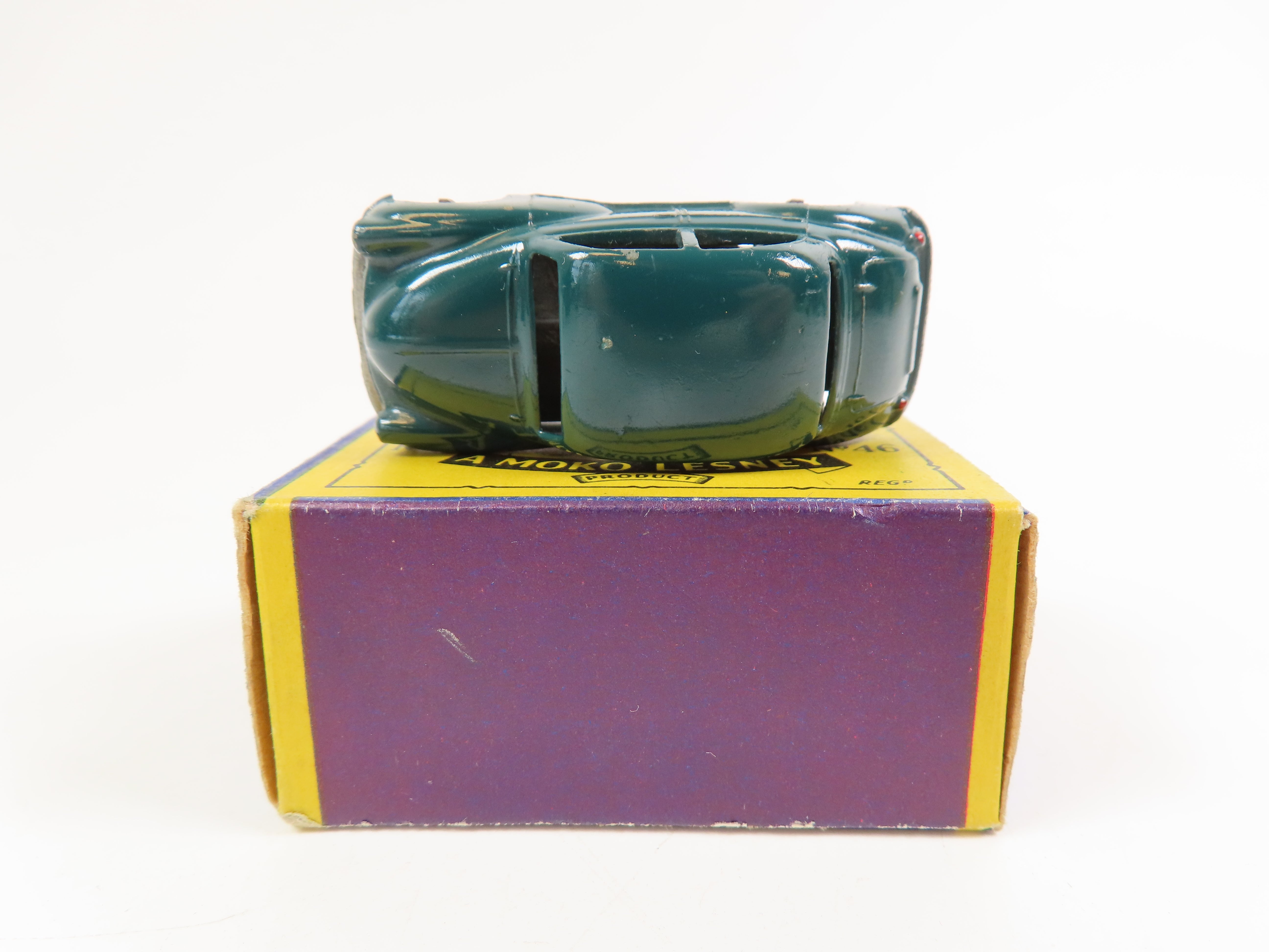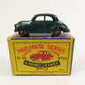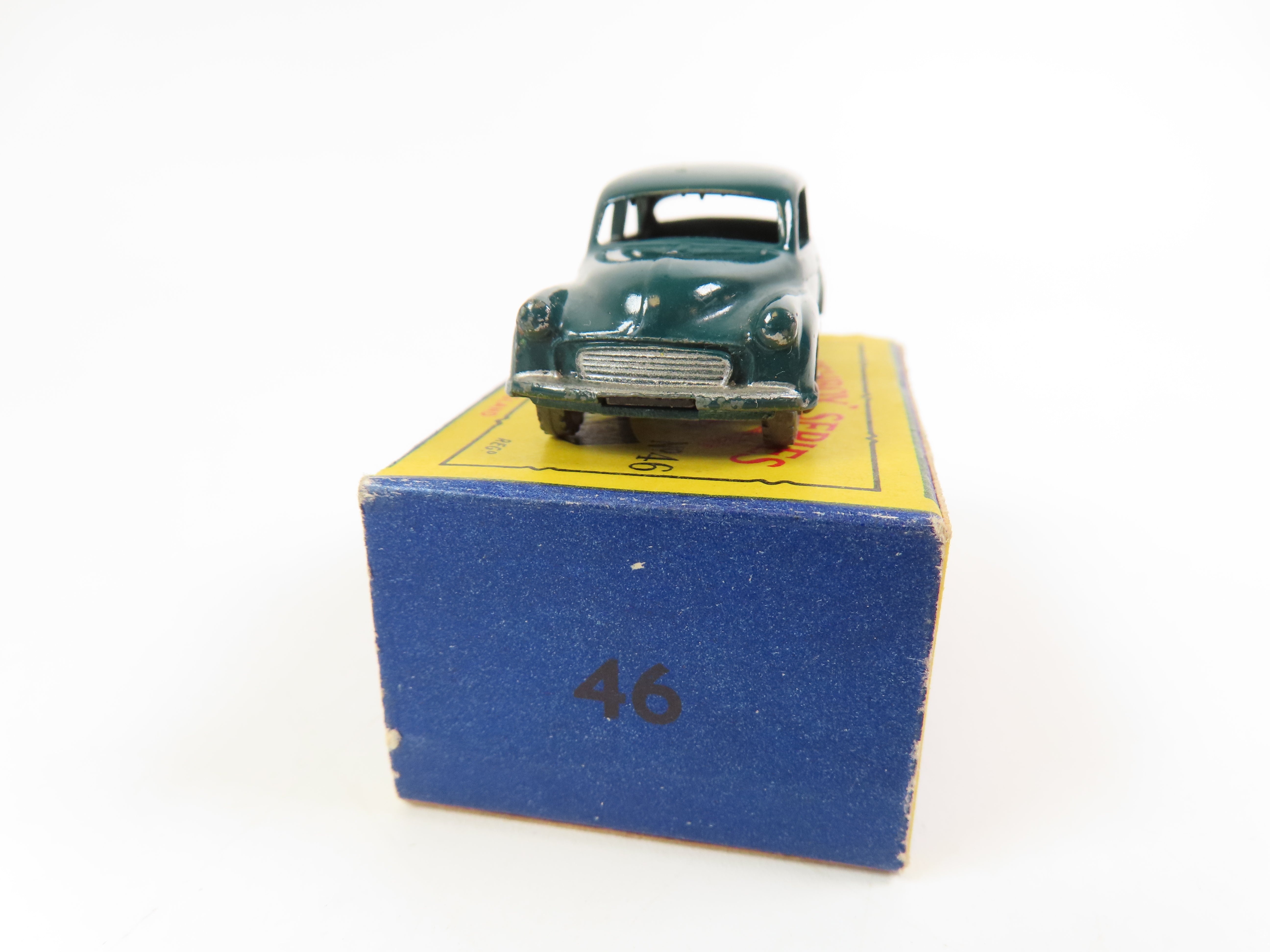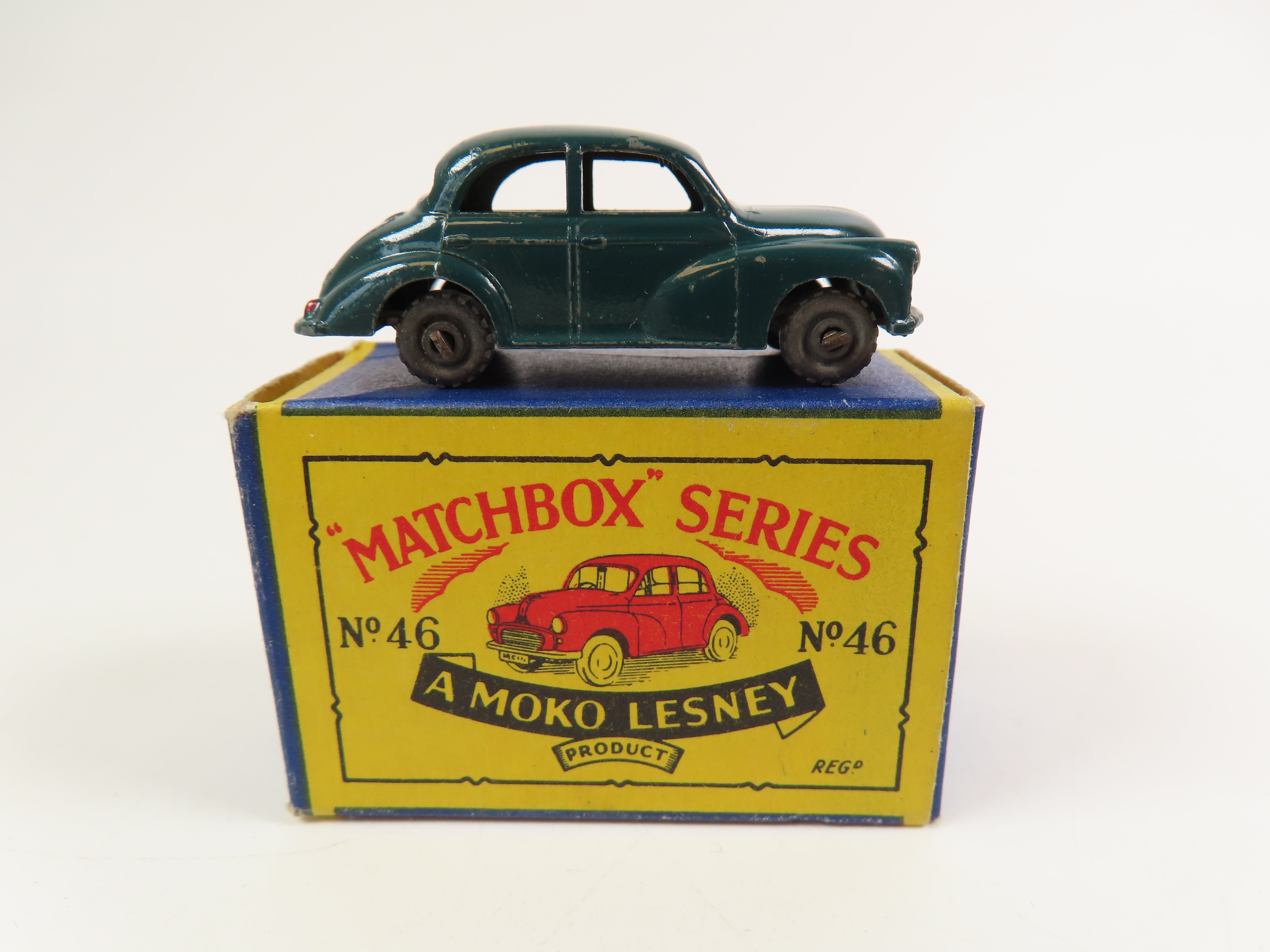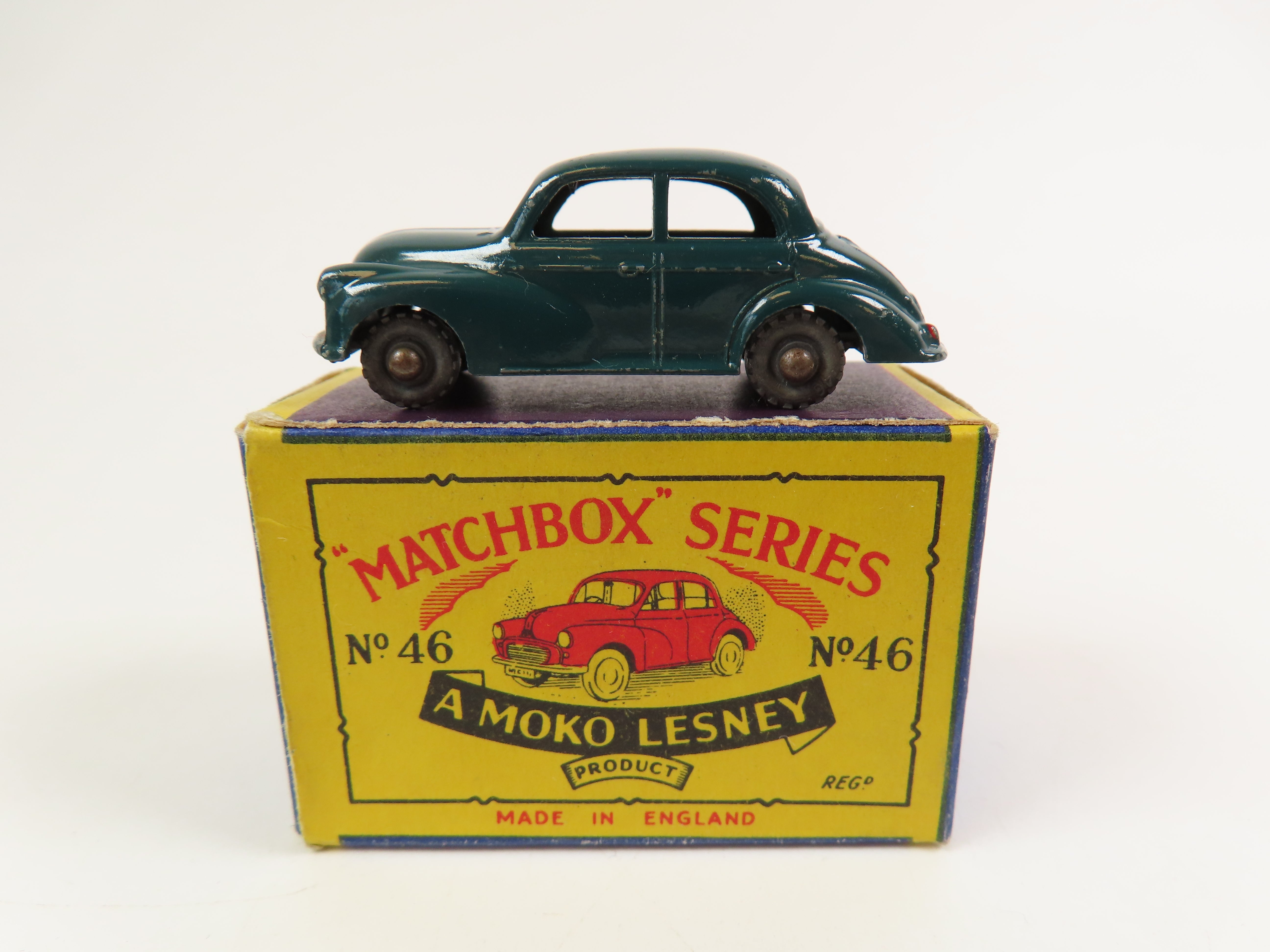 Matchbox Series No.46 Morris Minor 1000 in dark green with silver painted grille and metal wheels.