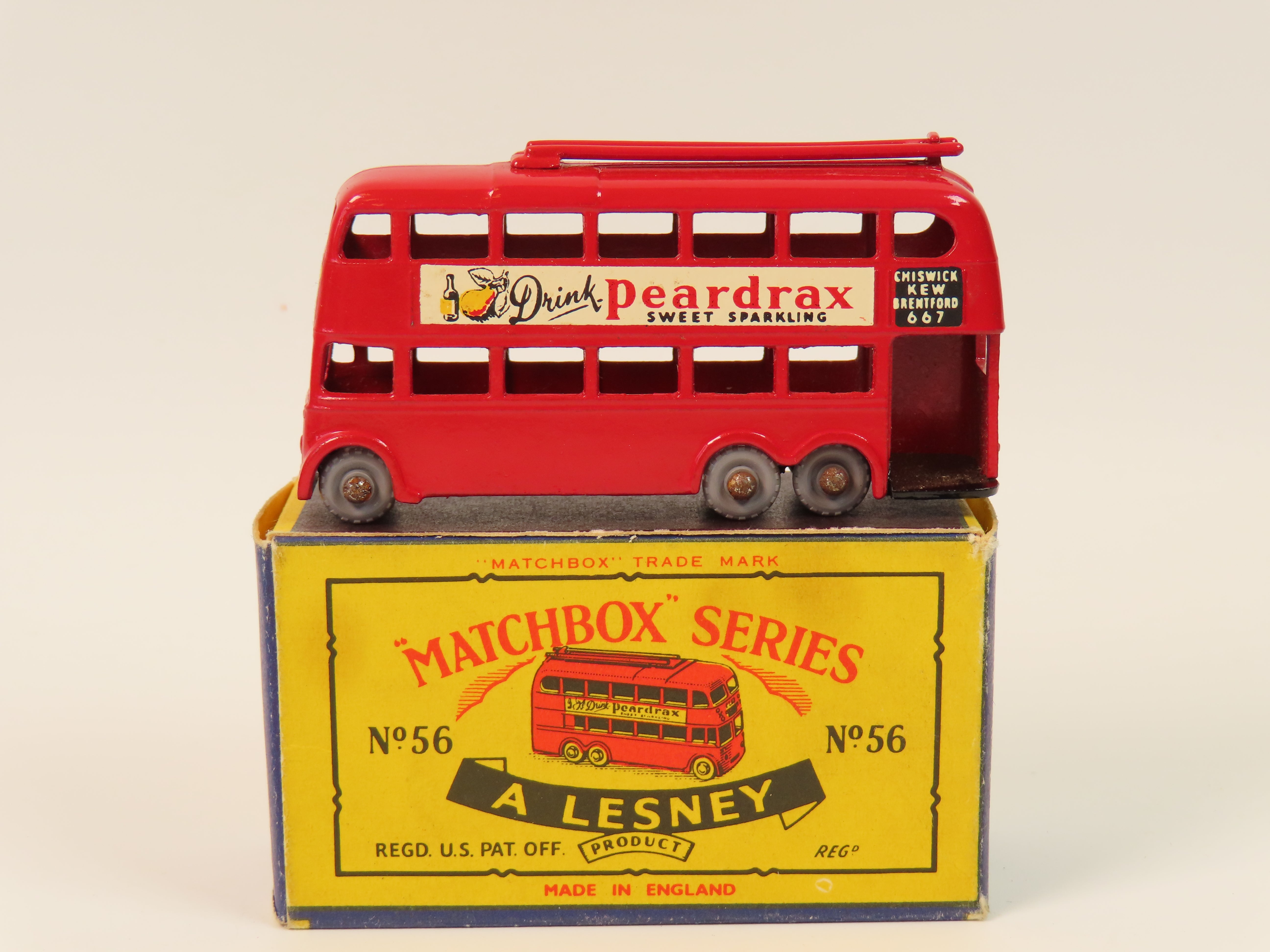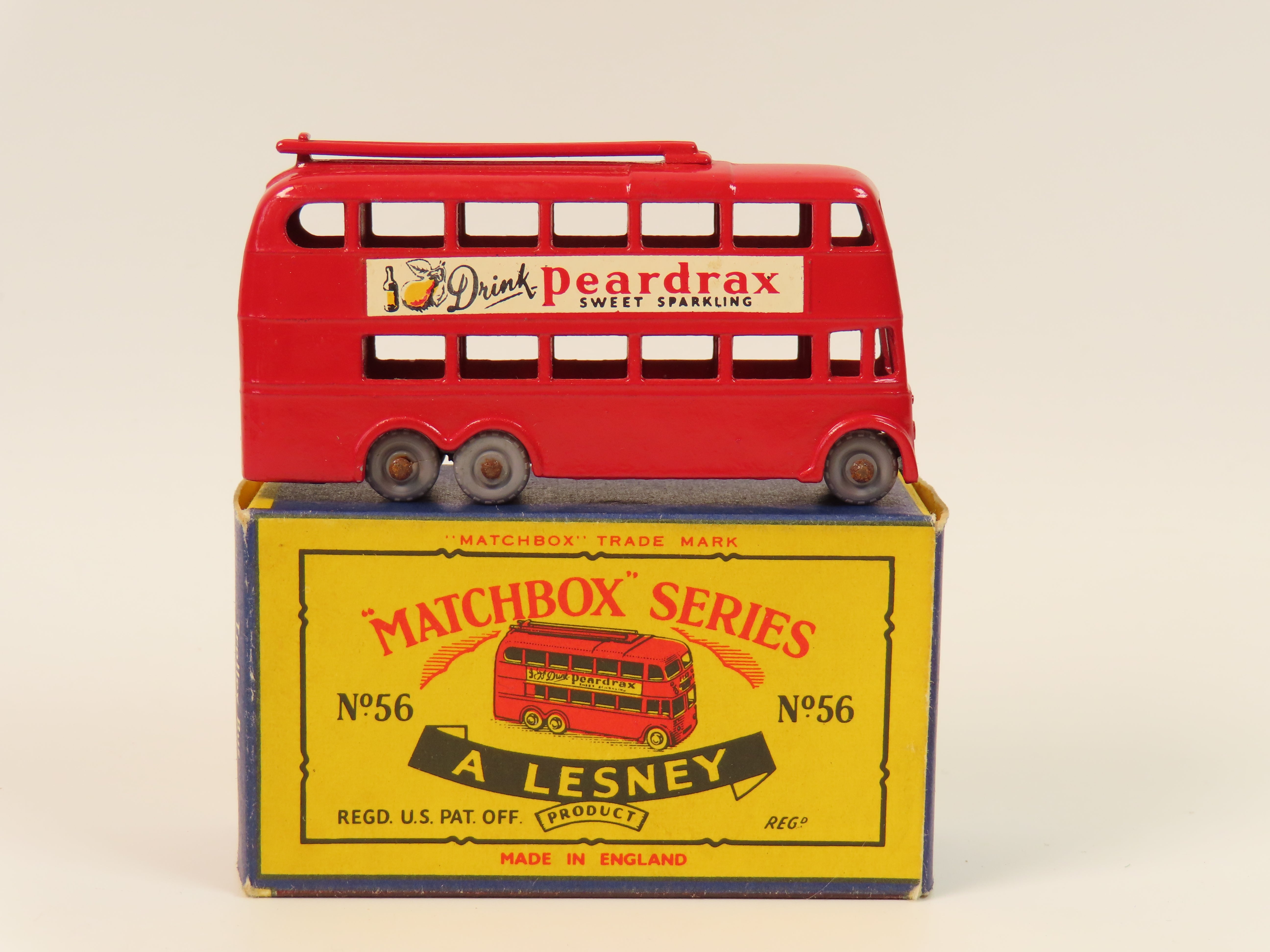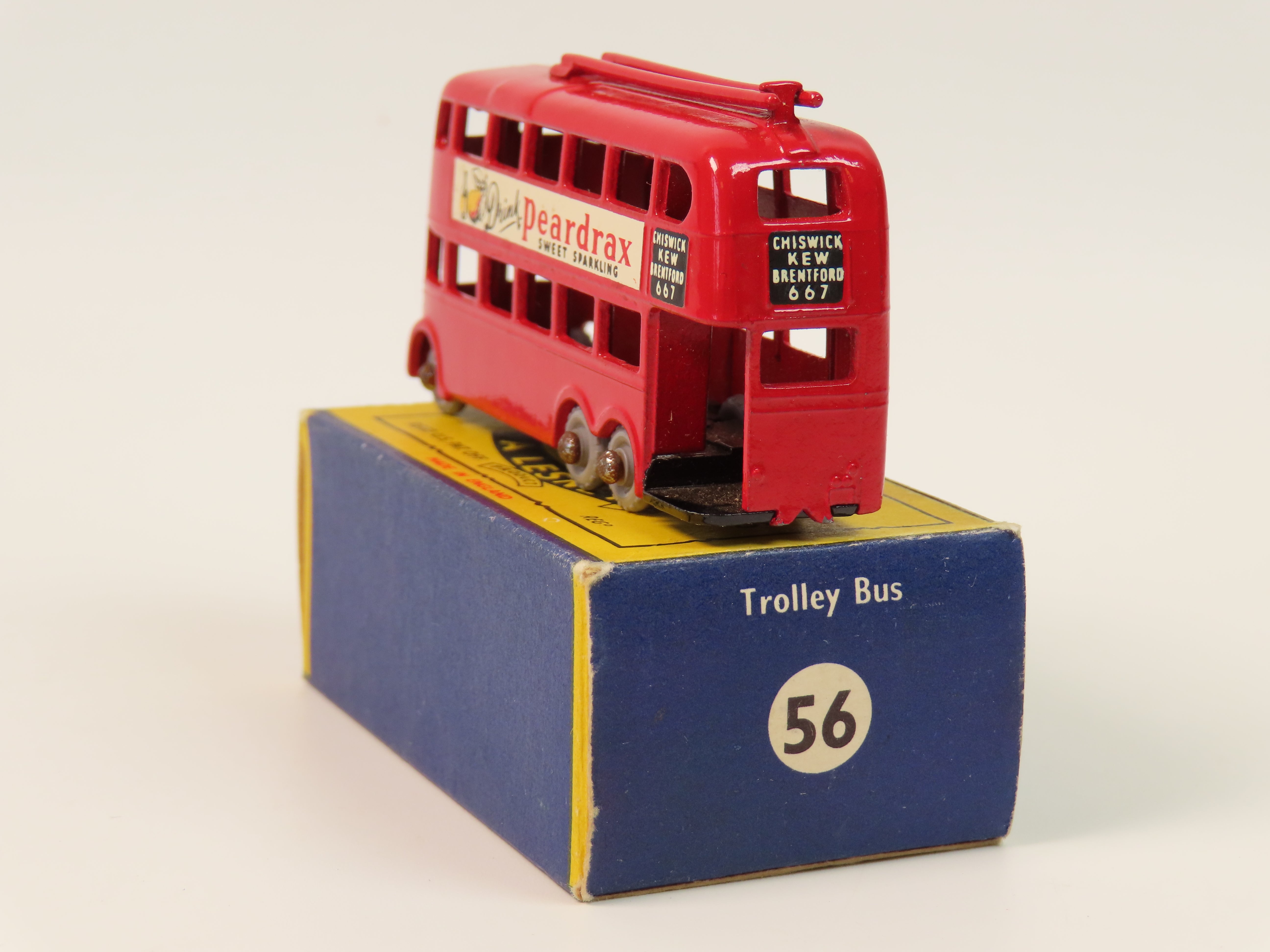 Matchbox Series No.56 Trolleybus with 'Drink Peardrax' decals in 99.9% mint to mint condition. A beautiful example! Grey plastic wheels.
