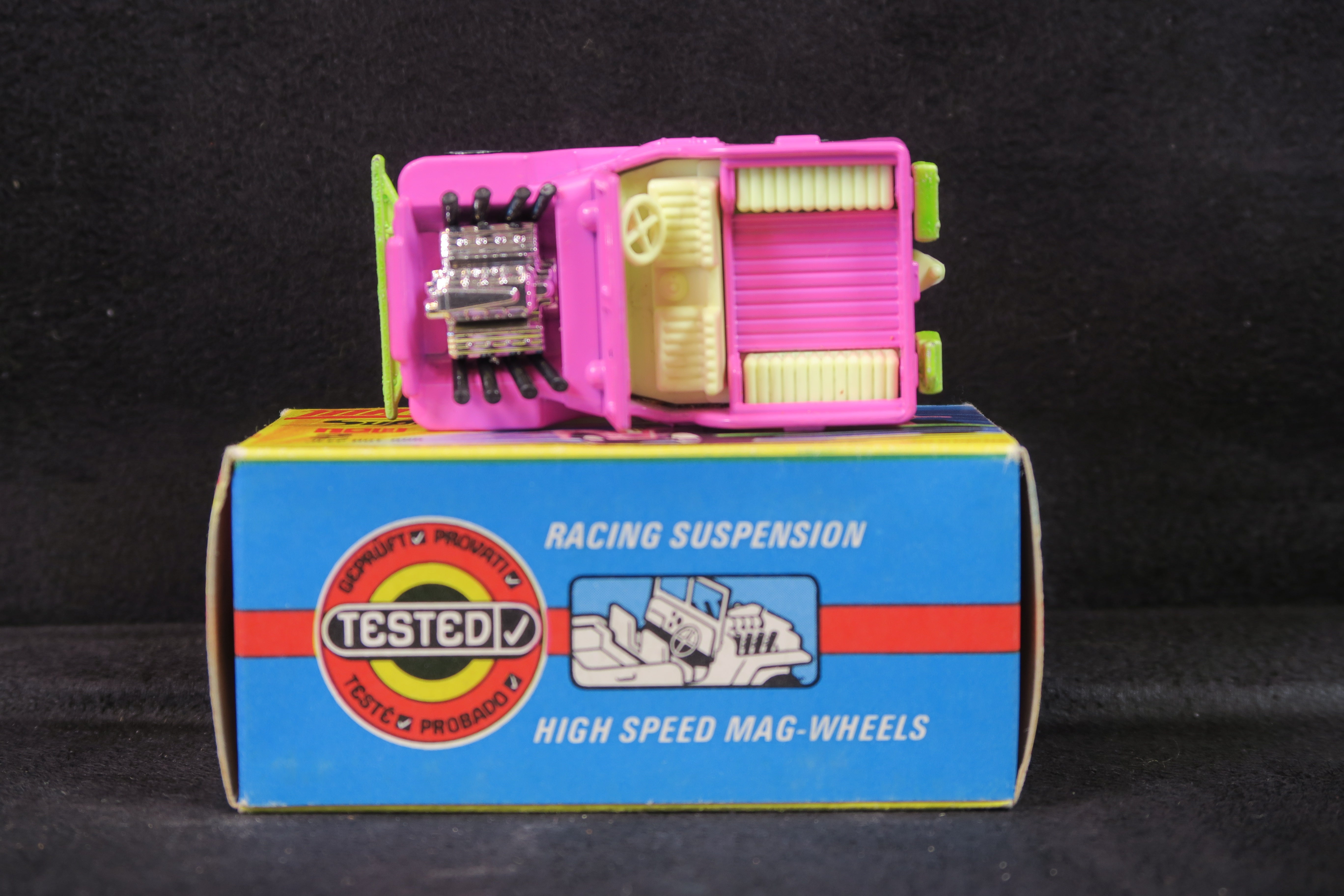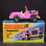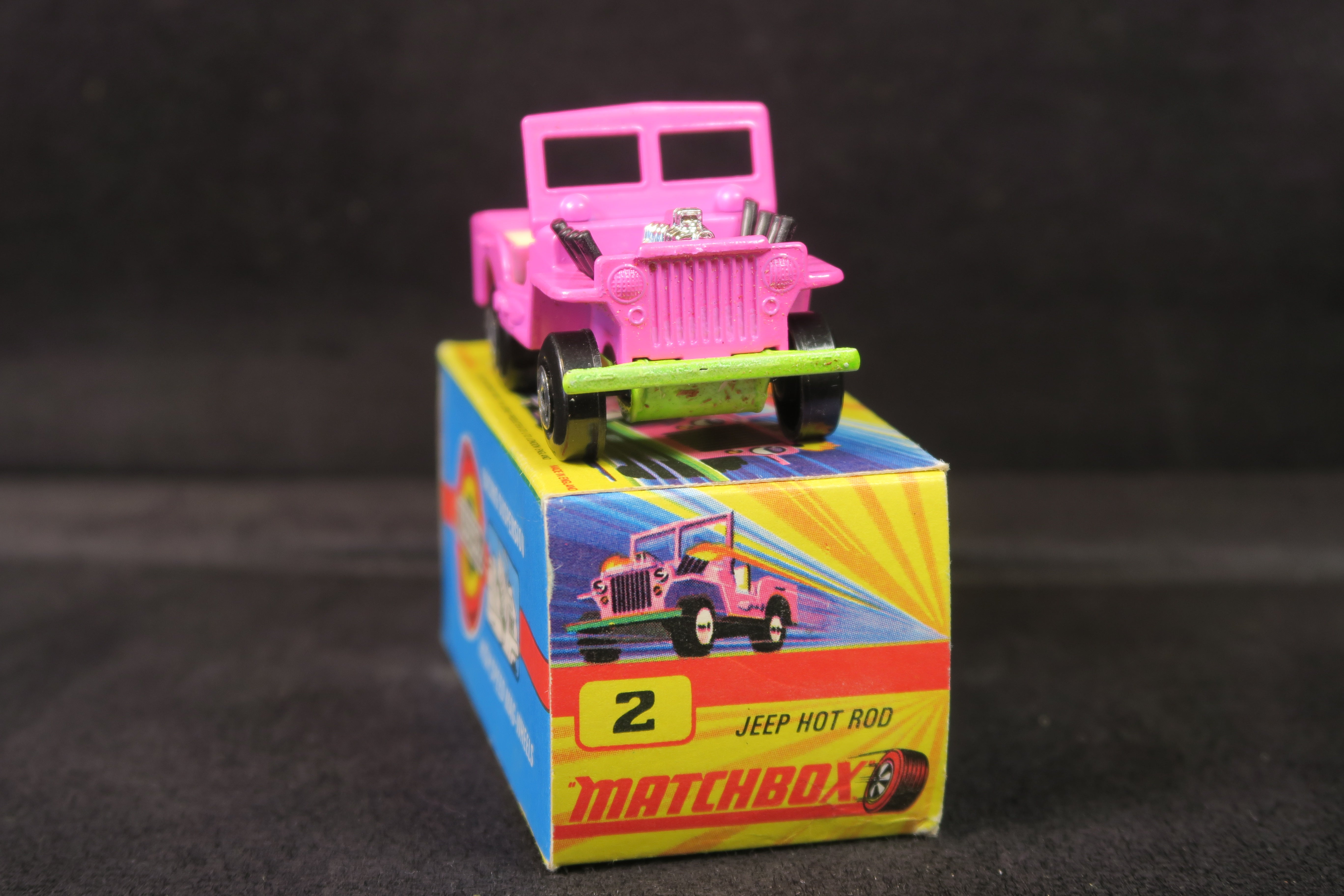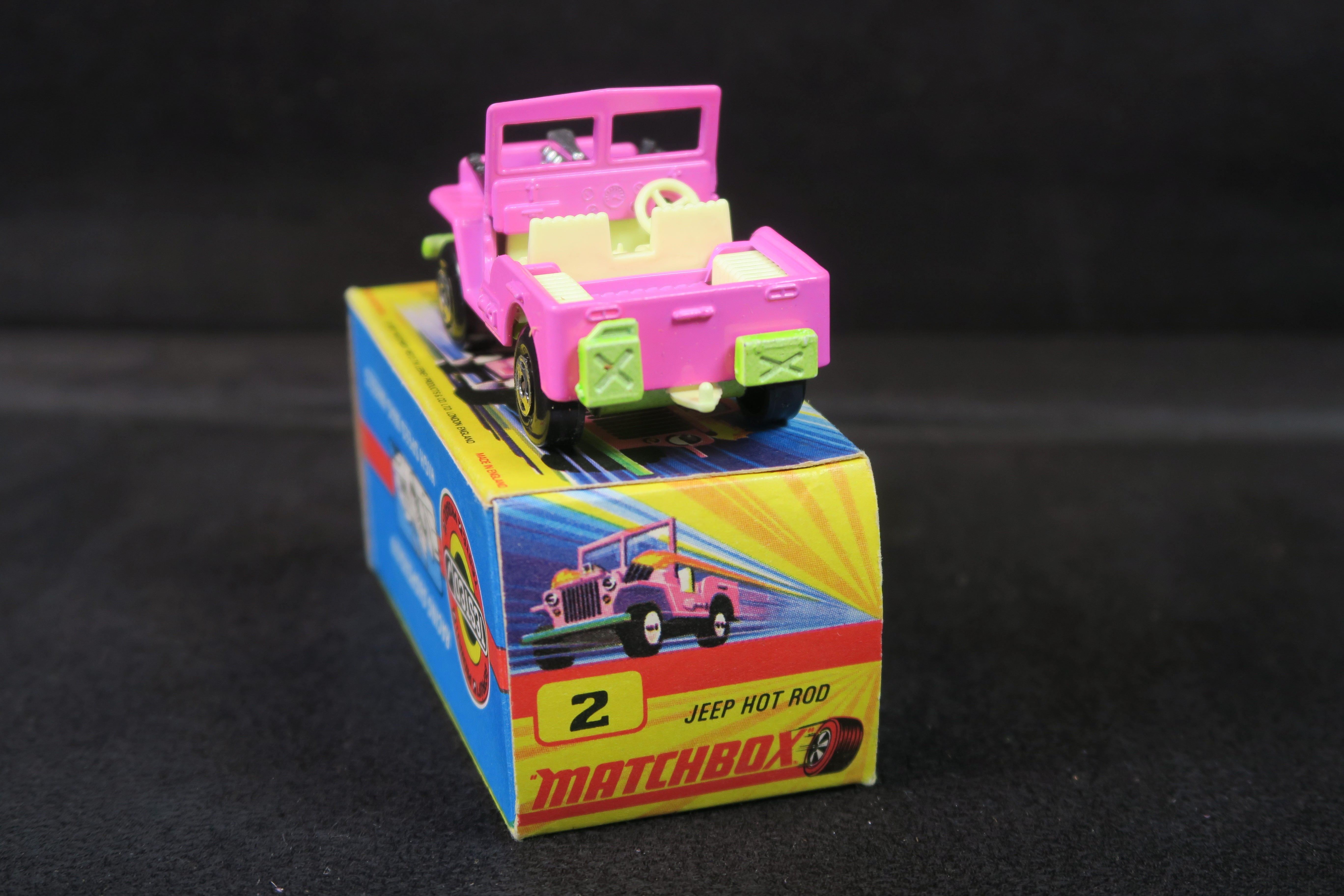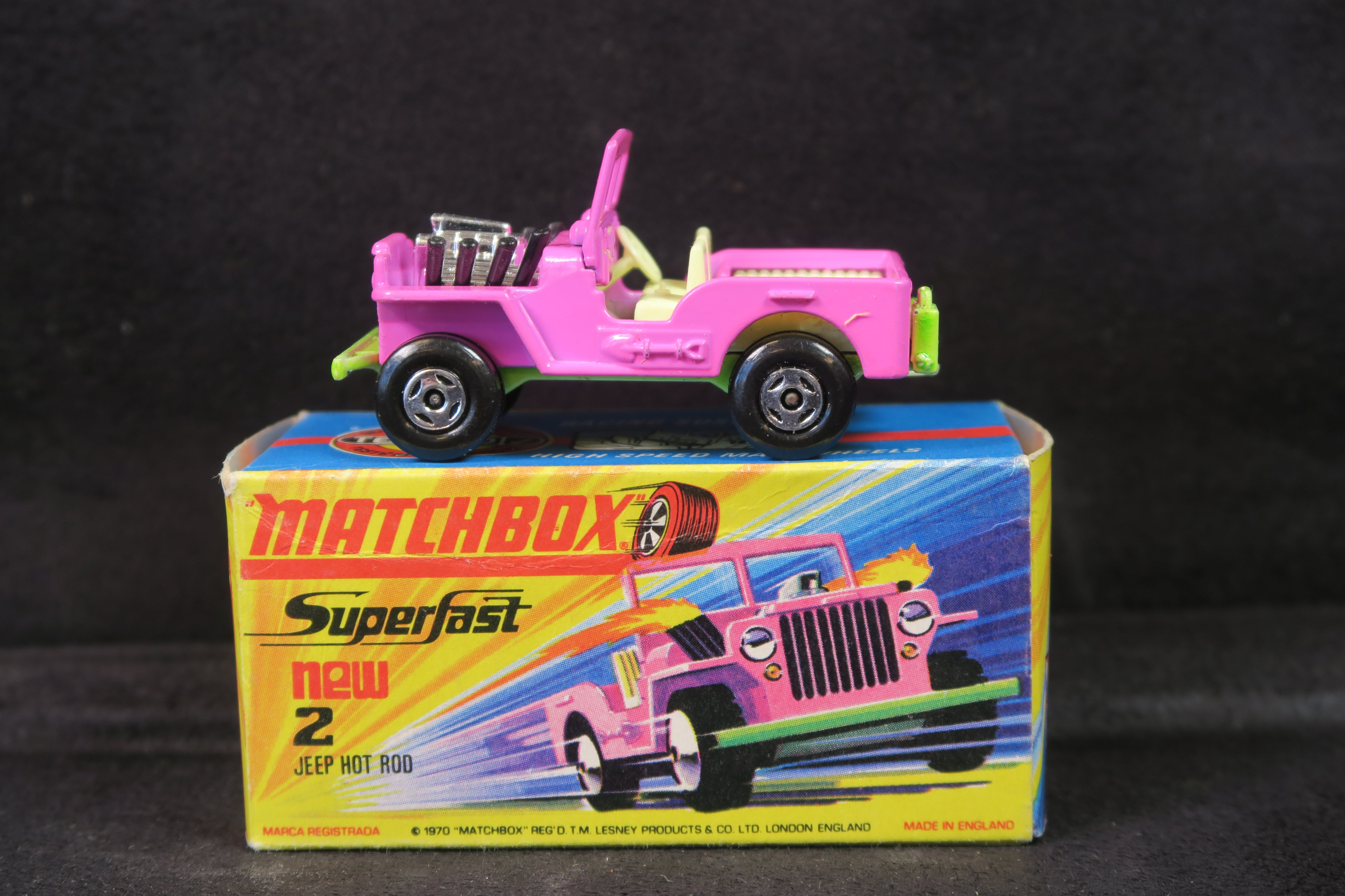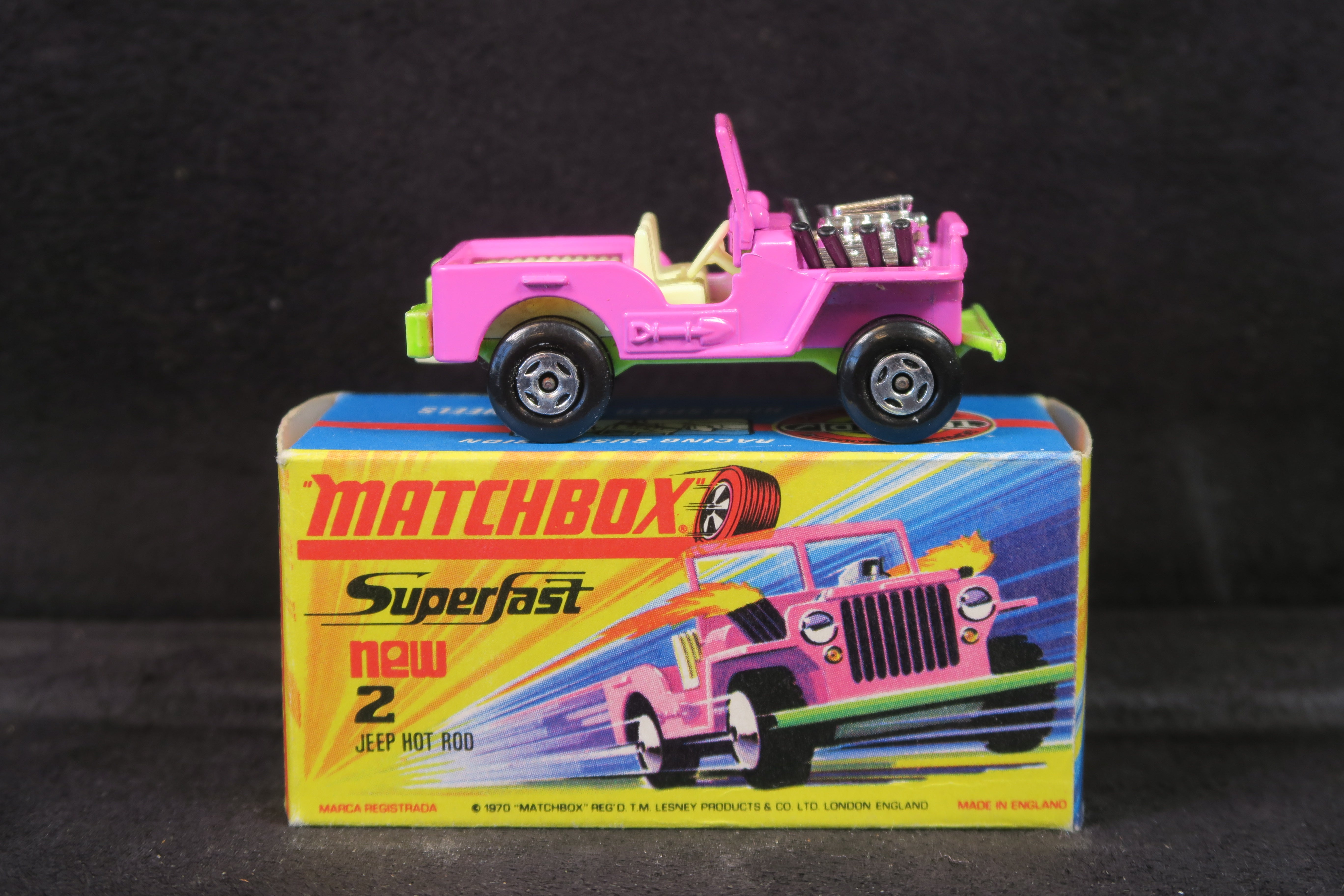 Matchbox Superfast 2 Jeep Hot Rod in bright pink, with lime green base and cream, plastic interior and tow hook.