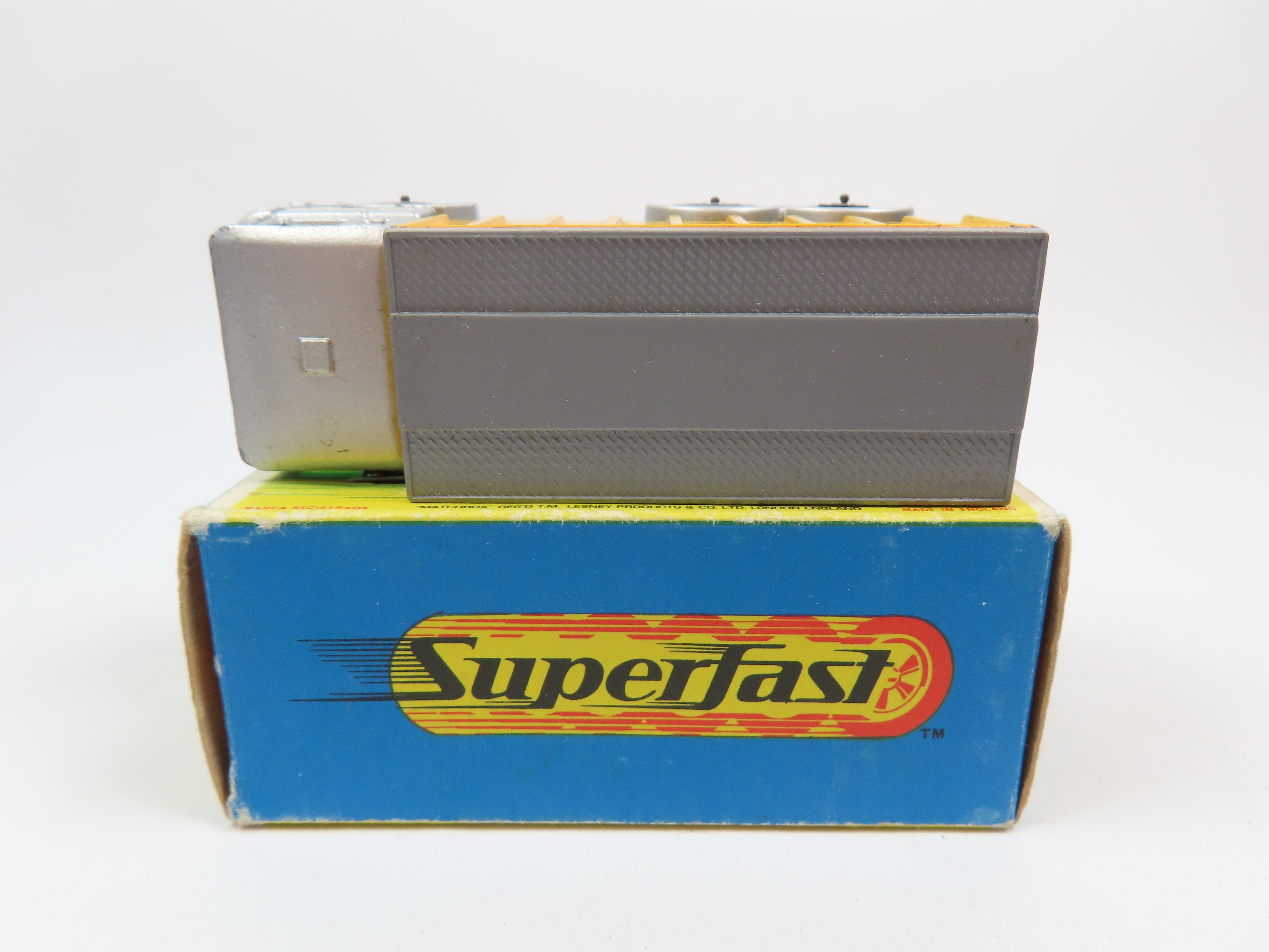 Matchbox Superfast 47 DAF Tipper Container Truck in silver with green tinted windows and yellow container to the rear.