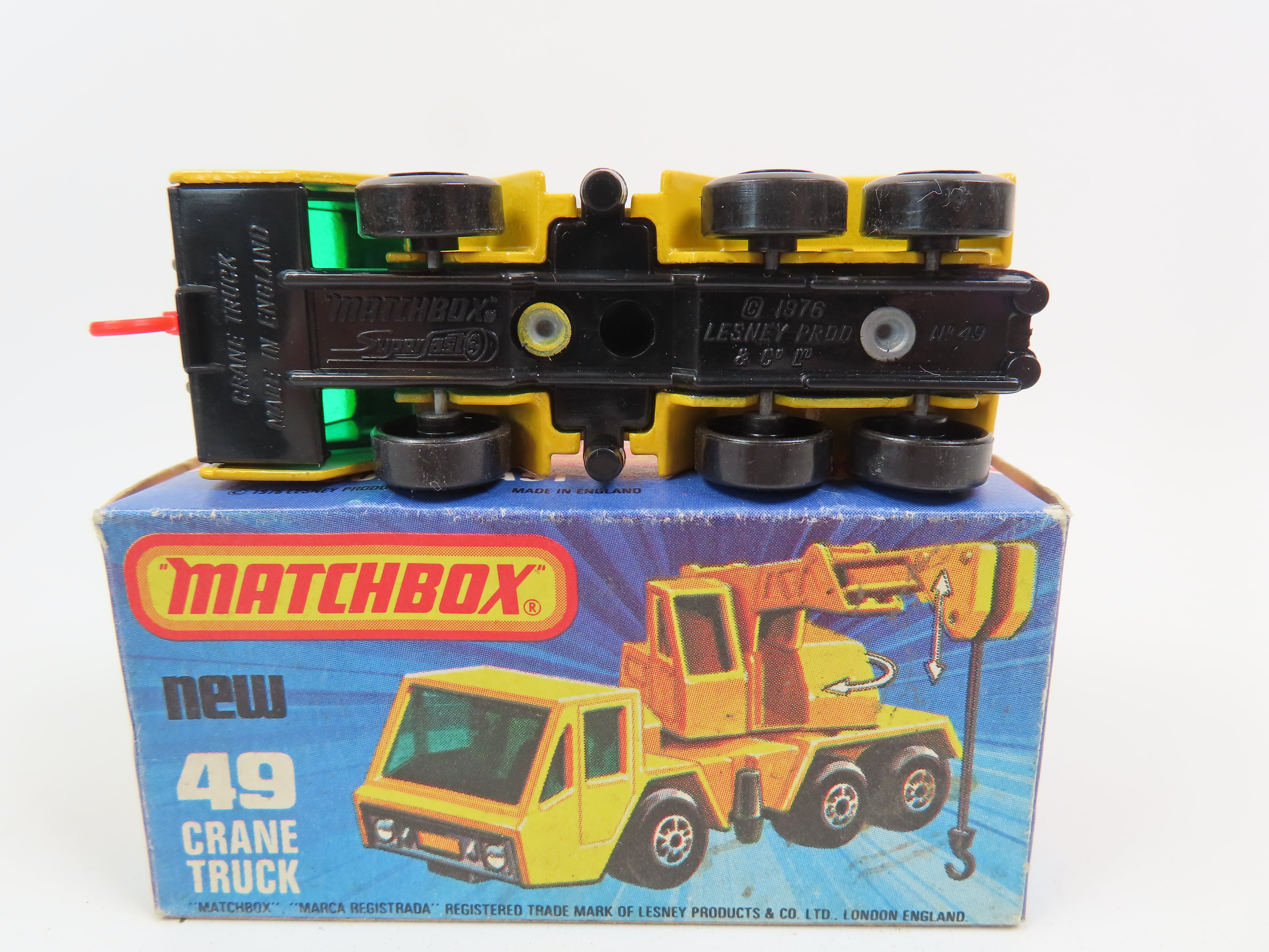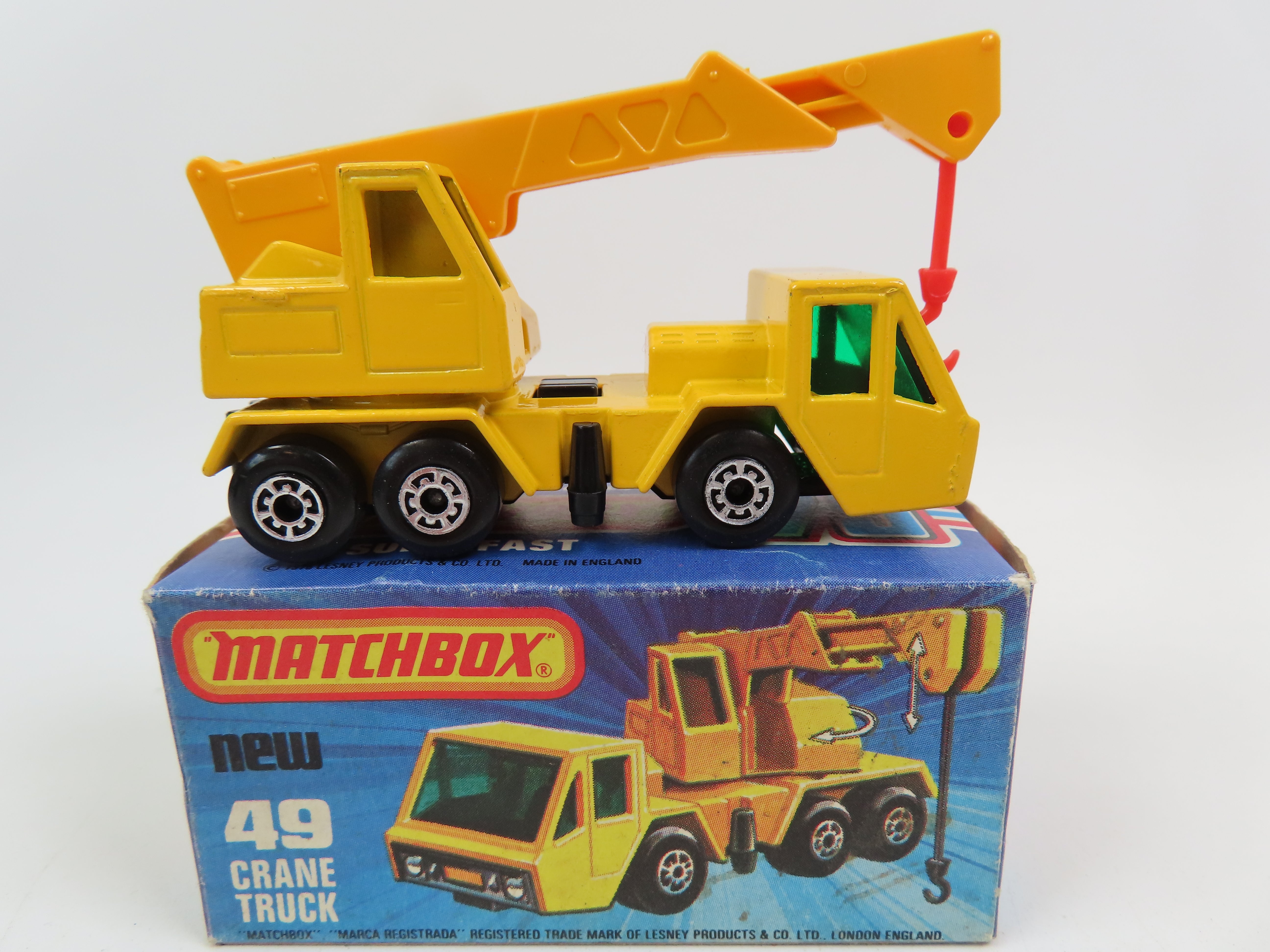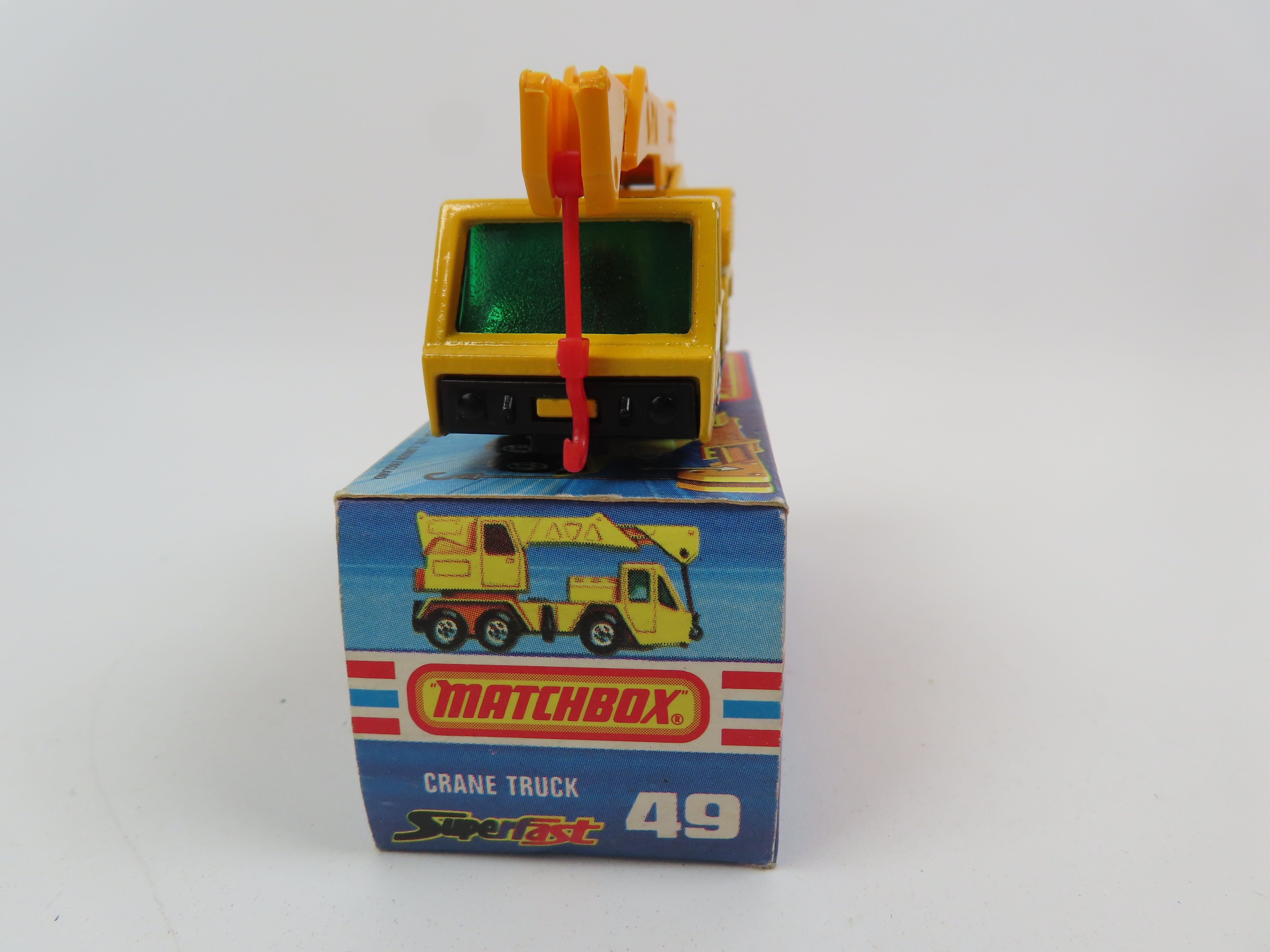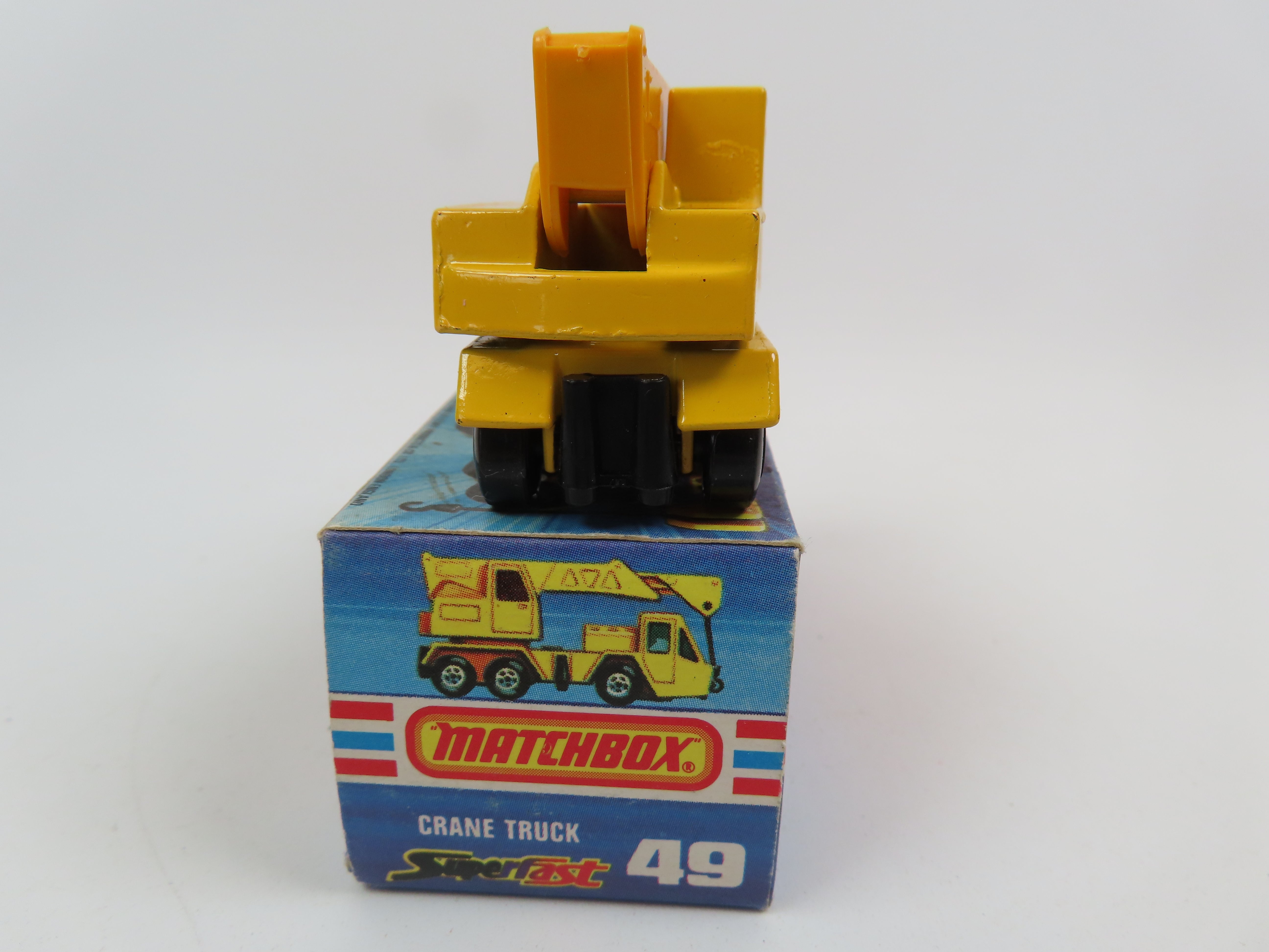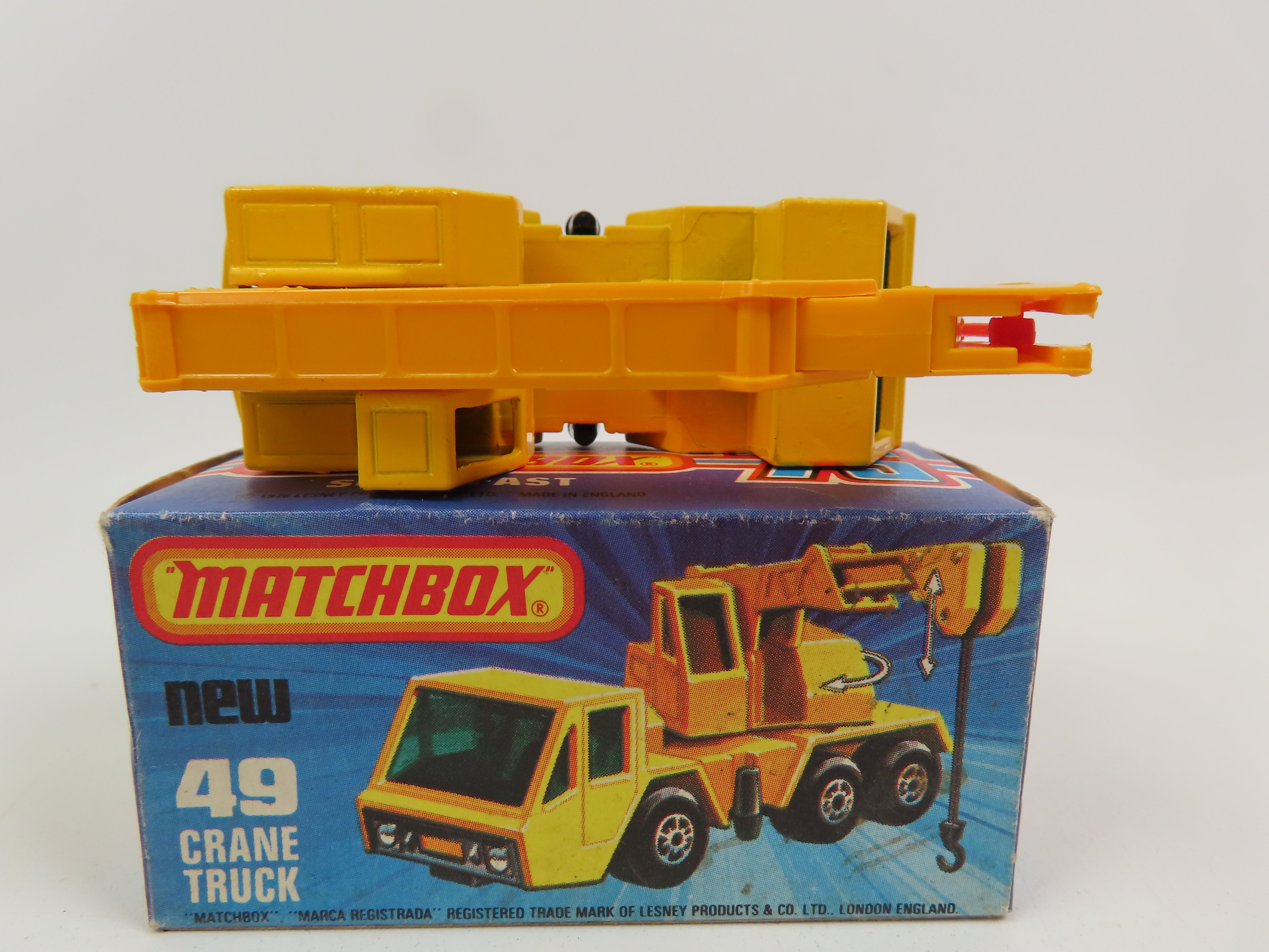 Matchbox Superfast 49 Crane Truck in yellow with orange crane and red hook, green tinted windows.