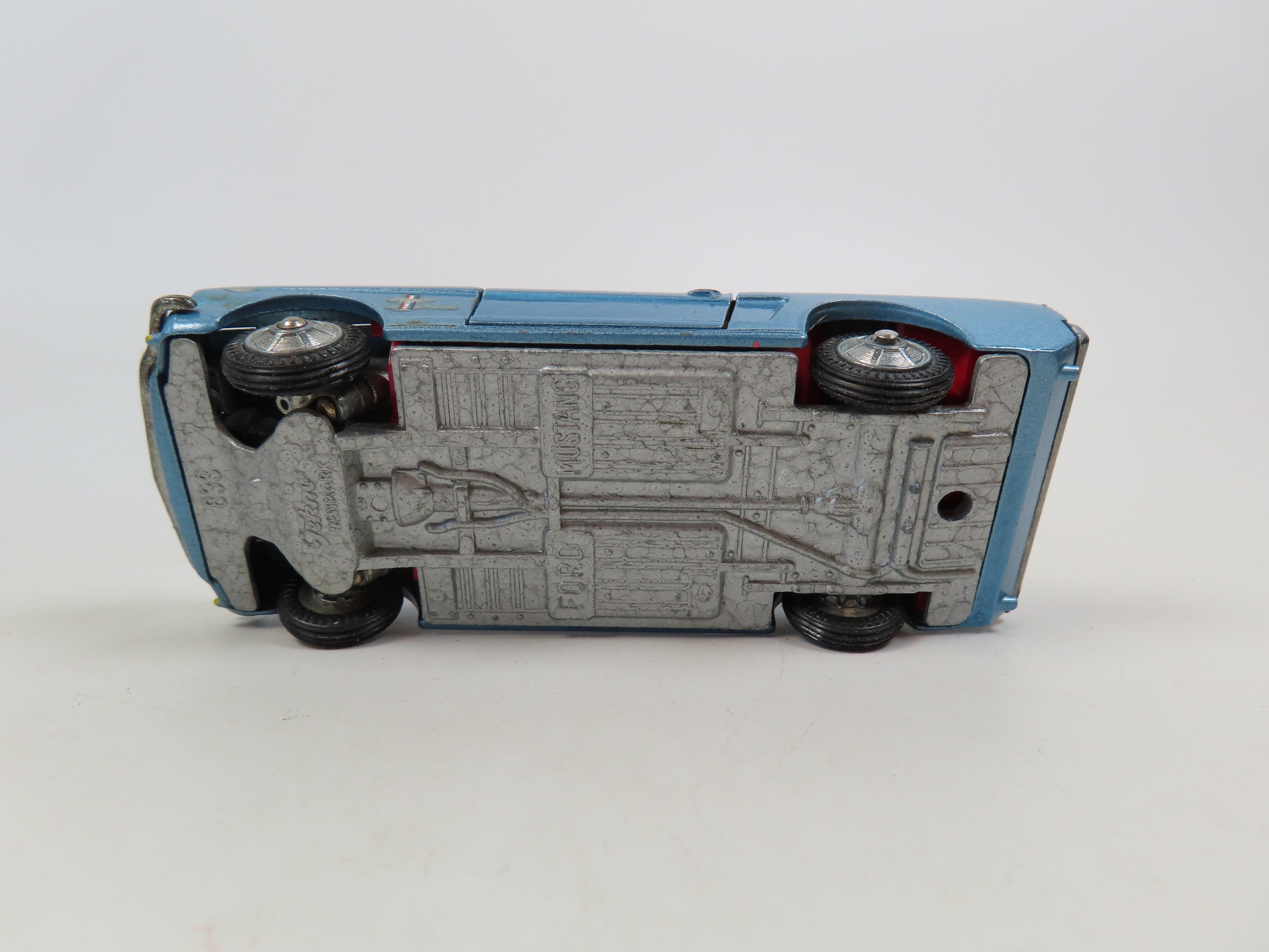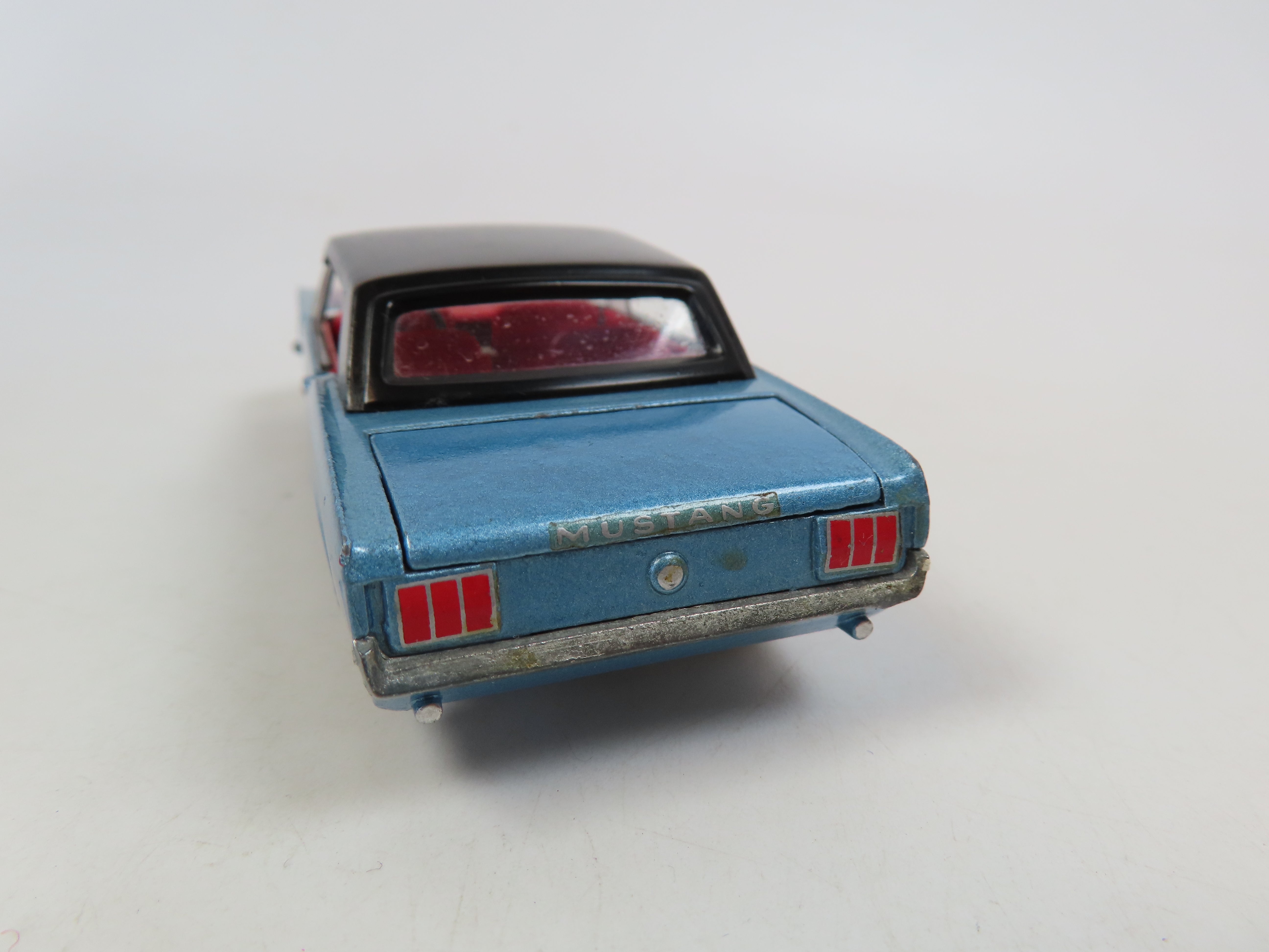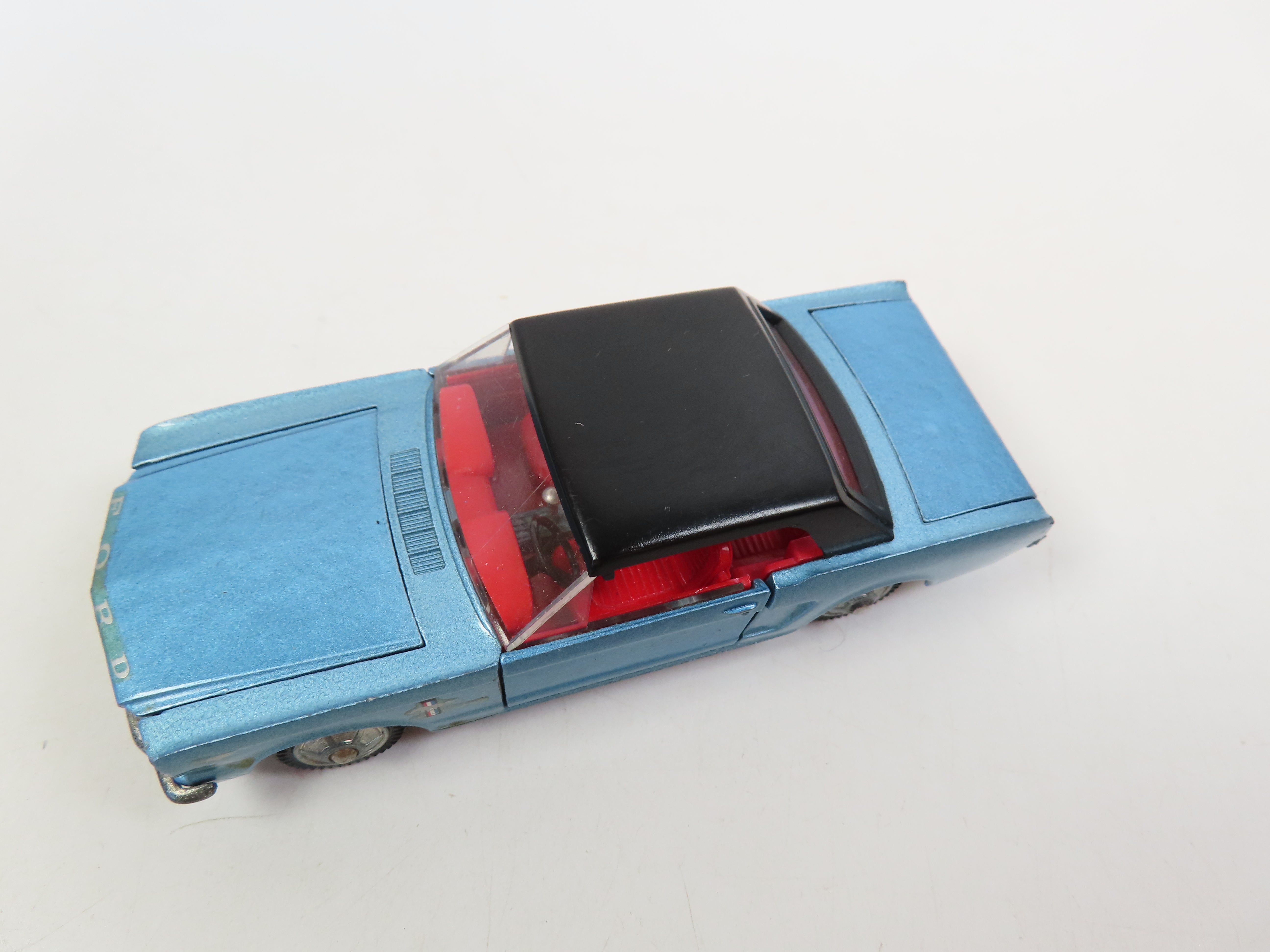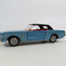 Tekno 833 Ford Mustang hood up version, in metallic blue, with a red interior and various Ford and Mustang decals to it.